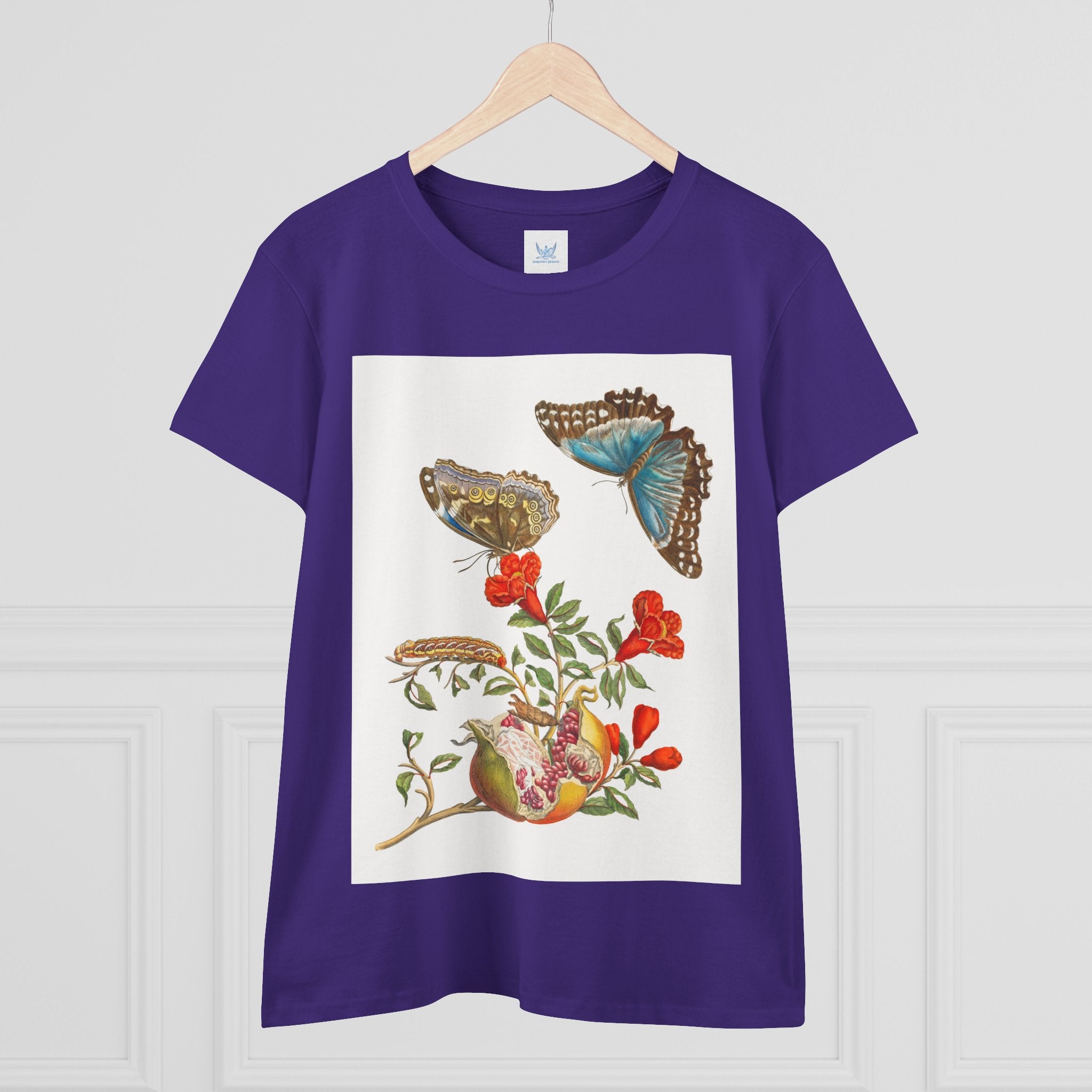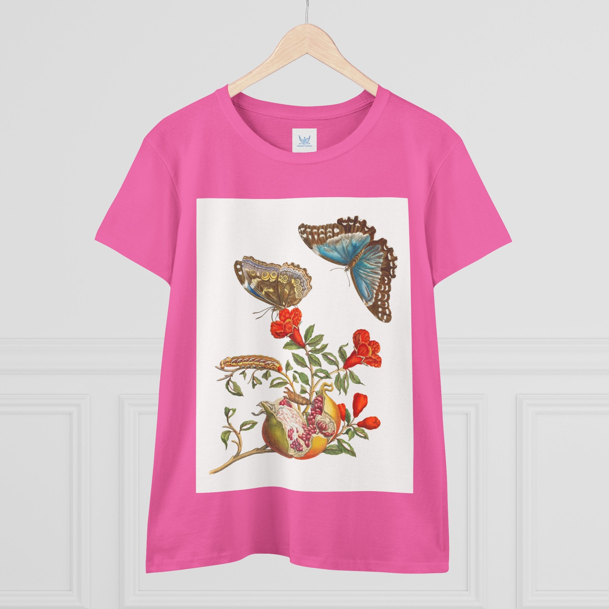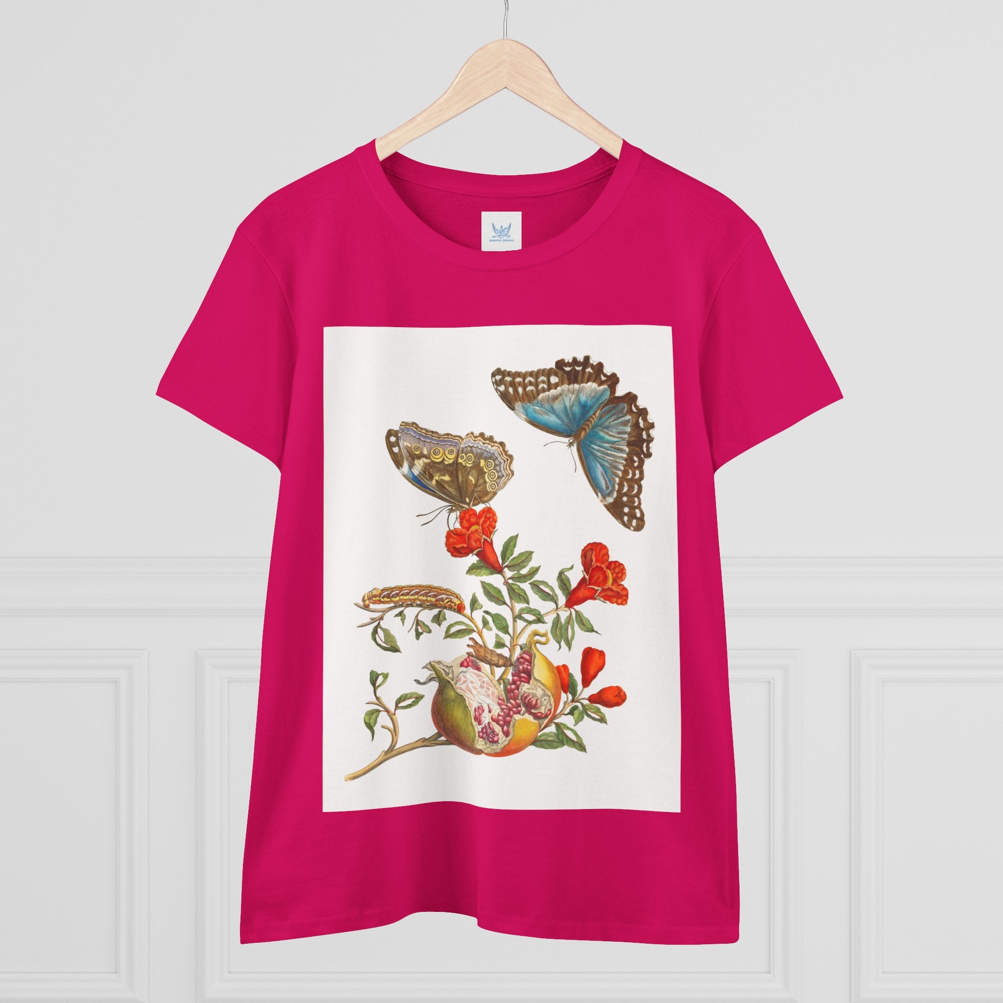 Blue Butterflies and Pomegranate is one of the most celebrated works of pioneering naturalist Maria Sibylla Merian (1647–1717). The illustration depicts a flowering pomegranate branch alongside two vivid Morpho menelaus butterflies, a species native to South America. Merian was among the first artists to use microscopes to study insects and plants, capturing their forms with extraordinary precision and reshaping the scientific study of metamorphosis and natural history through art.