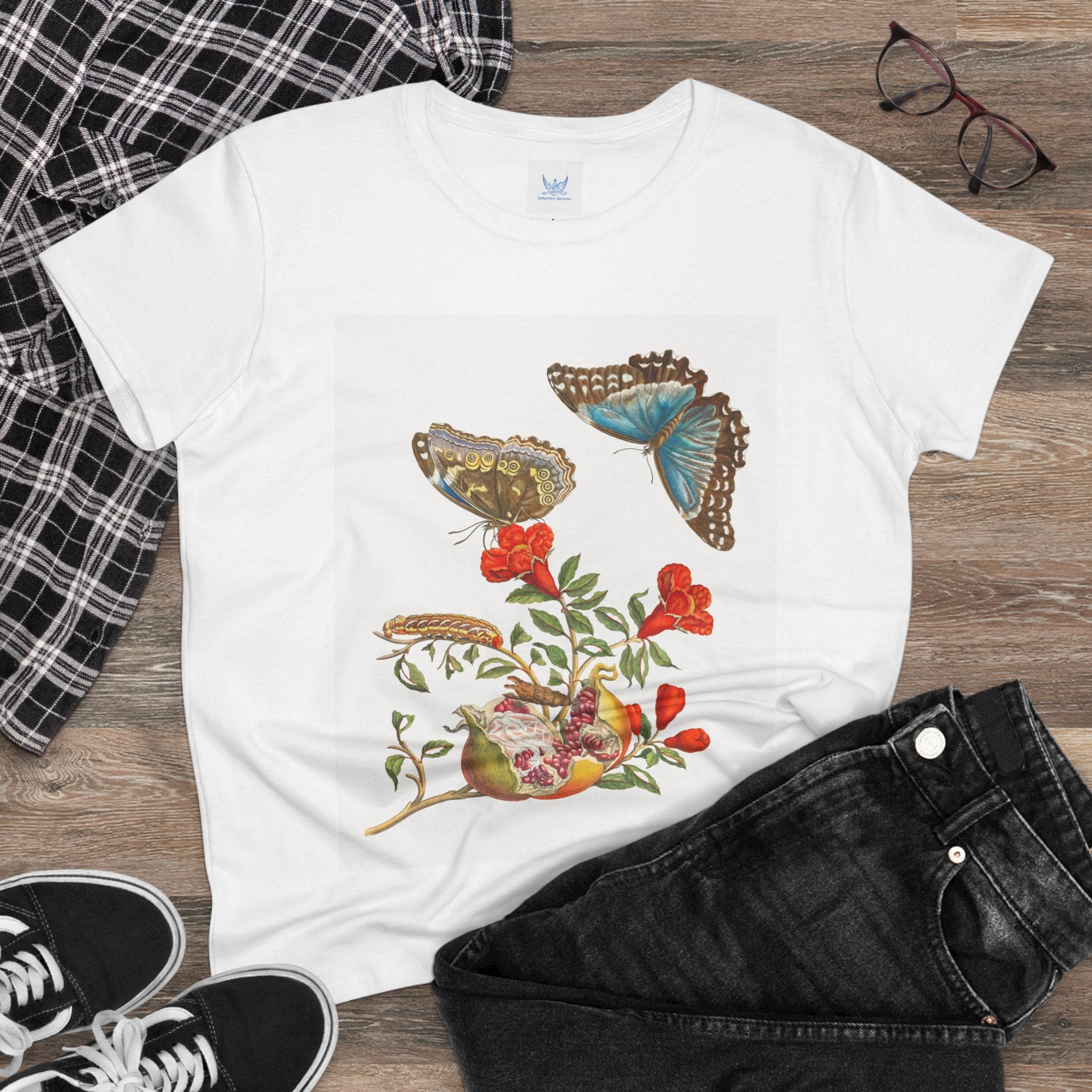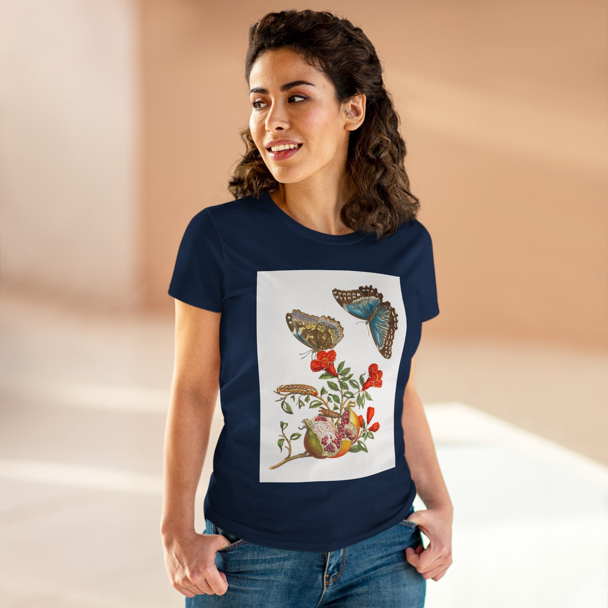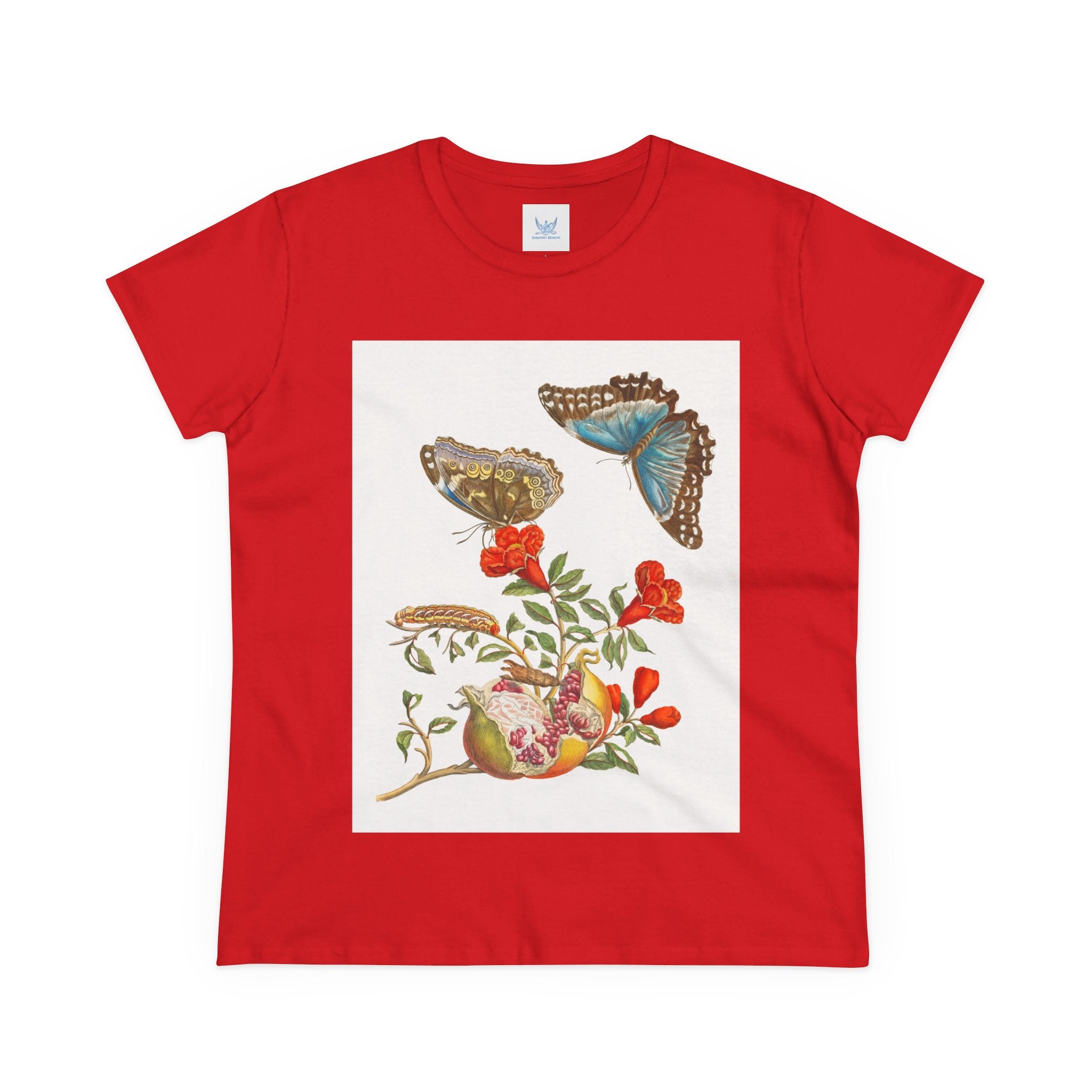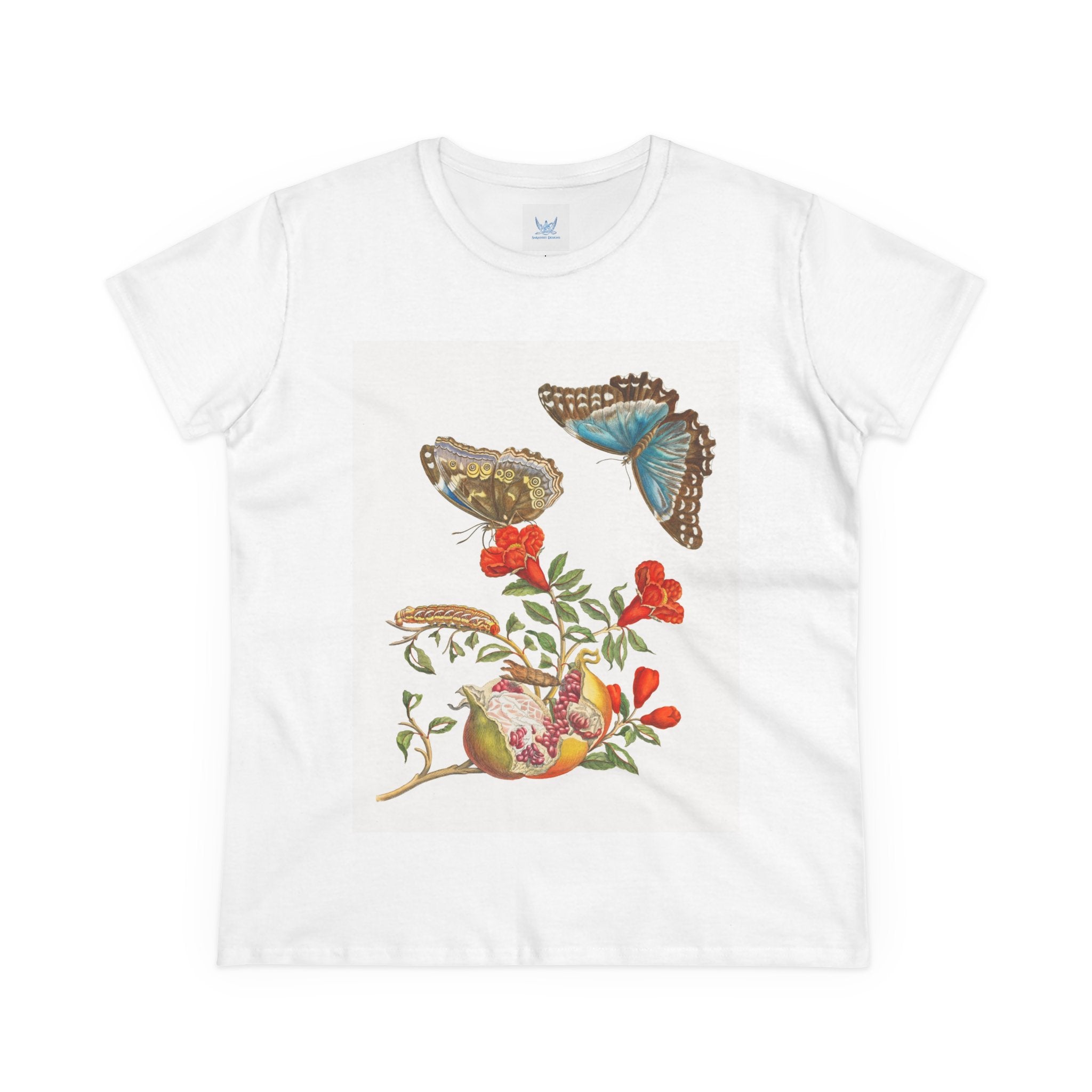 Blue Butterflies and Pomegranate Cotton Tee brings a classic scientific illustration to wearable art. Made from soft, lightweight 100% cotton, this semi-fitted tee offers lasting comfort with a contoured silhouette that flatters effortlessly. Cap sleeves and a taped neck and shoulders enhance durability, ensuring this piece remains a staple in any wardrobe.