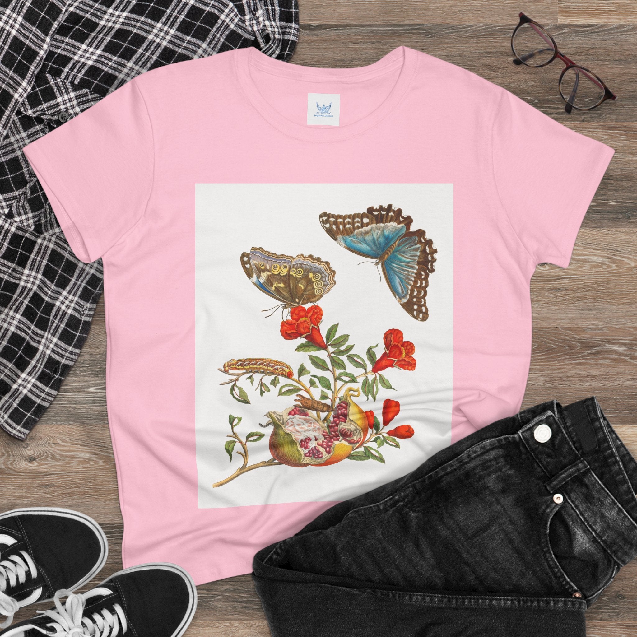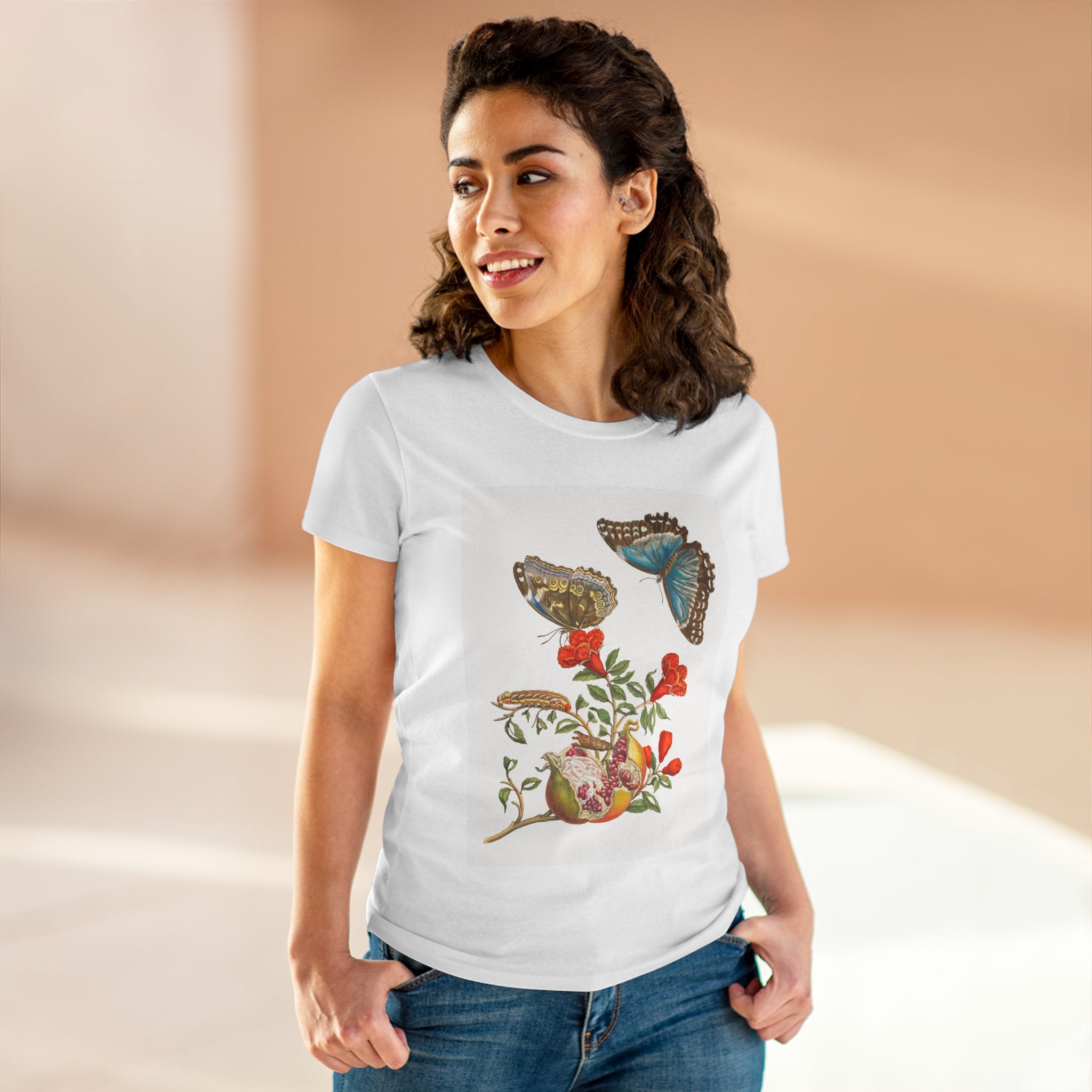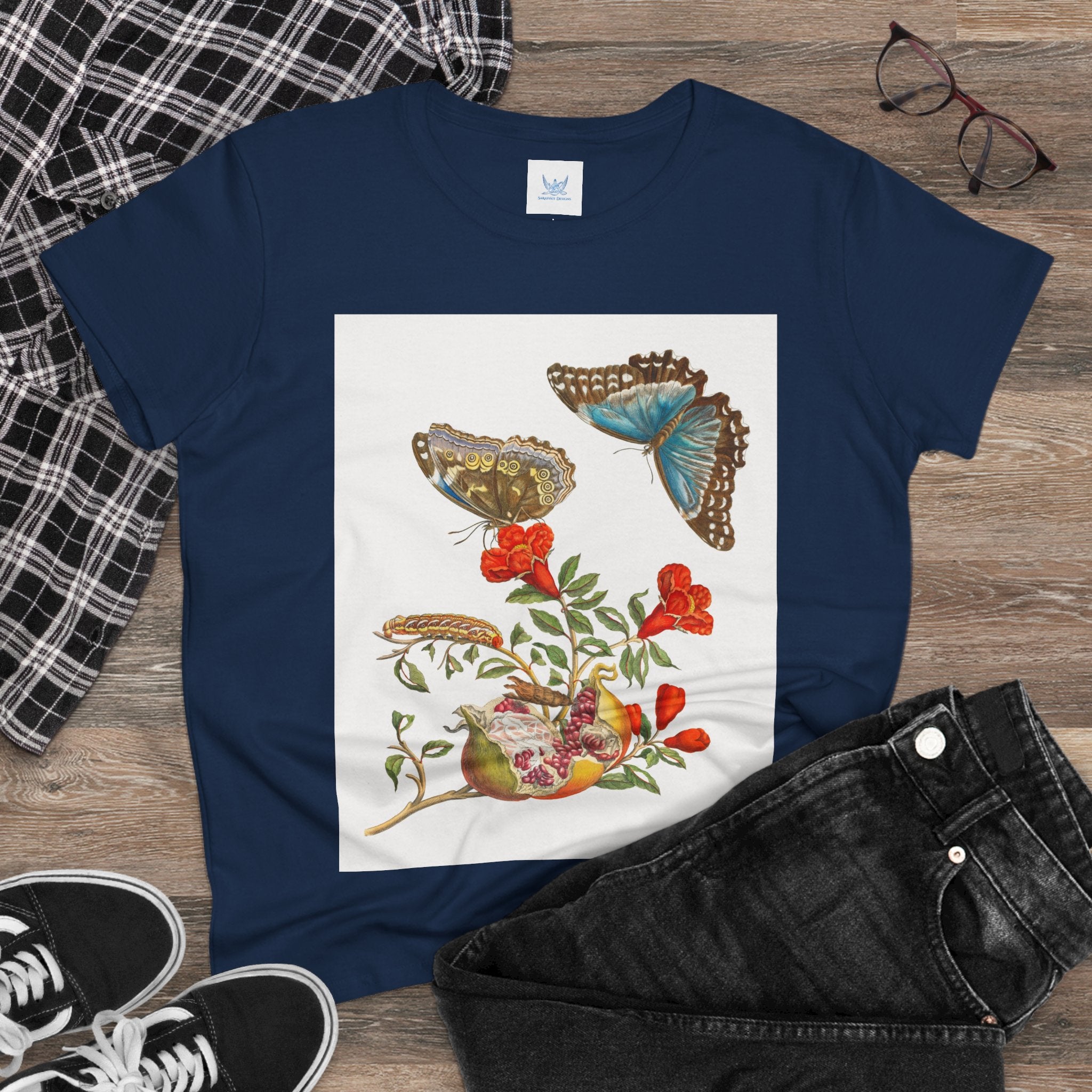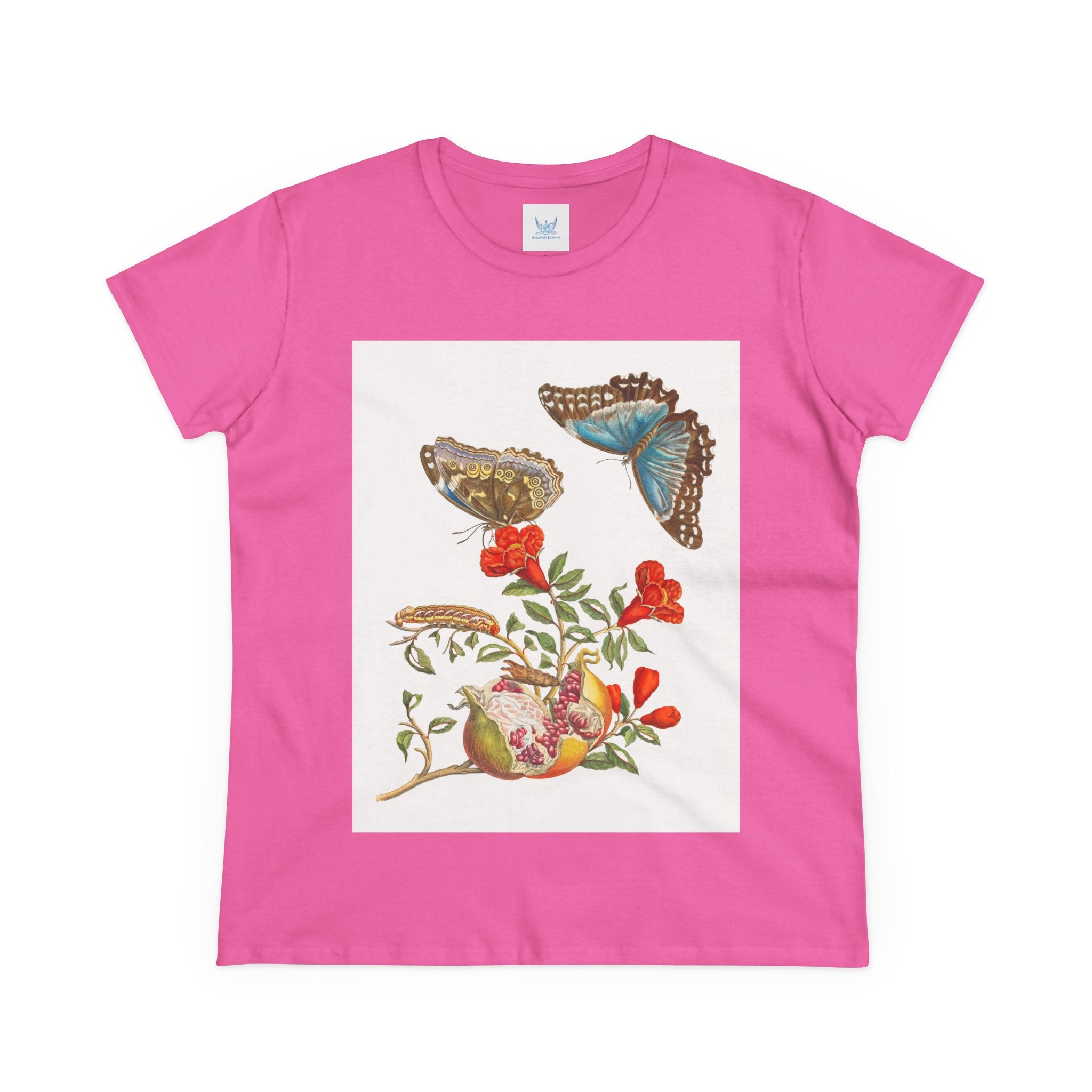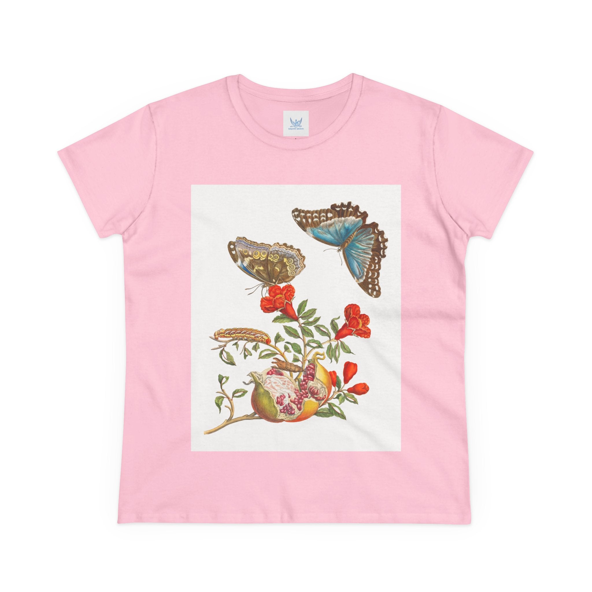Blue Butterflies and Pomegranate Cotton Tee brings a classic scientific illustration to wearable art. Made from soft, lightweight 100% cotton, this semi-fitted tee offers lasting comfort with a contoured silhouette that flatters effortlessly. Cap sleeves and a taped neck and shoulders enhance durability, ensuring this piece remains a staple in any wardrobe.
