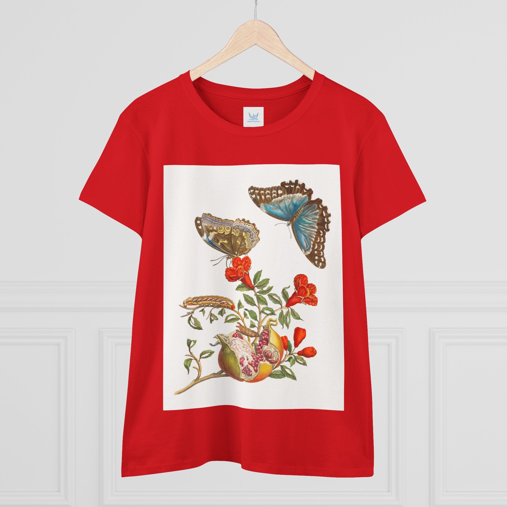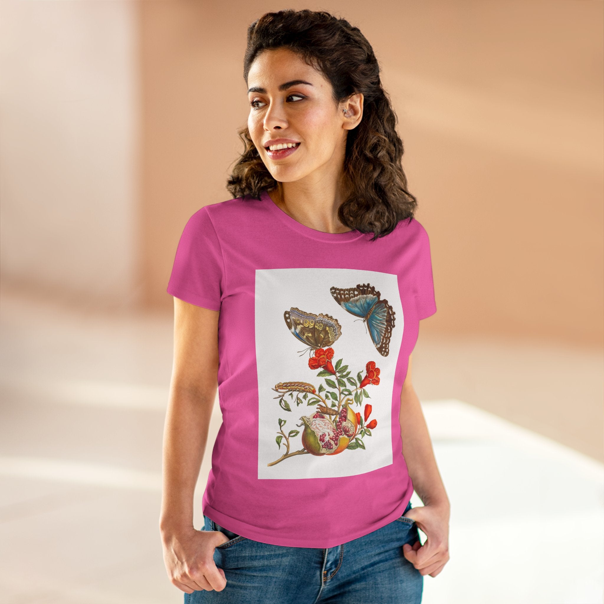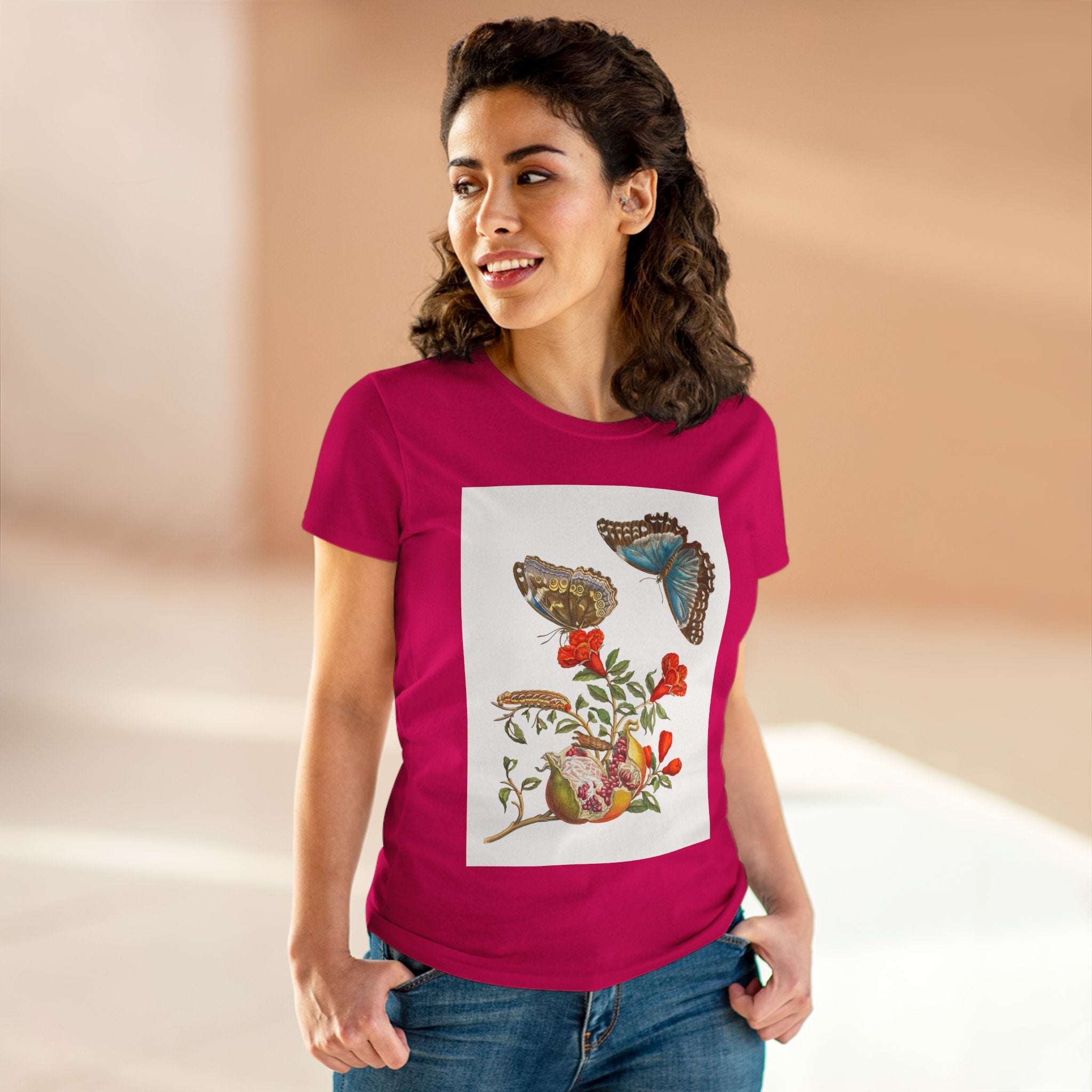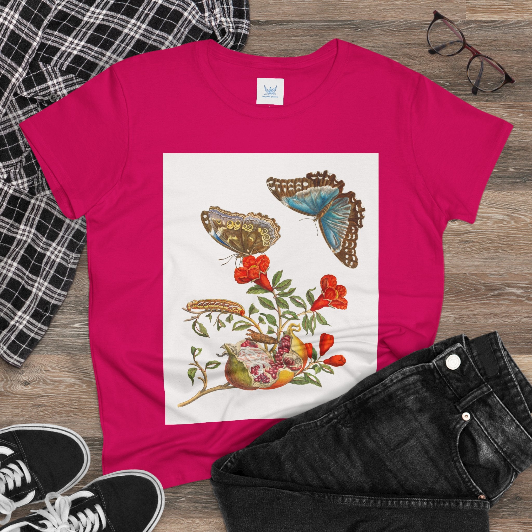 Blue Butterflies and Pomegranate Cotton Tee brings a classic scientific illustration to wearable art. Made from soft, lightweight 100% cotton, this semi-fitted tee offers lasting comfort with a contoured silhouette that flatters effortlessly. Cap sleeves and a taped neck and shoulders enhance durability, ensuring this piece remains a staple in any wardrobe.