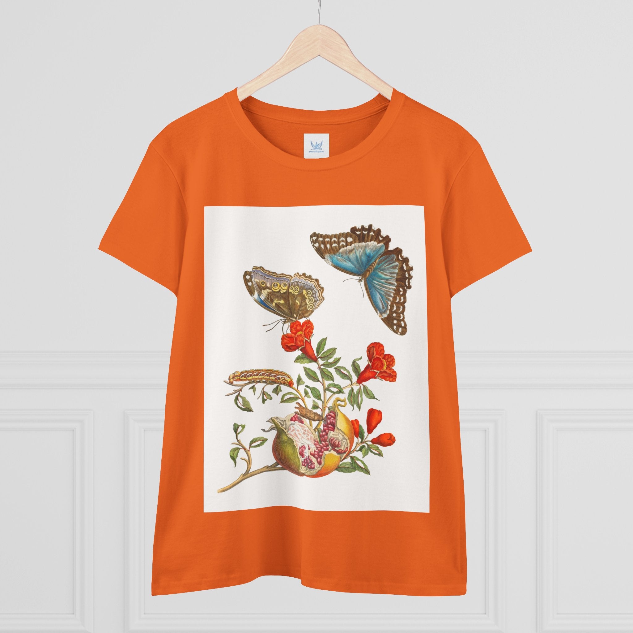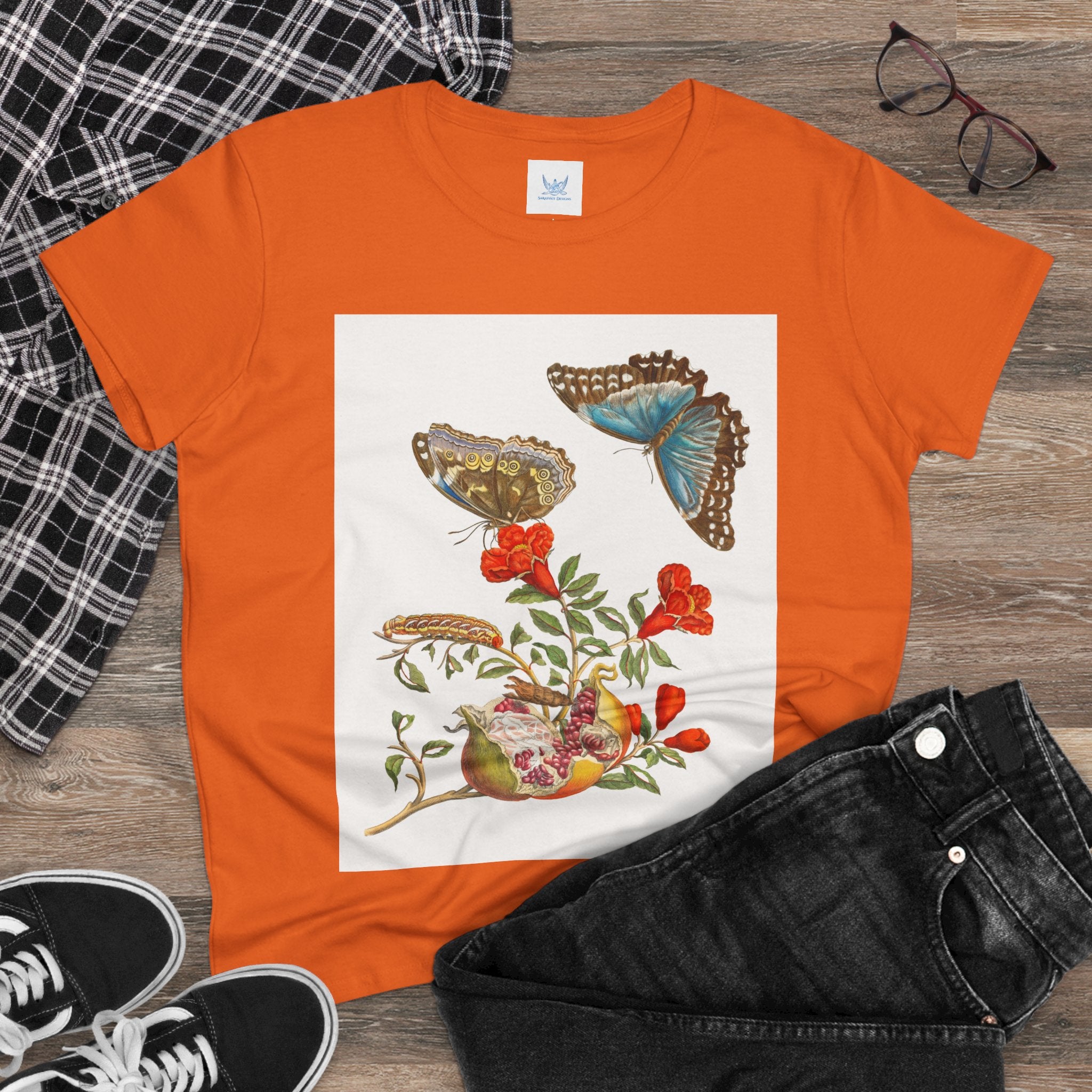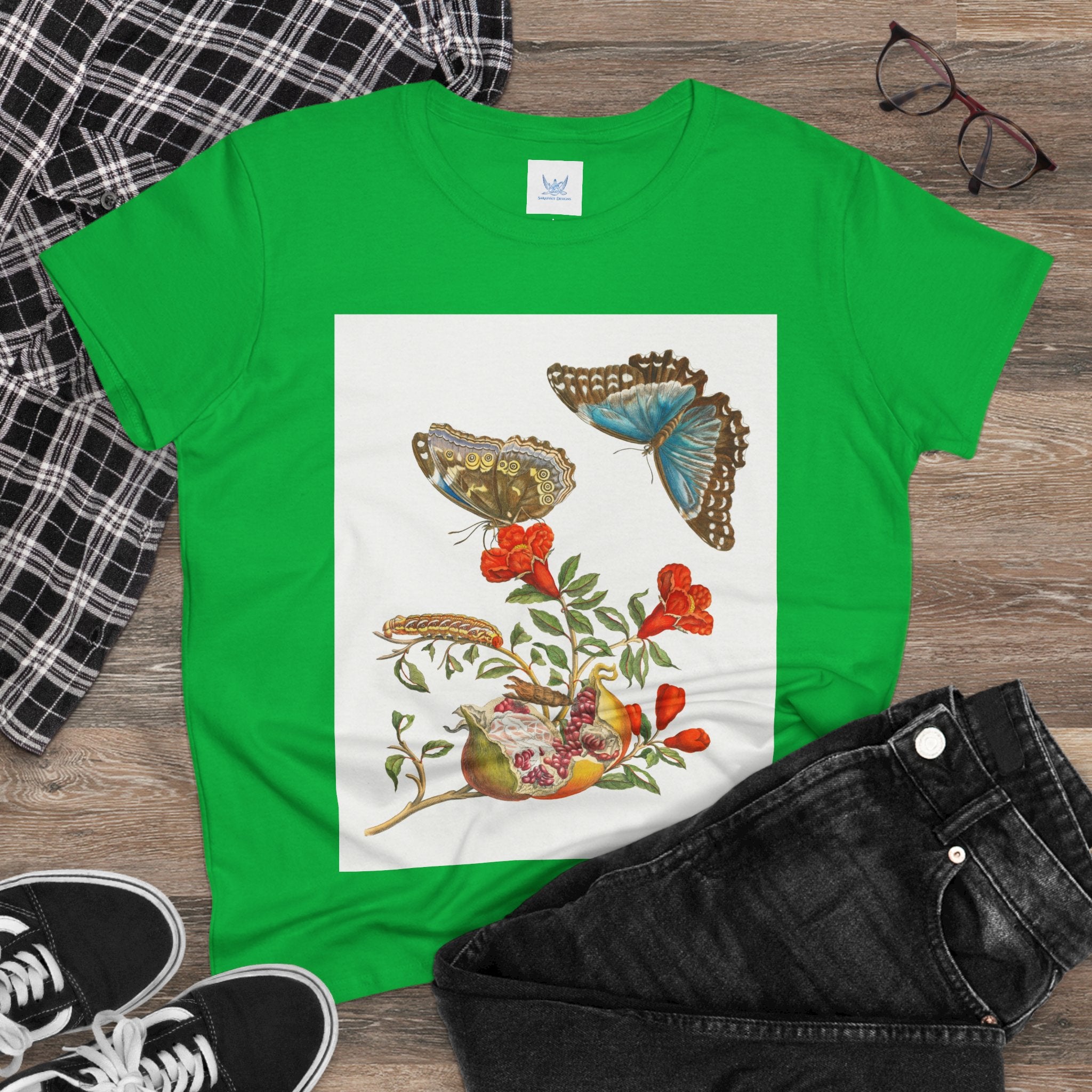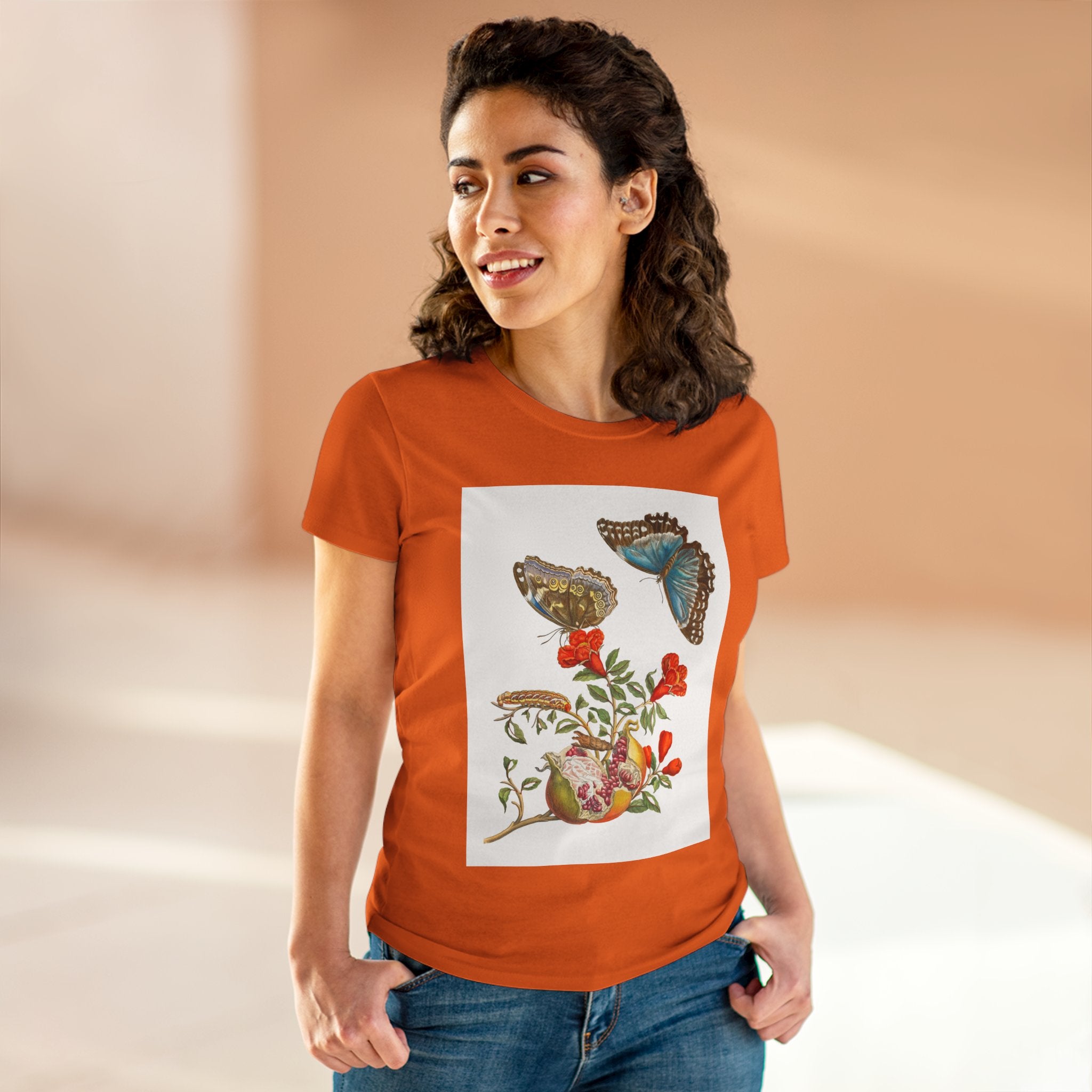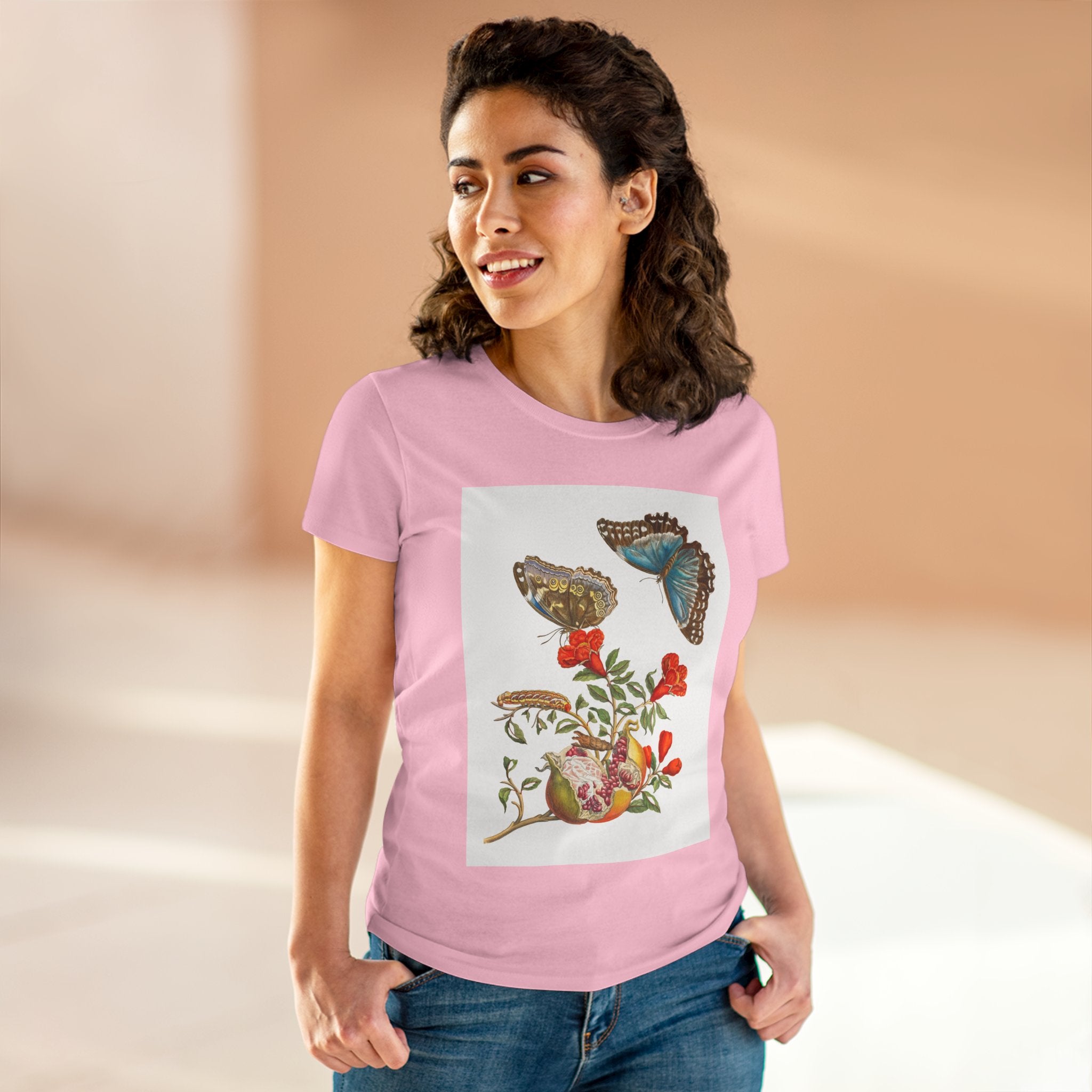 Blue Butterflies and Pomegranate Cotton Tee brings a classic scientific illustration to wearable art. Made from soft, lightweight 100% cotton, this semi-fitted tee offers lasting comfort with a contoured silhouette that flatters effortlessly. Cap sleeves and a taped neck and shoulders enhance durability, ensuring this piece remains a staple in any wardrobe.