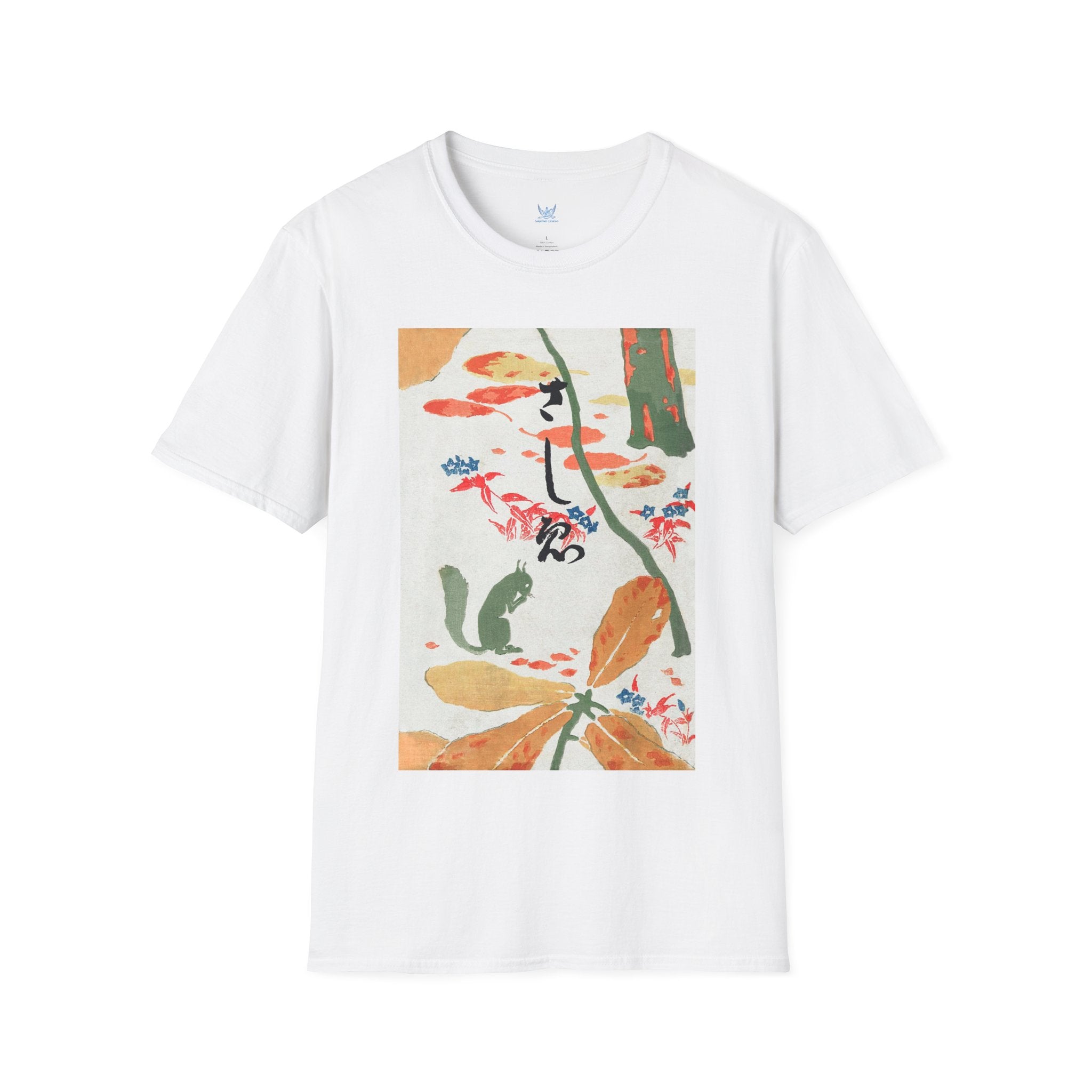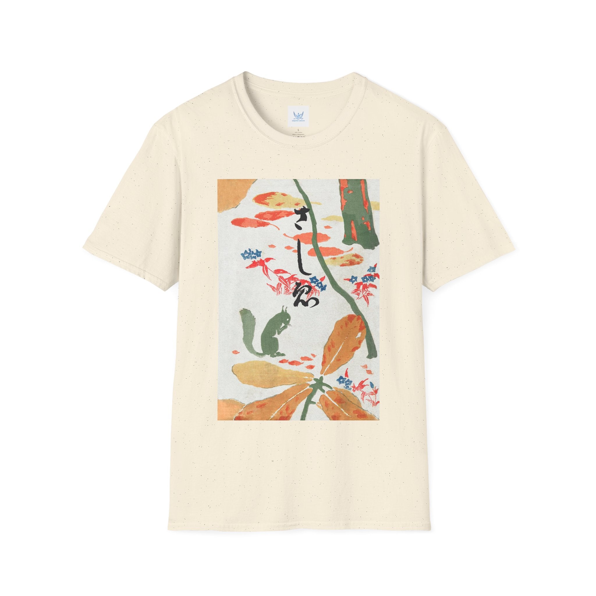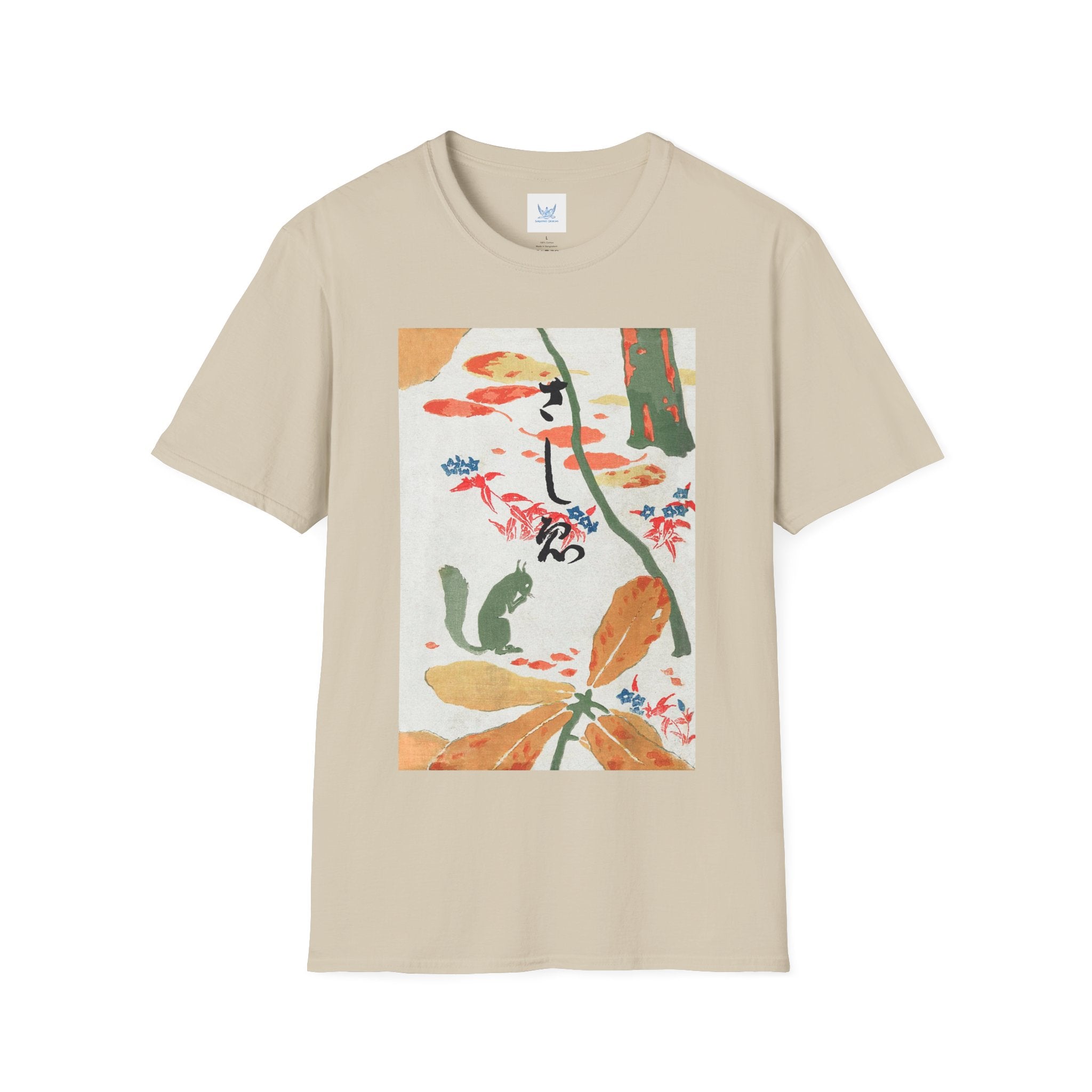 Step into serene elegance with Book Illustrations Sashi-e (1911) by Goyō Hashiguchi, beautifully presented on this ultra-soft Gildan Softstyle® 64000 tee. The artwork captures the gentle harmony of nature — a quiet squirrel nestled among broad leaves and blossoms, rendered in soothing greens, oranges, and blues. With his signature blend of nihonga tradition and early modern design, Hashiguchi transforms simplicity into timeless beauty.