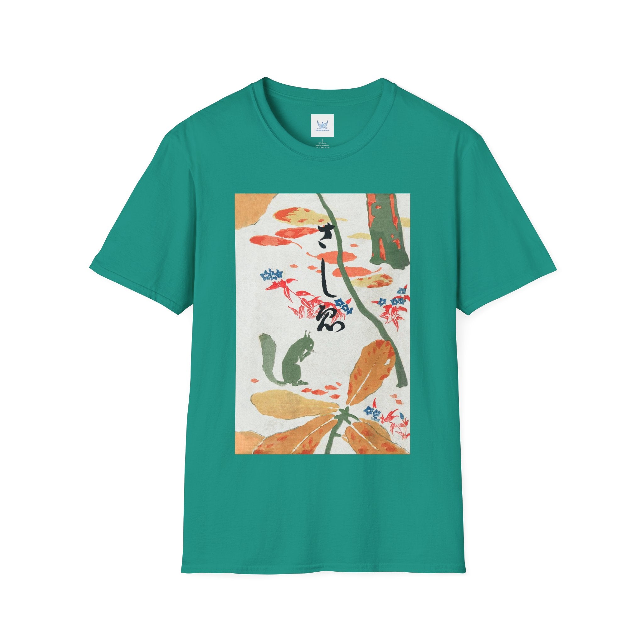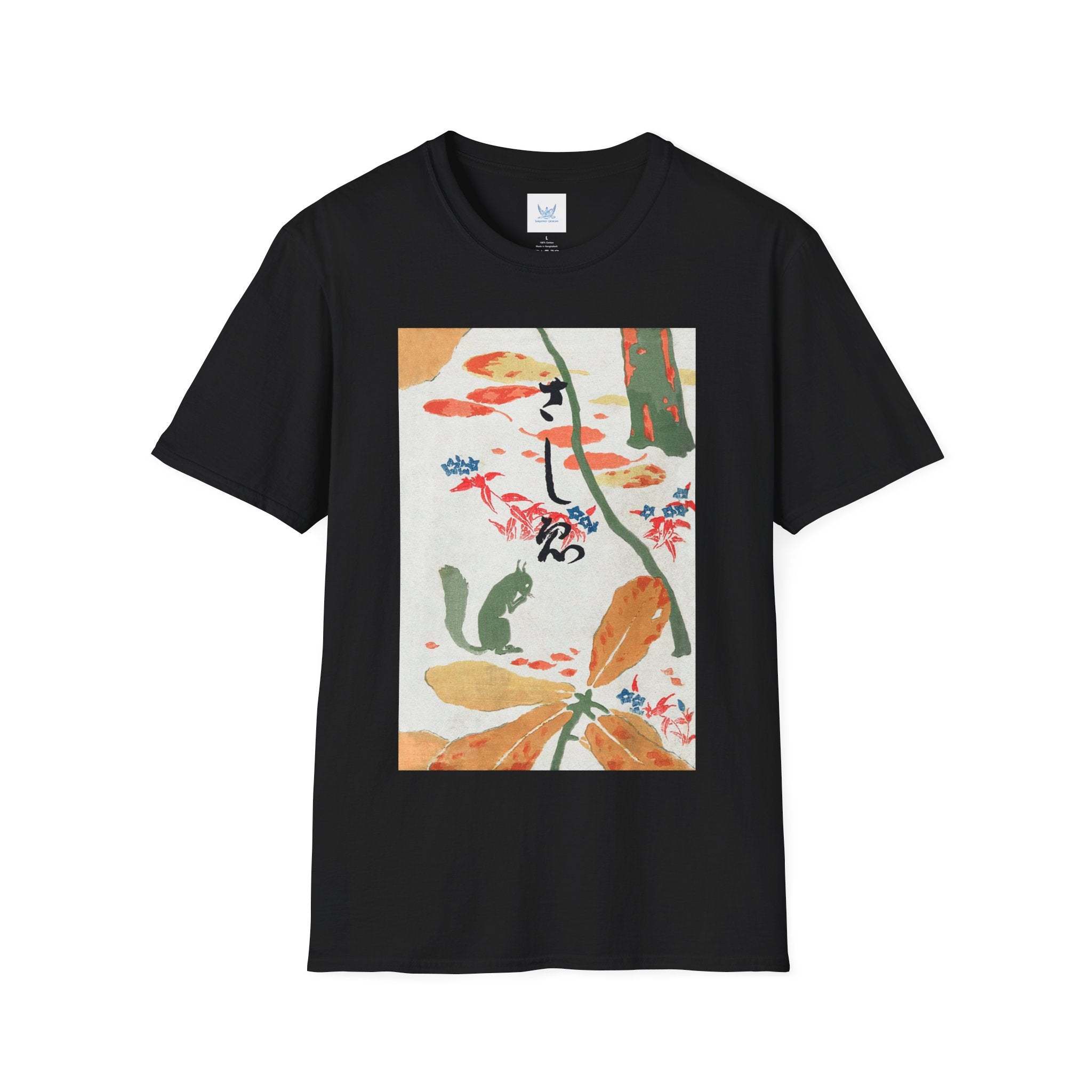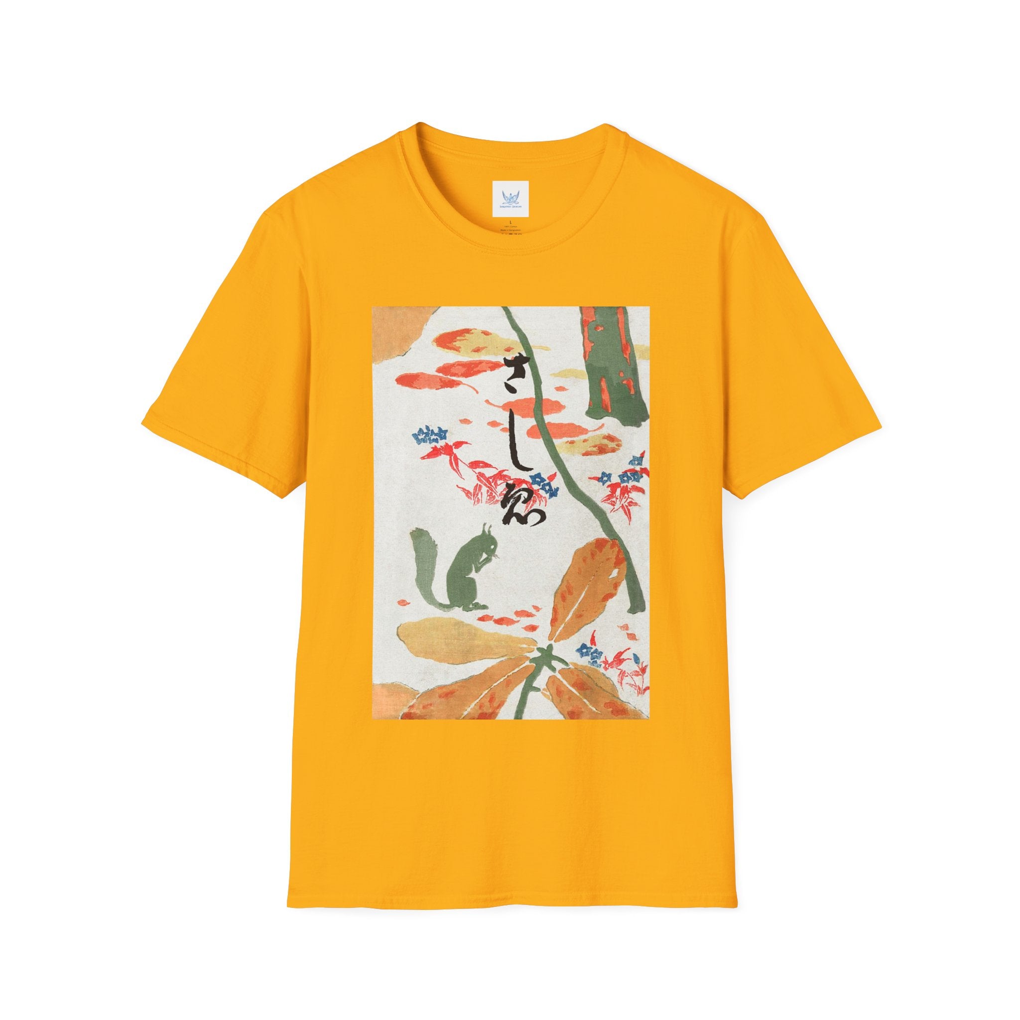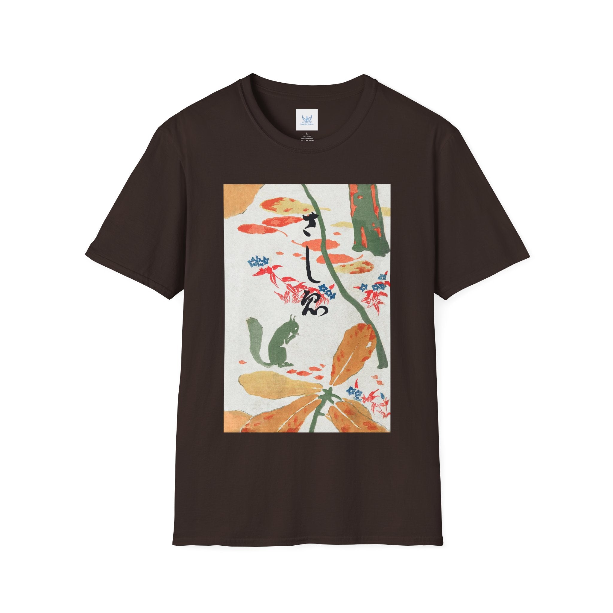 Step into serene elegance with Book Illustrations Sashi-e (1911) by Goyō Hashiguchi, beautifully presented on this ultra-soft Gildan Softstyle® 64000 tee. The artwork captures the gentle harmony of nature — a quiet squirrel nestled among broad leaves and blossoms, rendered in soothing greens, oranges, and blues. With his signature blend of nihonga tradition and early modern design, Hashiguchi transforms simplicity into timeless beauty.
