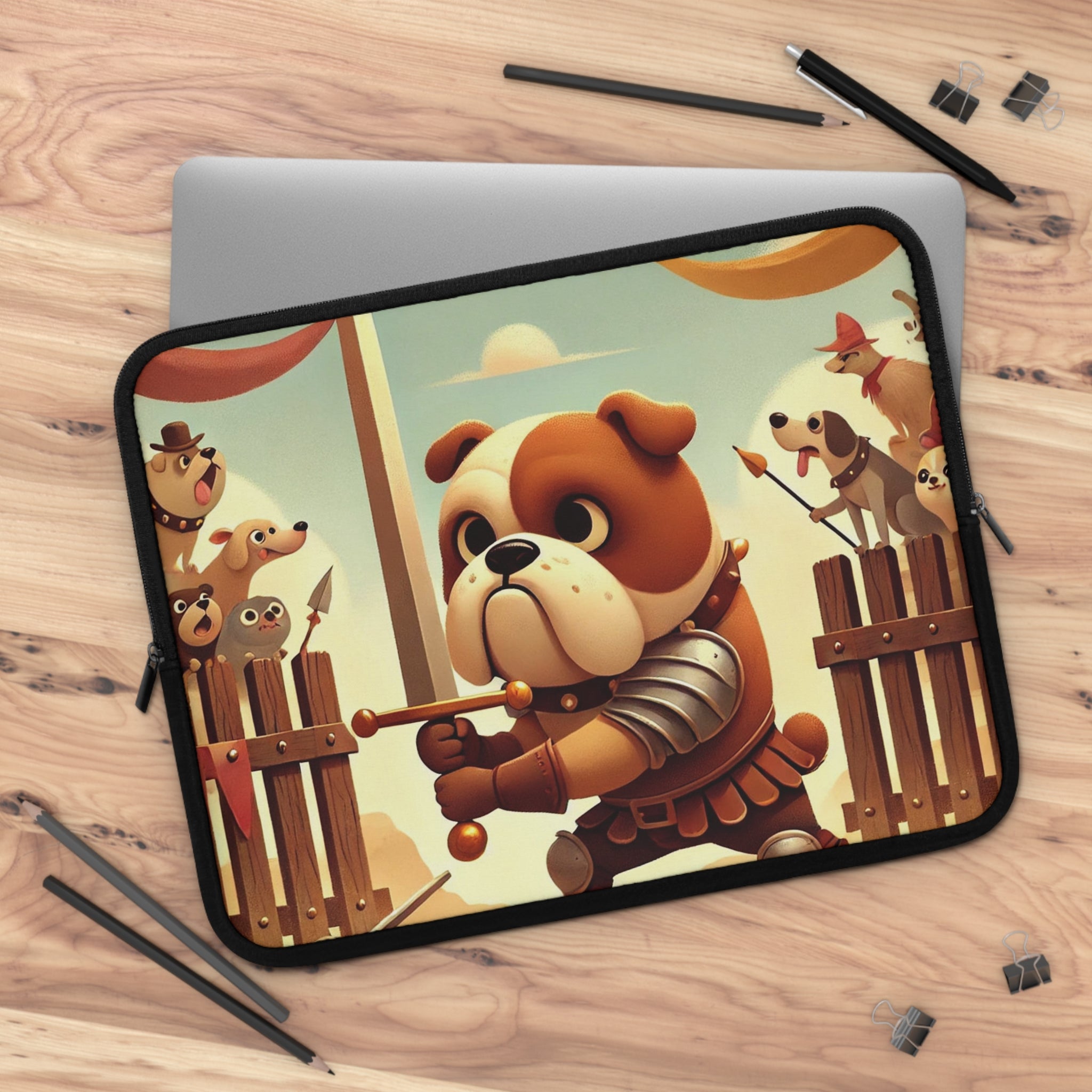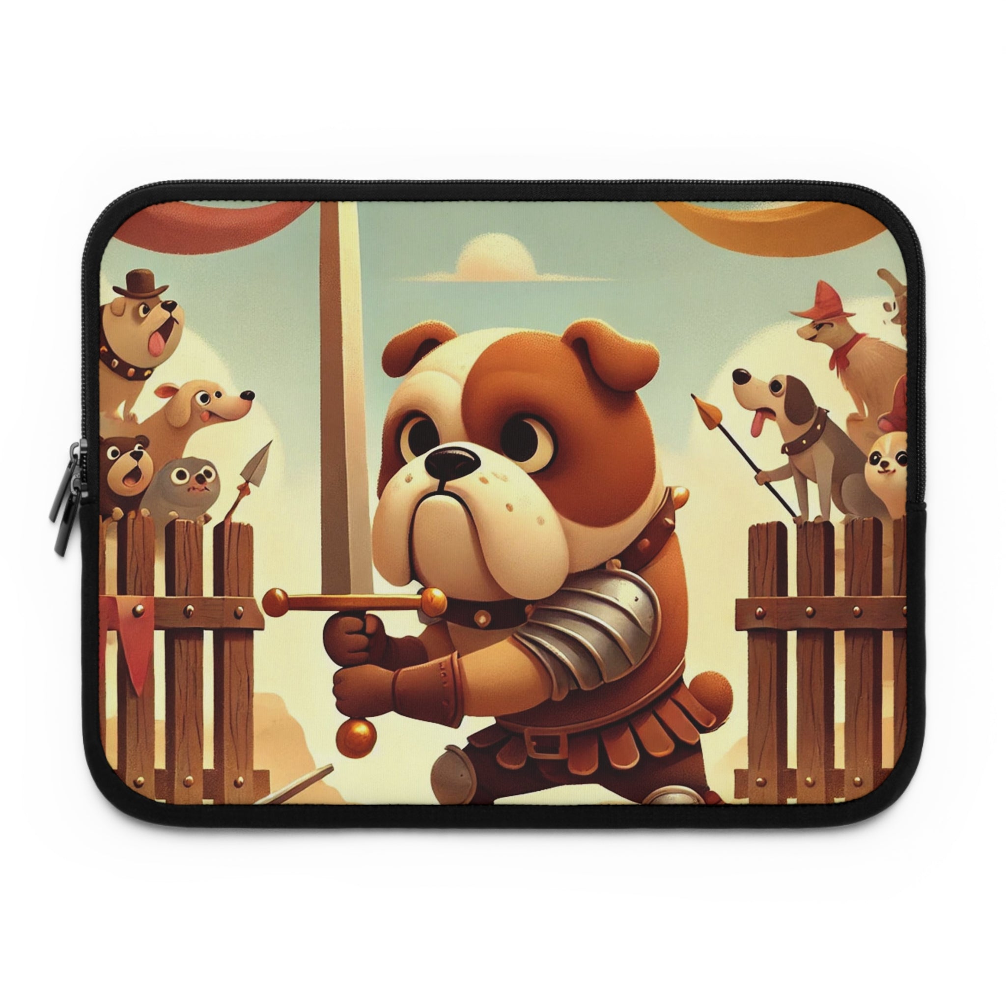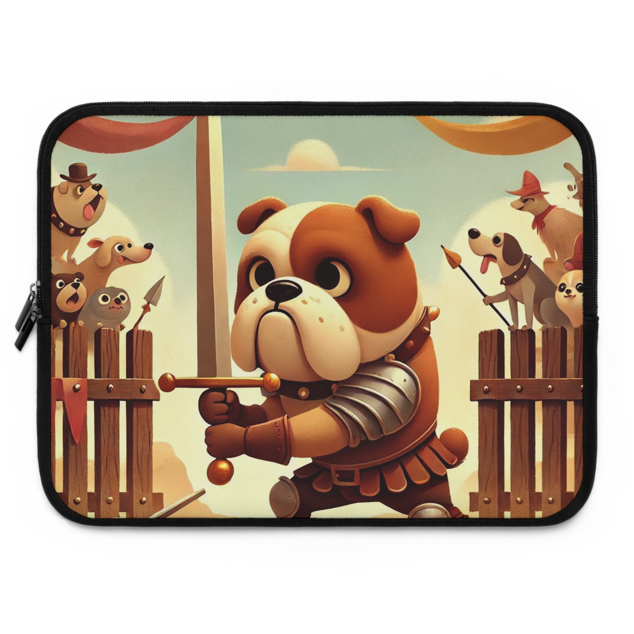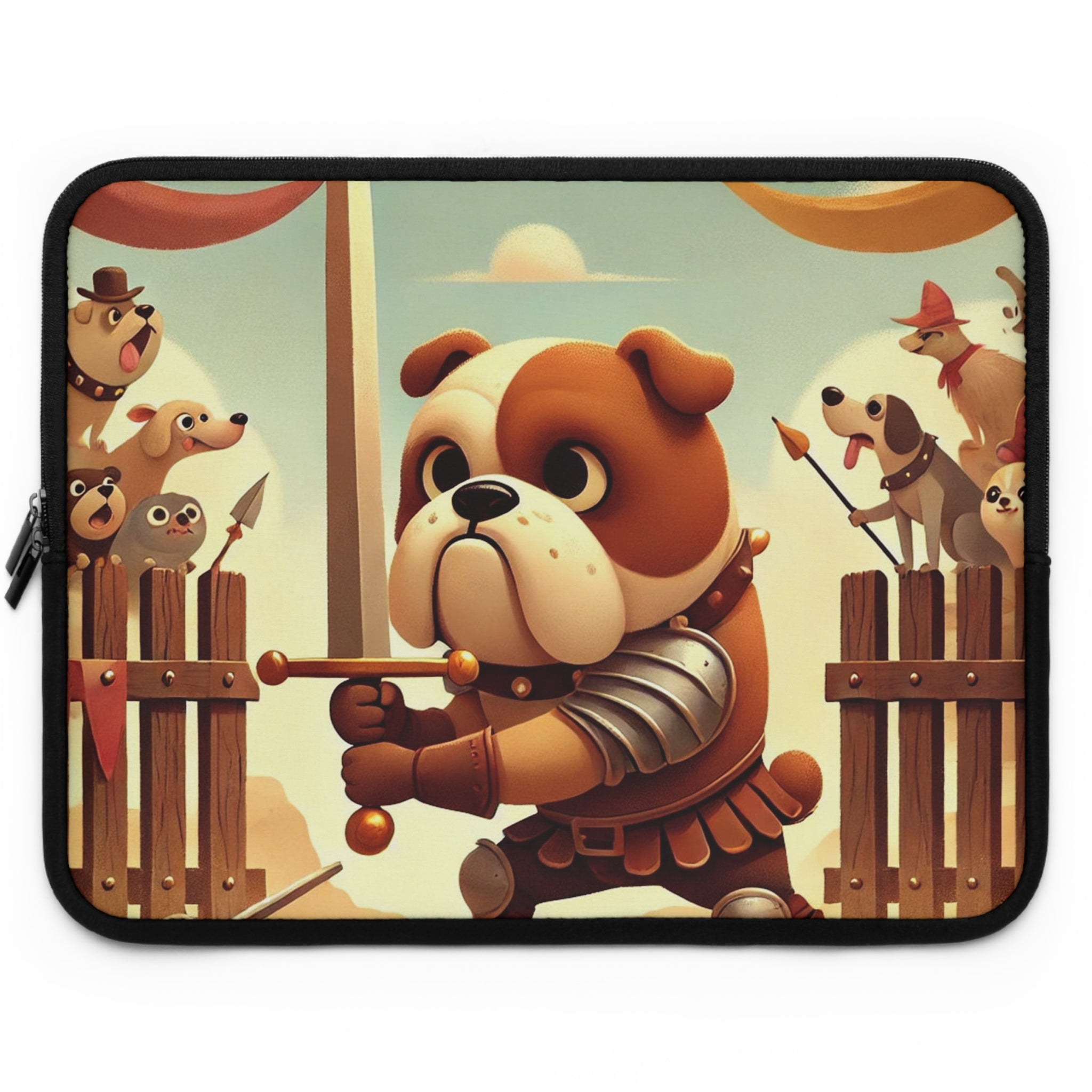 Bring bravery and charm wherever you go with the Bulldog Duel Laptop Sleeve. This delightful design captures a determined bulldog knight at the heart of a medieval arena, his sturdy paws gripping a gleaming sword as he faces his unseen challenger. Clad in shining armor, he stands with noble resolve while a crowd of spirited animal spectators—dogs, bears, and woodland creatures—cheer from behind wooden gates draped in colorful banners. Above them, ribbons flutter beneath a soft golden sky, bathing the scene in warmth and playful energy. Every detail celebrates courage, humor, and heart in a whimsical world where valor knows no species.