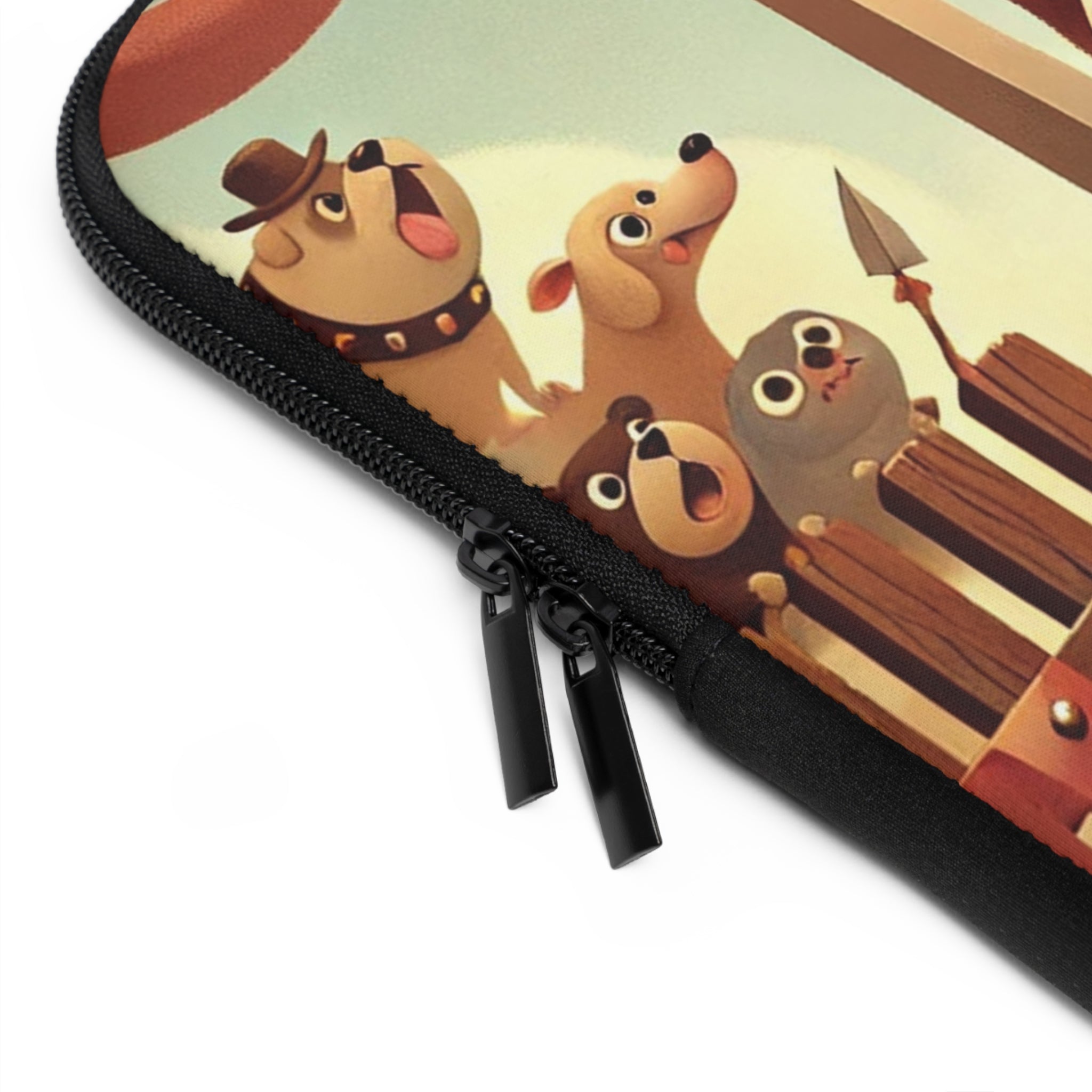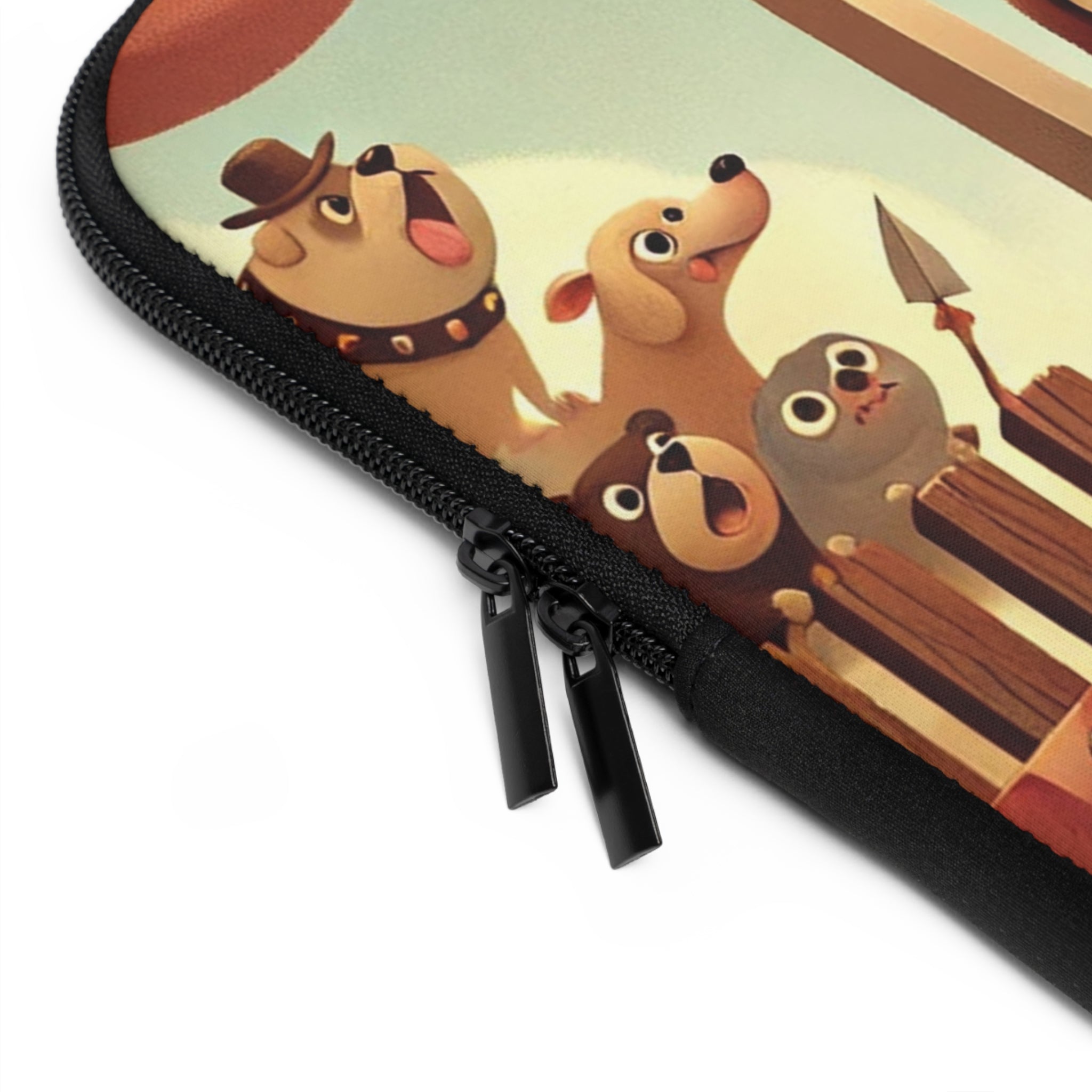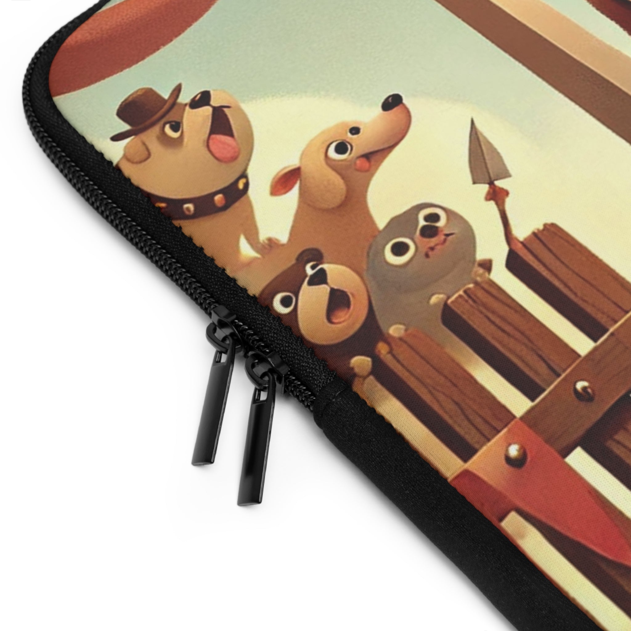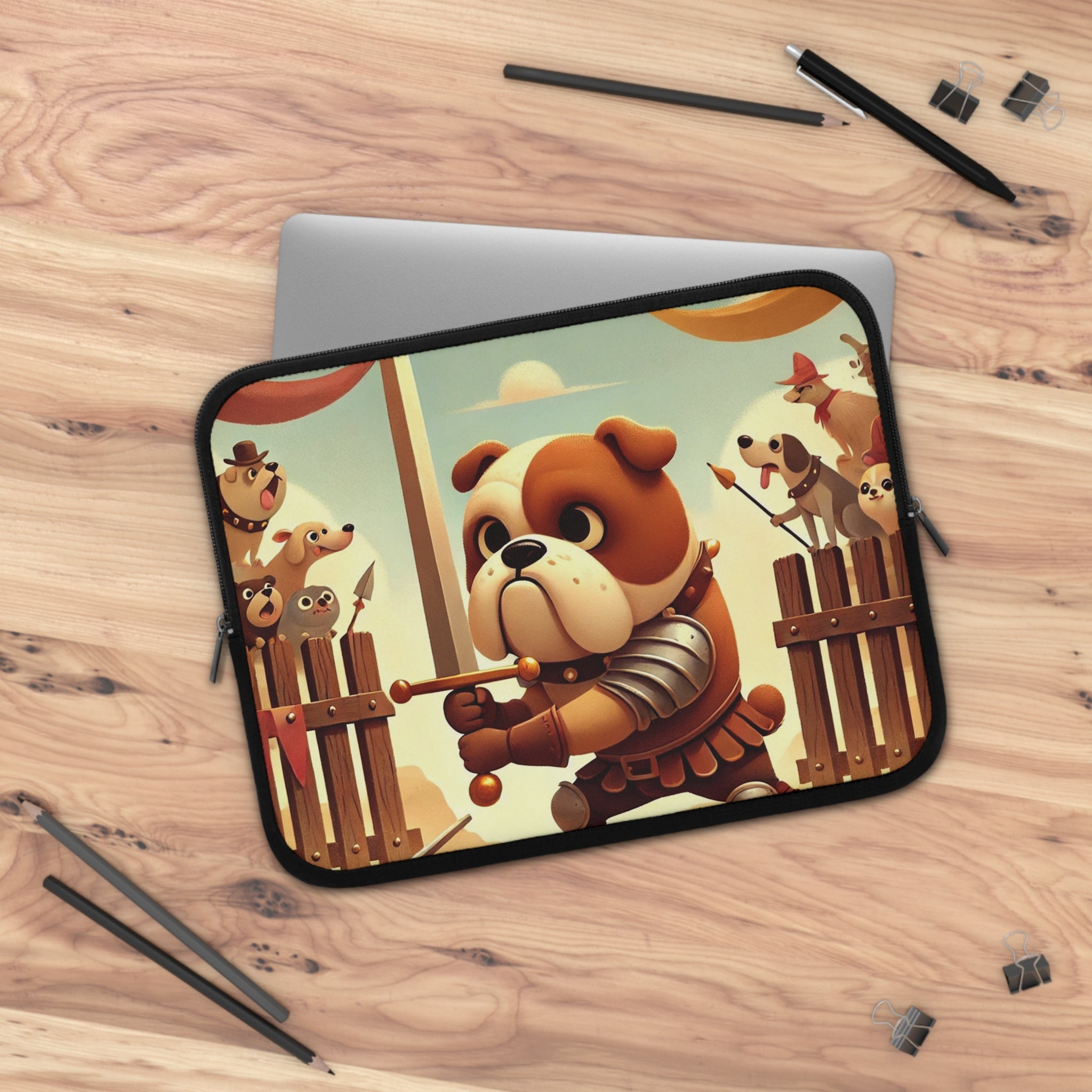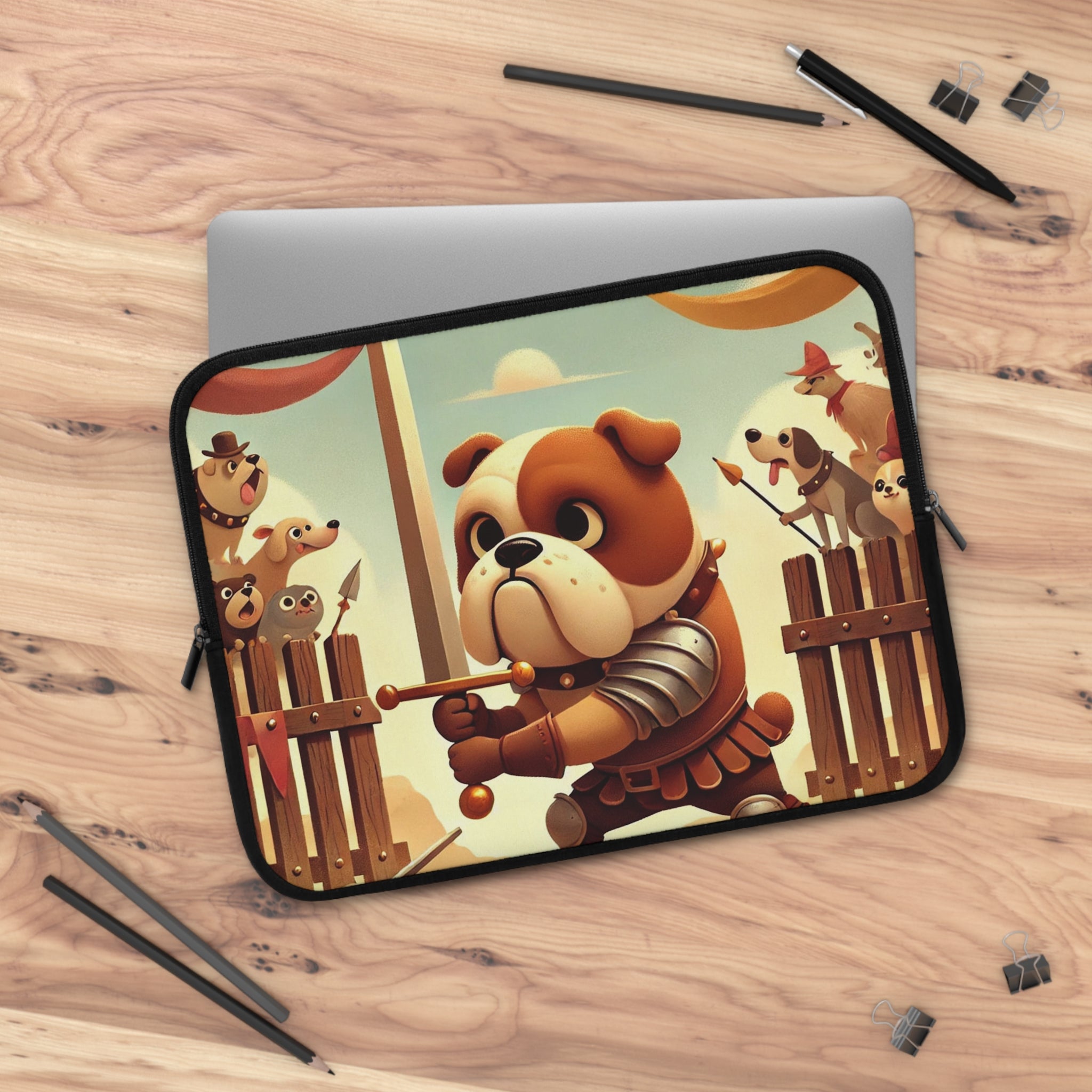 Bring bravery and charm wherever you go with the Bulldog Duel Laptop Sleeve. This delightful design captures a determined bulldog knight at the heart of a medieval arena, his sturdy paws gripping a gleaming sword as he faces his unseen challenger. Clad in shining armor, he stands with noble resolve while a crowd of spirited animal spectators—dogs, bears, and woodland creatures—cheer from behind wooden gates draped in colorful banners. Above them, ribbons flutter beneath a soft golden sky, bathing the scene in warmth and playful energy. Every detail celebrates courage, humor, and heart in a whimsical world where valor knows no species.