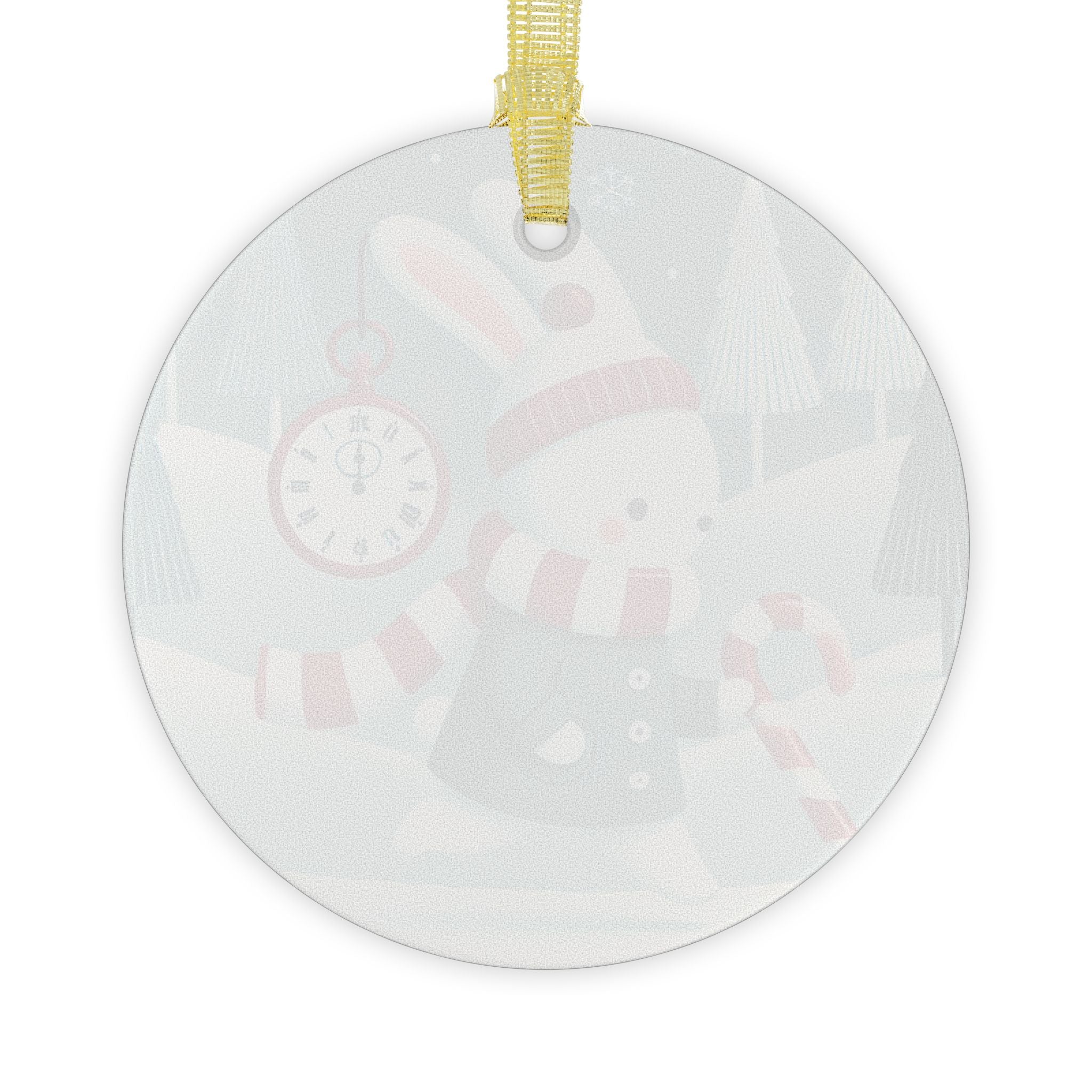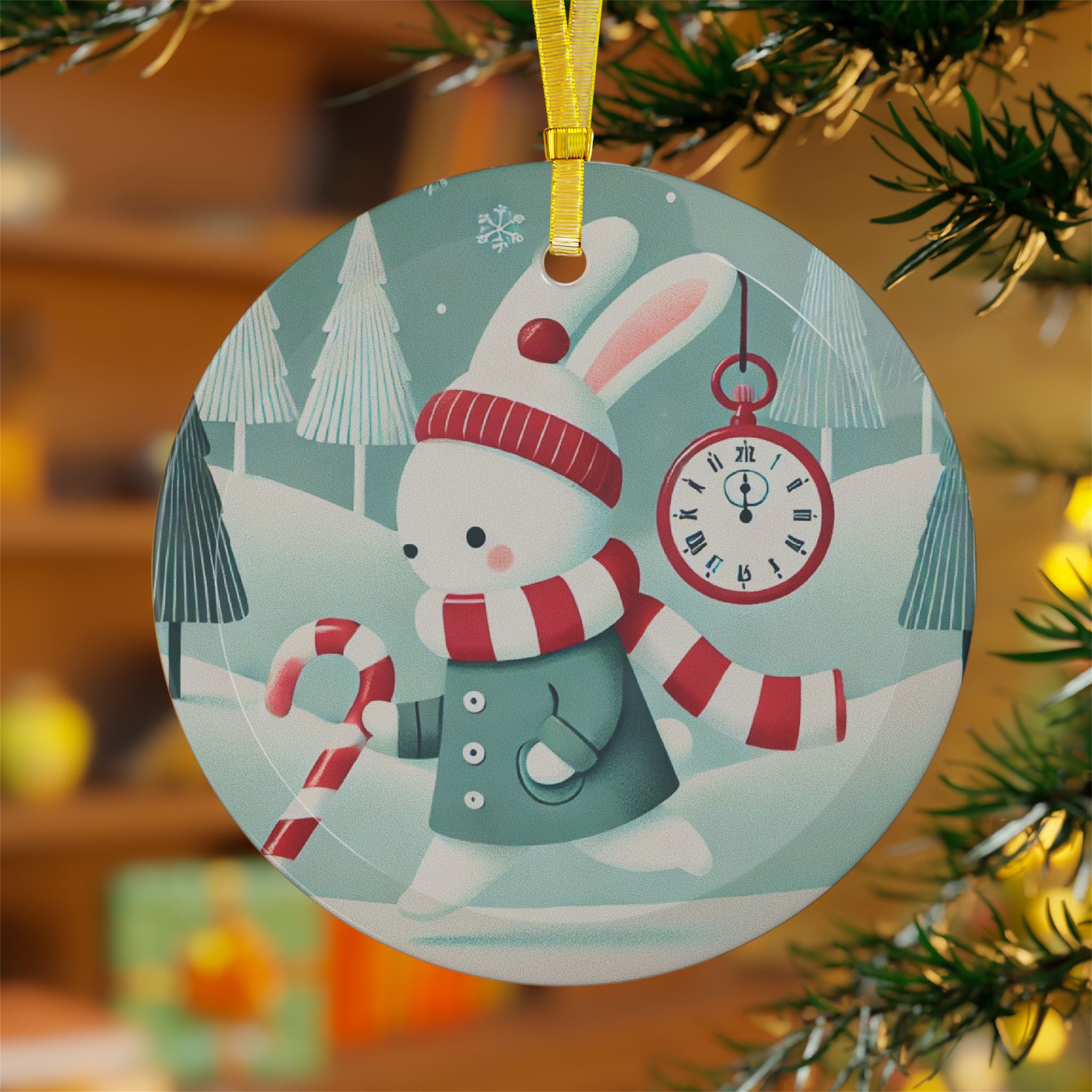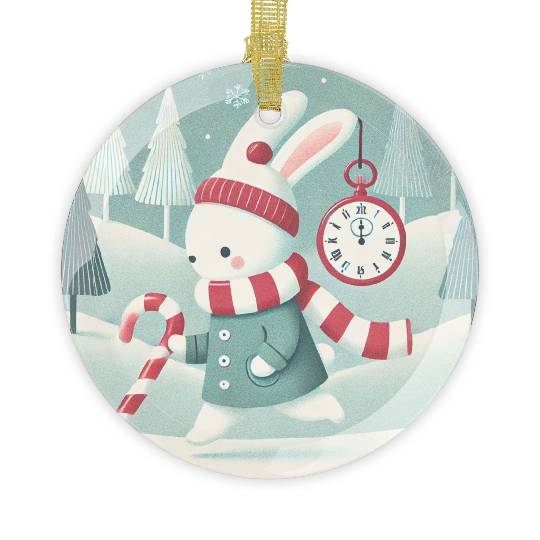 The artwork turns this ornament into a magical holiday scene. A lively white rabbit, dressed in a buttoned winter coat, bounds across a snowy forest clearing with boundless energy. In his paw, he carries a towering candy cane crowned with a vintage pocket watch, as though he’s racing against time to keep Christmas on schedule.