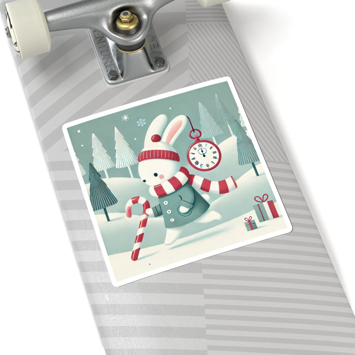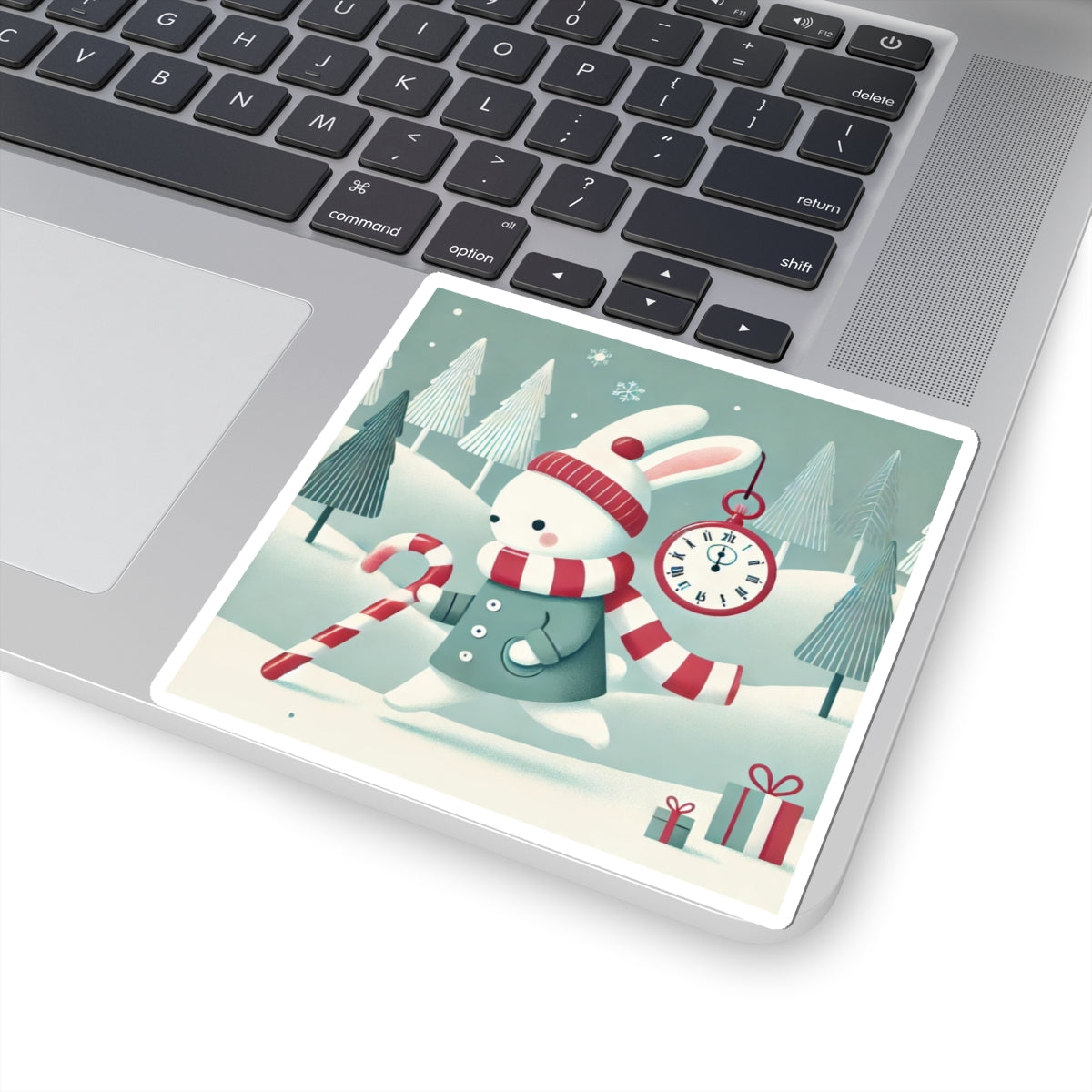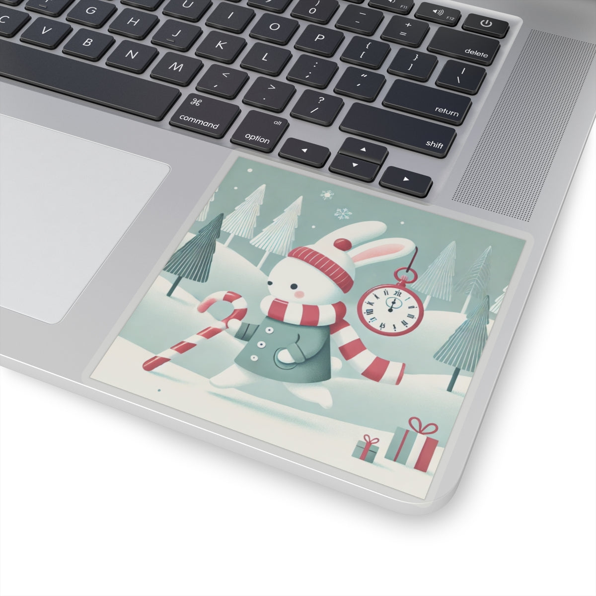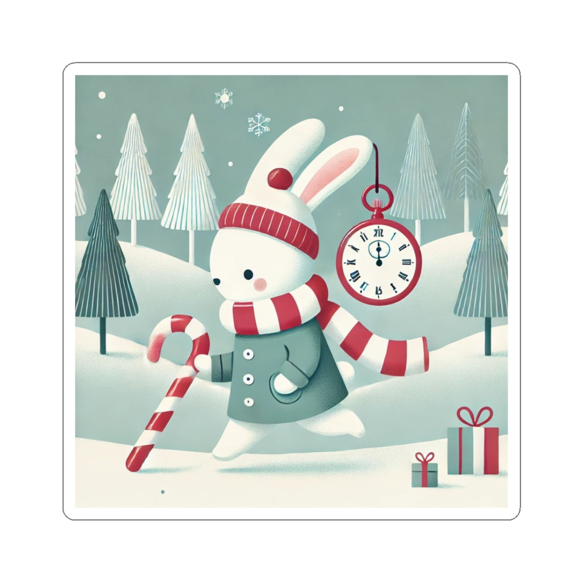 The artwork transforms every sticker into a playful winter tale. A cheerful white rabbit, smartly dressed in a buttoned winter coat, bounds through a snowy forest clearing with boundless energy. In his paw he carries a towering candy cane, topped with a vintage pocket watch, as though he’s racing against time to deliver gifts and joy.