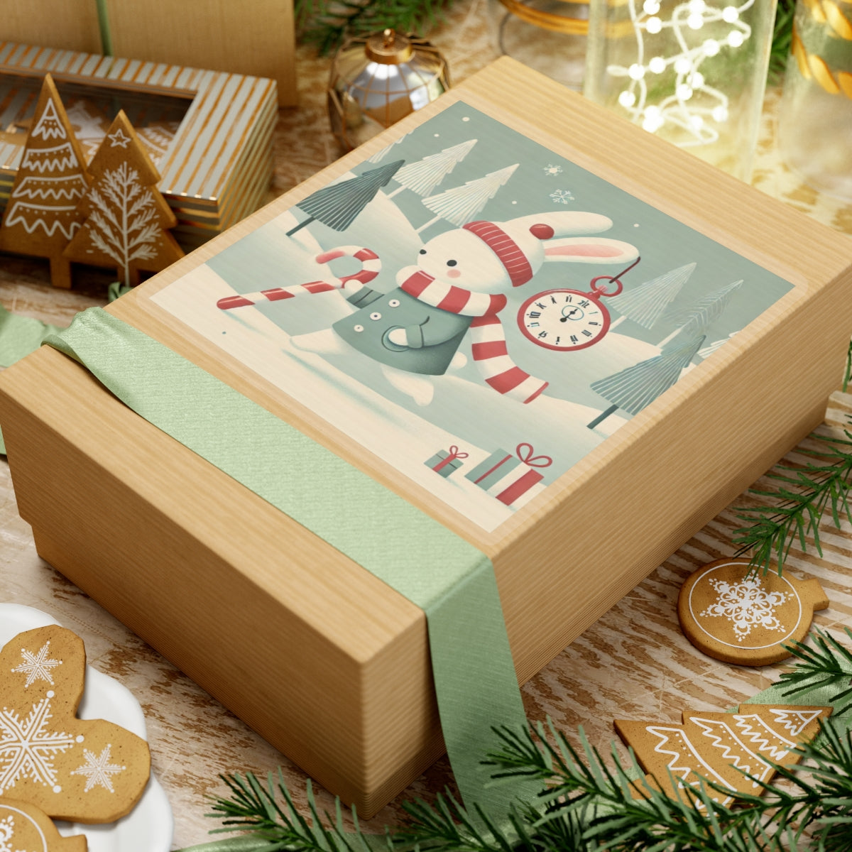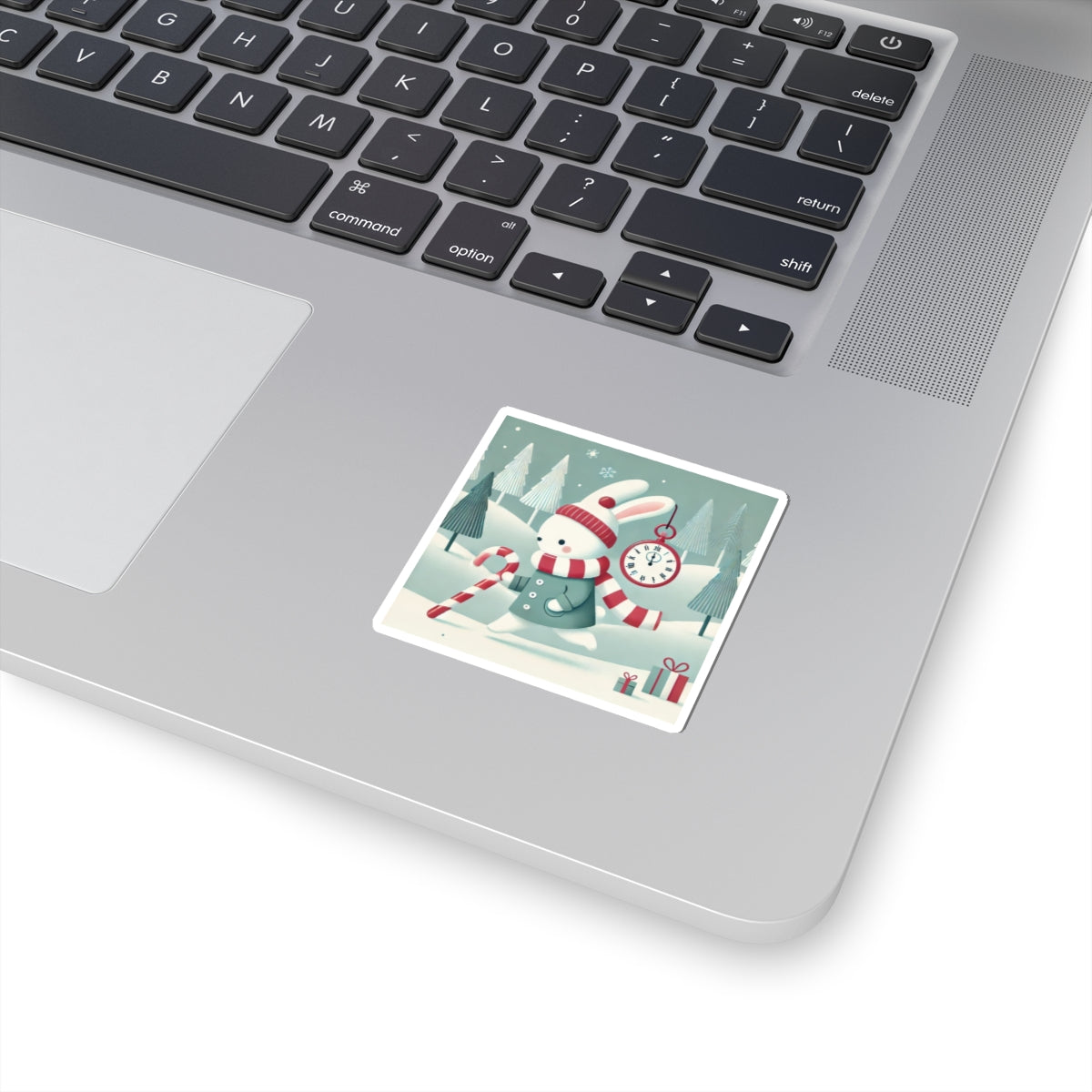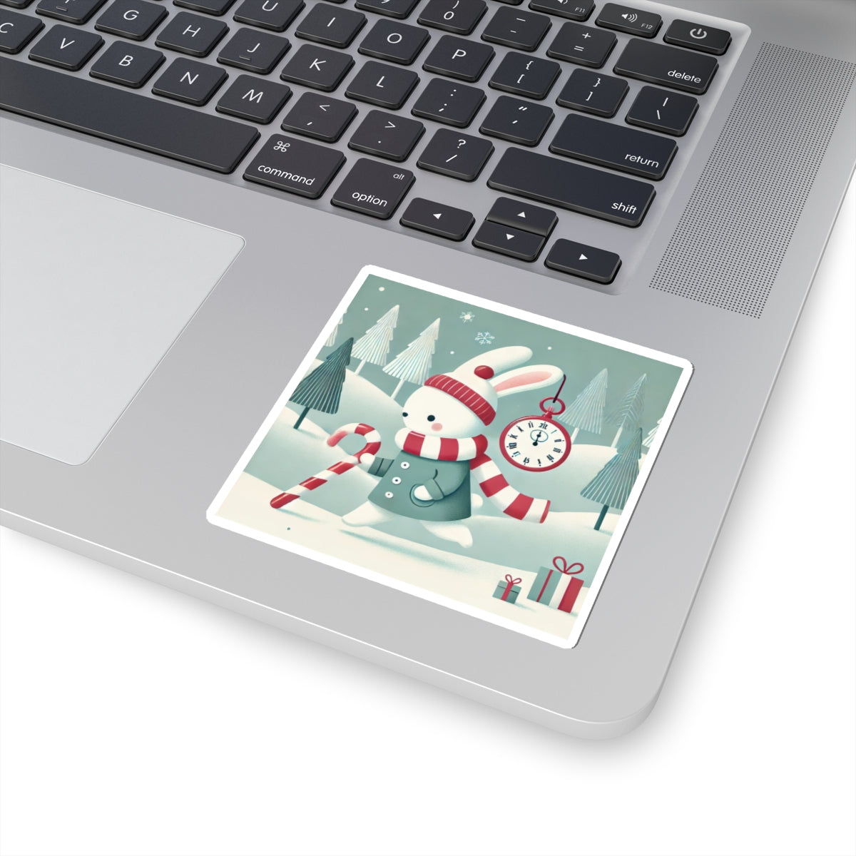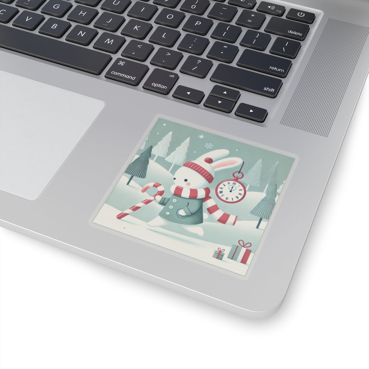 The artwork transforms every sticker into a playful winter tale. A cheerful white rabbit, smartly dressed in a buttoned winter coat, bounds through a snowy forest clearing with boundless energy. In his paw he carries a towering candy cane, topped with a vintage pocket watch, as though he’s racing against time to deliver gifts and joy.