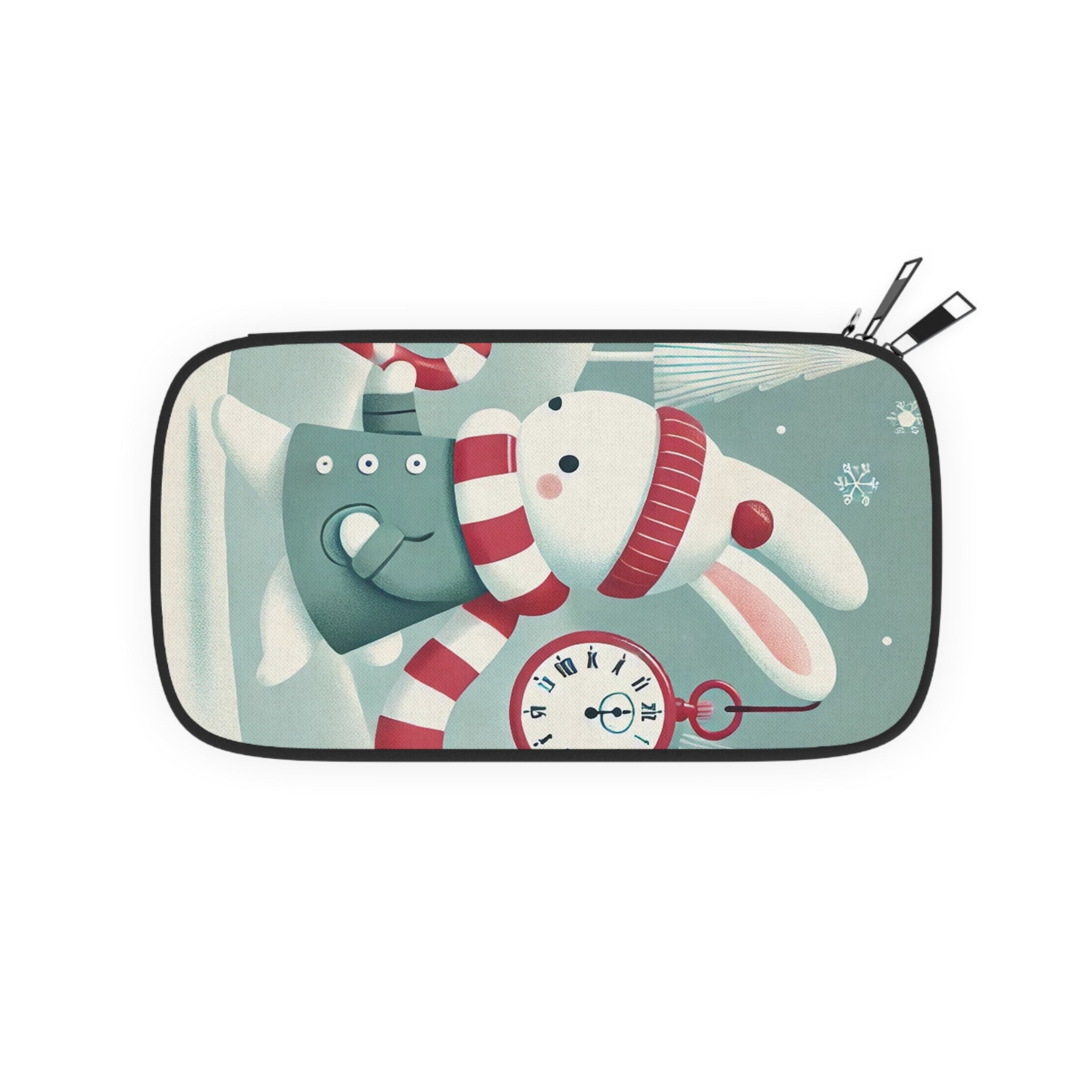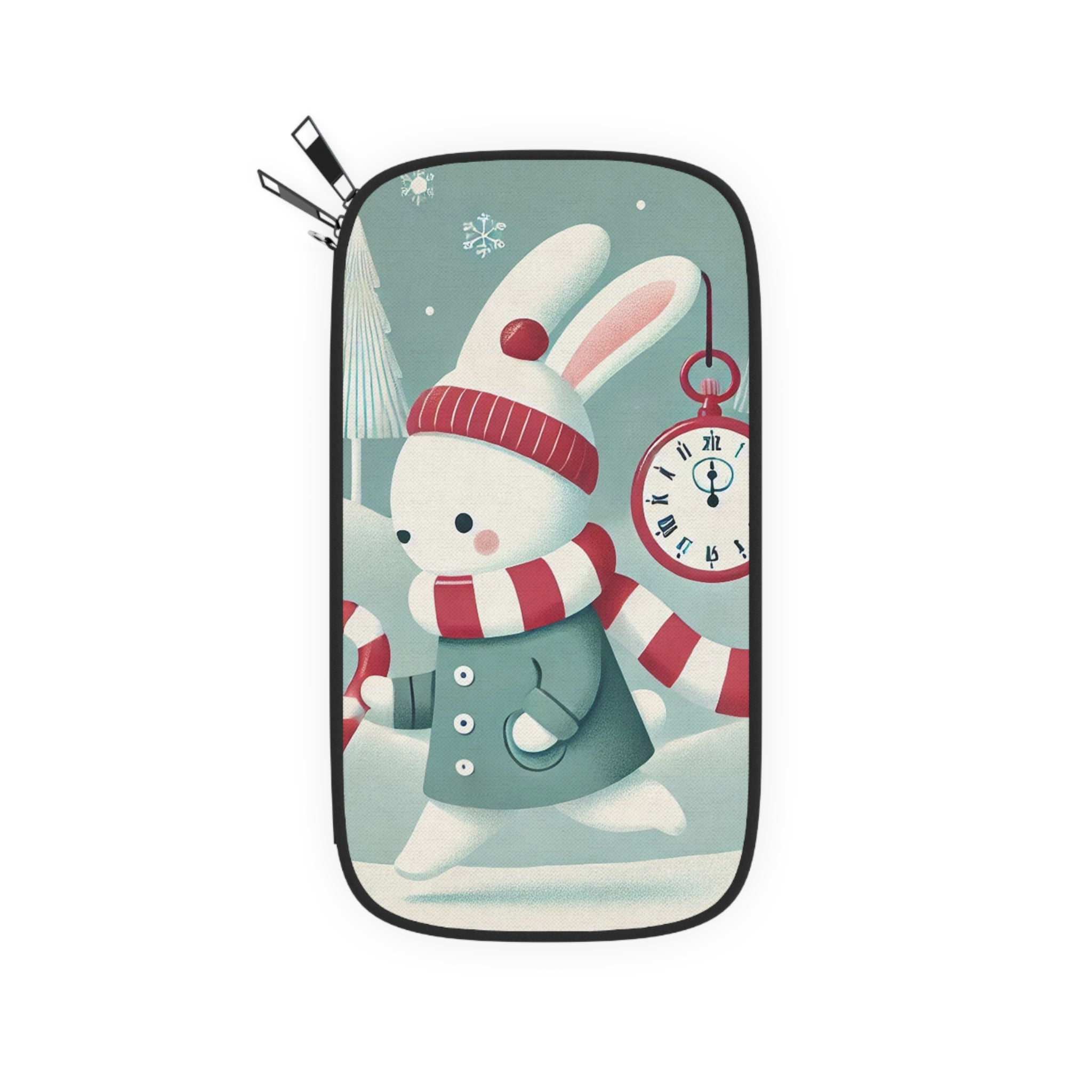 The design transforms this functional piece into a festive keepsake. The Candy Cane Timekeeper Bunny takes center stage, smartly dressed in a tailored winter coat while racing through a holiday landscape. In his paw, he clutches a towering candy cane topped with a gleaming pocket watch, determined to keep Christmas cheer perfectly on time. Snow-dusted evergreens shimmer in the background, while wrapped gifts and twinkling lights complete the magical scene.