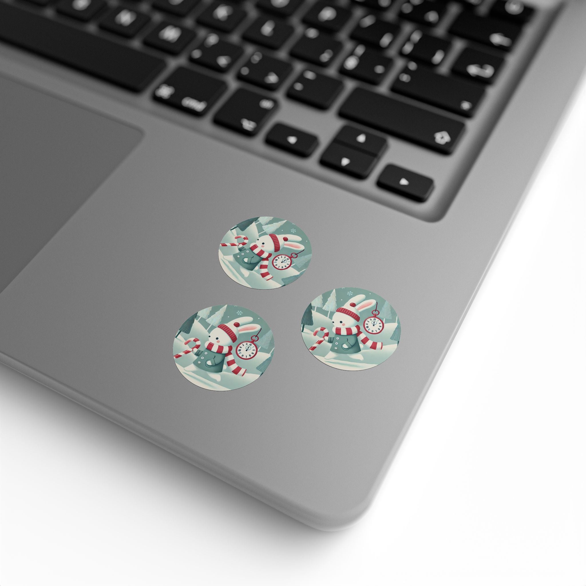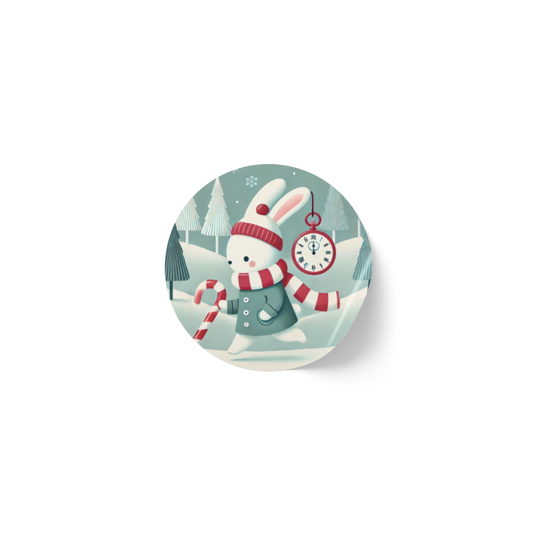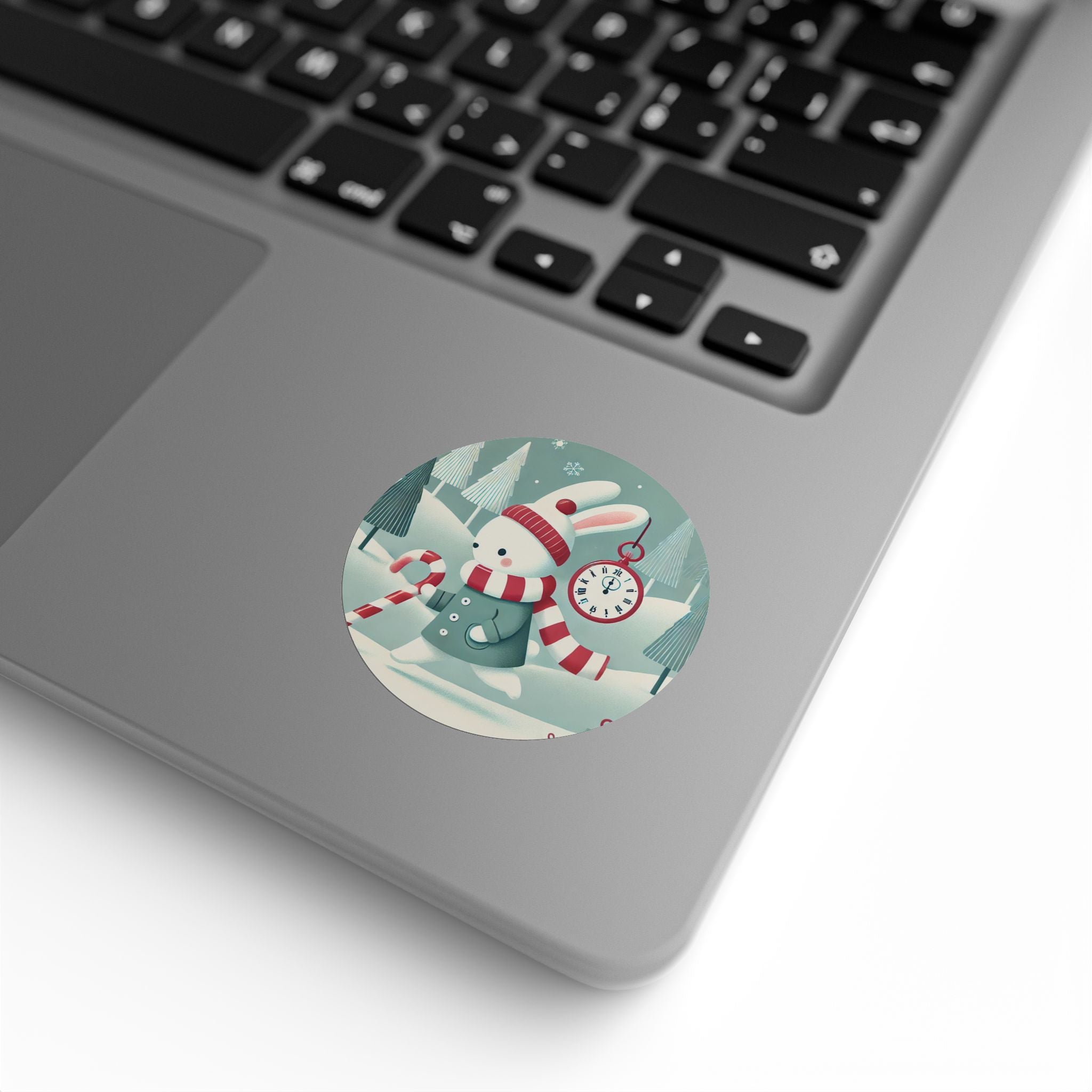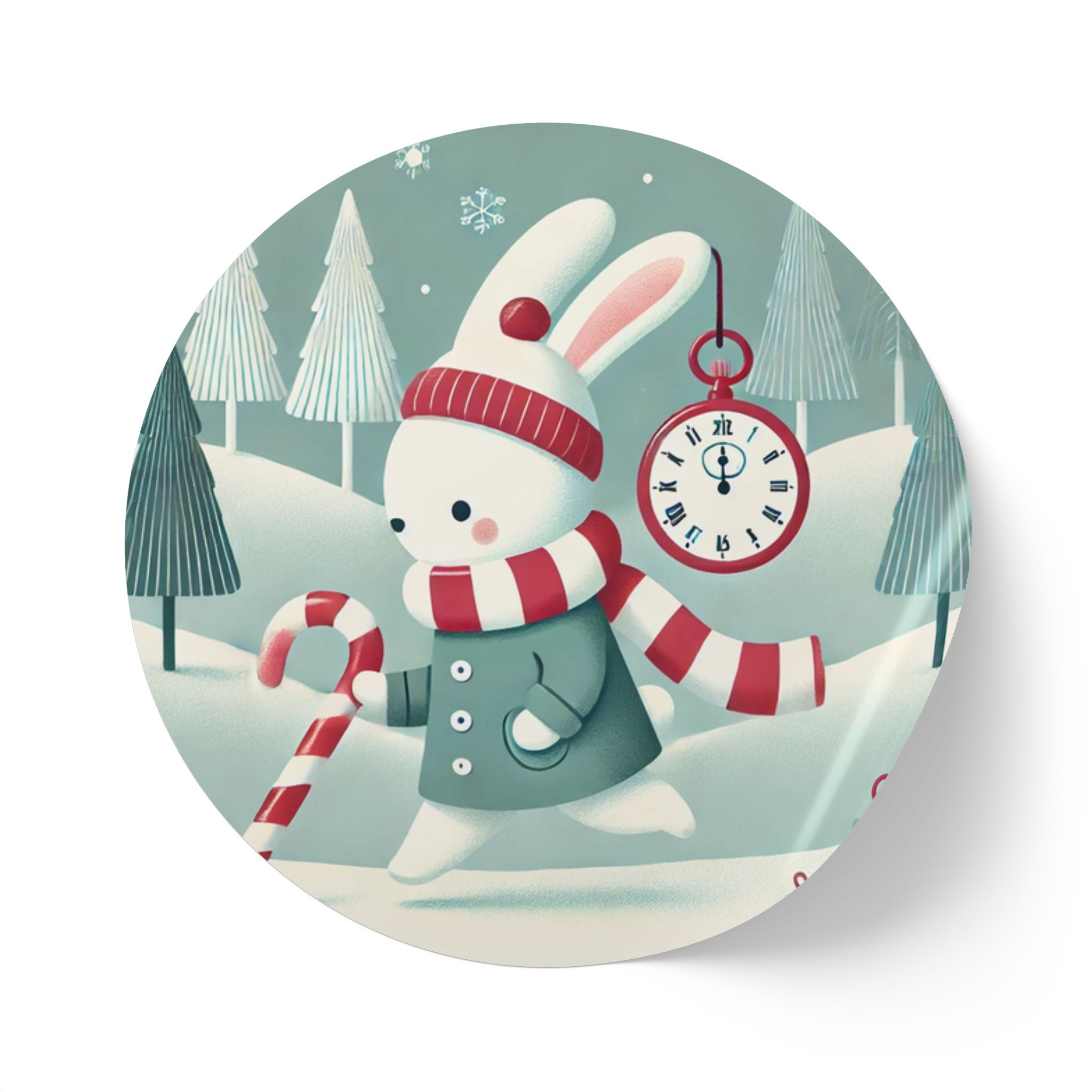 The artwork transforms each sticker into a whimsical holiday tale. A joyful white rabbit, dressed in a buttoned winter coat, leaps across a snowy forest clearing with lively determination. In his paw, he carries a towering candy cane topped with a vintage pocket watch, racing to keep the magic of Christmas right on time.