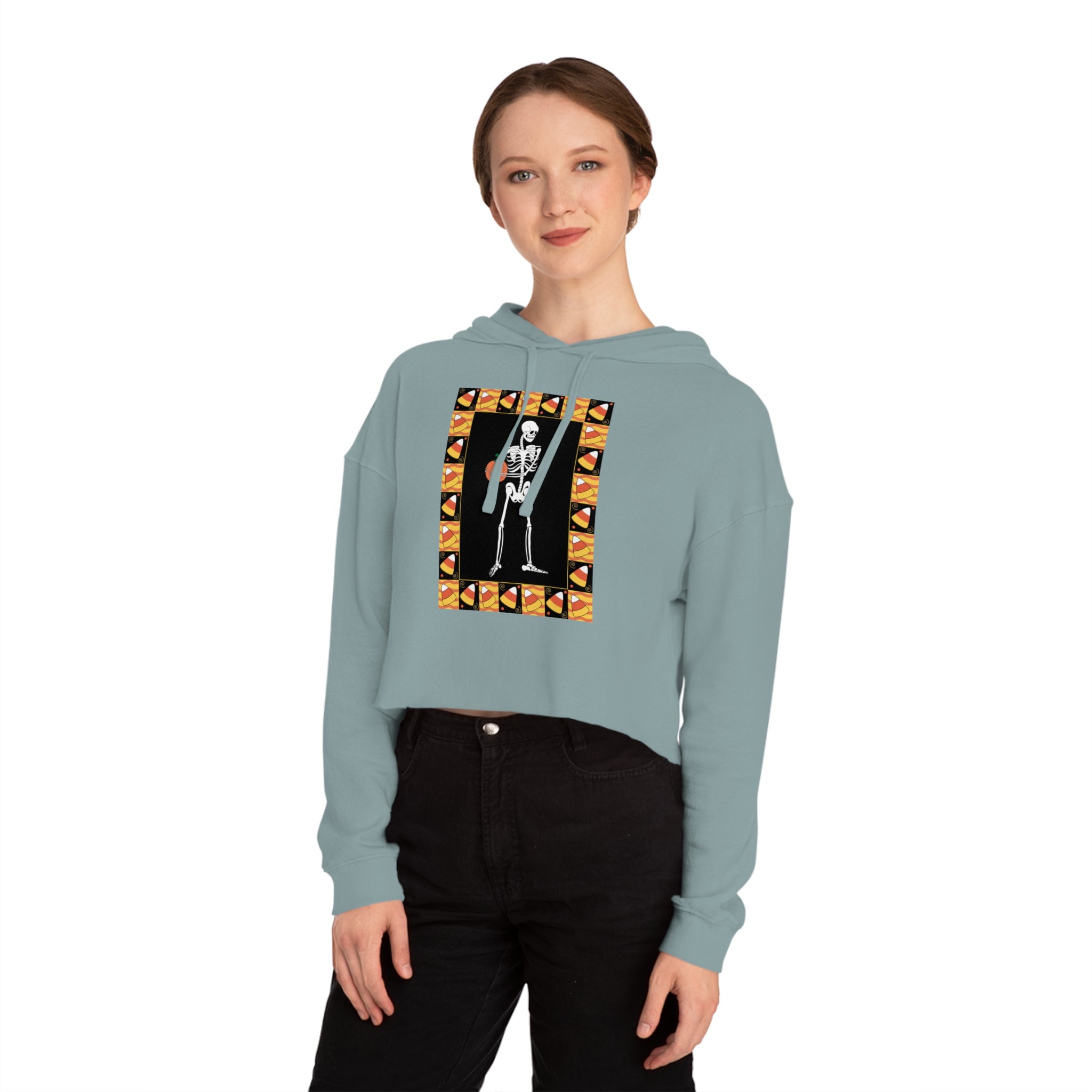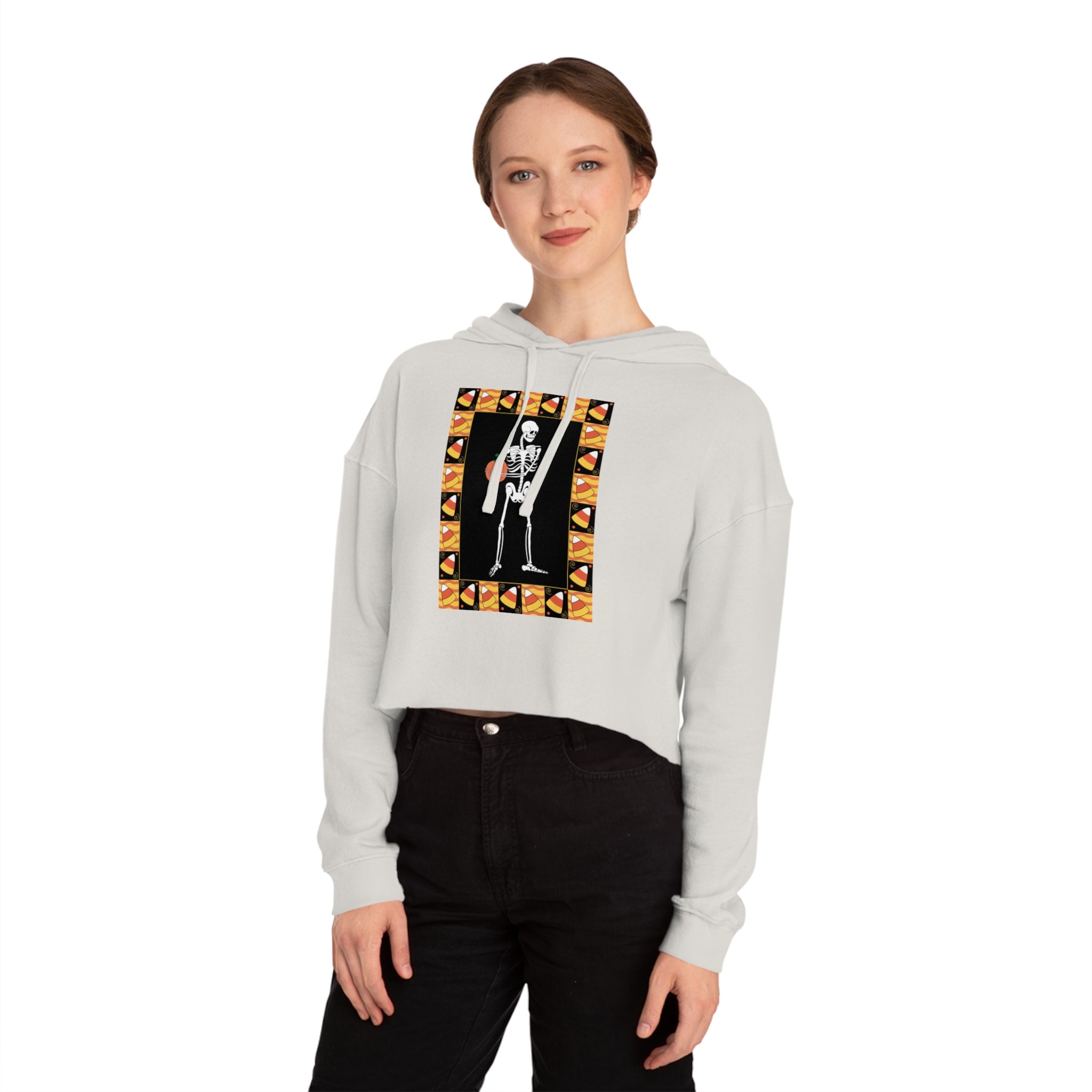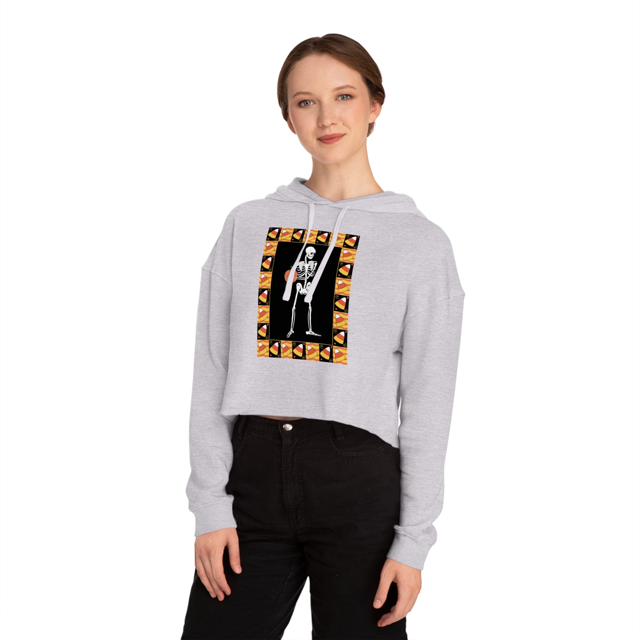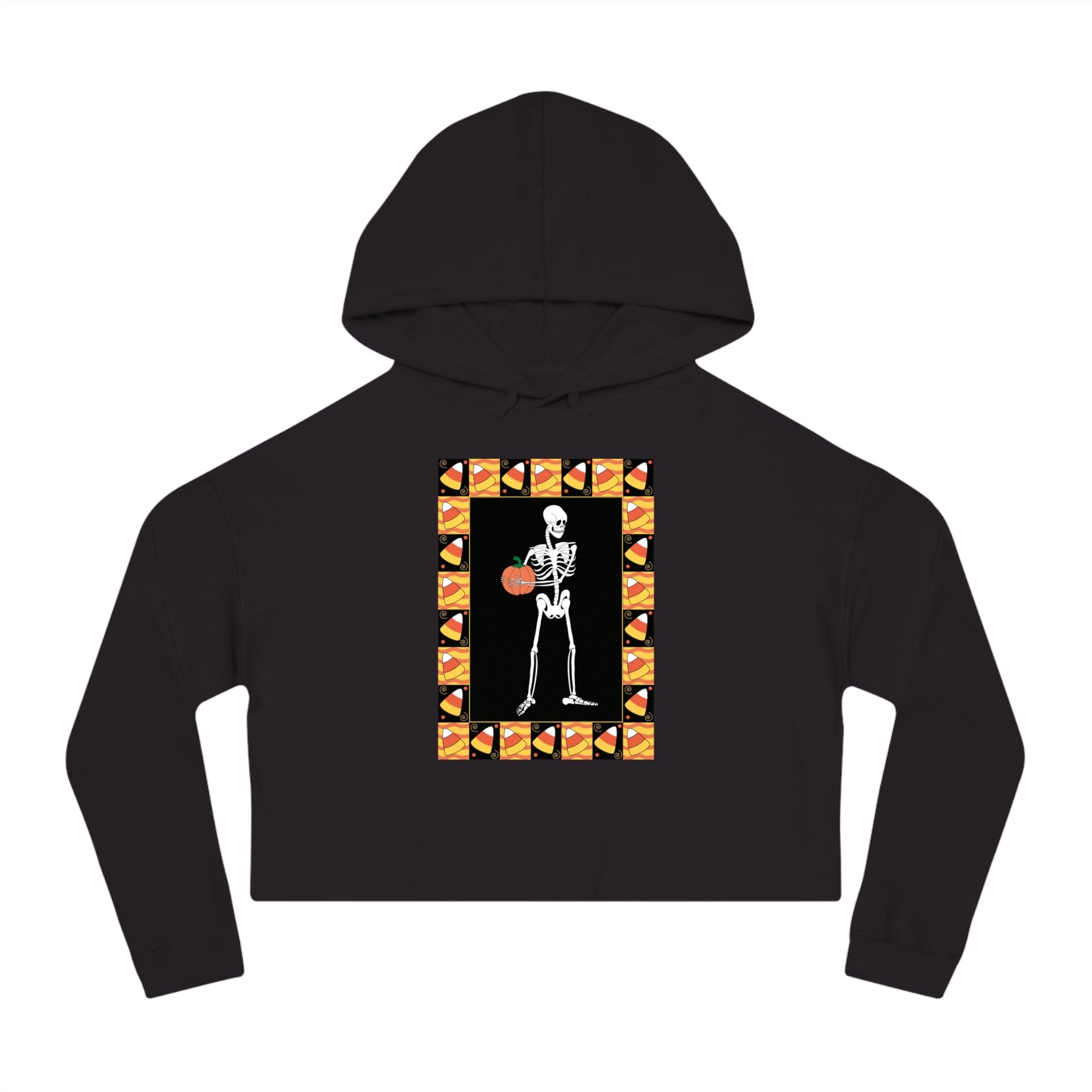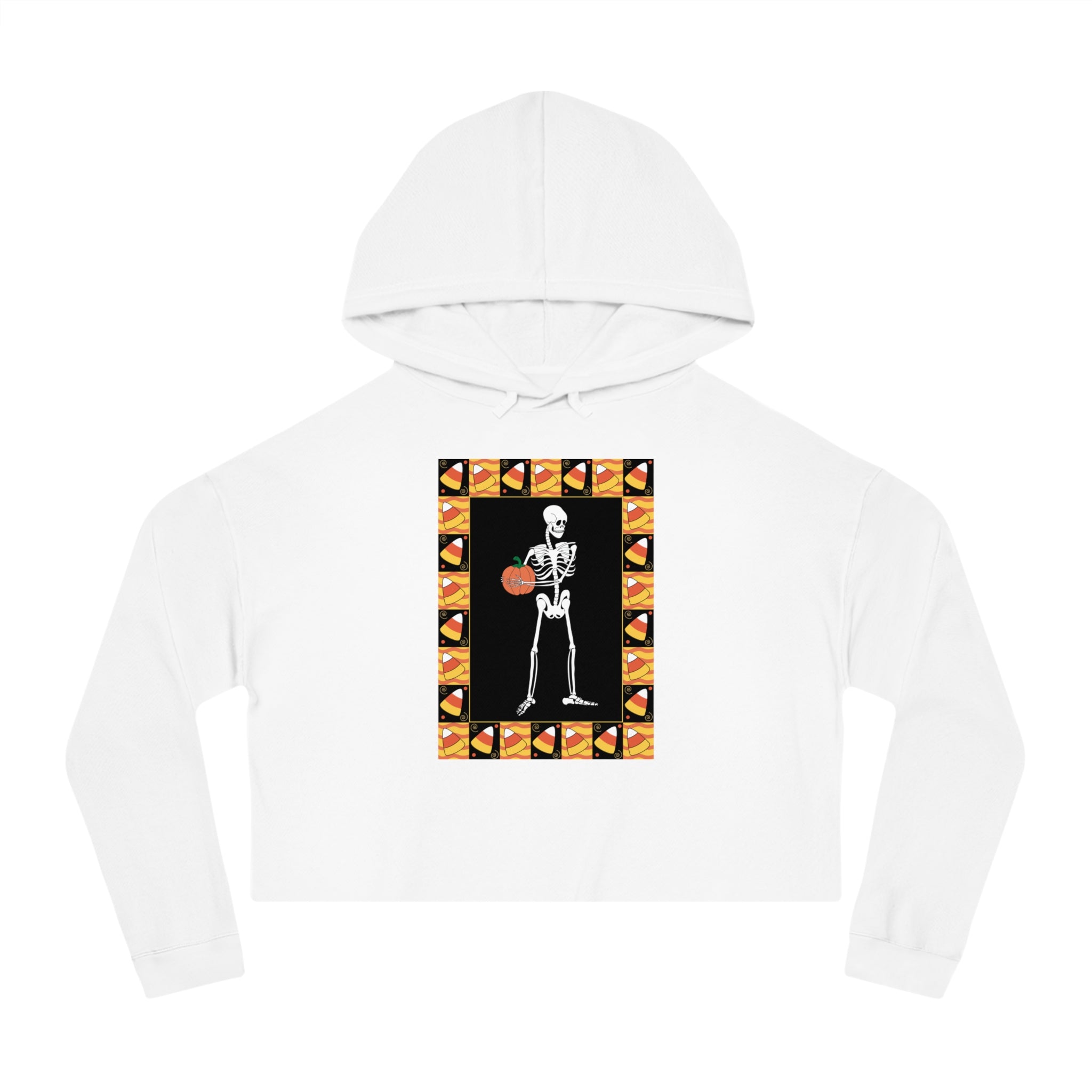 Artwork created, designed and digitally remastered by Sarasvati Designs. In the center of this striking artwork, a whimsical skeleton stands against a stark black background, holding a vibrant orange pumpkin with both hands. Surrounding the scene is a decorative border of colorful candy corn, adding a cheerful and nostalgic touch to the overall composition. The contrast between the dark background and the bright elements creates a captivating and festive image that celebrates the spirit of Halloween.