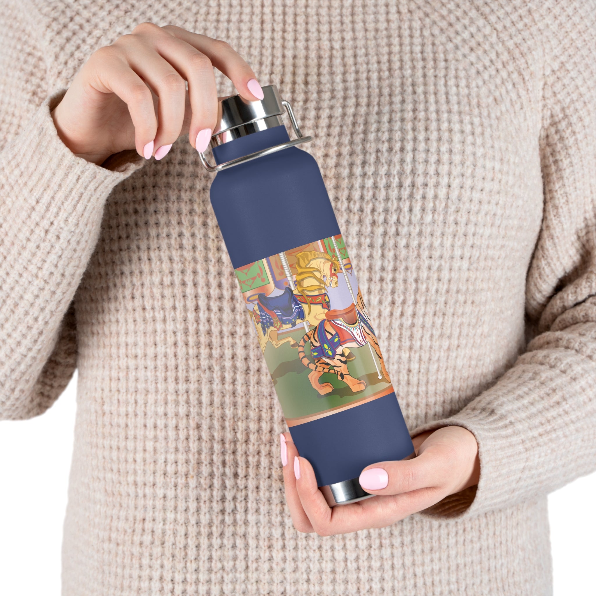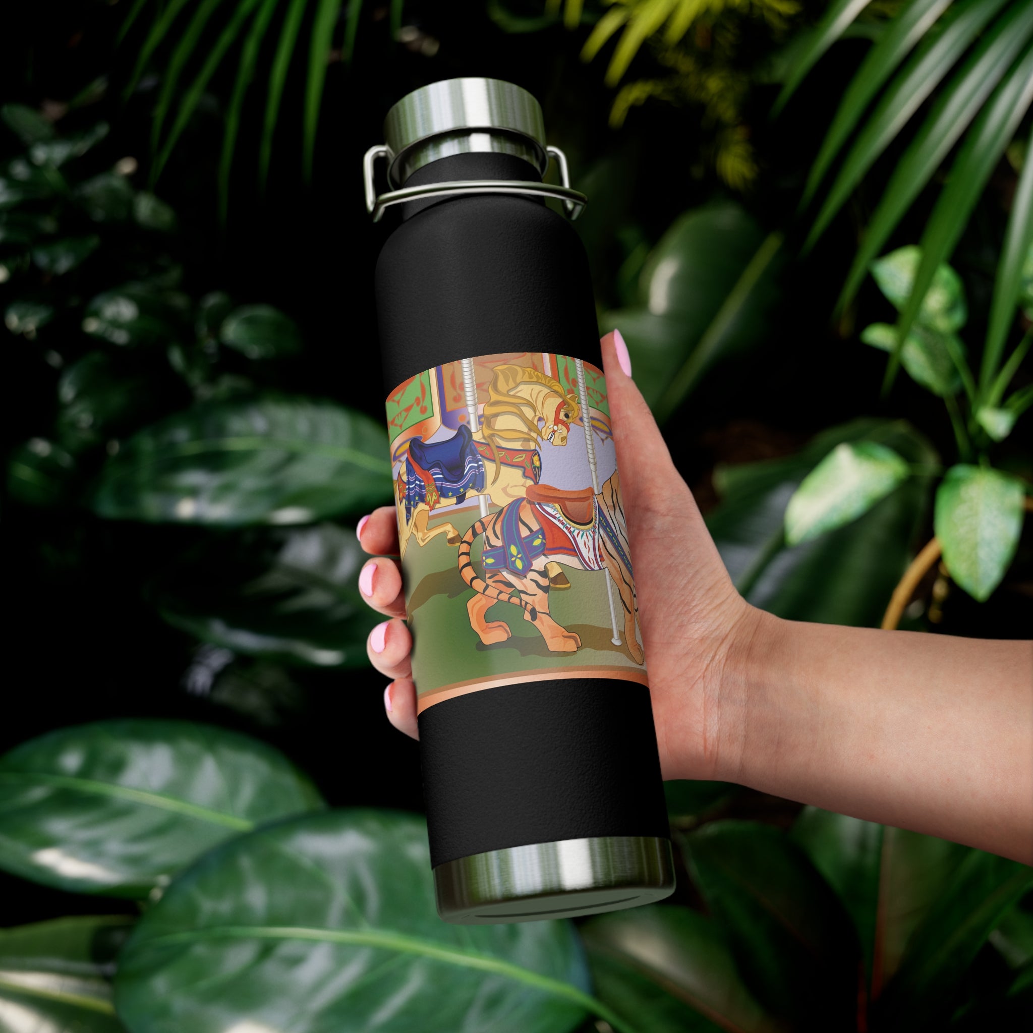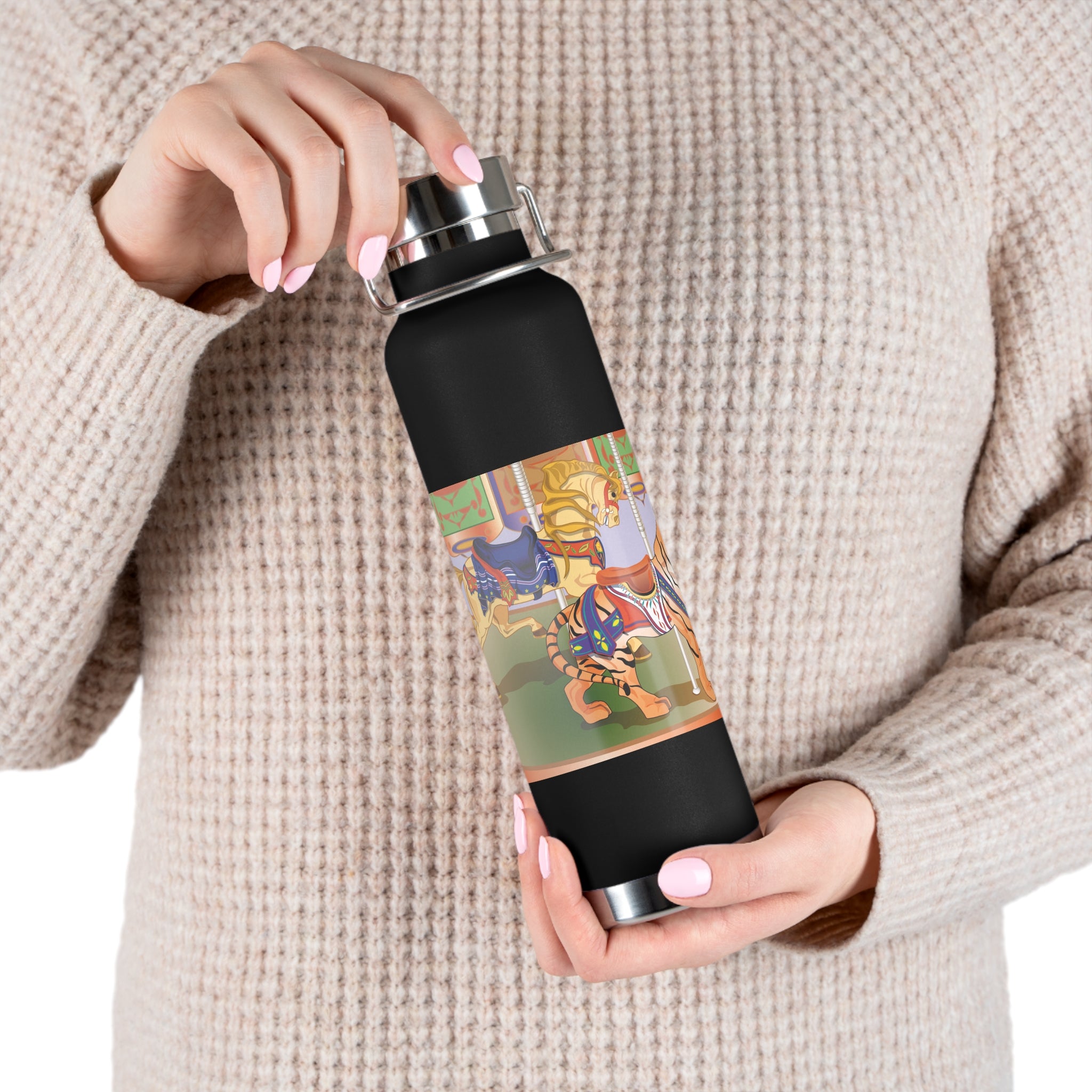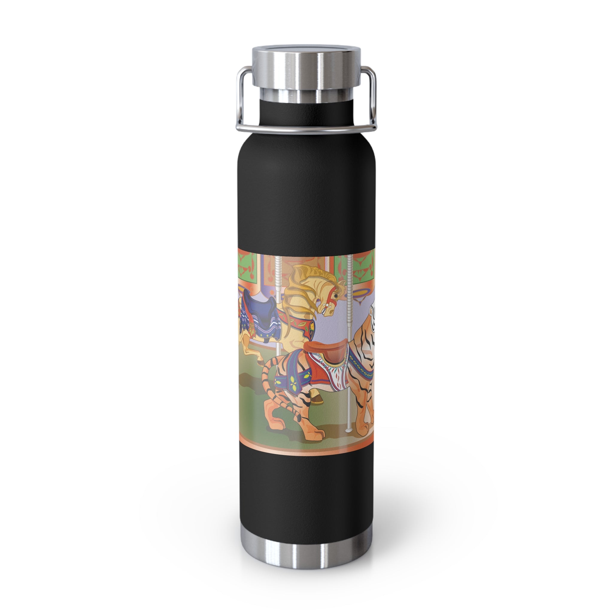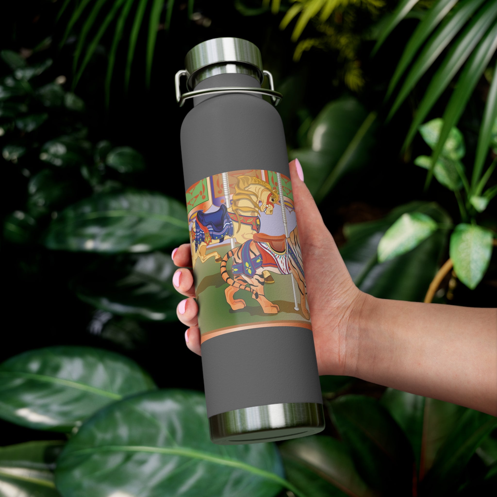 Artwork created, designed and digitally remastered by Sarasvati Designs. A carousel painting featuring a golden horse and an orange tiger, set against a backdrop of colorful panels, evokes a sense of nostalgia, magic, and joy.
