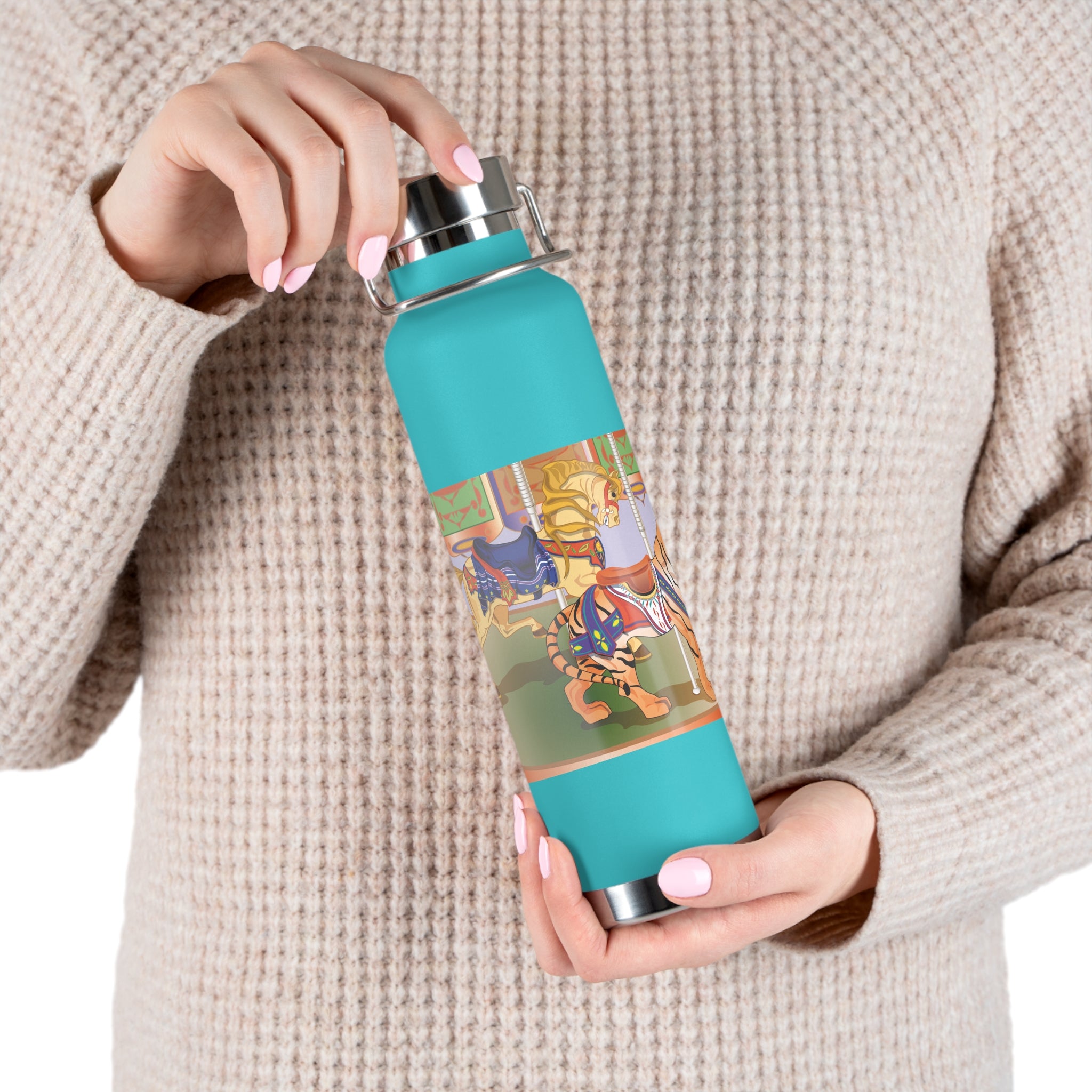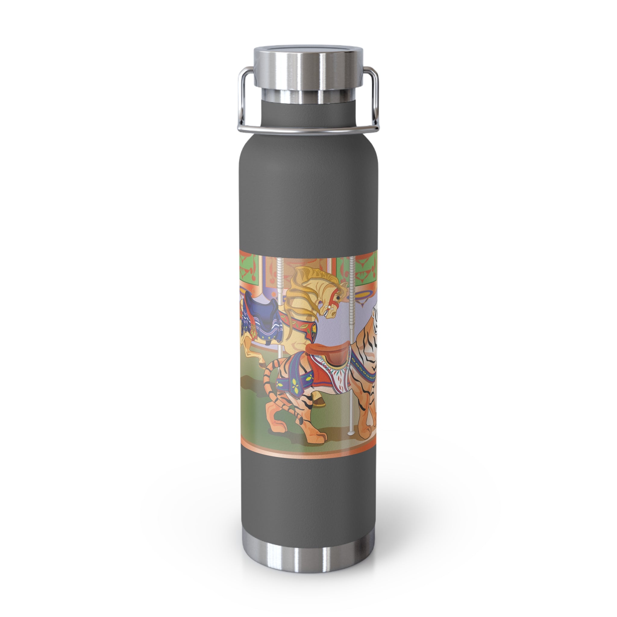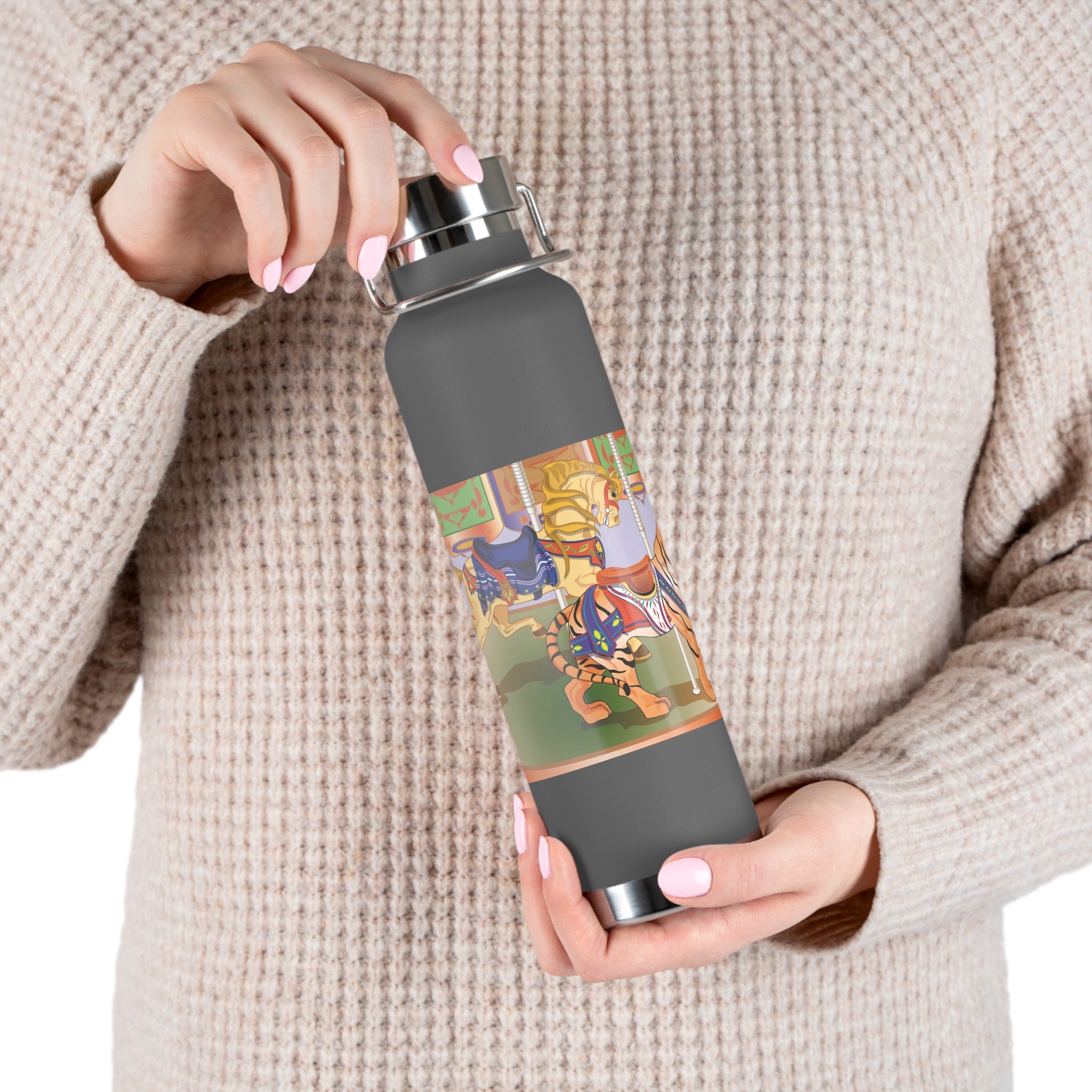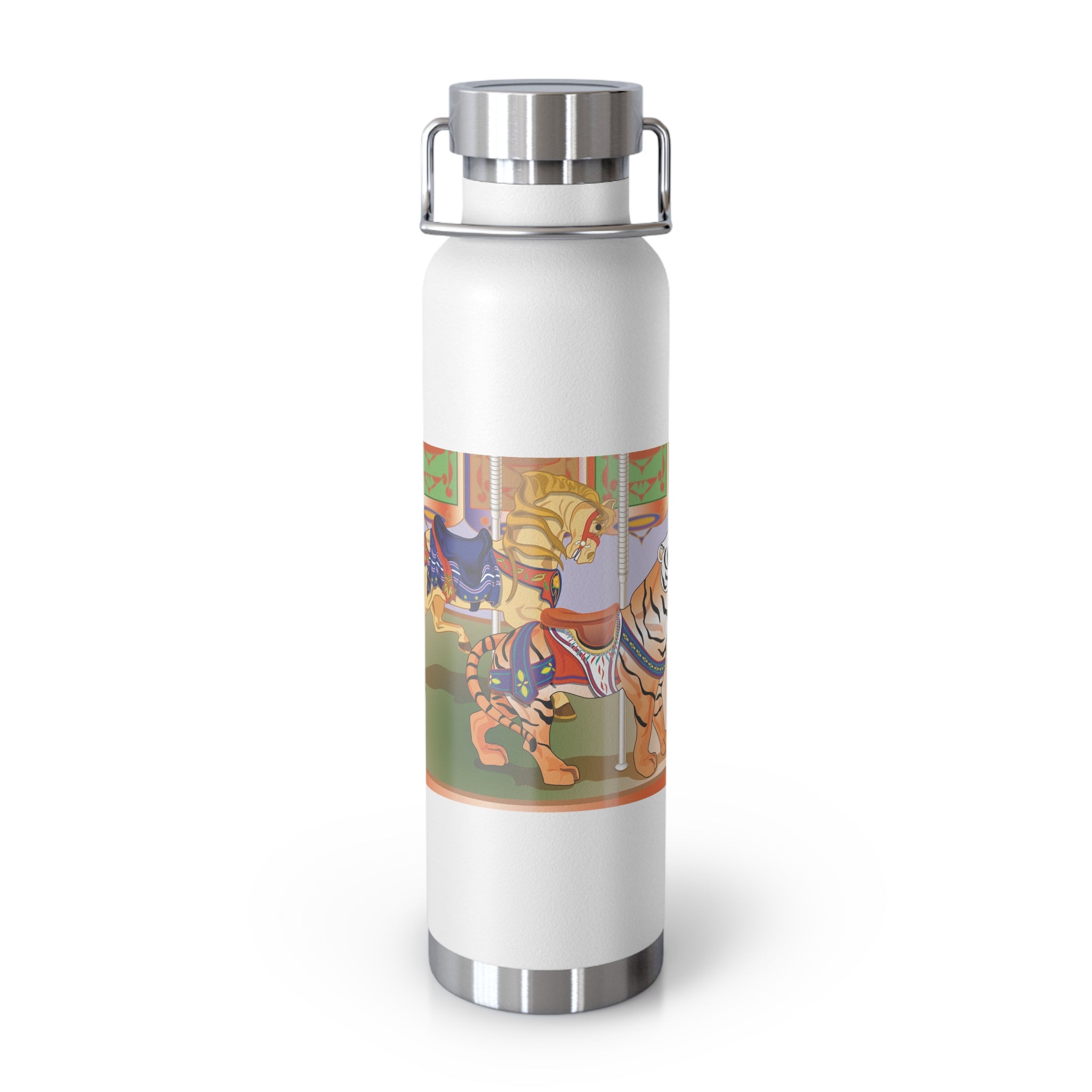 Artwork created, designed and digitally remastered by Sarasvati Designs. A carousel painting featuring a golden horse and an orange tiger, set against a backdrop of colorful panels, evokes a sense of nostalgia, magic, and joy.