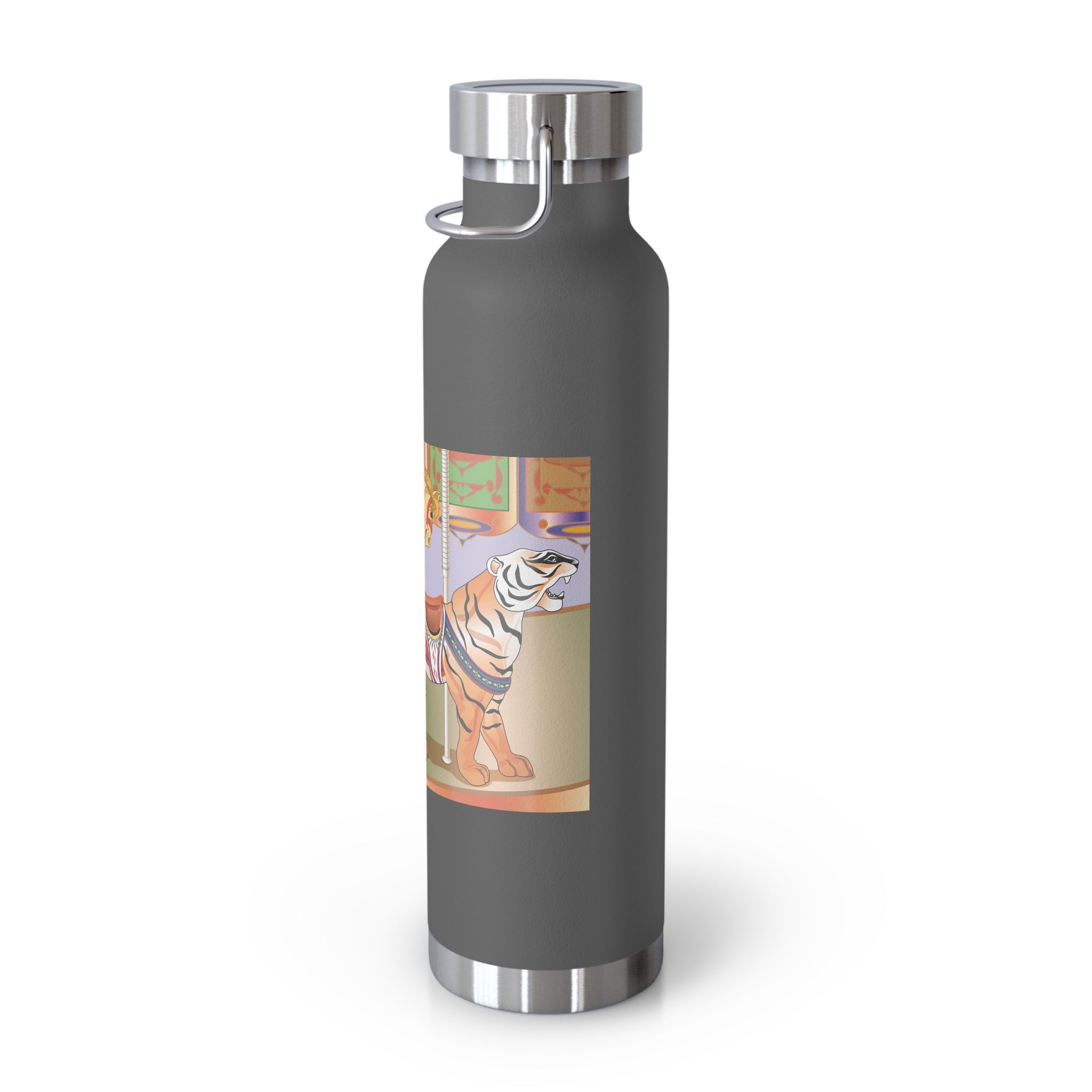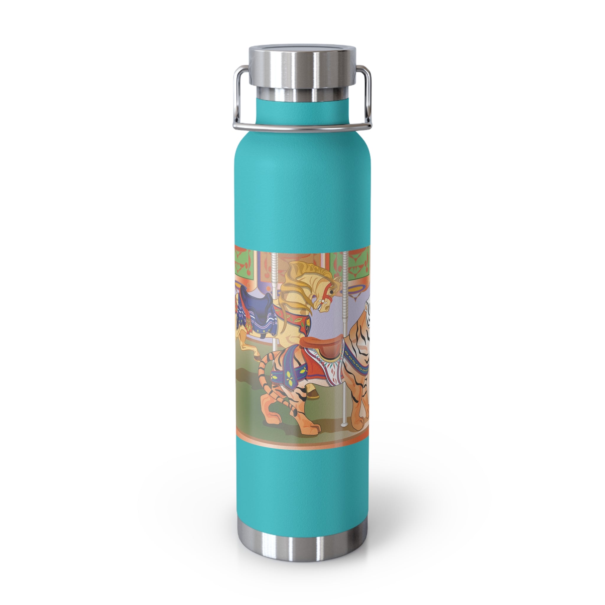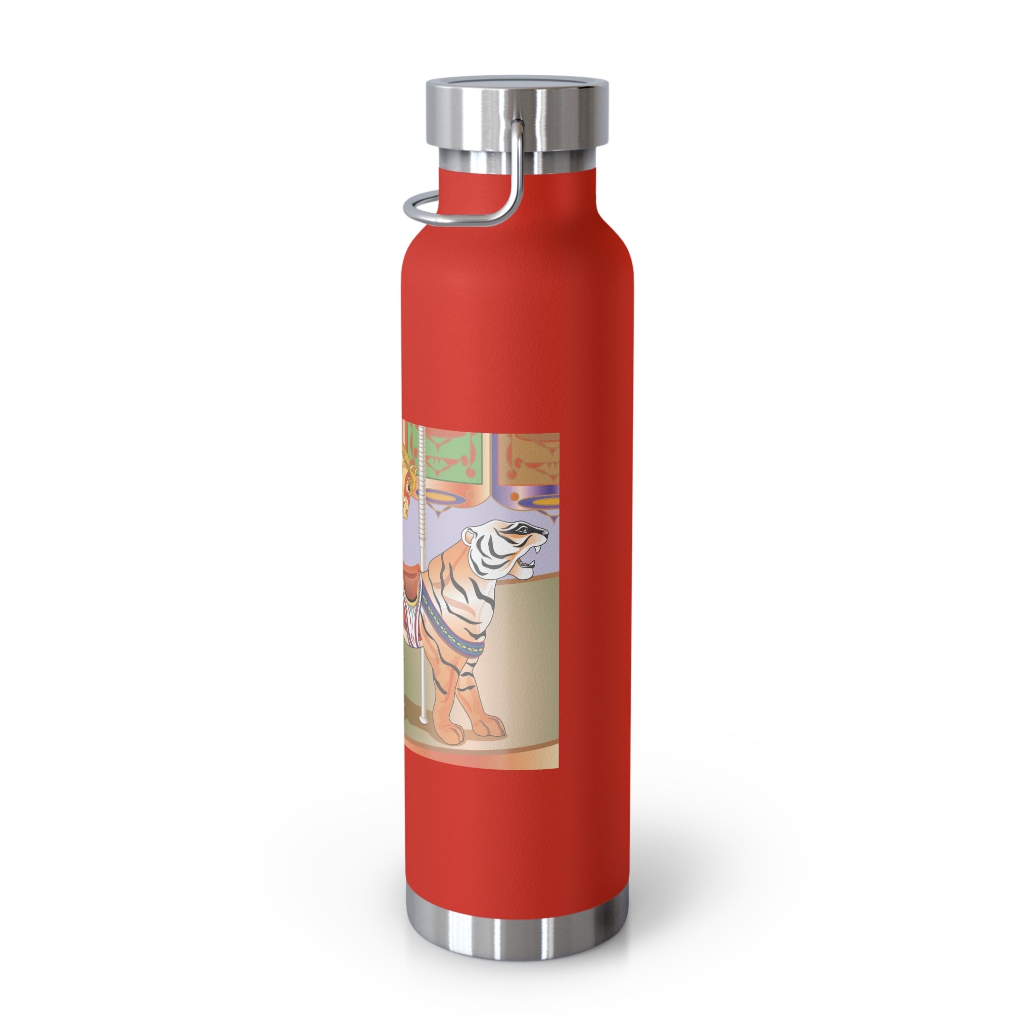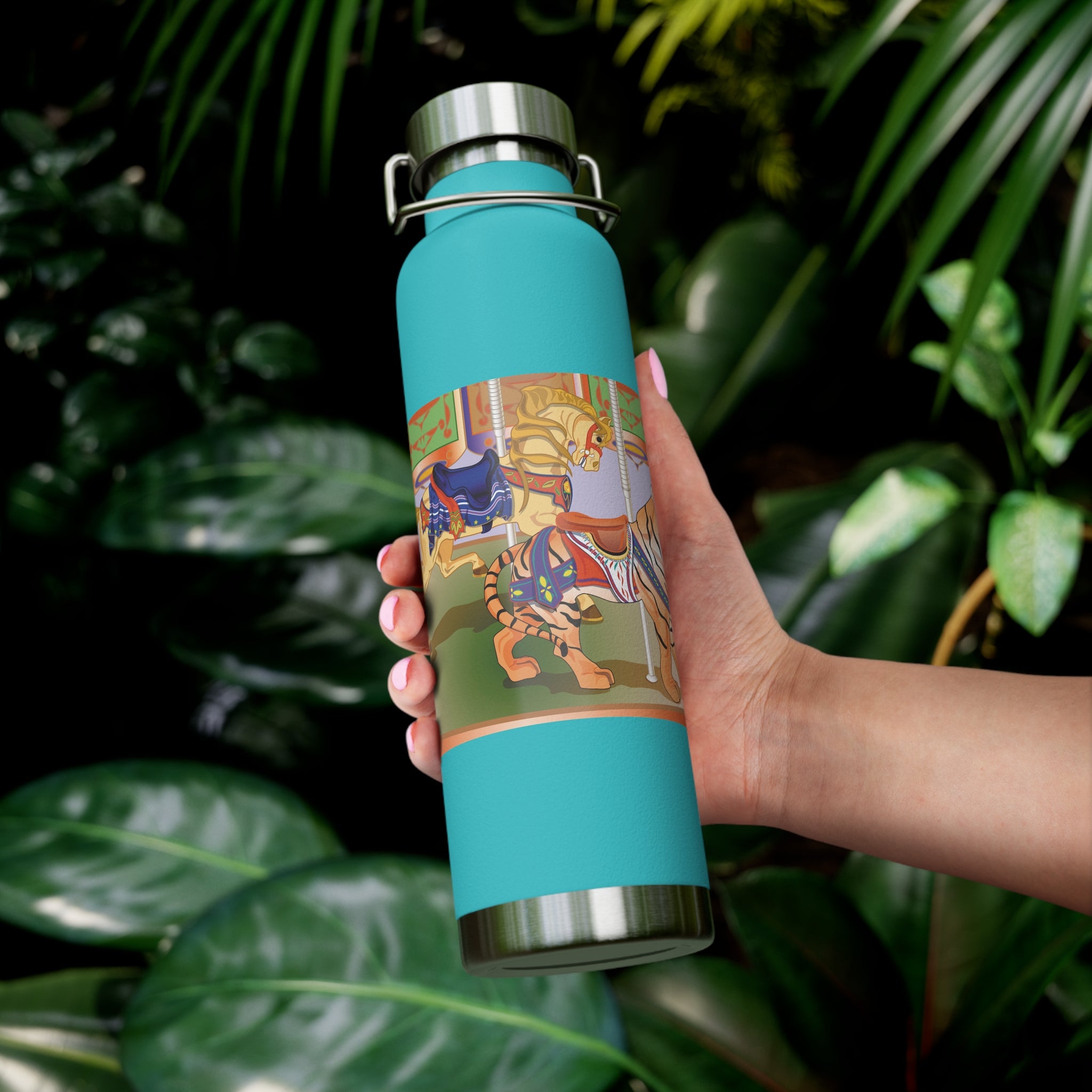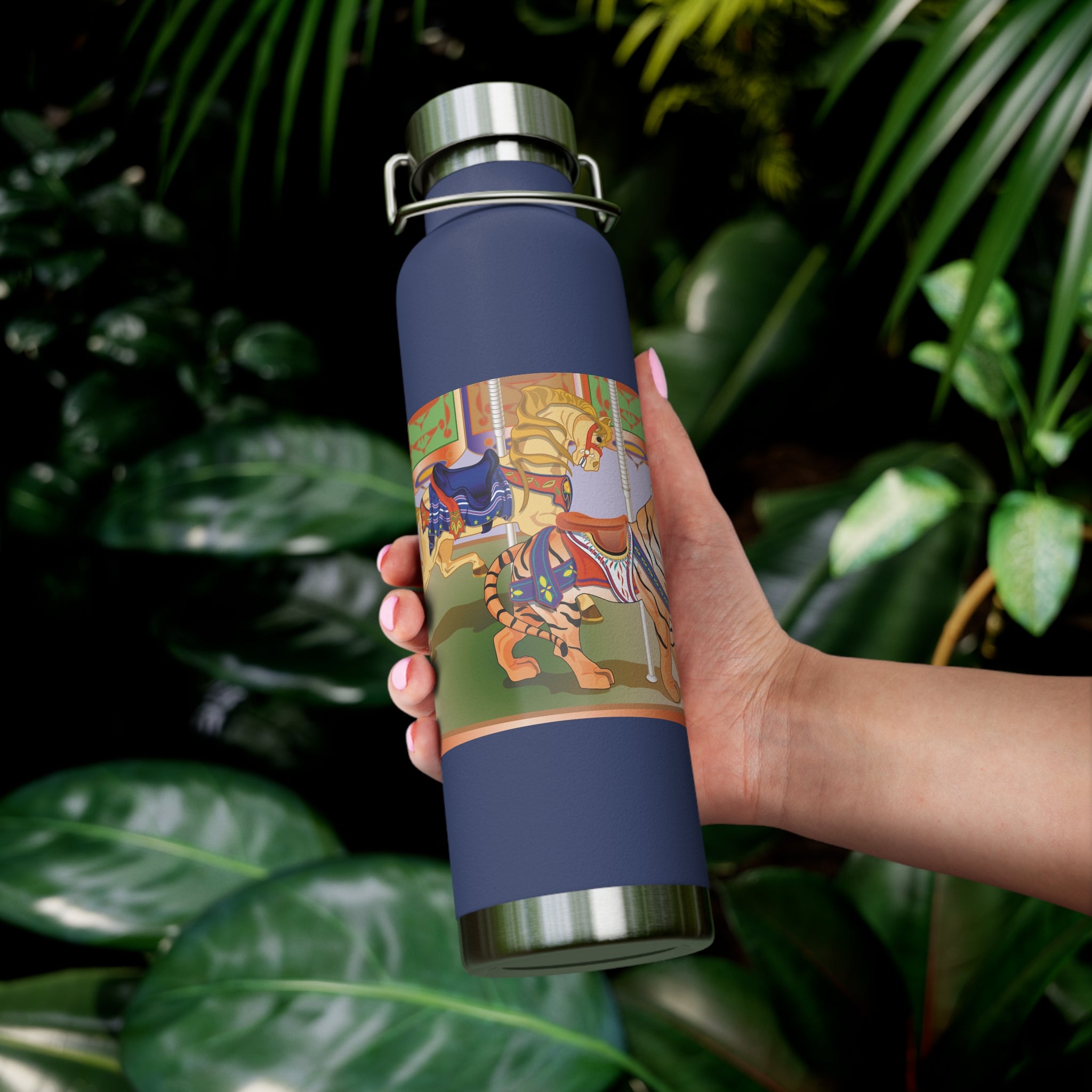 Artwork created, designed and digitally remastered by Sarasvati Designs. A carousel painting featuring a golden horse and an orange tiger, set against a backdrop of colorful panels, evokes a sense of nostalgia, magic, and joy.