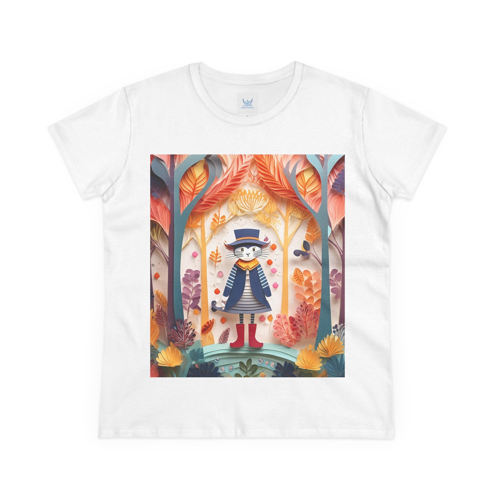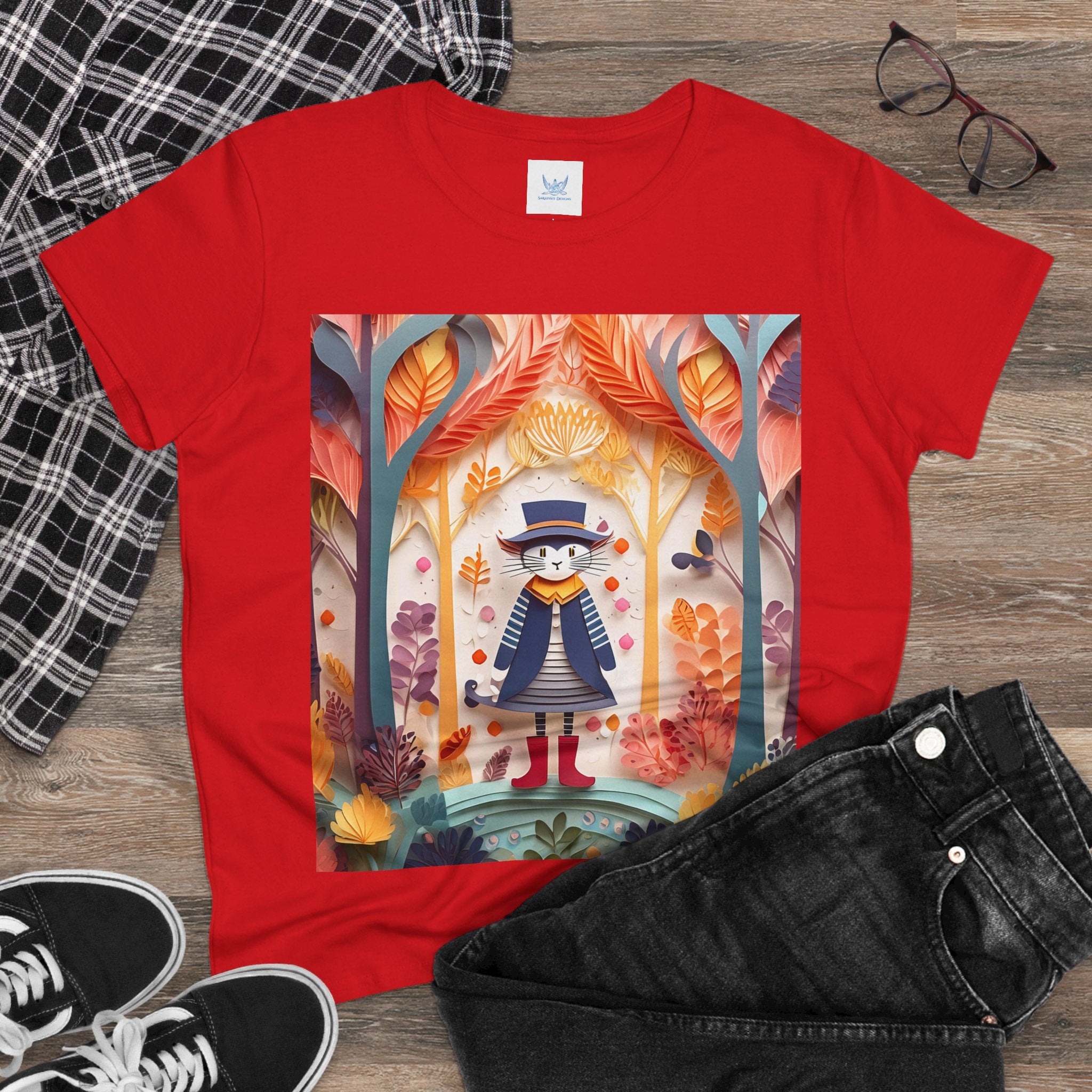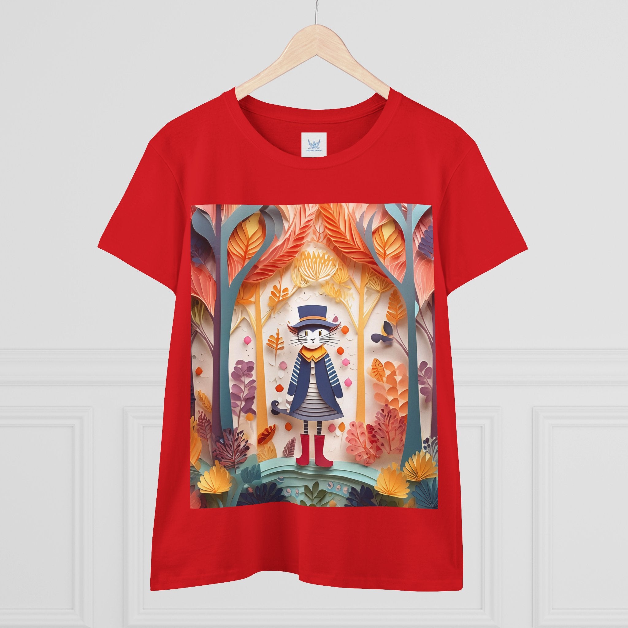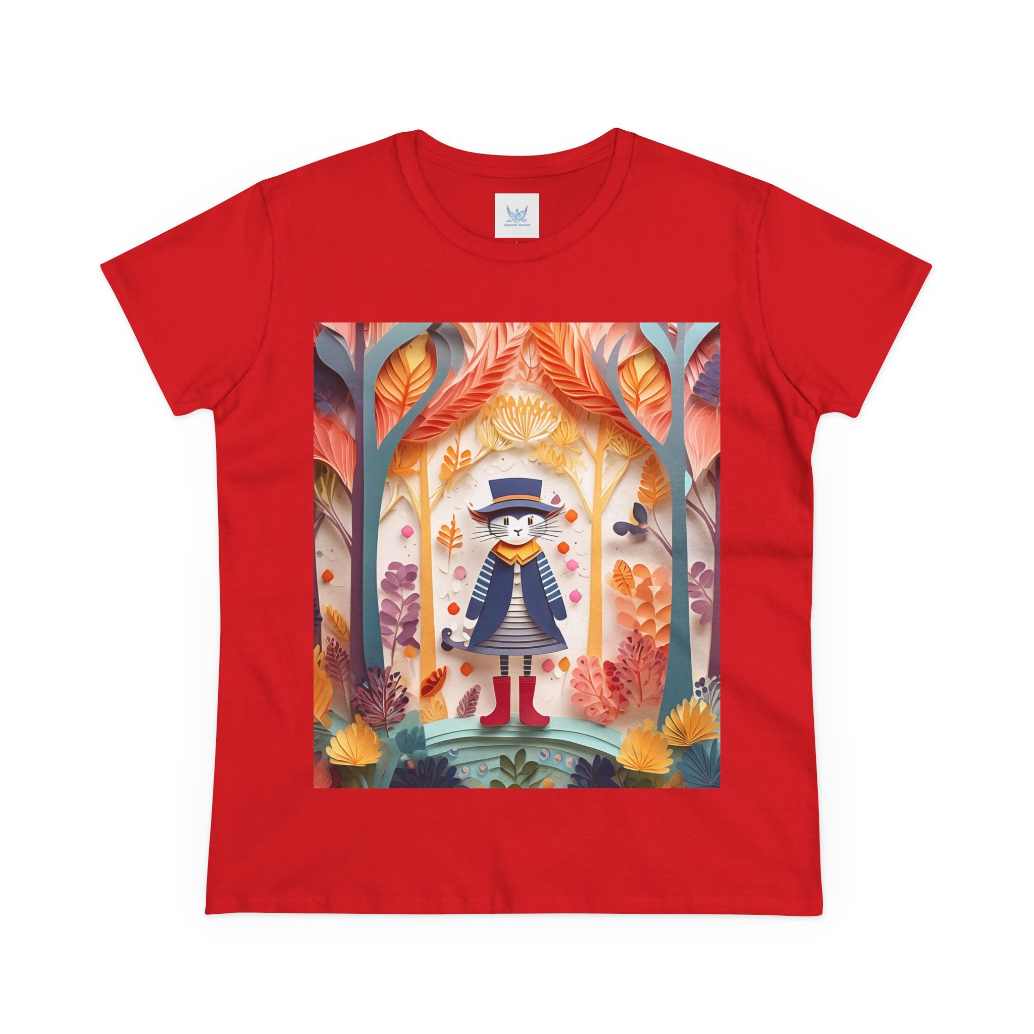 In this enchanting artwork, a cute and charming cat stands proudly in the middle of a colorful forest. The cat is dressed in a whimsical outfit, wearing bright red boots, a charming dress adorned with delicate patterns, and a matching hat with a small feather.