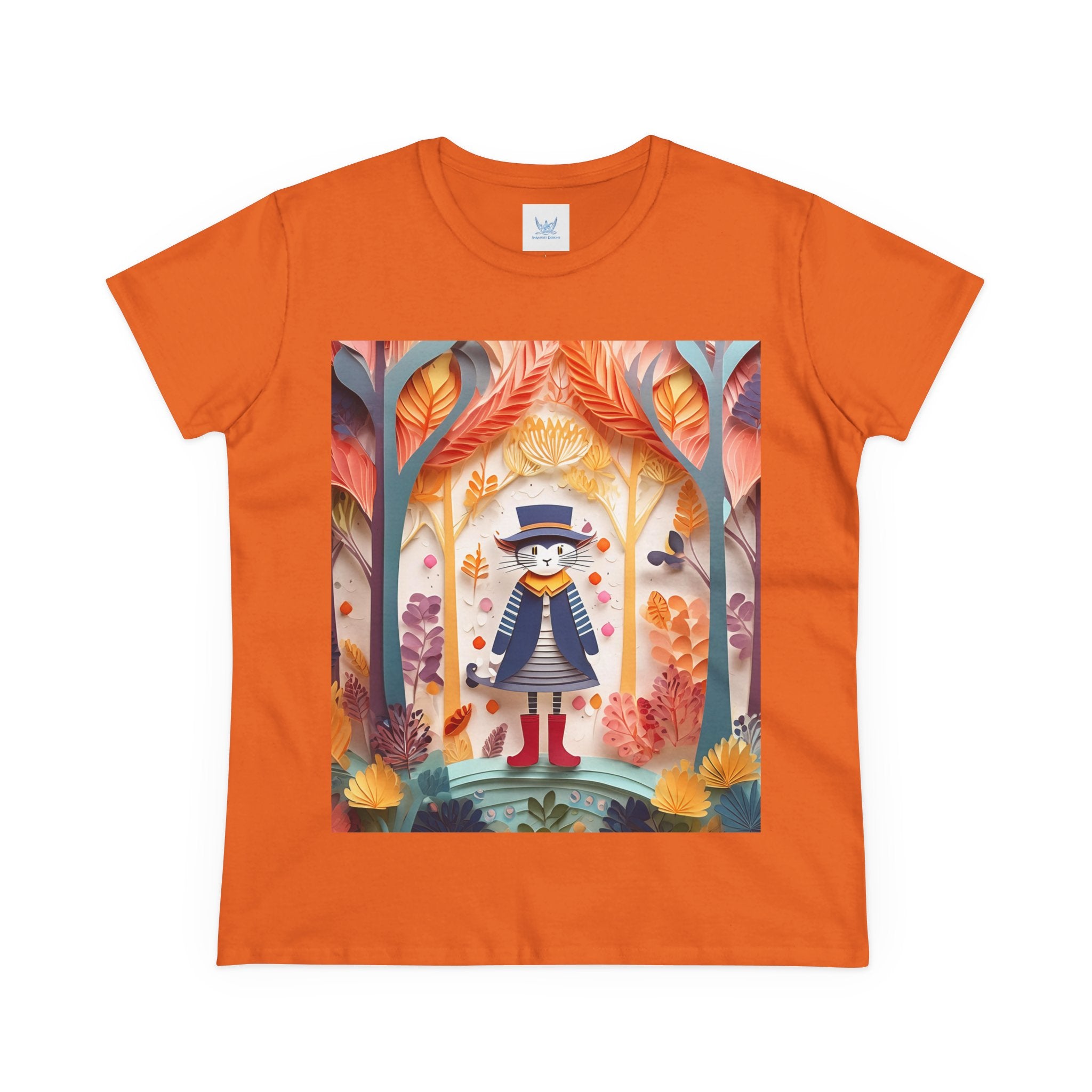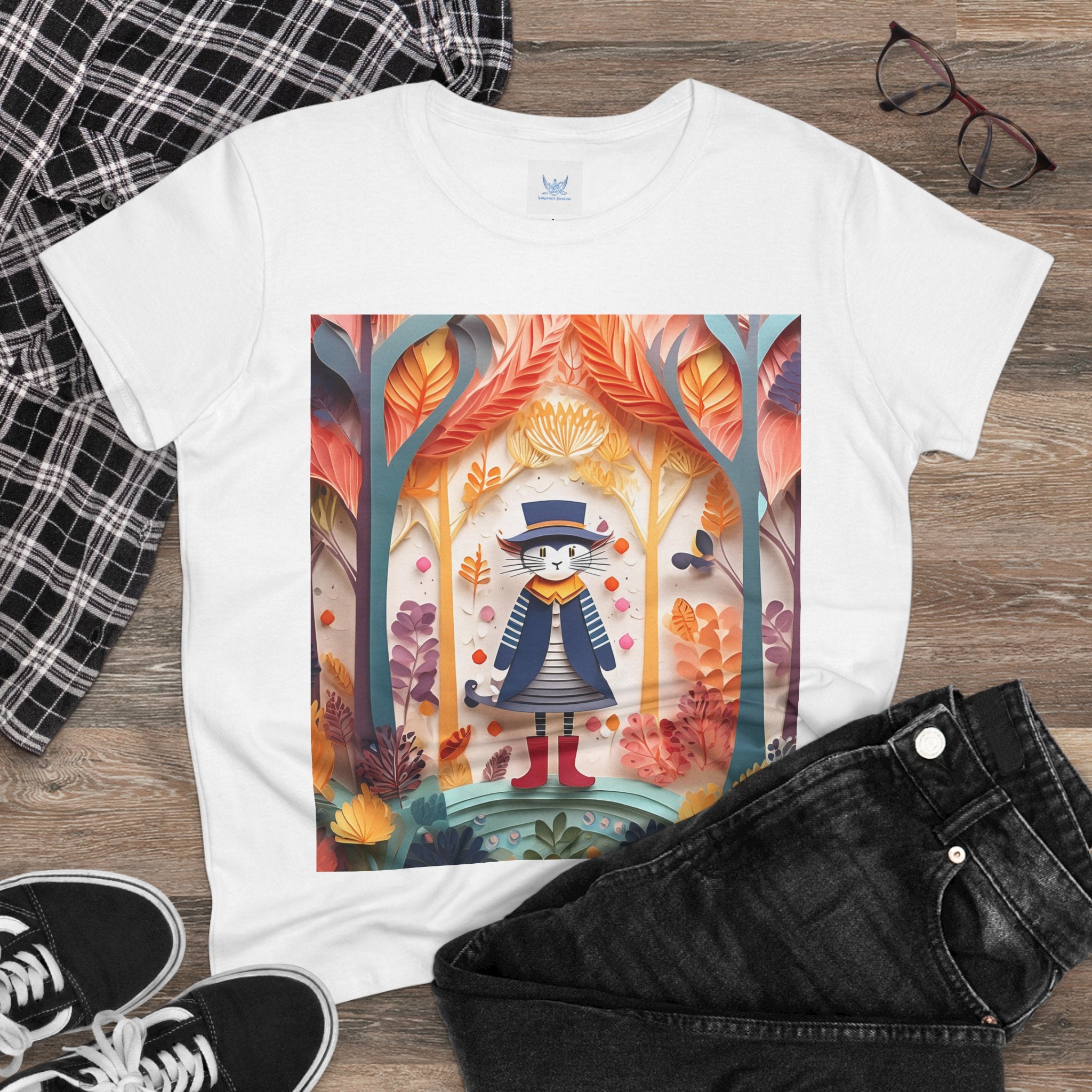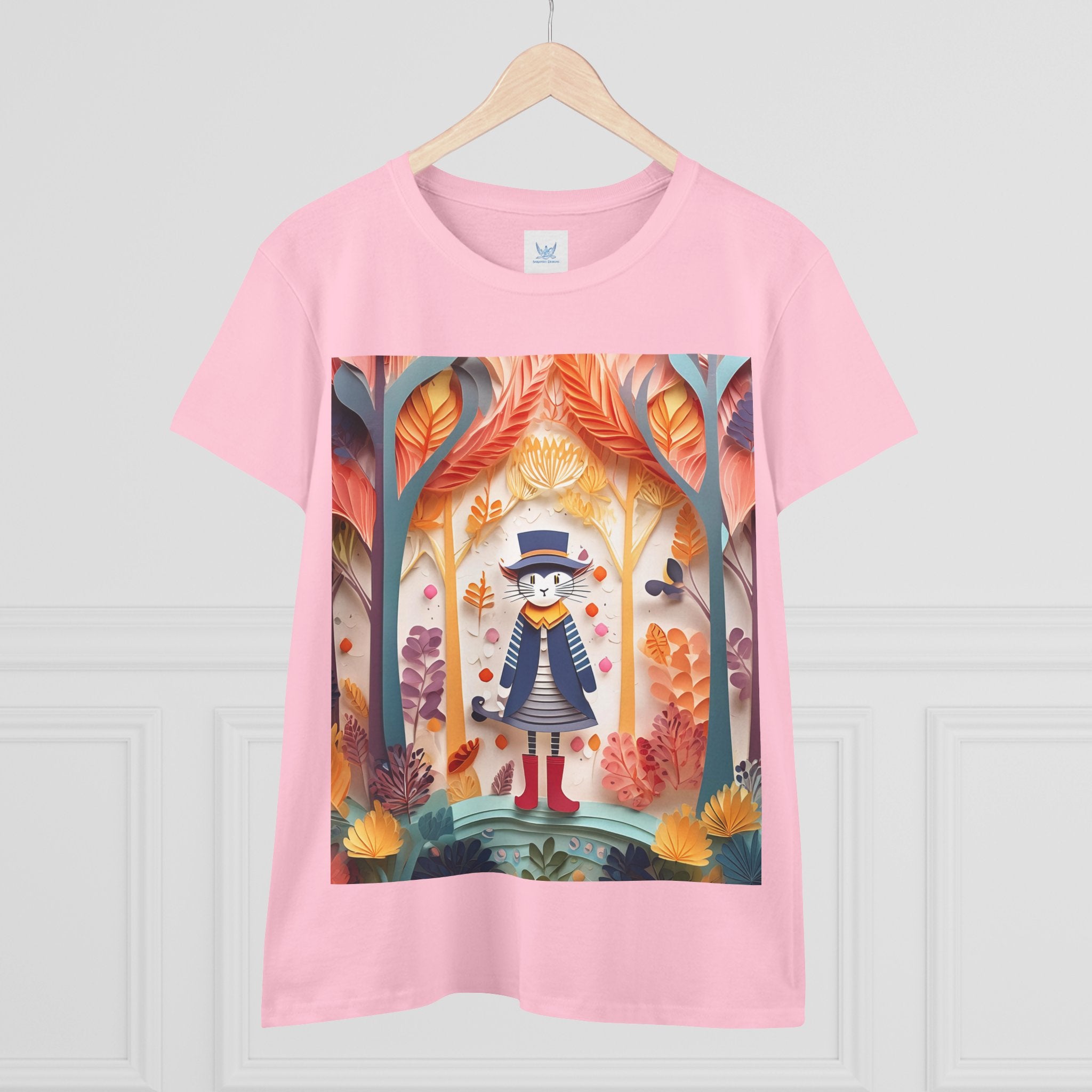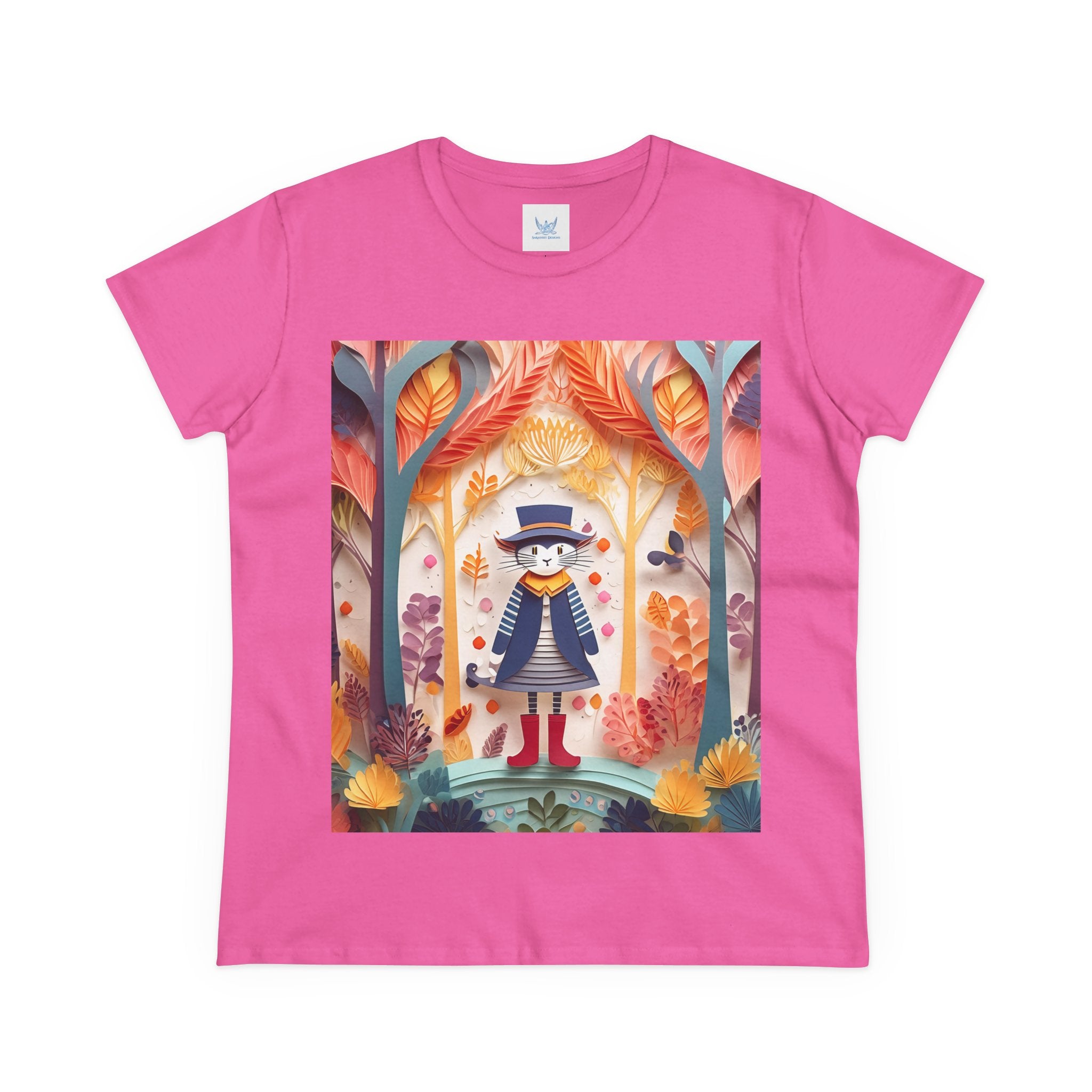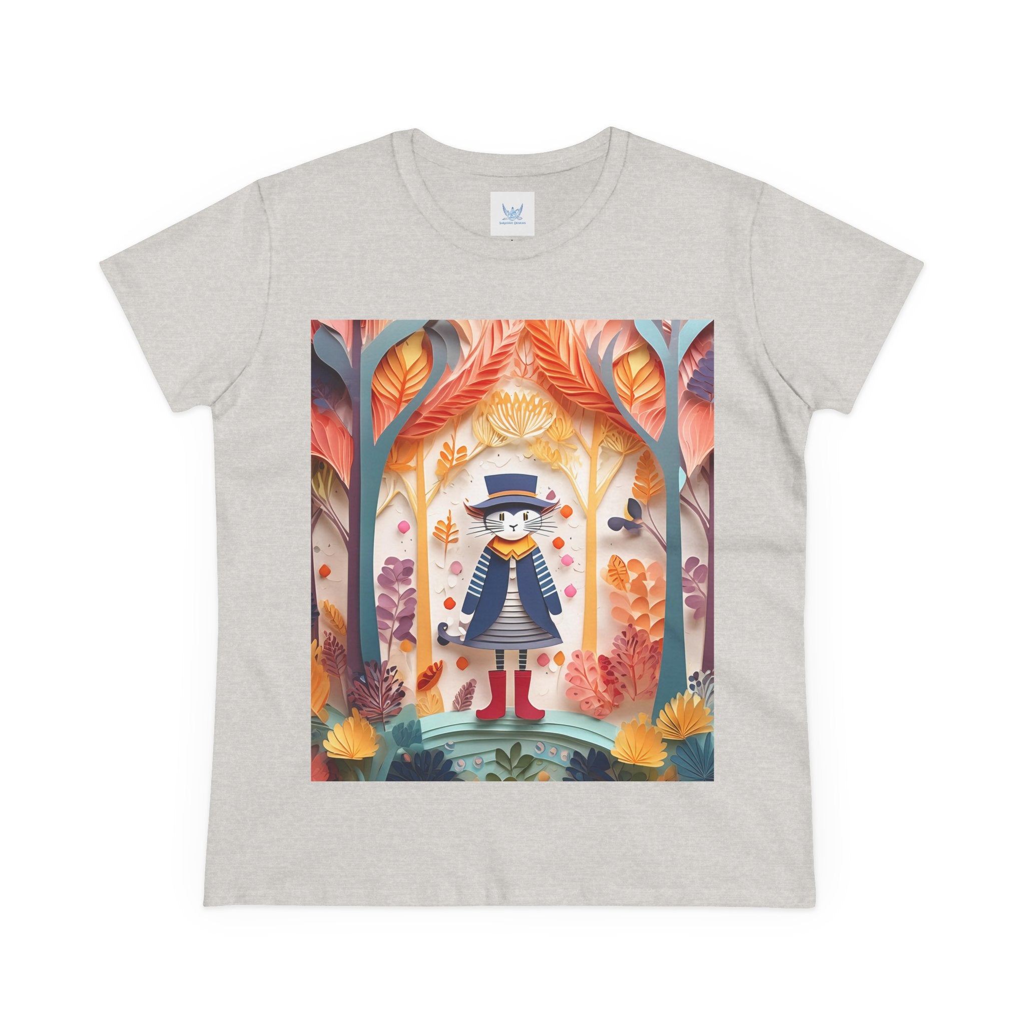 In this enchanting artwork, a cute and charming cat stands proudly in the middle of a colorful forest. The cat is dressed in a whimsical outfit, wearing bright red boots, a charming dress adorned with delicate patterns, and a matching hat with a small feather.
