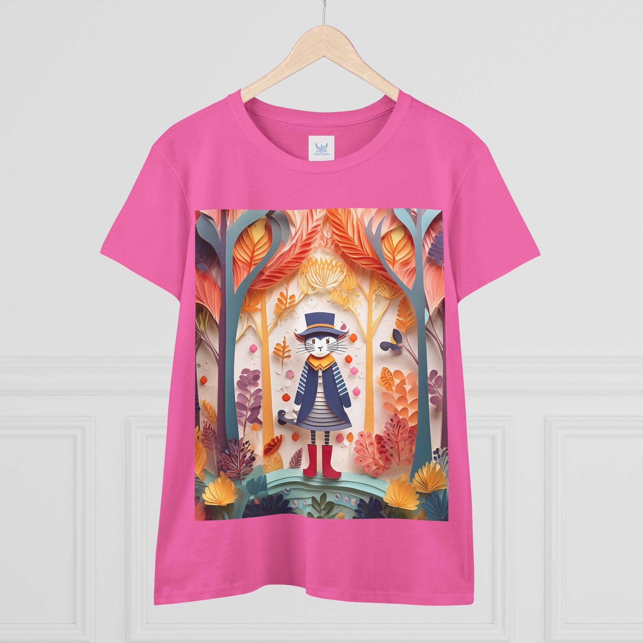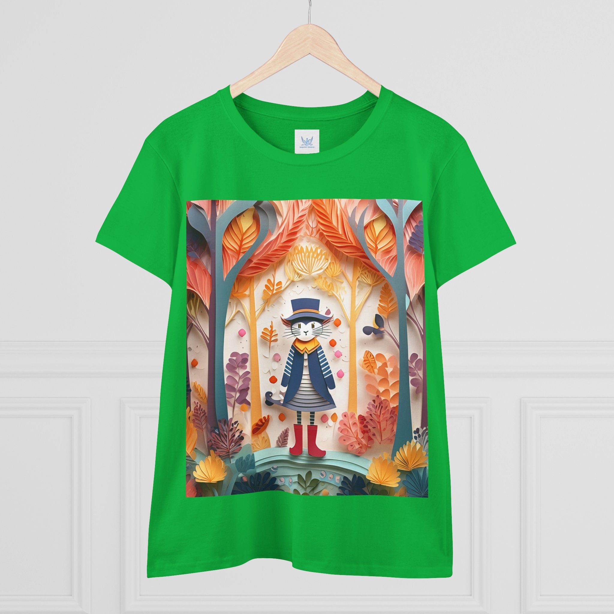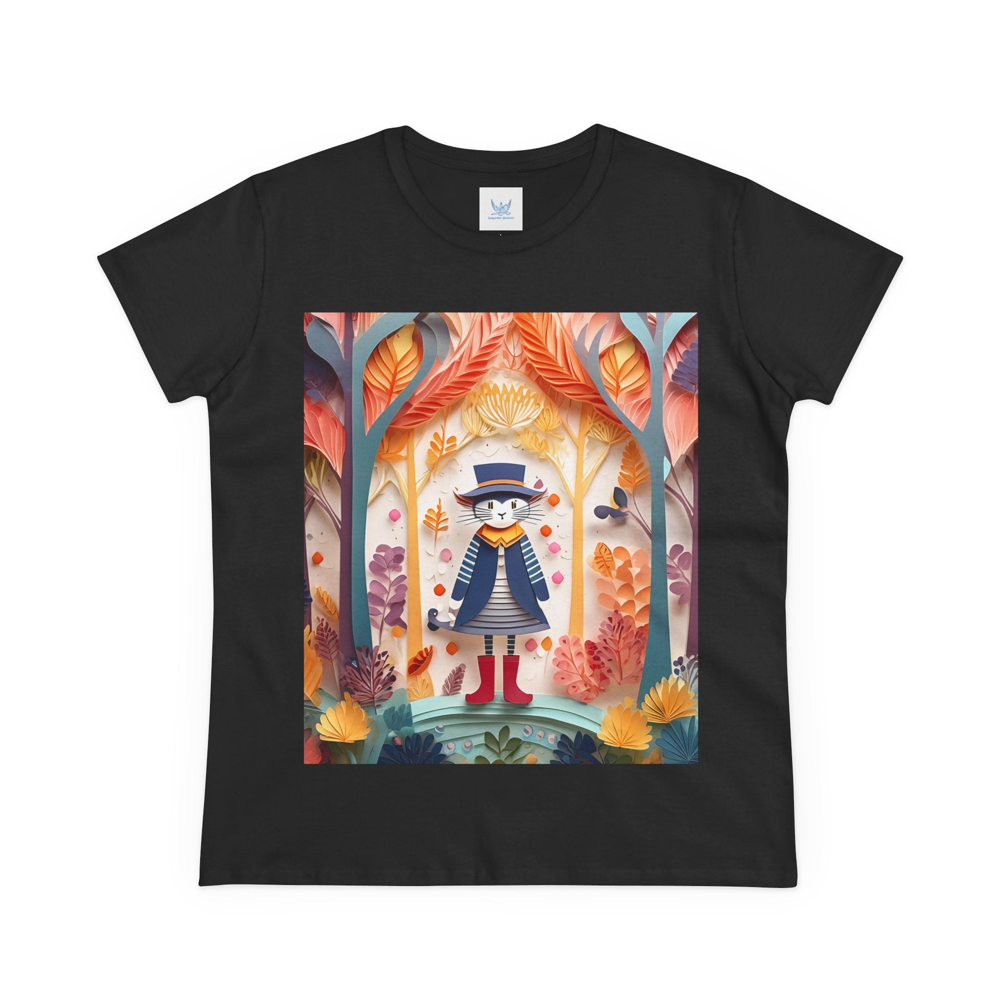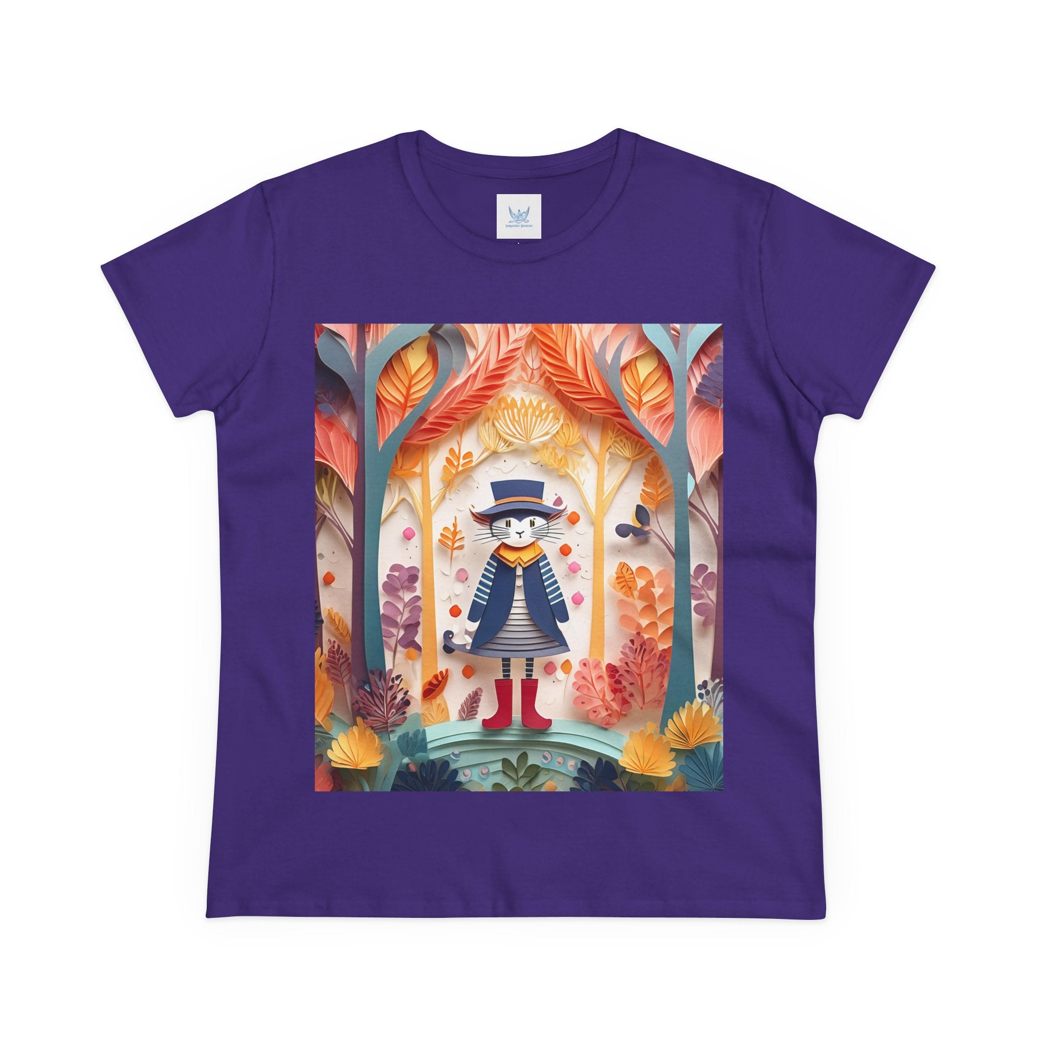 In this enchanting artwork, a cute and charming cat stands proudly in the middle of a colorful forest. The cat is dressed in a whimsical outfit, wearing bright red boots, a charming dress adorned with delicate patterns, and a matching hat with a small feather.