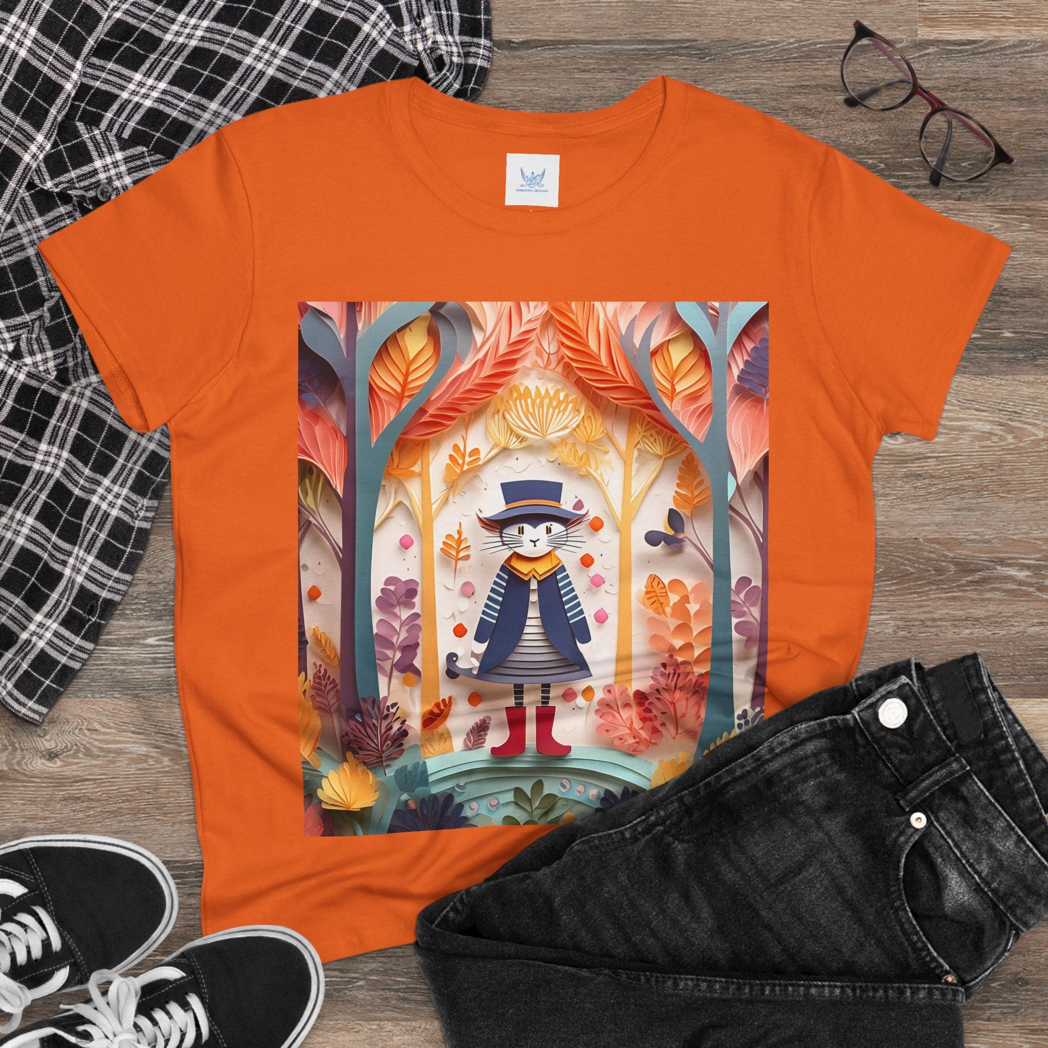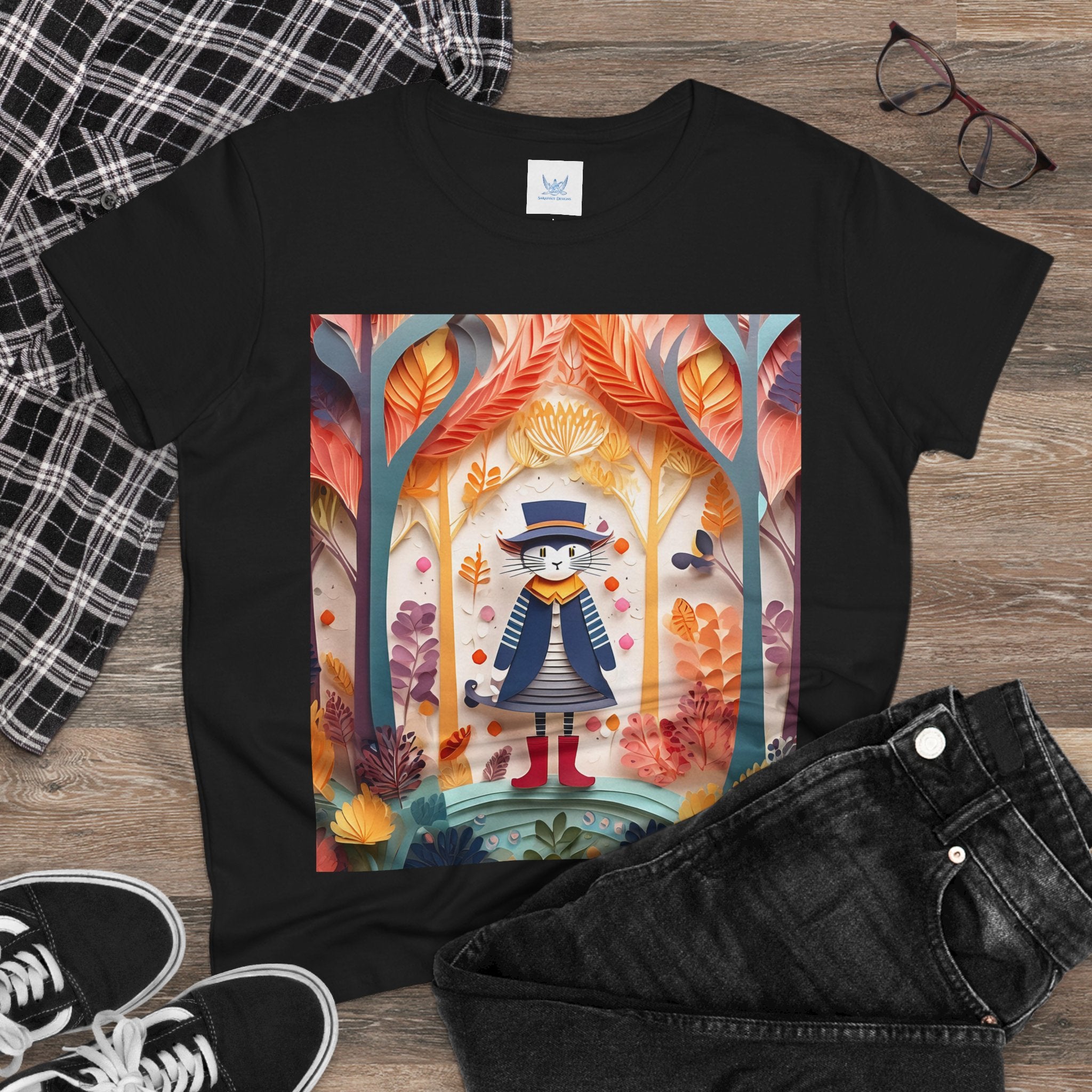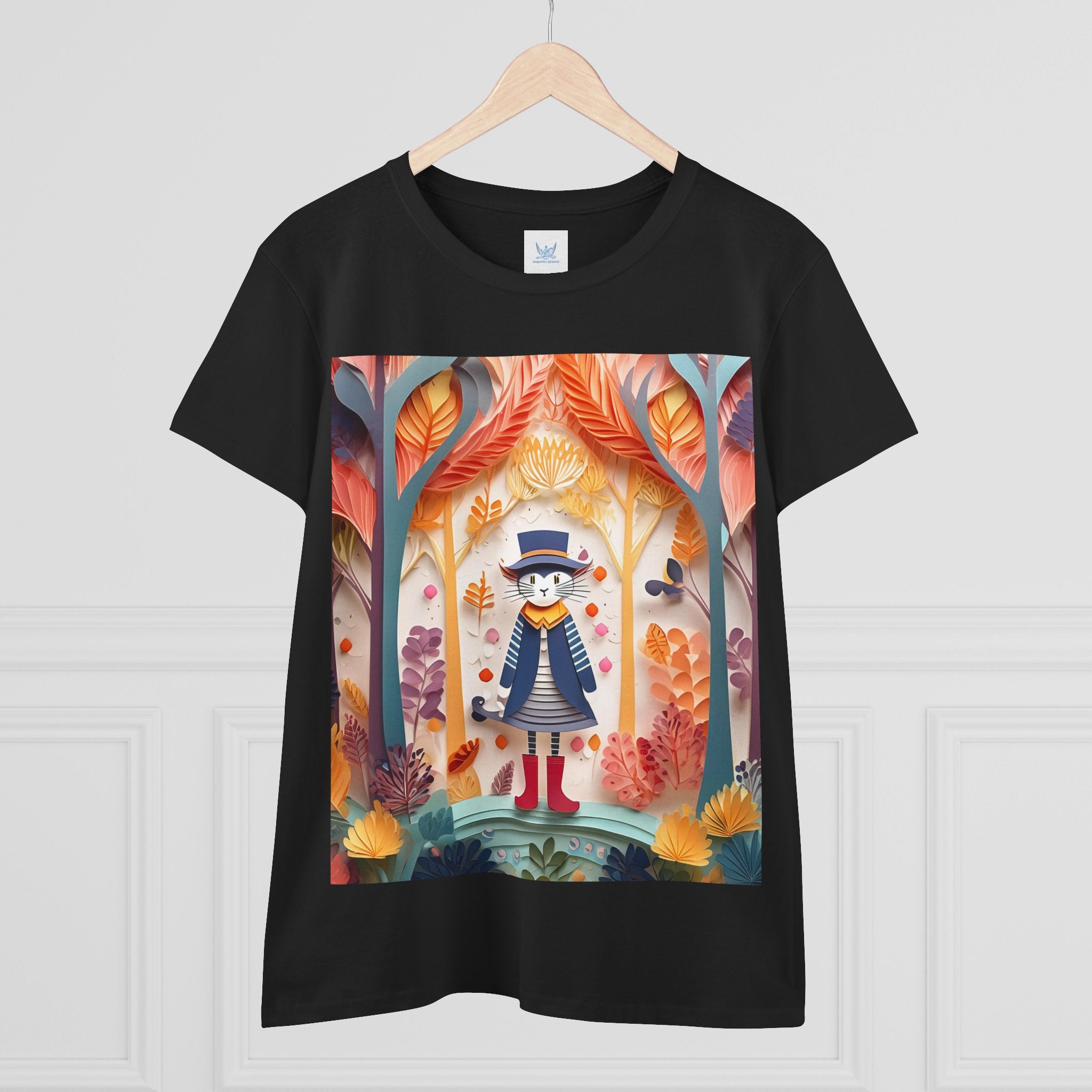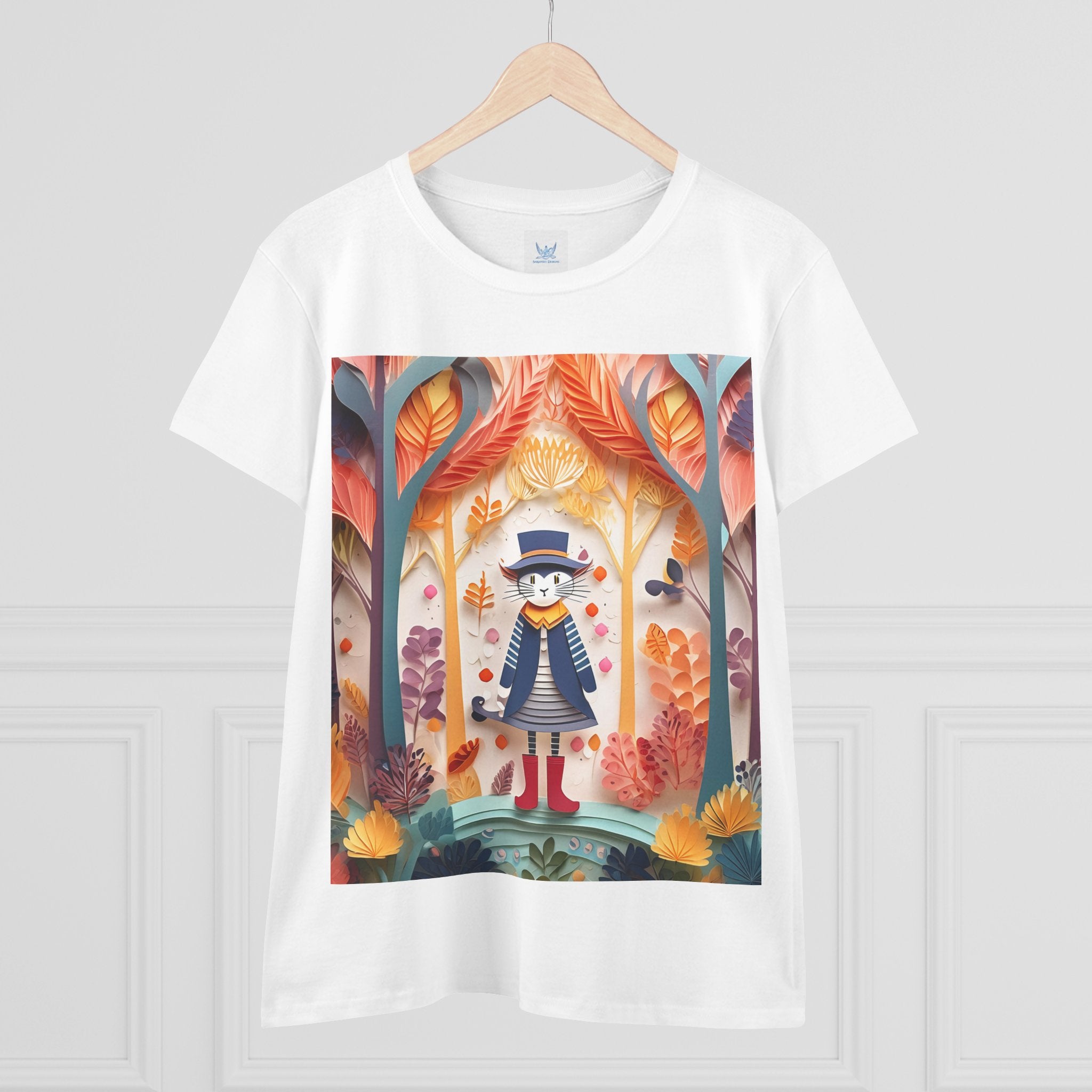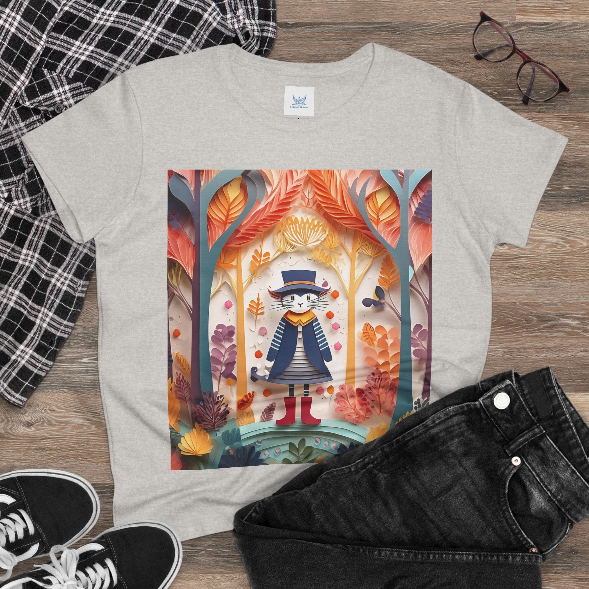 In this enchanting artwork, a cute and charming cat stands proudly in the middle of a colorful forest. The cat is dressed in a whimsical outfit, wearing bright red boots, a charming dress adorned with delicate patterns, and a matching hat with a small feather.
