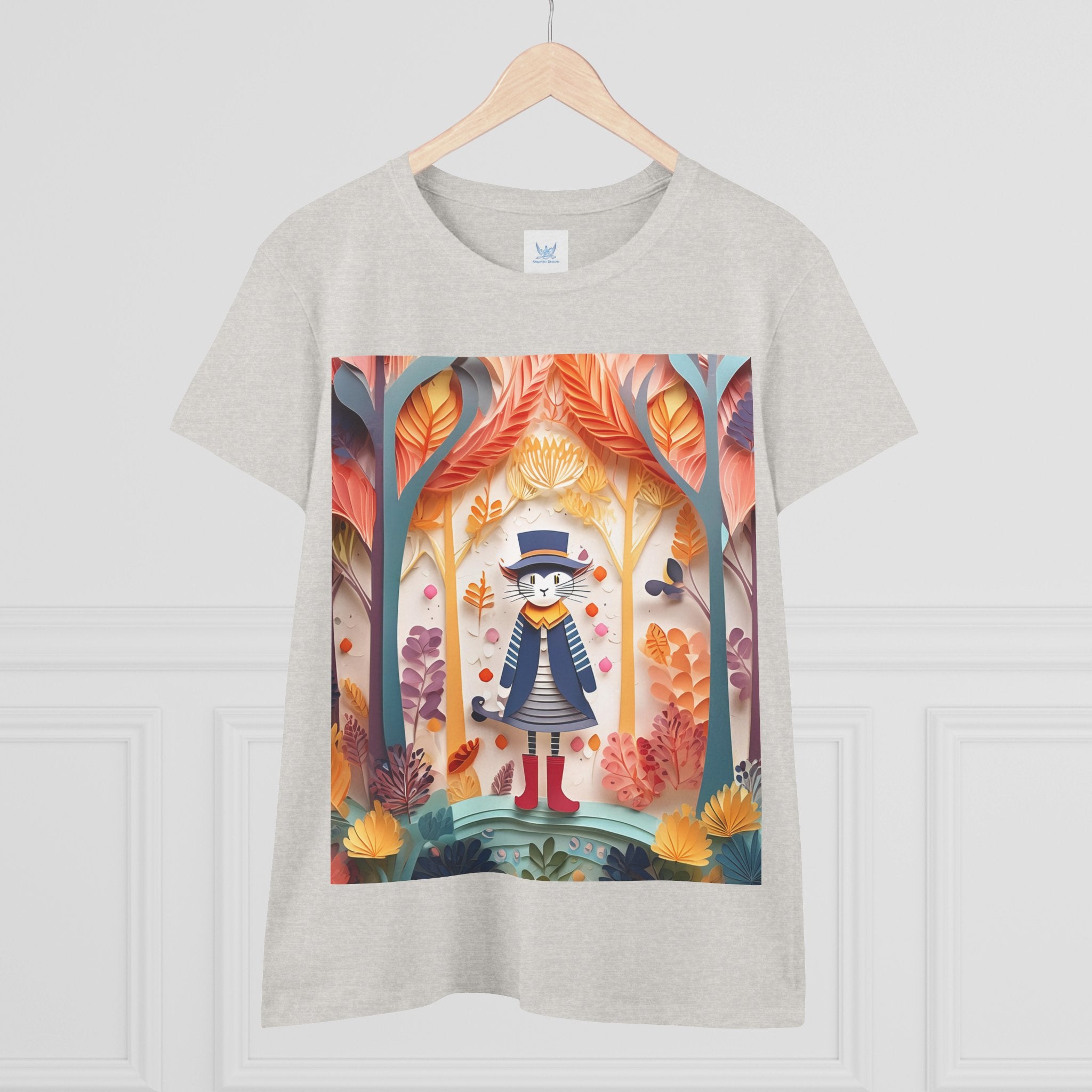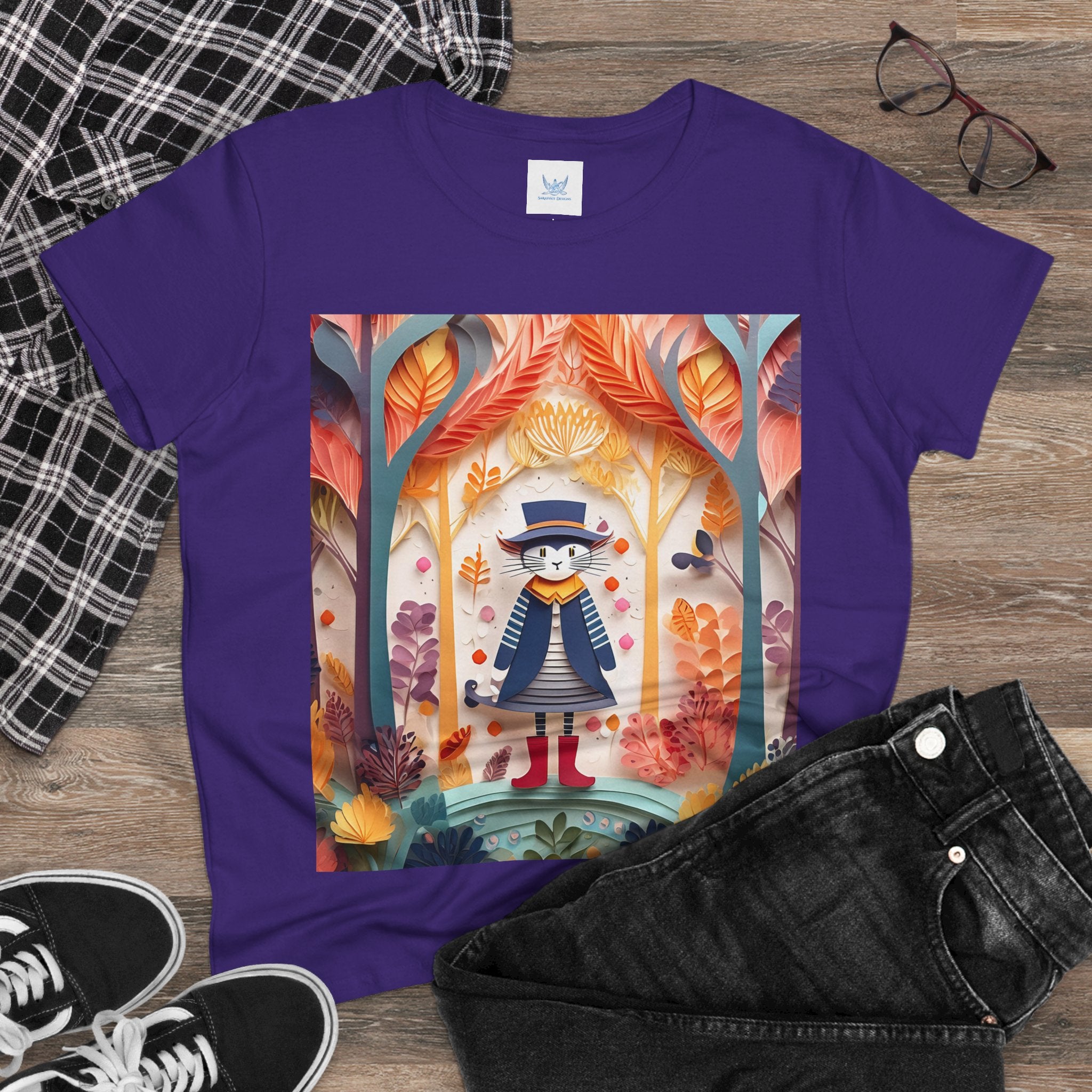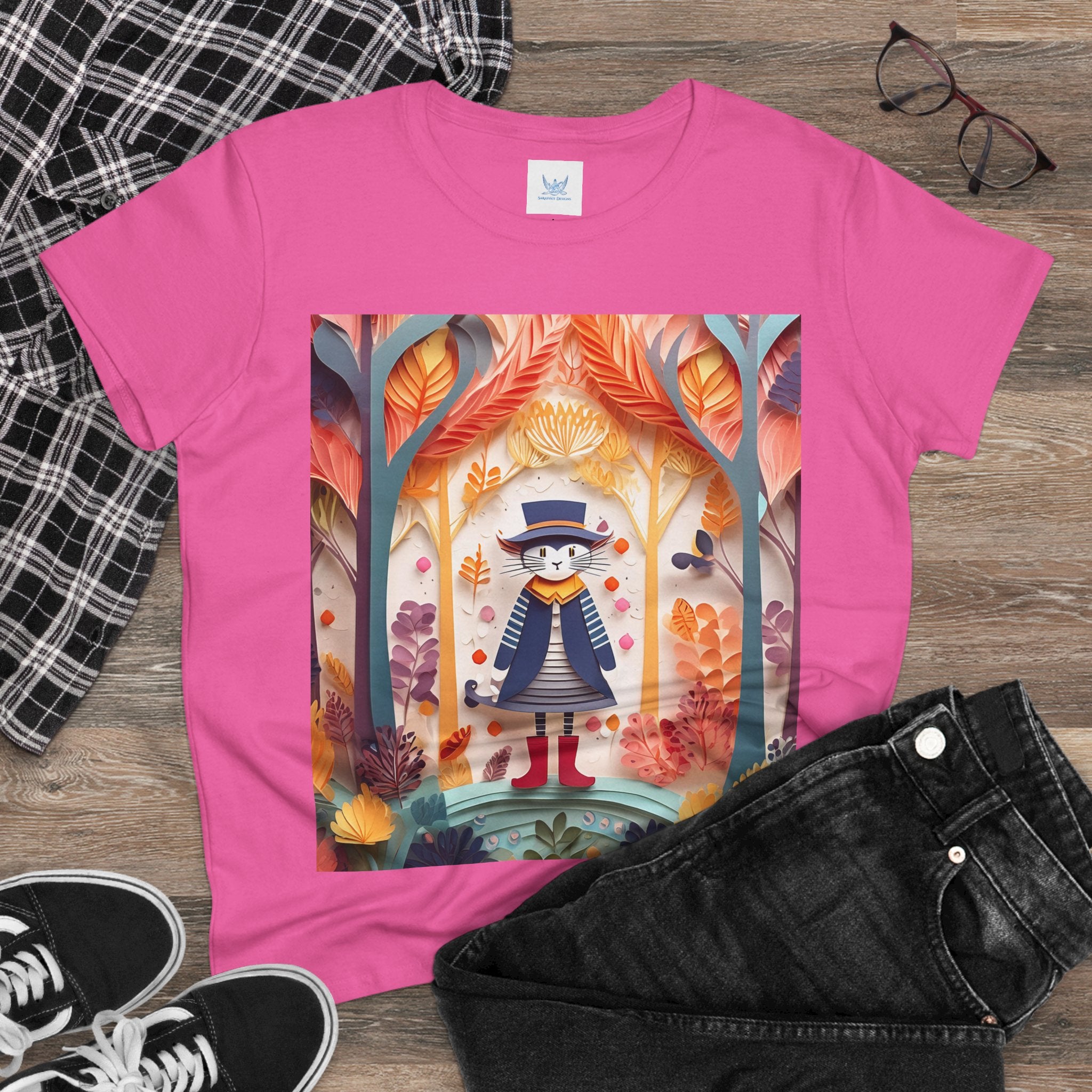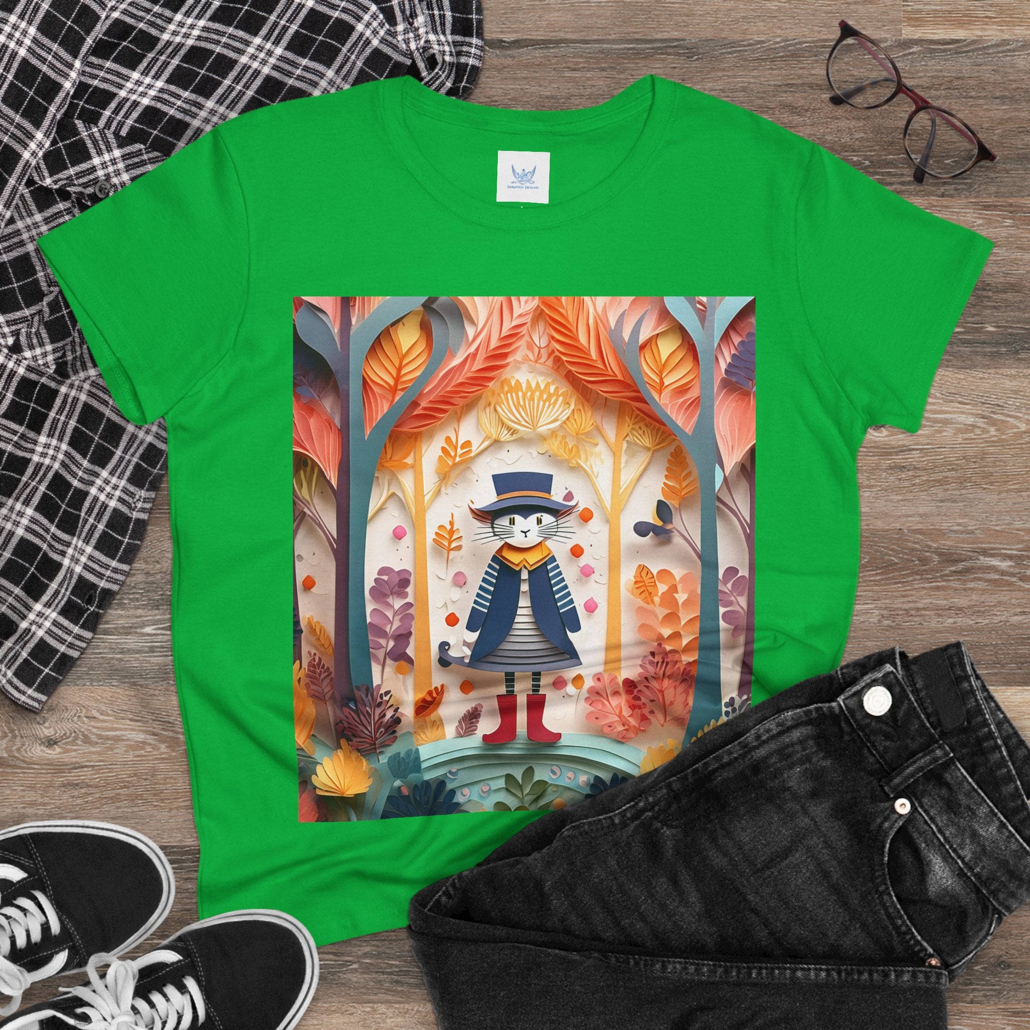 In this enchanting artwork, a cute and charming cat stands proudly in the middle of a colorful forest. The cat is dressed in a whimsical outfit, wearing bright red boots, a charming dress adorned with delicate patterns, and a matching hat with a small feather.
