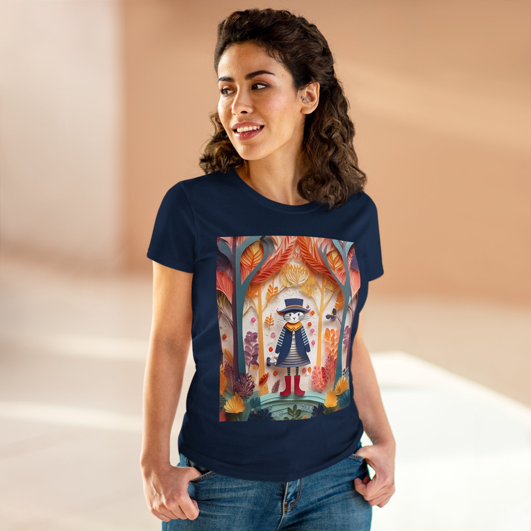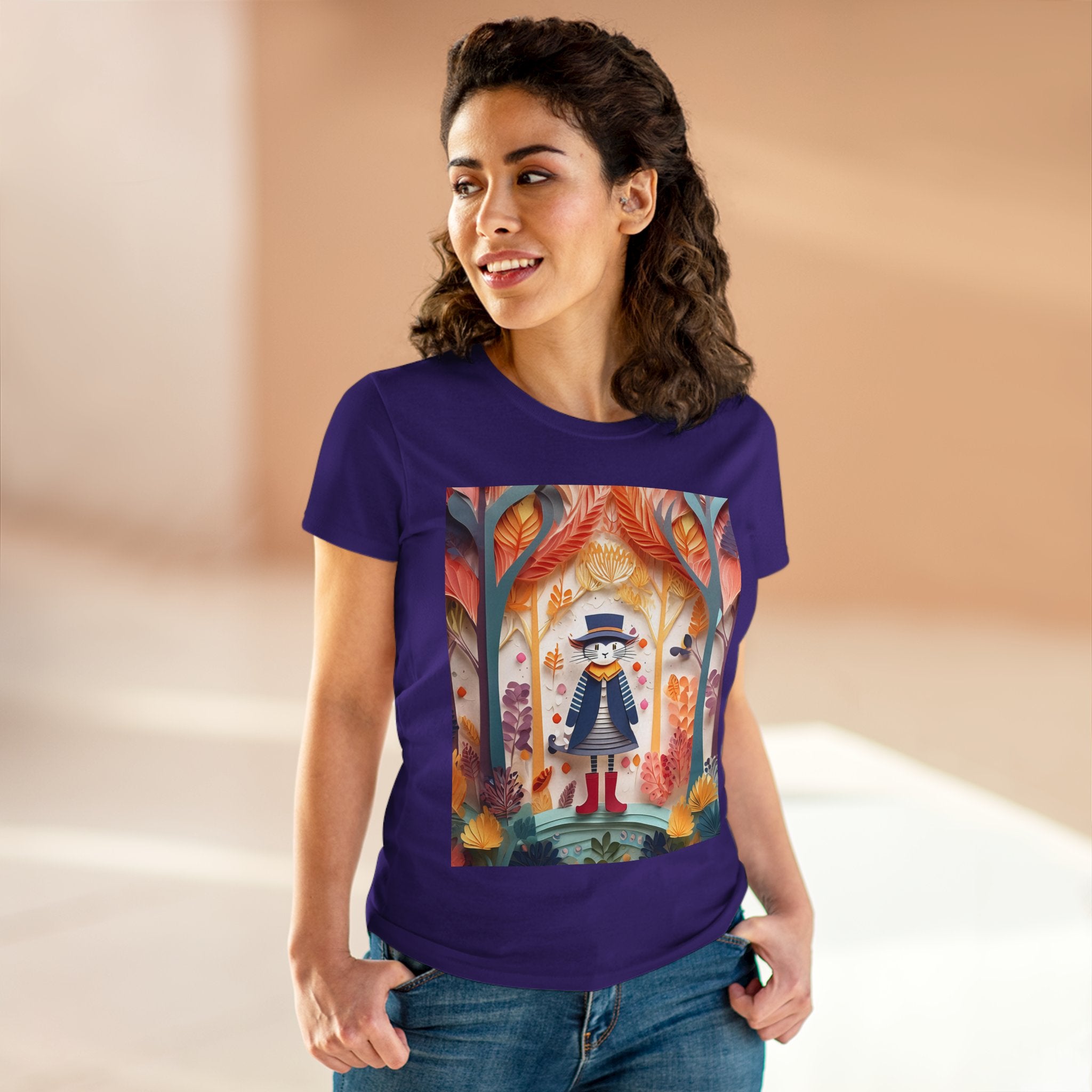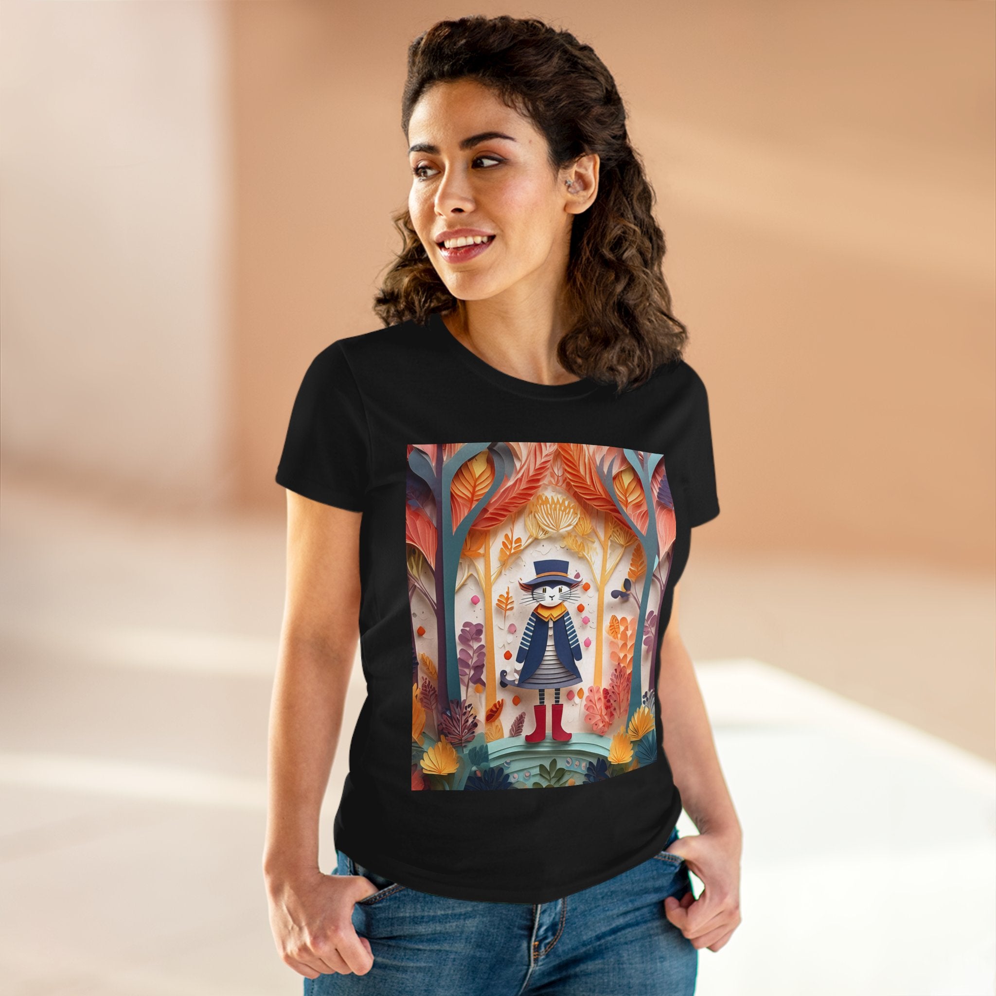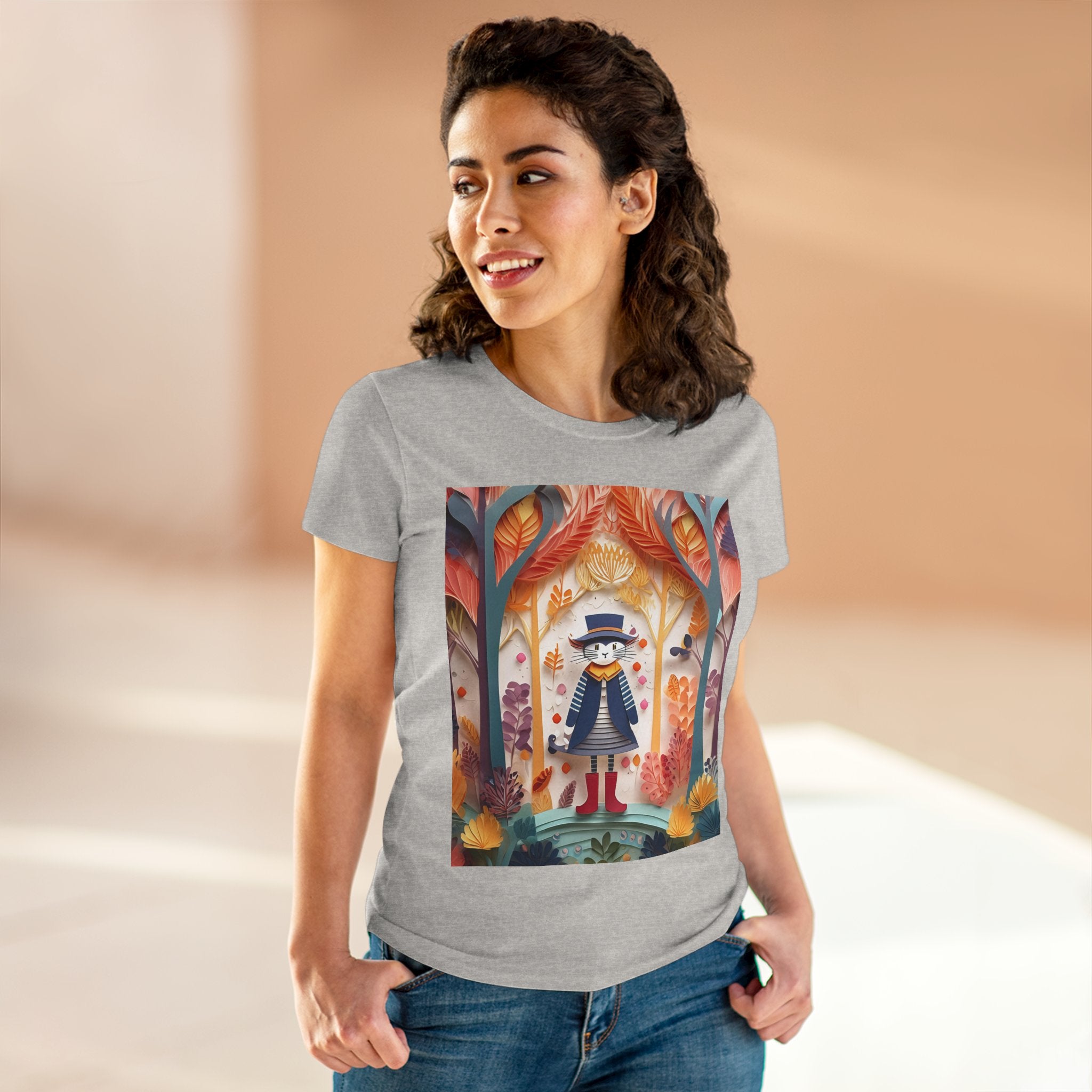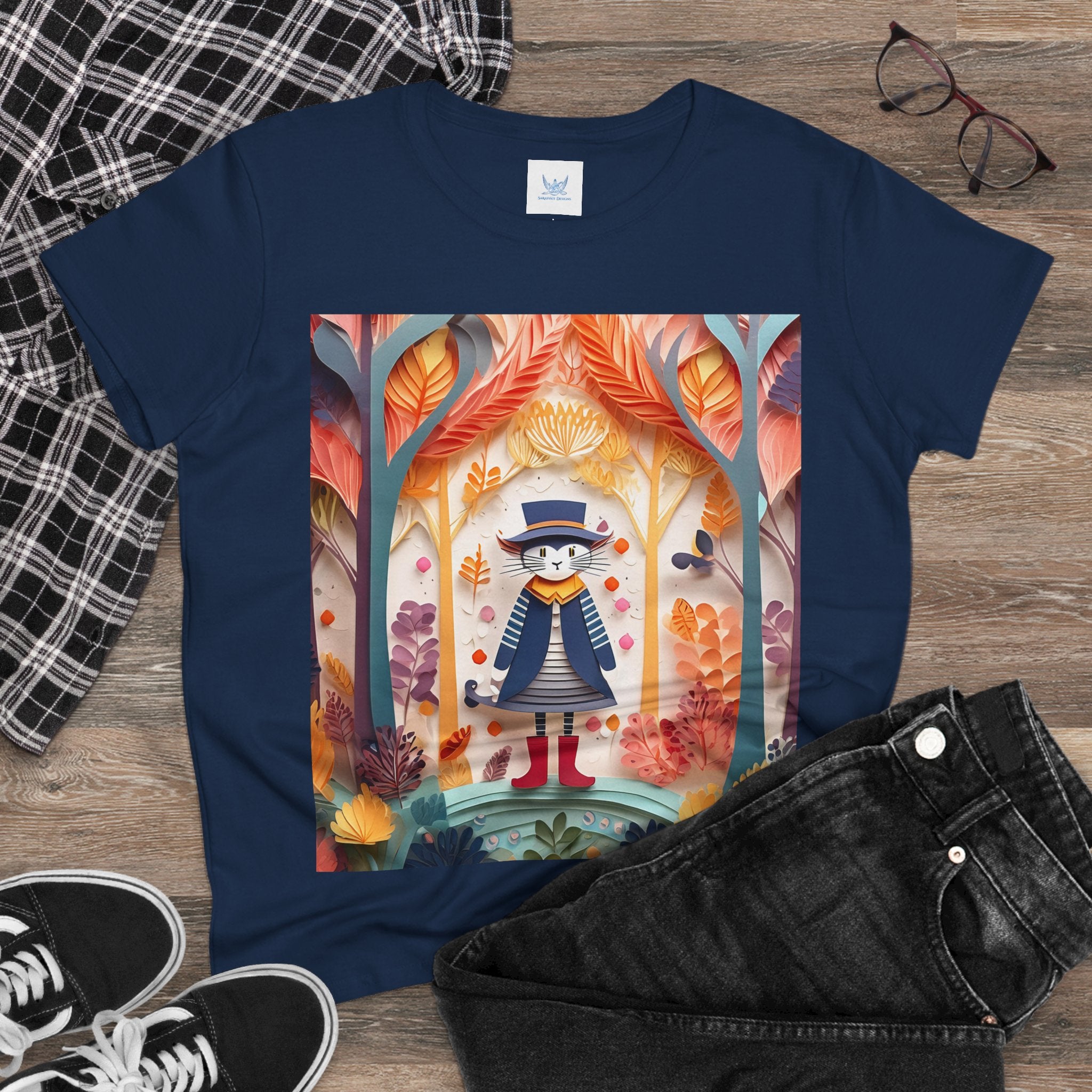 In this enchanting artwork, a cute and charming cat stands proudly in the middle of a colorful forest. The cat is dressed in a whimsical outfit, wearing bright red boots, a charming dress adorned with delicate patterns, and a matching hat with a small feather.