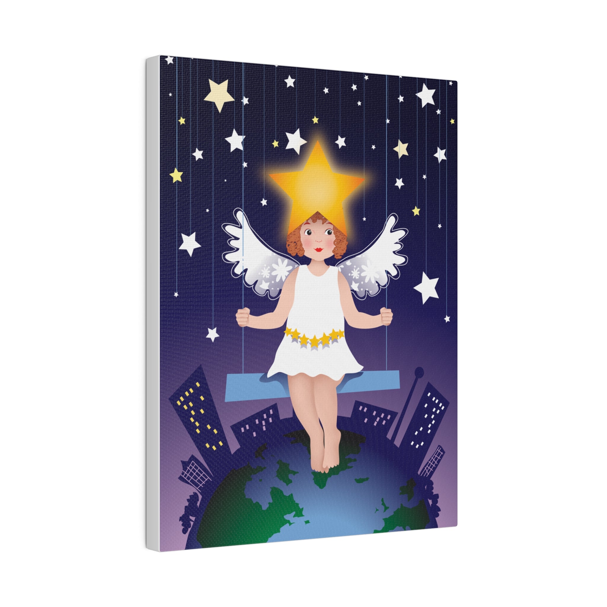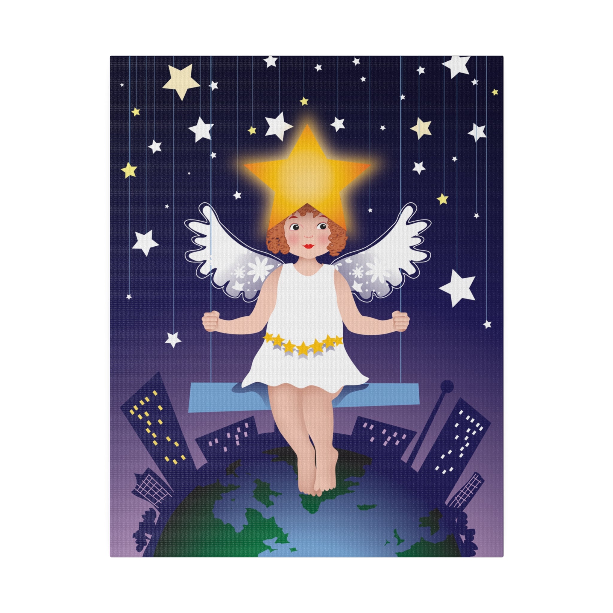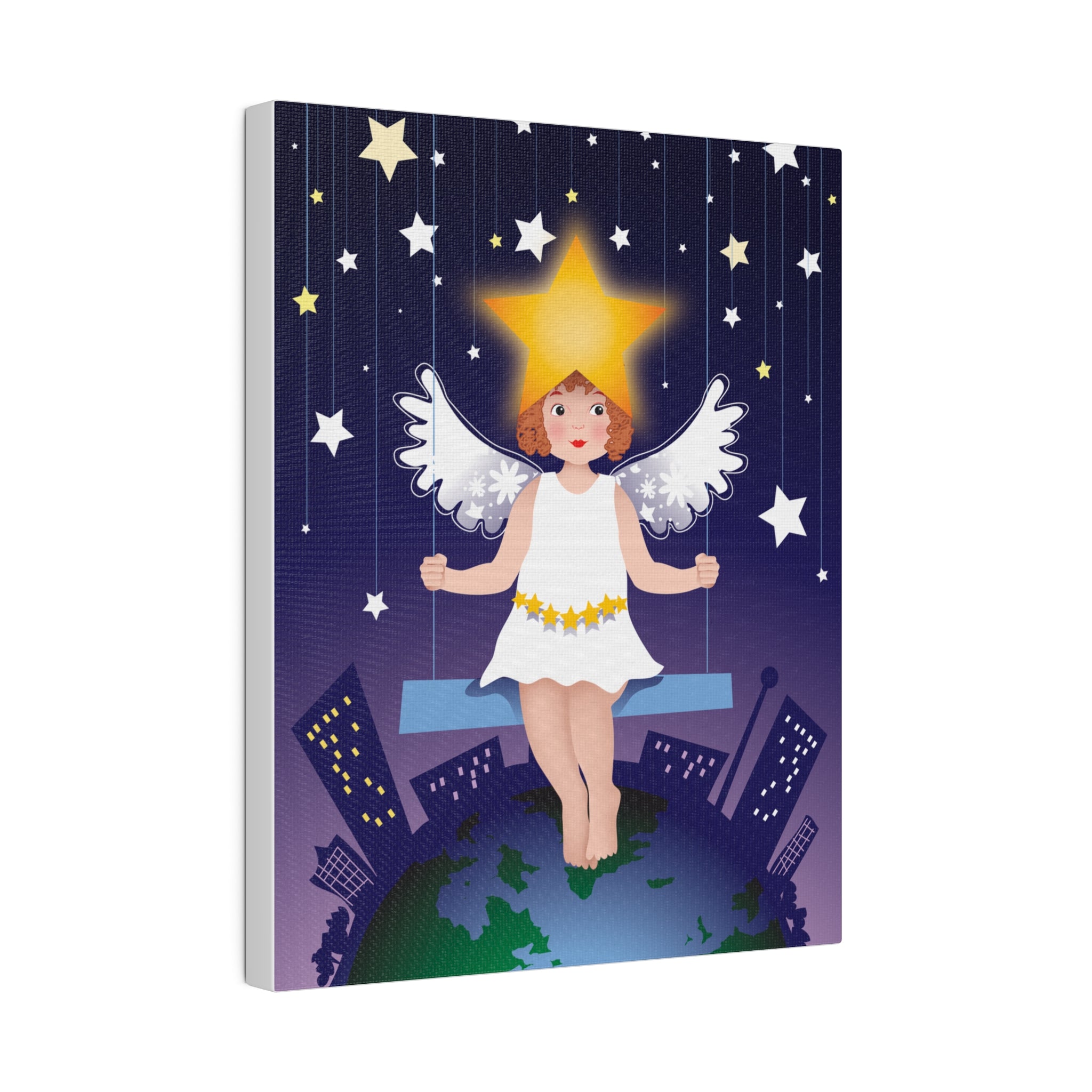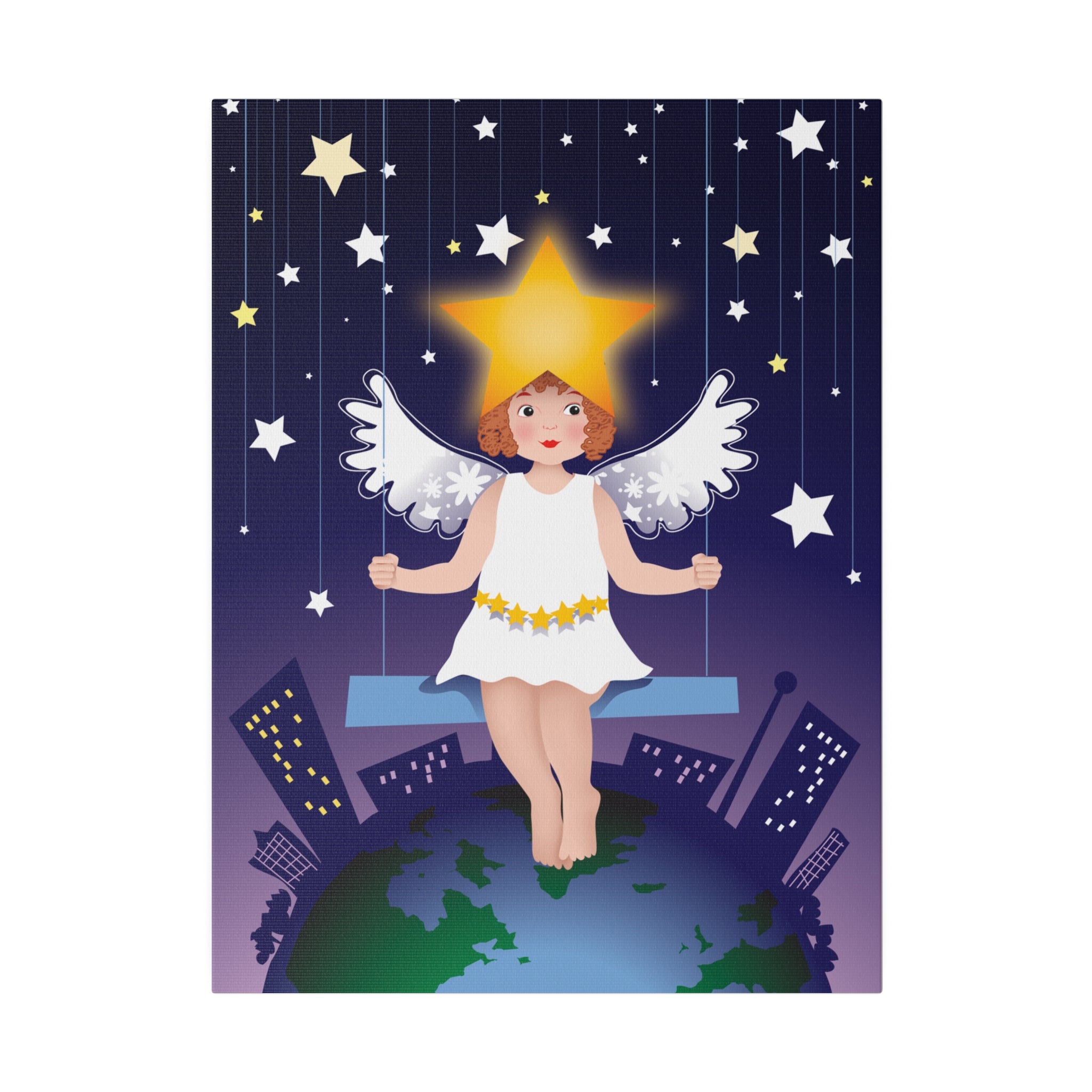 Artwork created, designed and digitally remastered by Sarasvati Designs. A young angel suspended on a swing in a night sky, surrounded by gold and white stars, creates a dreamlike atmosphere in this captivating artwork.