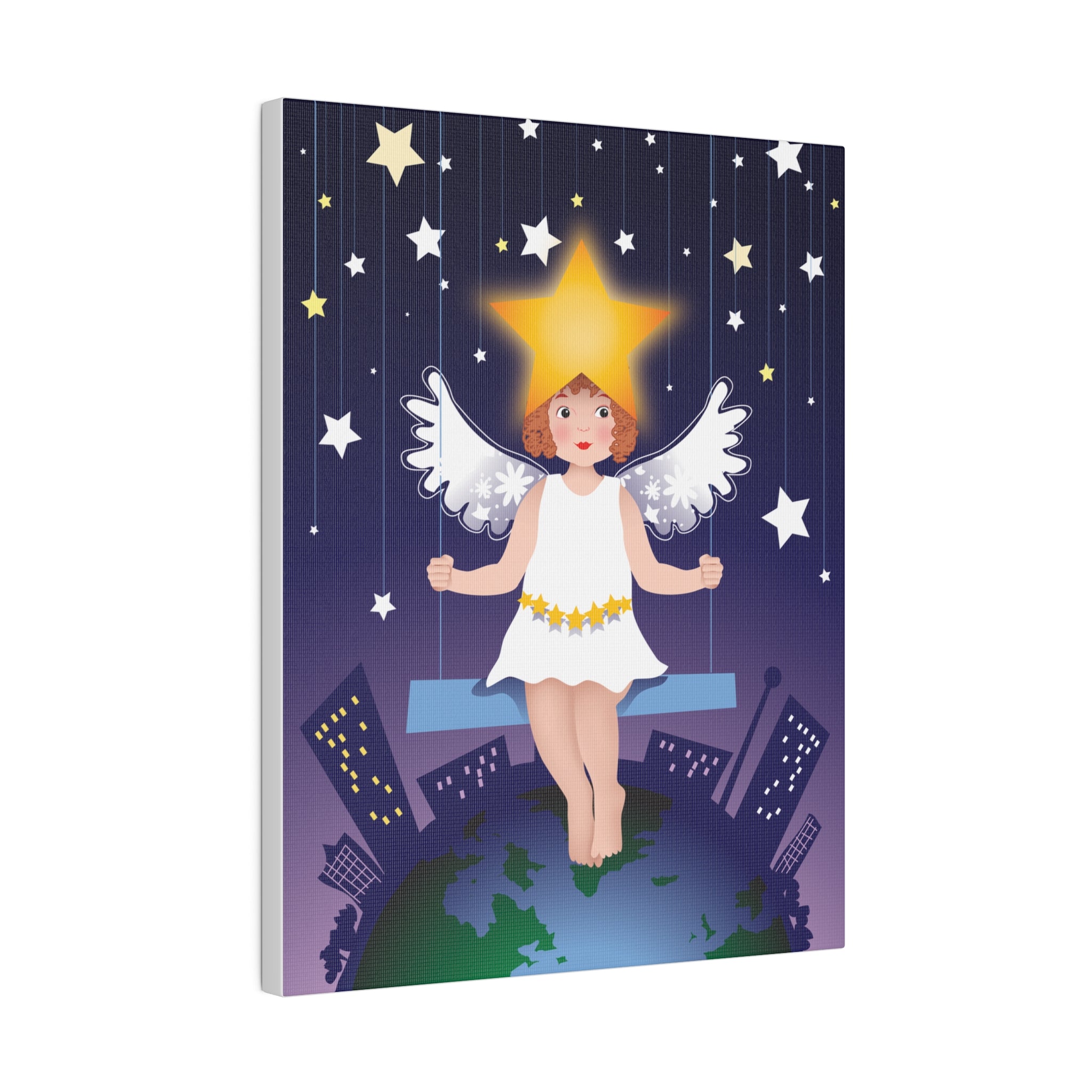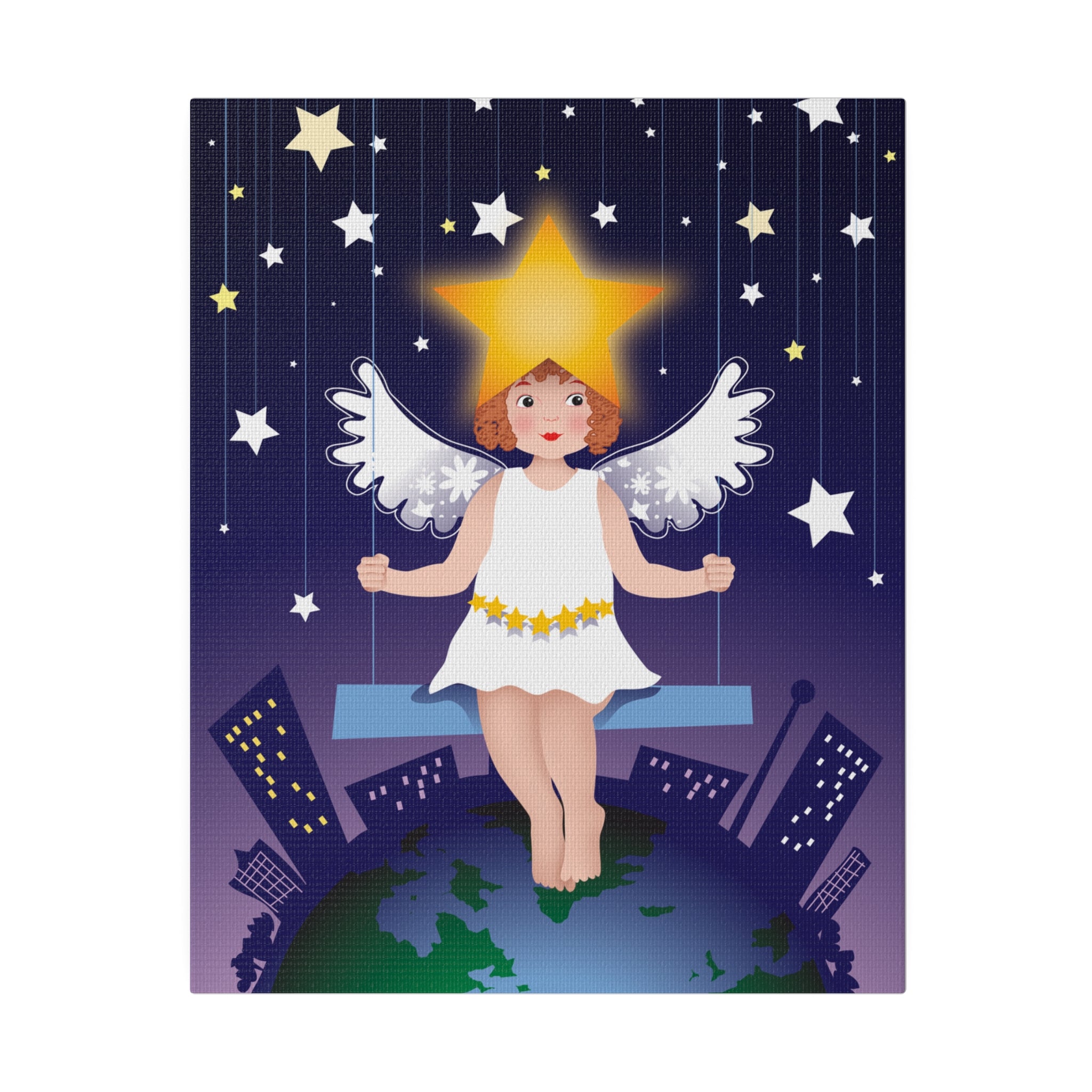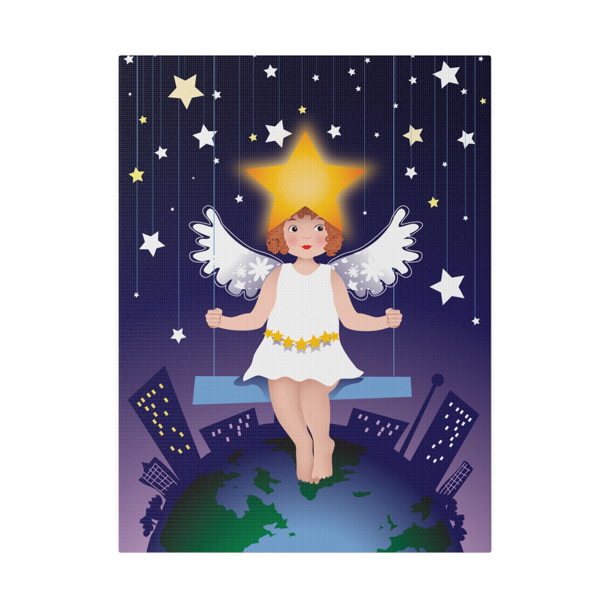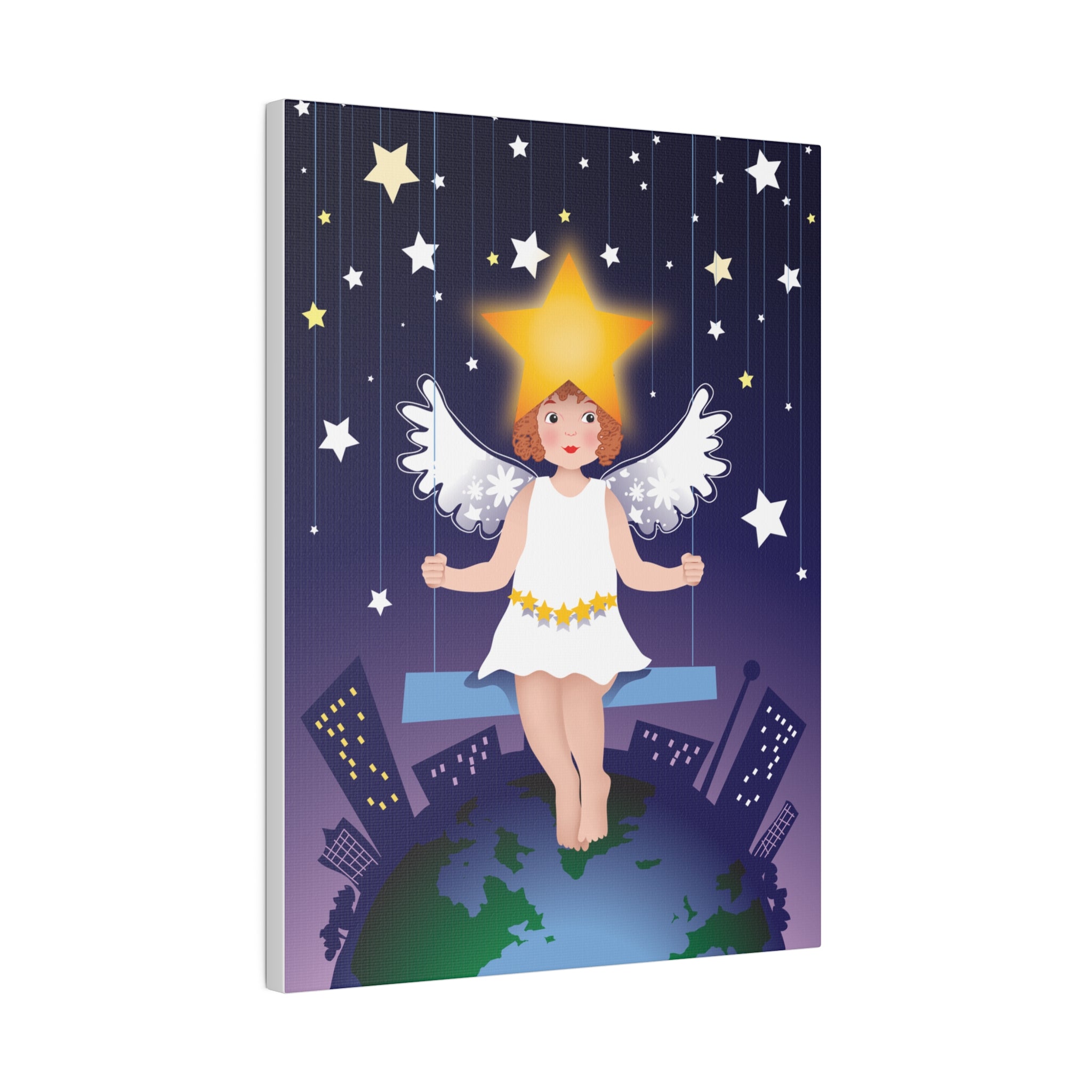 Artwork created, designed and digitally remastered by Sarasvati Designs. A young angel suspended on a swing in a night sky, surrounded by gold and white stars, creates a dreamlike atmosphere in this captivating artwork.