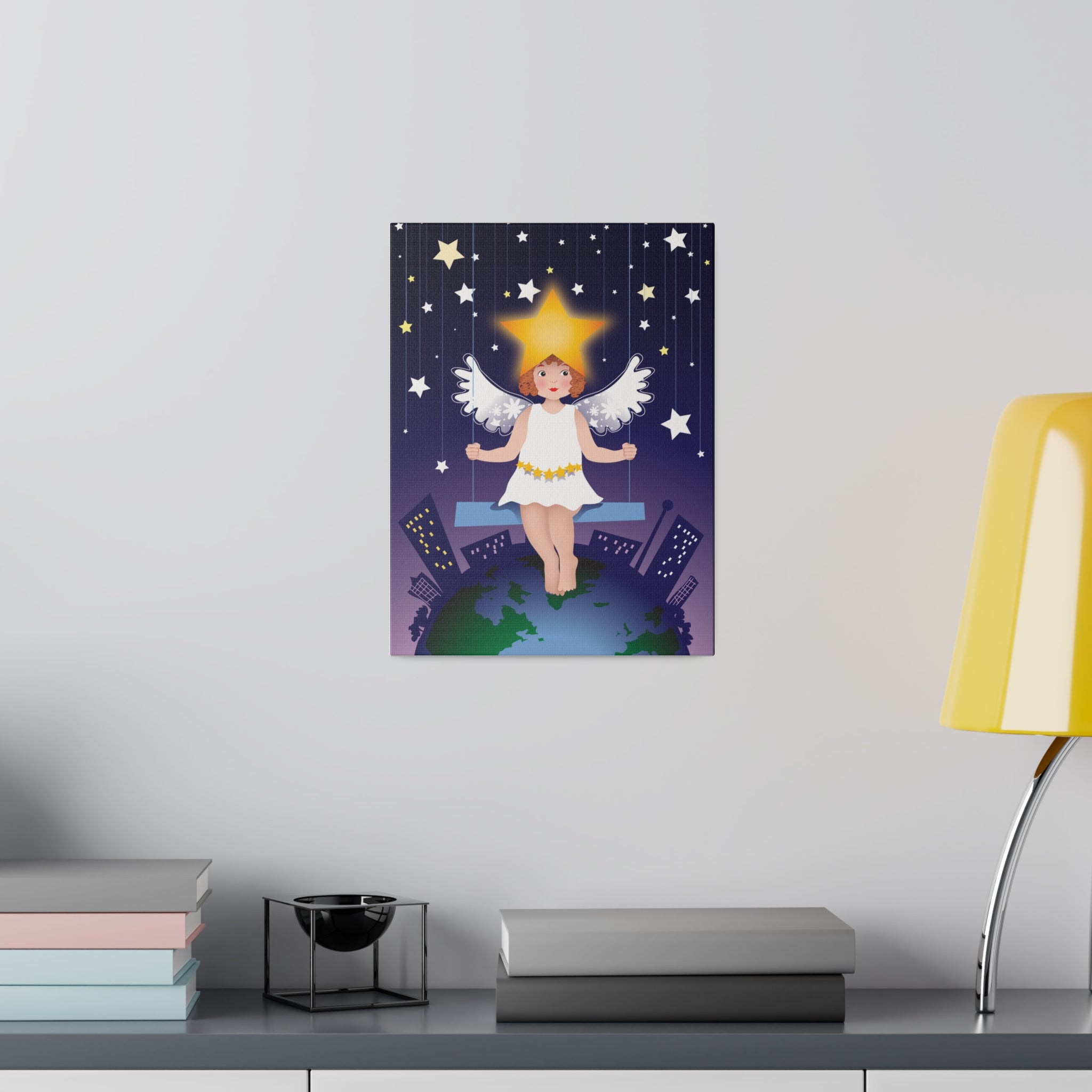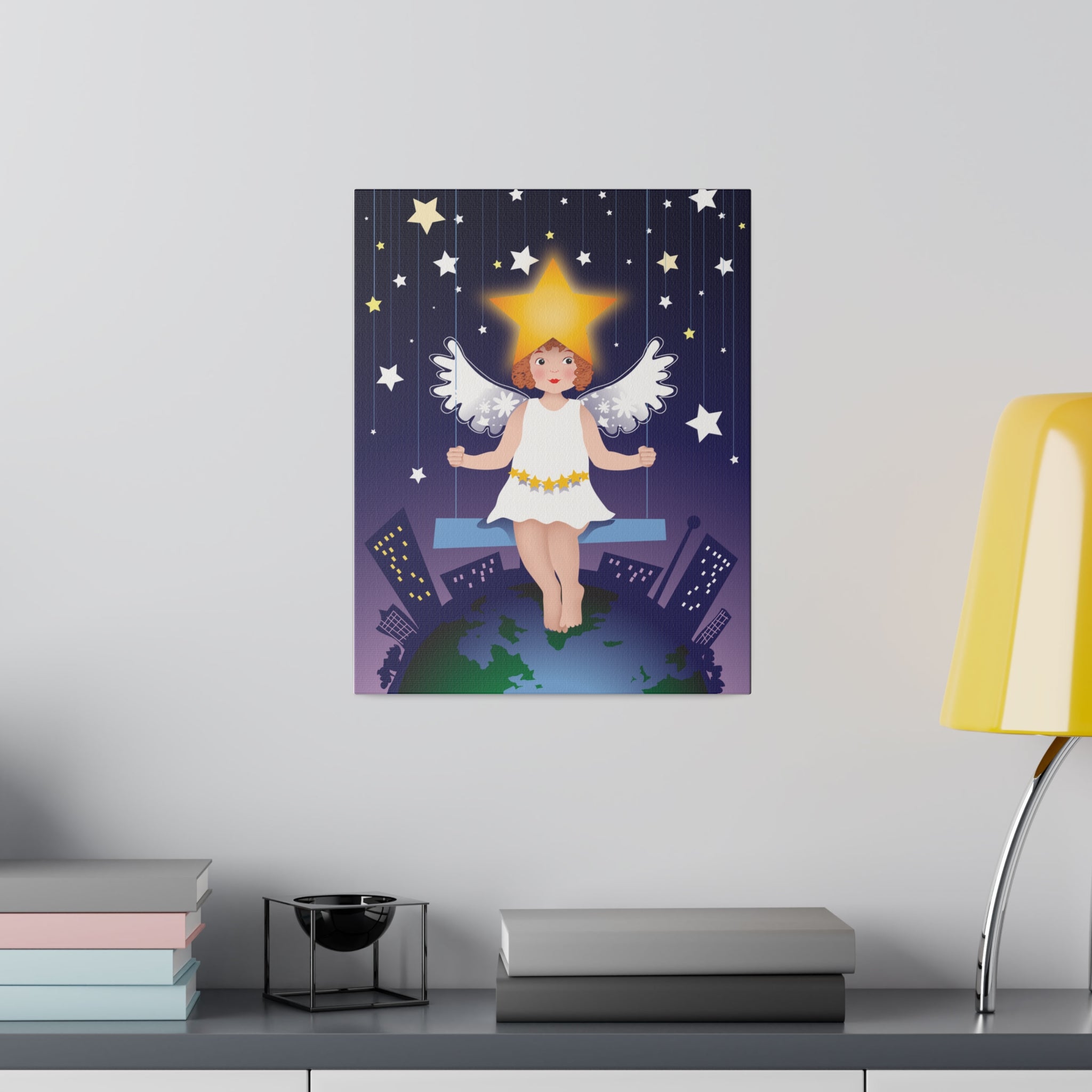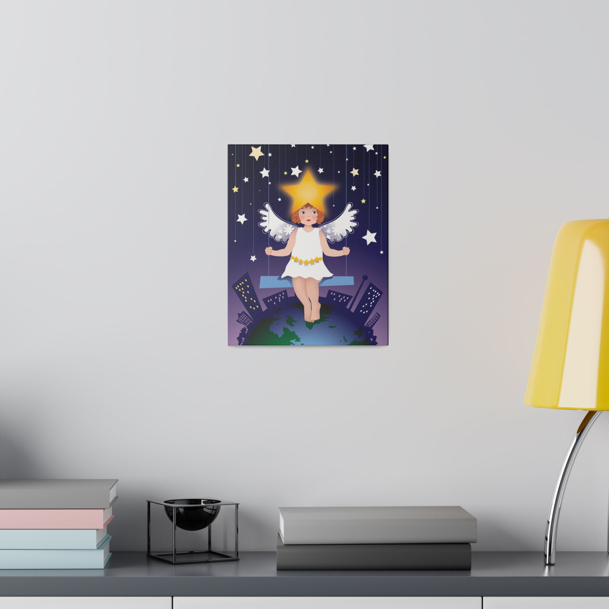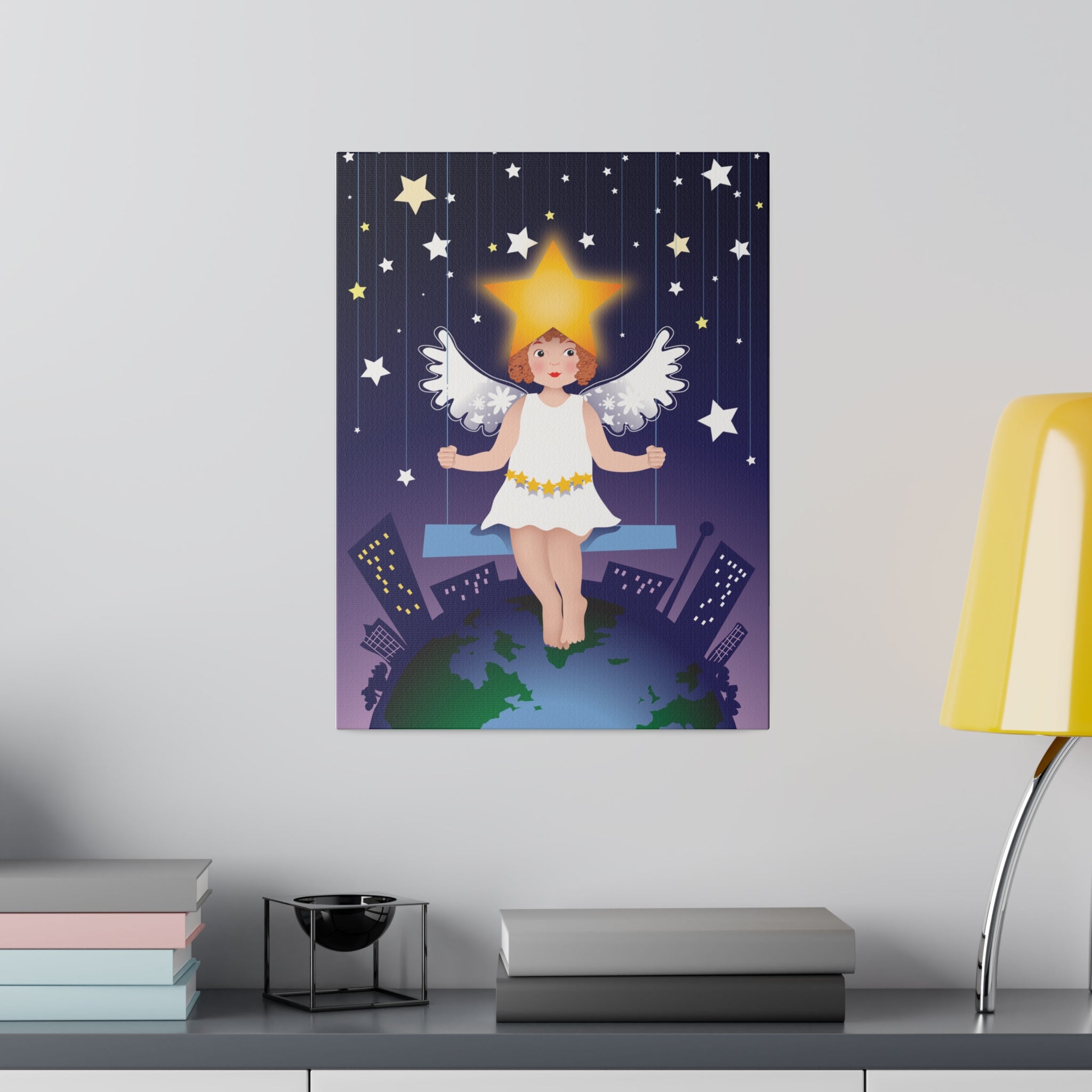 Artwork created, designed and digitally remastered by Sarasvati Designs. A young angel suspended on a swing in a night sky, surrounded by gold and white stars, creates a dreamlike atmosphere in this captivating artwork.