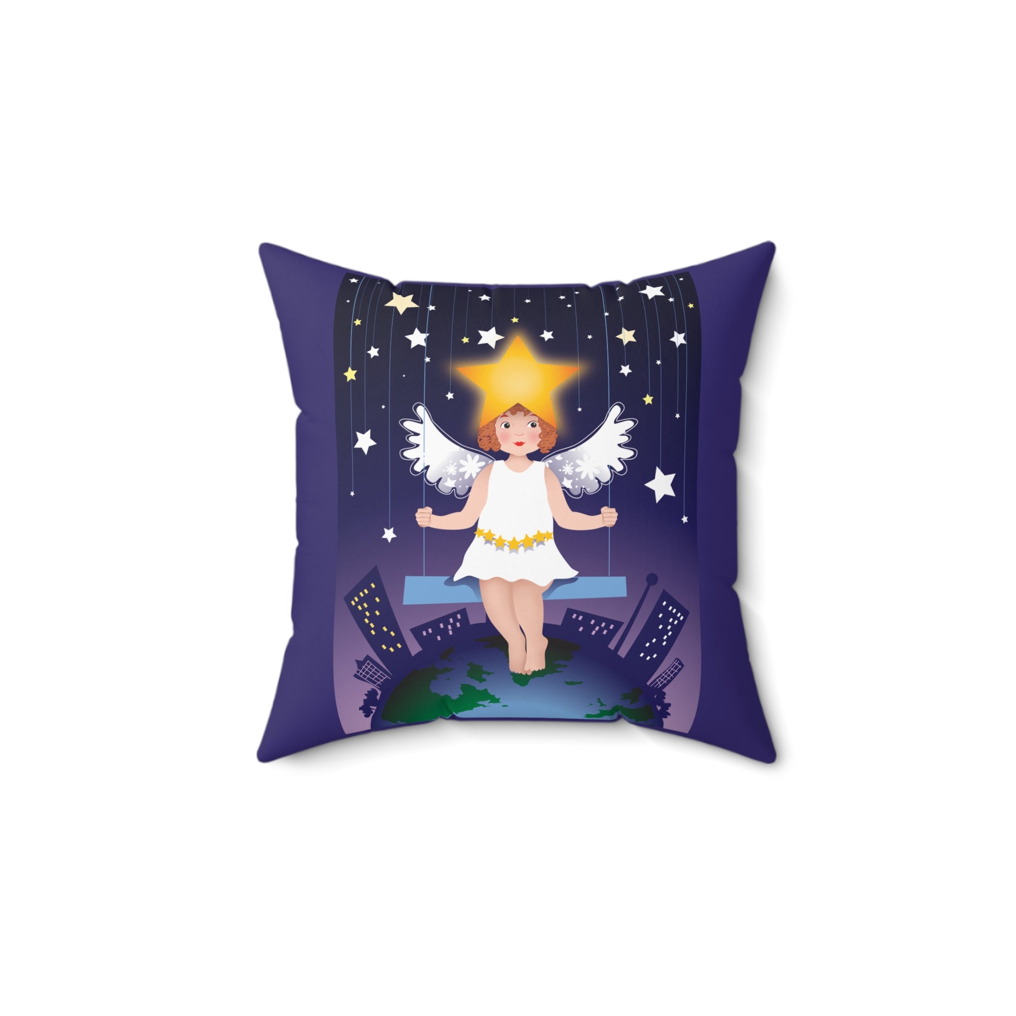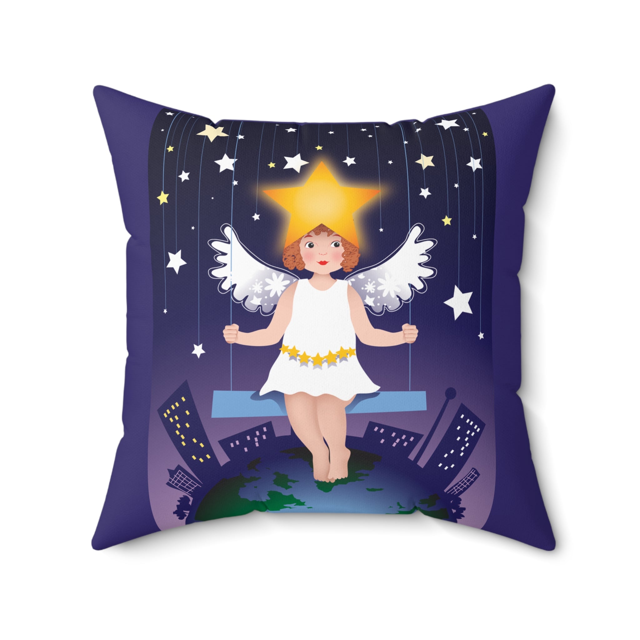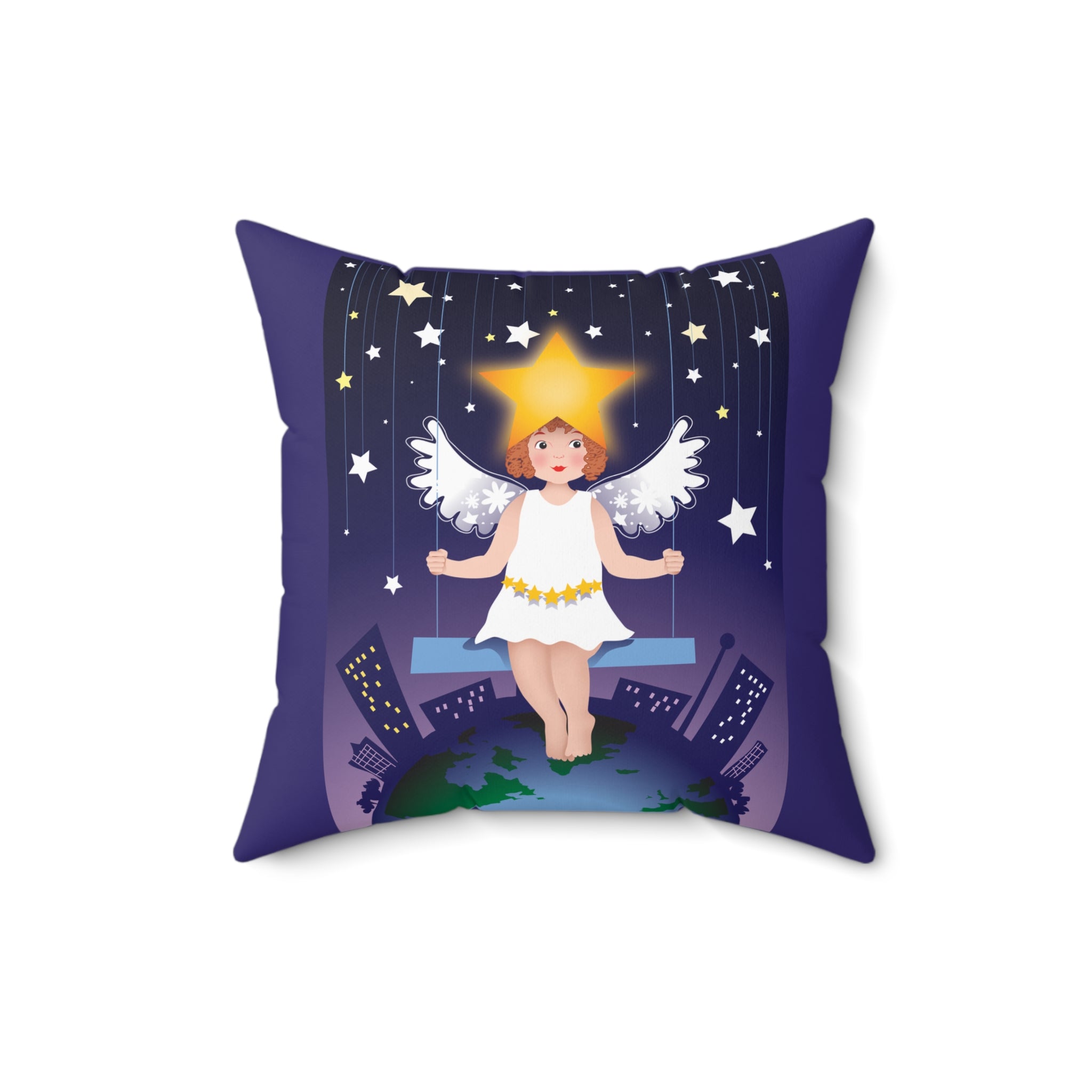 Artwork created, designed and digitally remastered by Sarasvati Designs. A young angel suspended on a swing in a night sky, surrounded by gold and white stars, creates a dreamlike atmosphere in this captivating artwork.