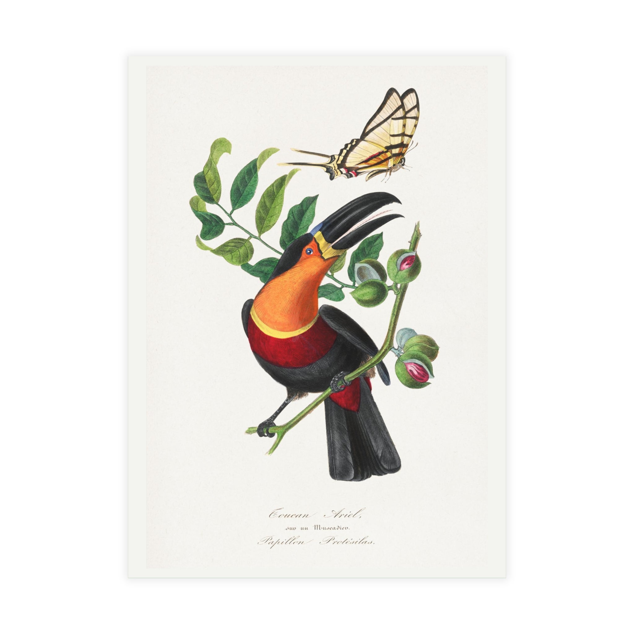 Artwork designed and digitally remastered by Sarasvati Designs. The Channel-billed Toucan bird painting featured in the 1842 edition of "Le Jardin Des Plantes" is a work by Paul Gervais, a prominent French naturalist and artist of the 19th century. Gervais was known for his contributions to zoology and paleontology, as well as his artistic talents in depicting the natural world.