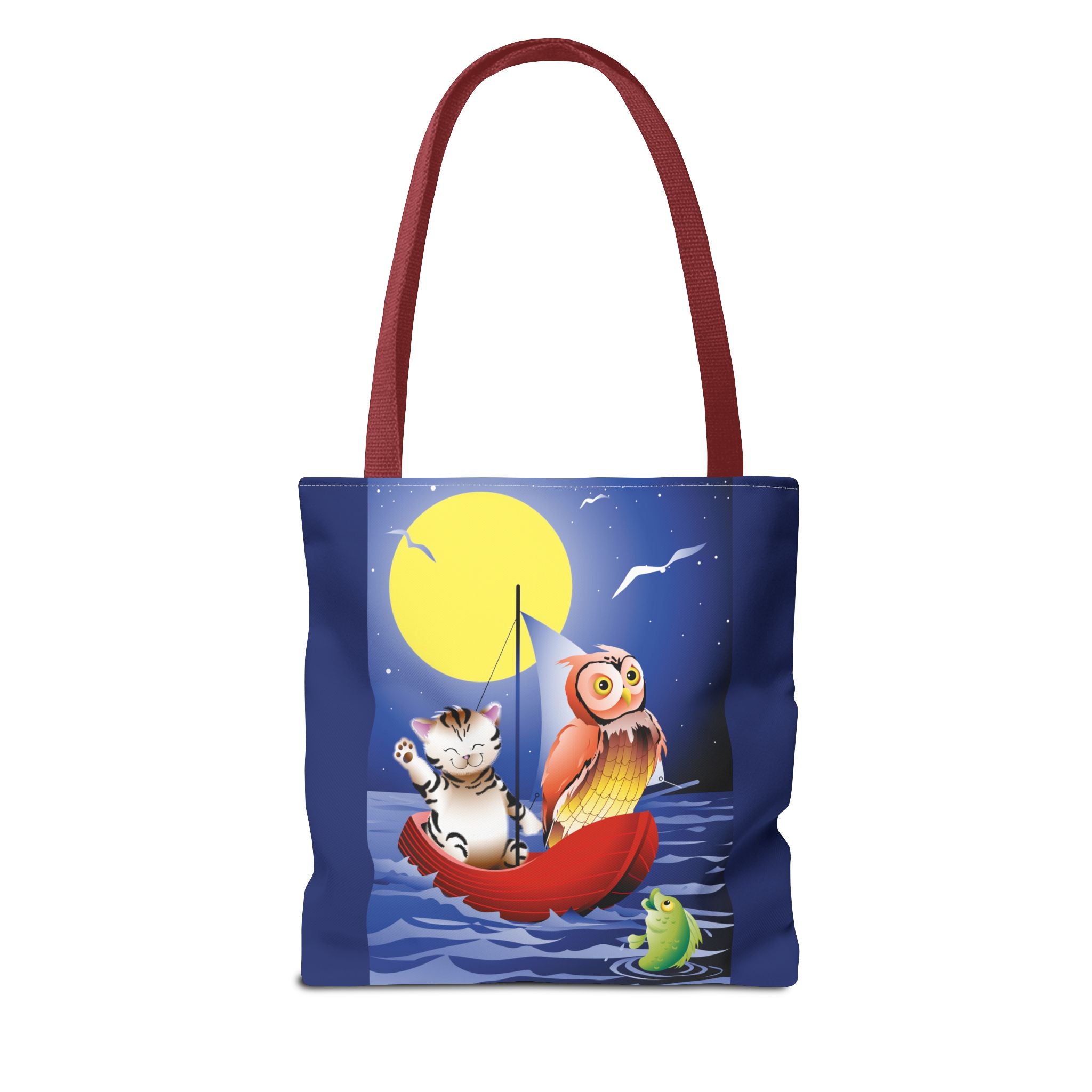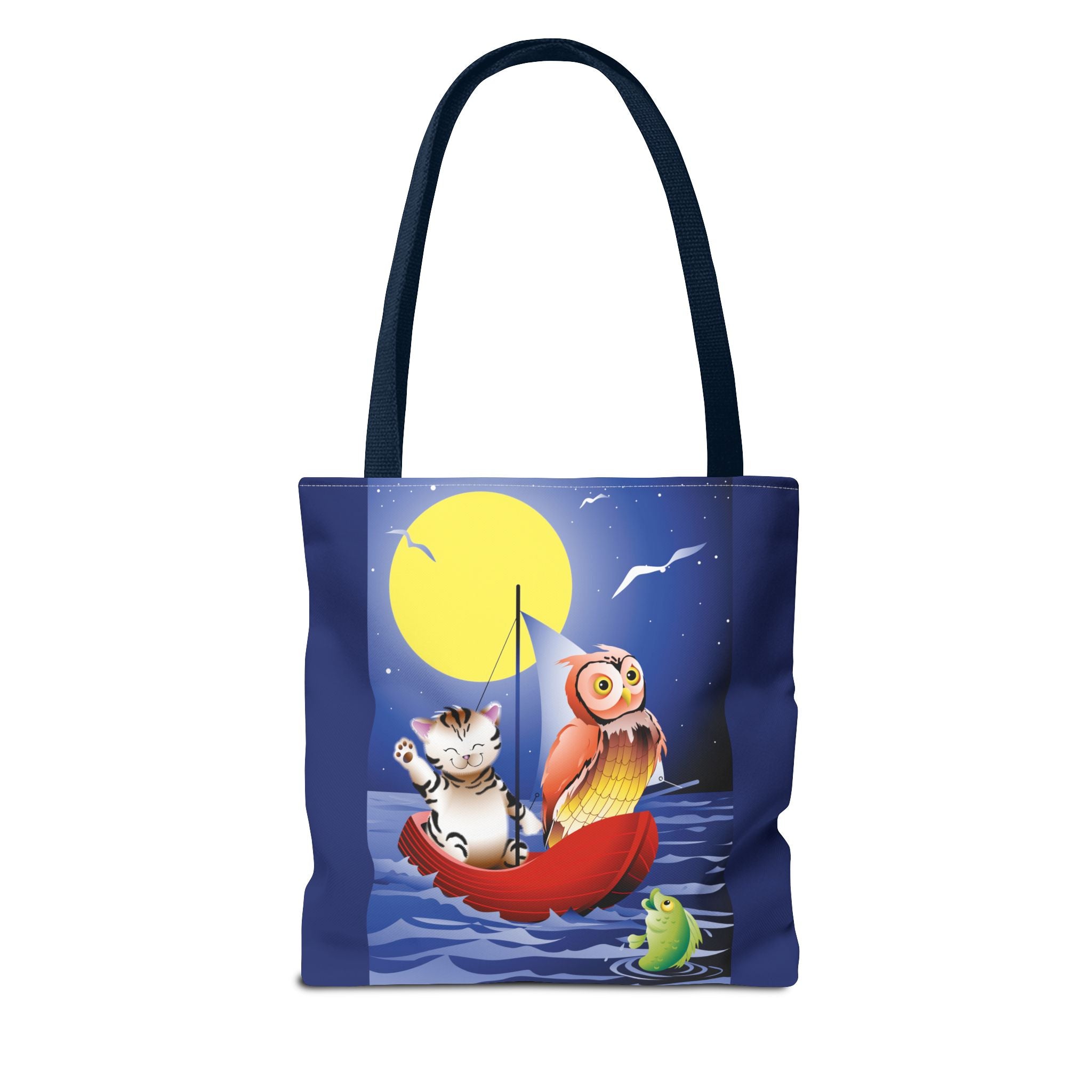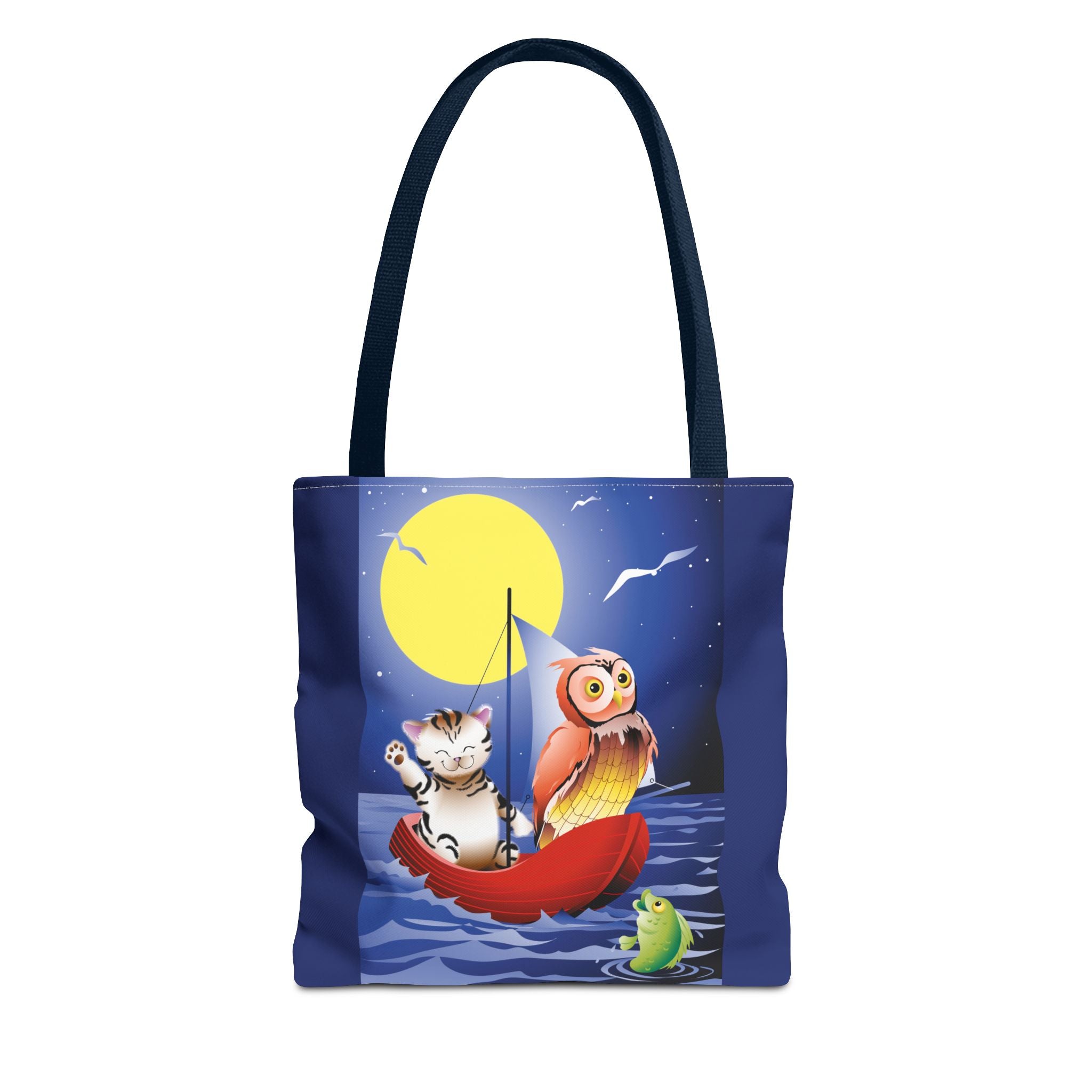 This Tote Bag features captivating children's artwork of an owl and a pussy cat sailing under a bright full moon through a deep blue sea, inspiring wonder, friendship, and imagination on a moonlit adventure at sea. Perfect for those who love whimsical and imaginative designs, this bag is ideal for carrying books, groceries, or other essentials. Great for children, art lovers, or anyone who enjoys a touch of magic in their everyday life. Ideal for beach trips, picnics, or everyday use.