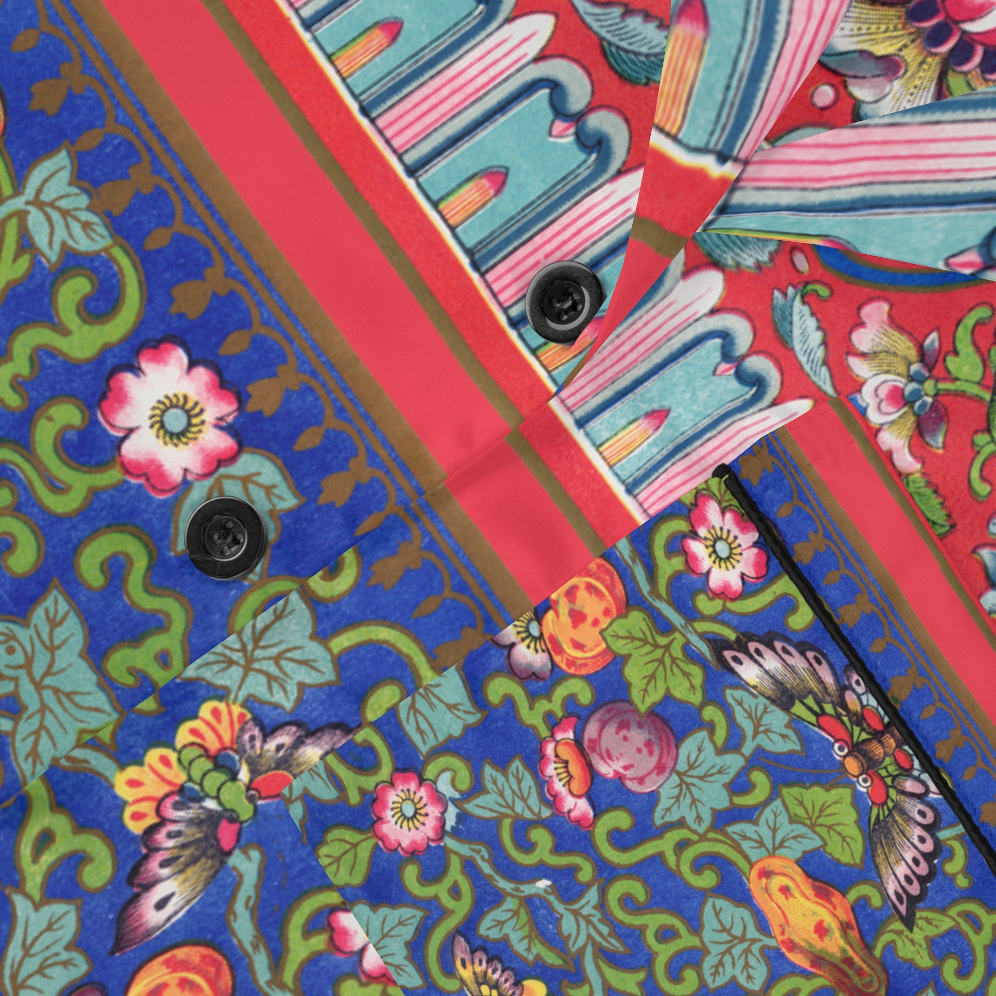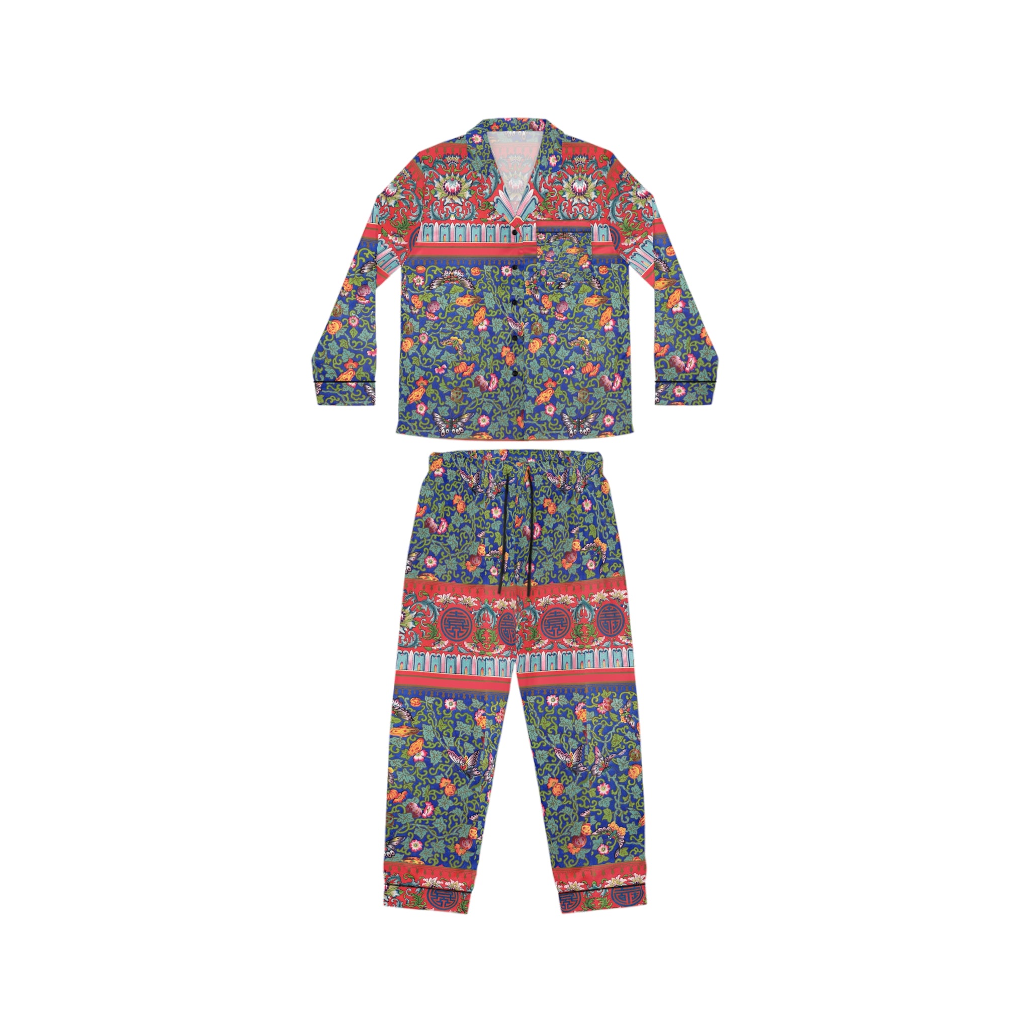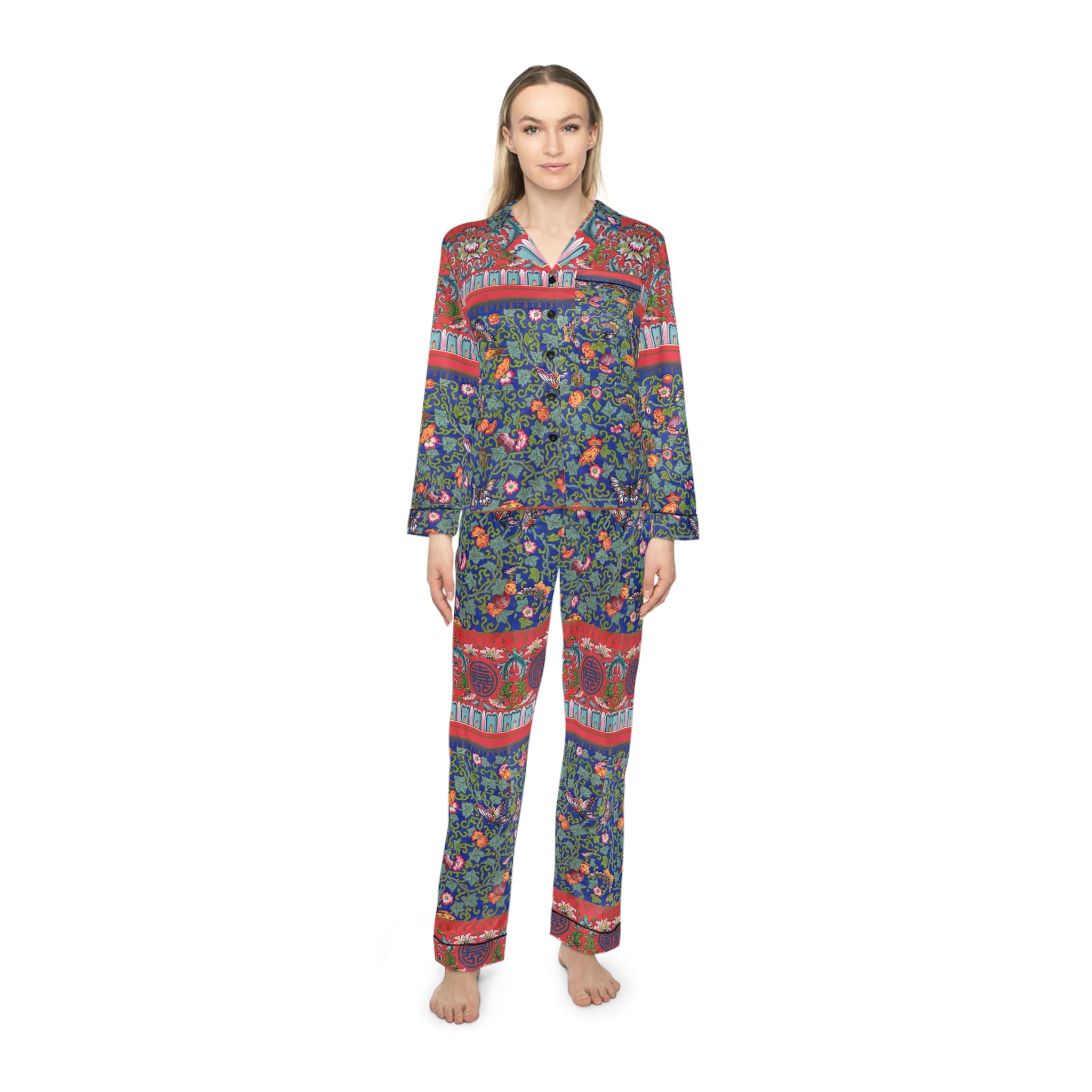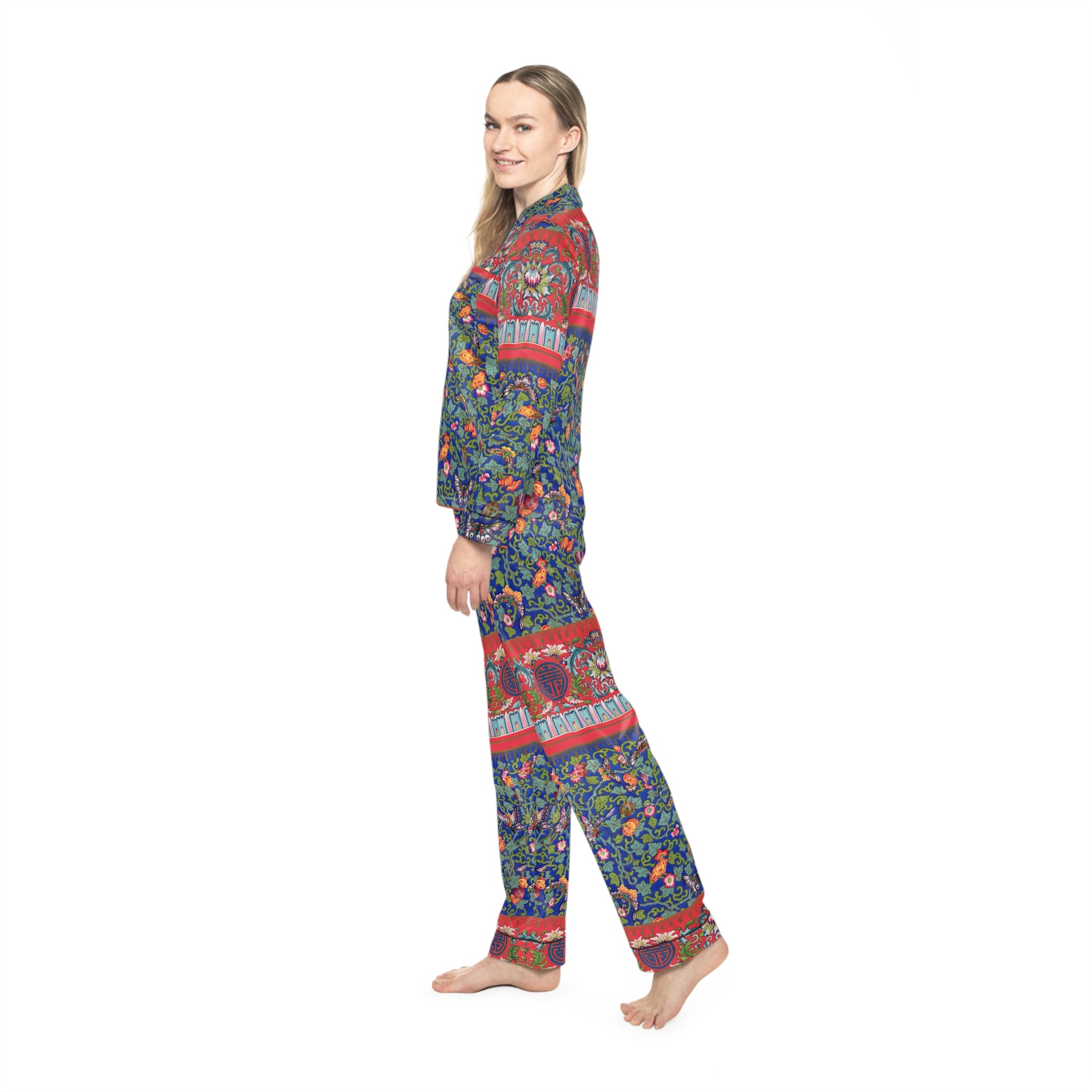 Crafted with a blend of 95% polyester and 5% spandex, these vintage art-designed pajamas offer a luxuriously soft feel. The soft satin fabric contributes to the creation of distinctive pajama sets. Each set is complete with a notch lapel (collar style) and a drawstring waist, ensuring a comfortable and snug fit.