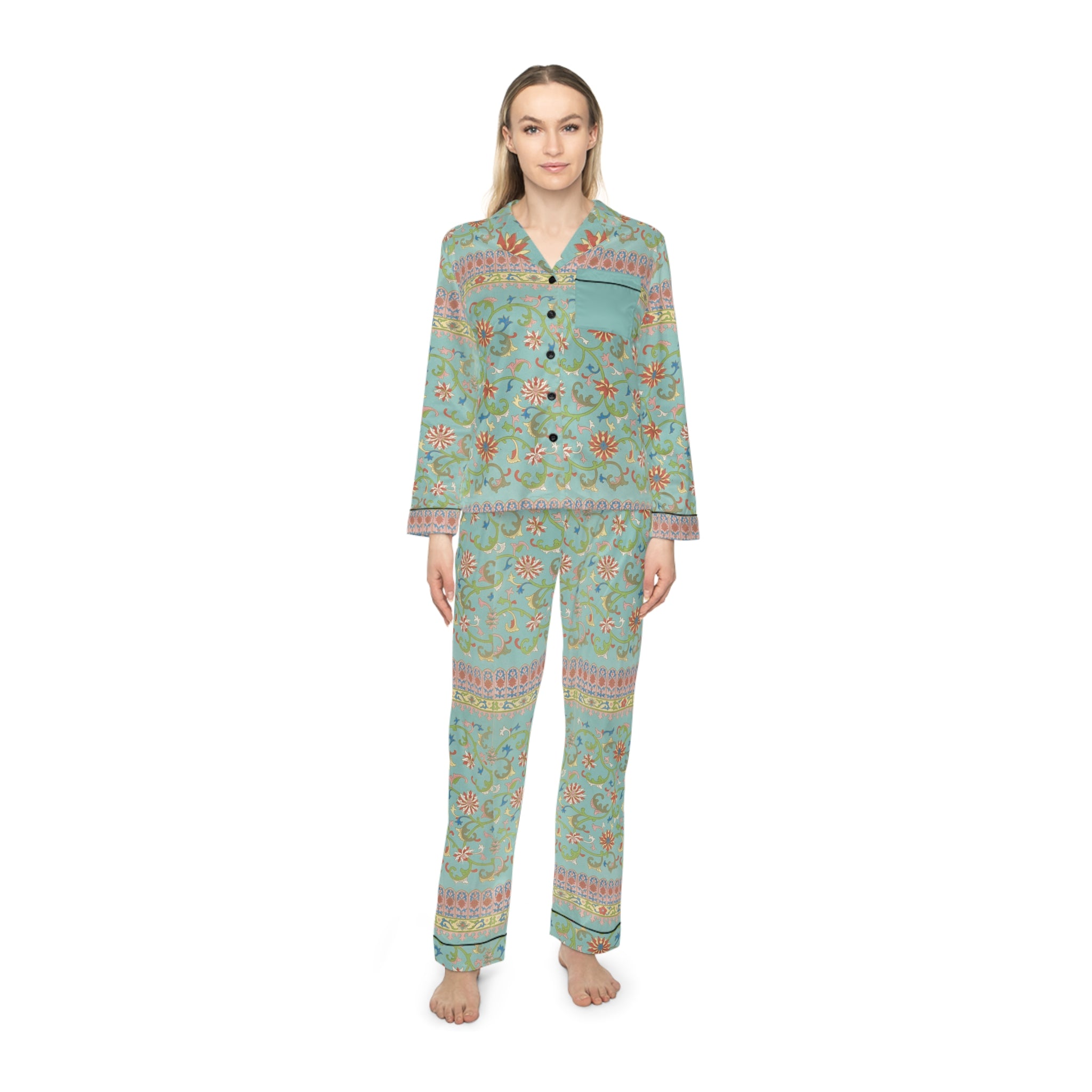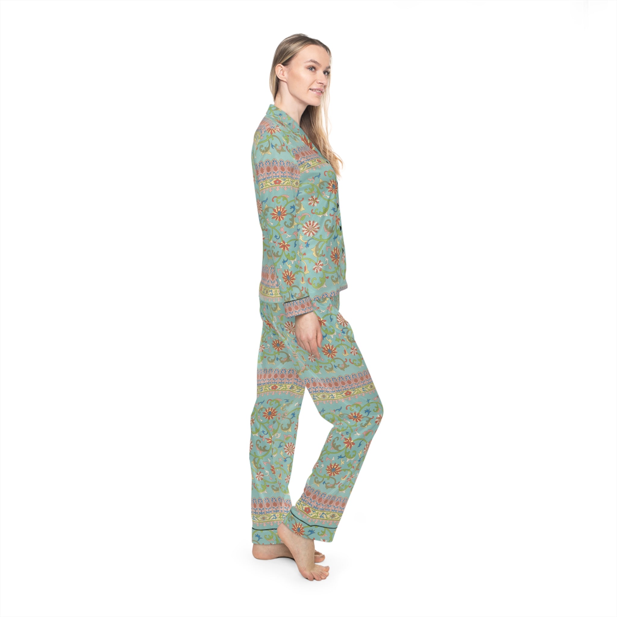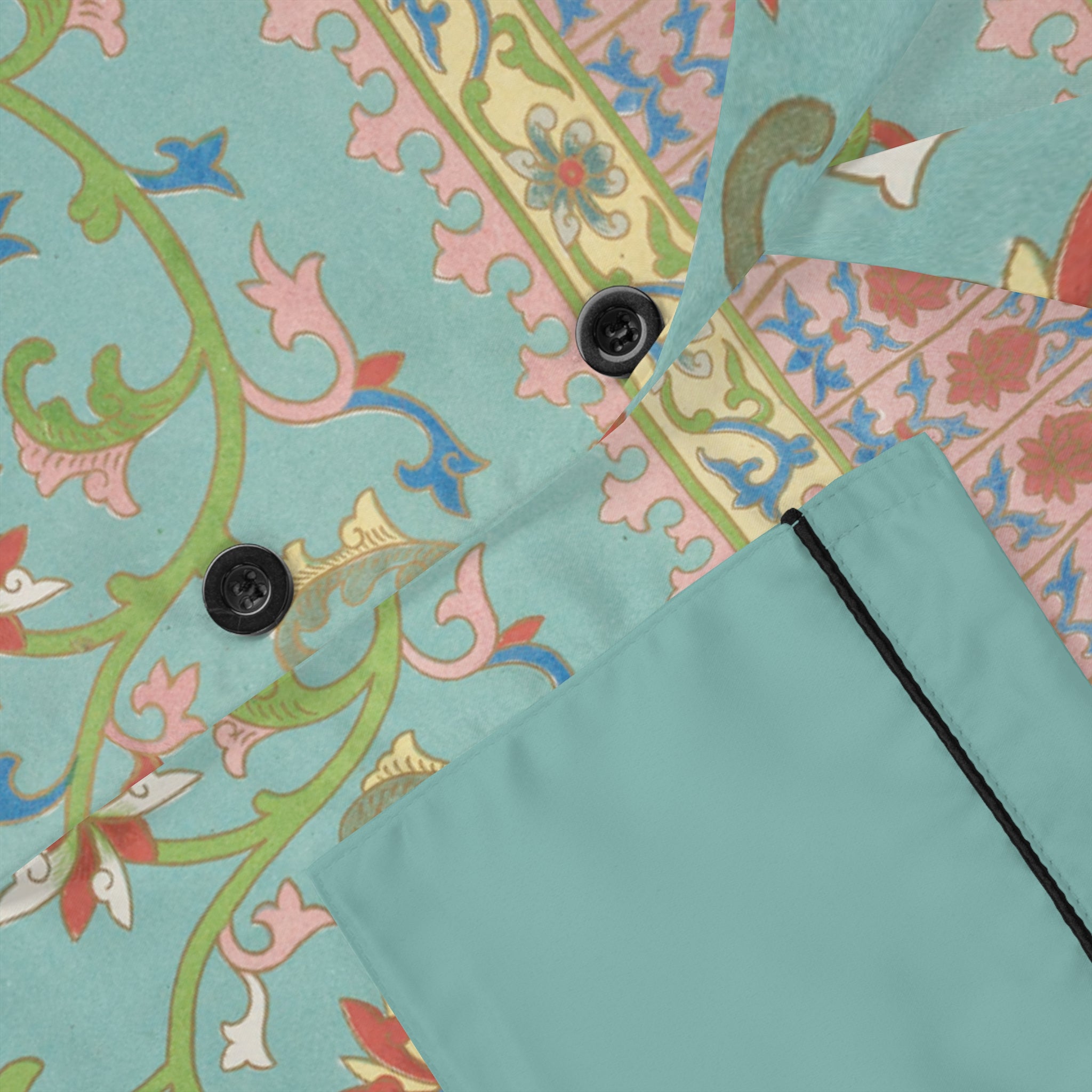 Crafted with a blend of 95% polyester and 5% spandex, these vintage art-designed pajamas offer a luxuriously soft feel. The soft satin fabric contributes to the creation of distinctive pajama sets. Each set is complete with a notch lapel (collar style) and a drawstring waist, ensuring a comfortable and snug fit.