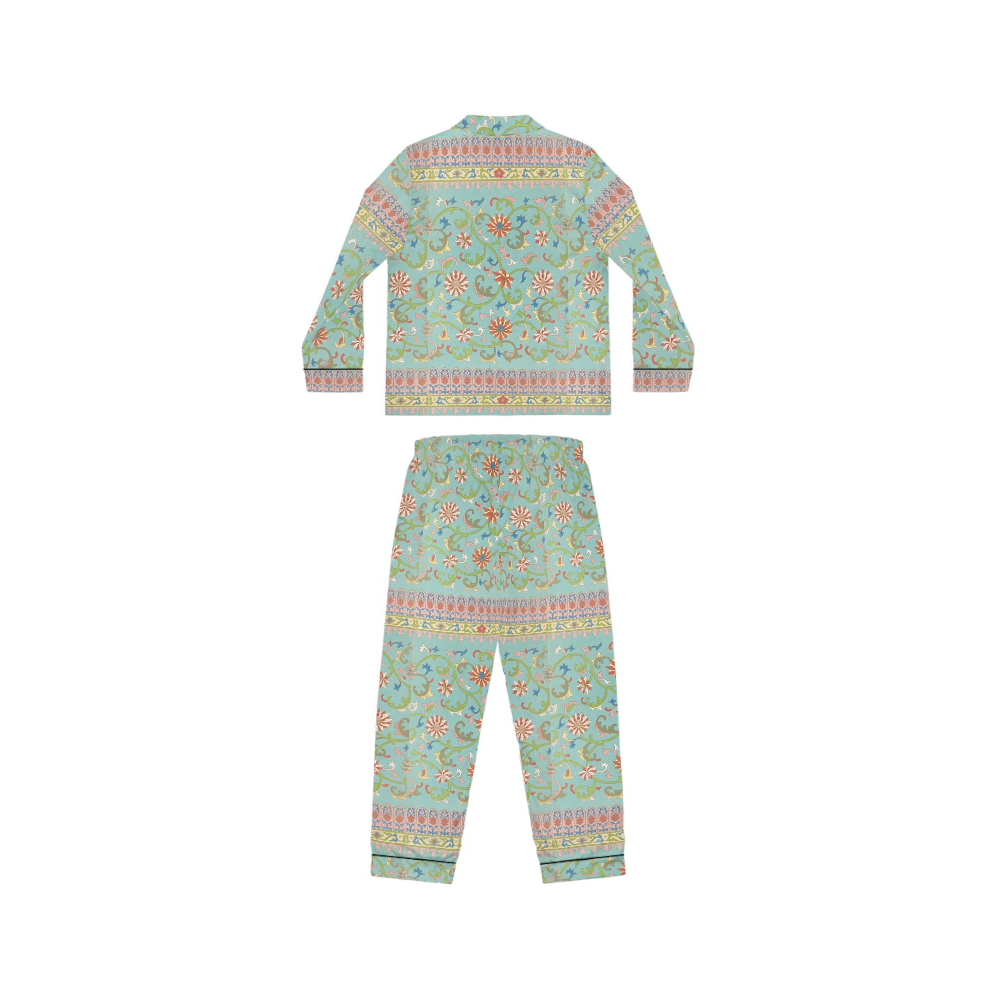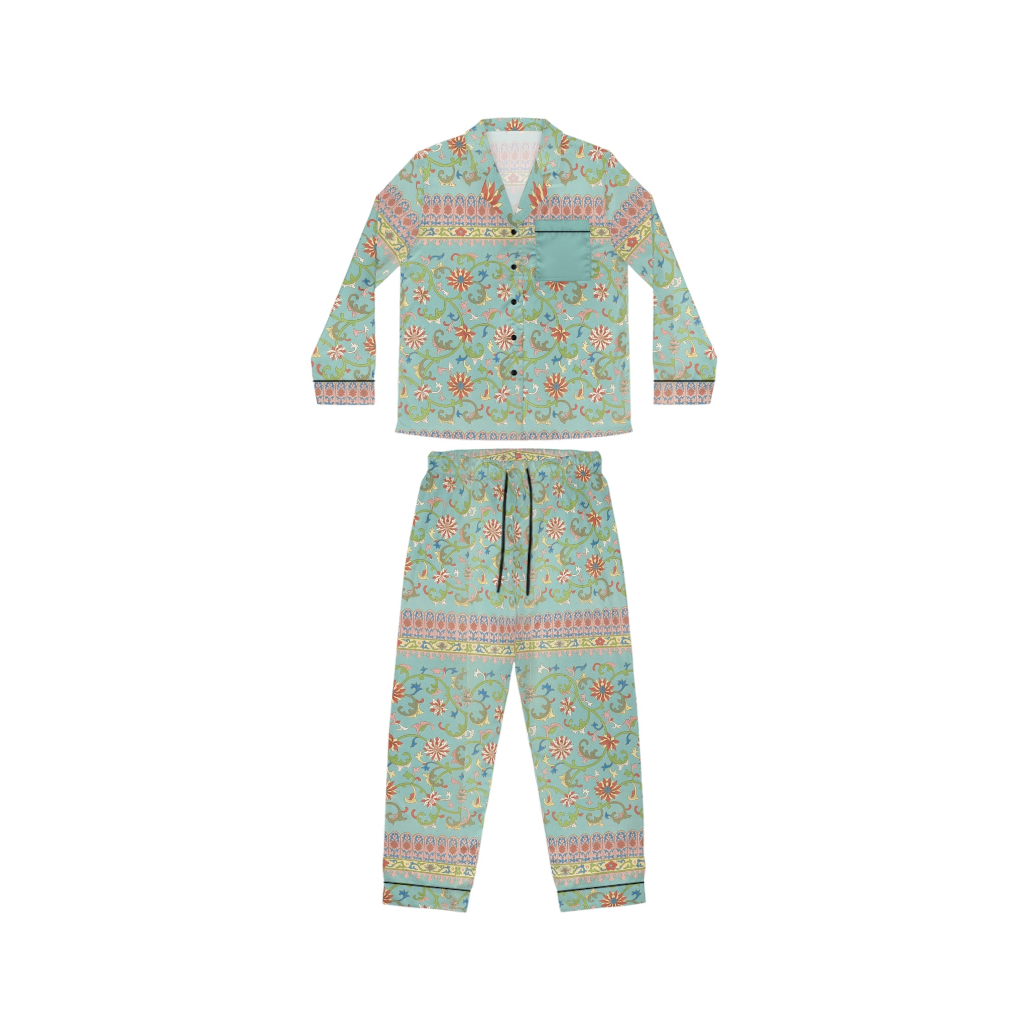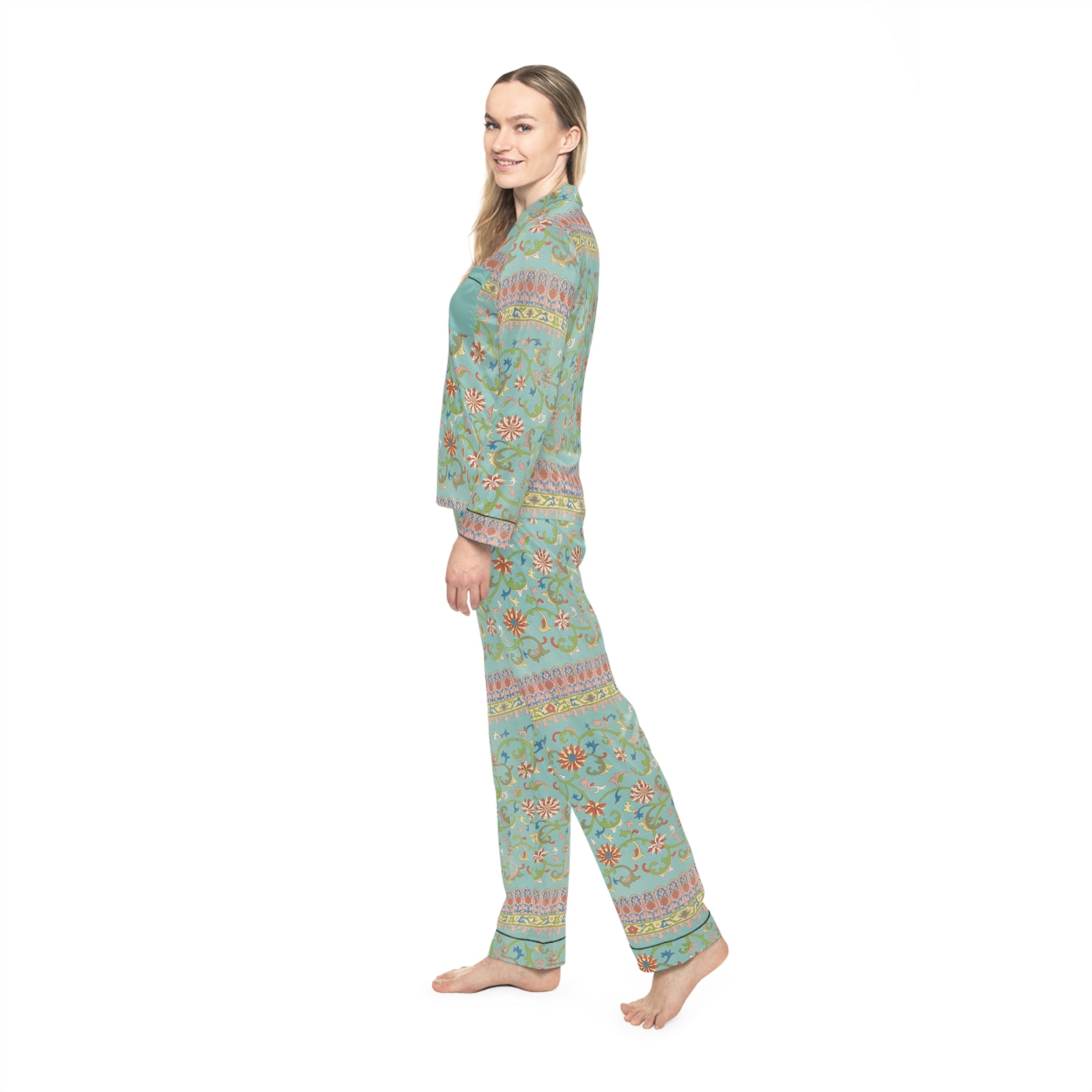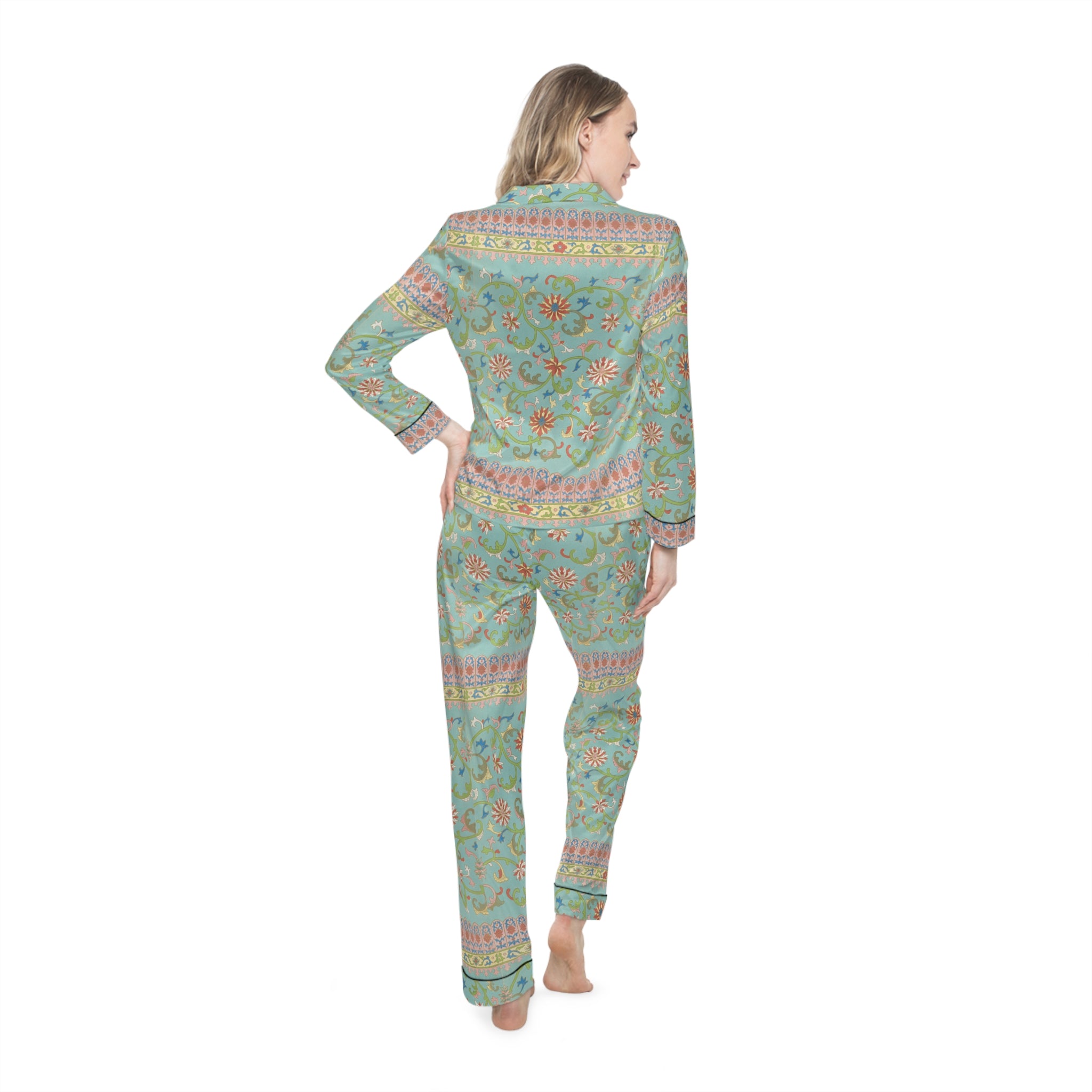 Crafted with a blend of 95% polyester and 5% spandex, these vintage art-designed pajamas offer a luxuriously soft feel. The soft satin fabric contributes to the creation of distinctive pajama sets. Each set is complete with a notch lapel (collar style) and a drawstring waist, ensuring a comfortable and snug fit.