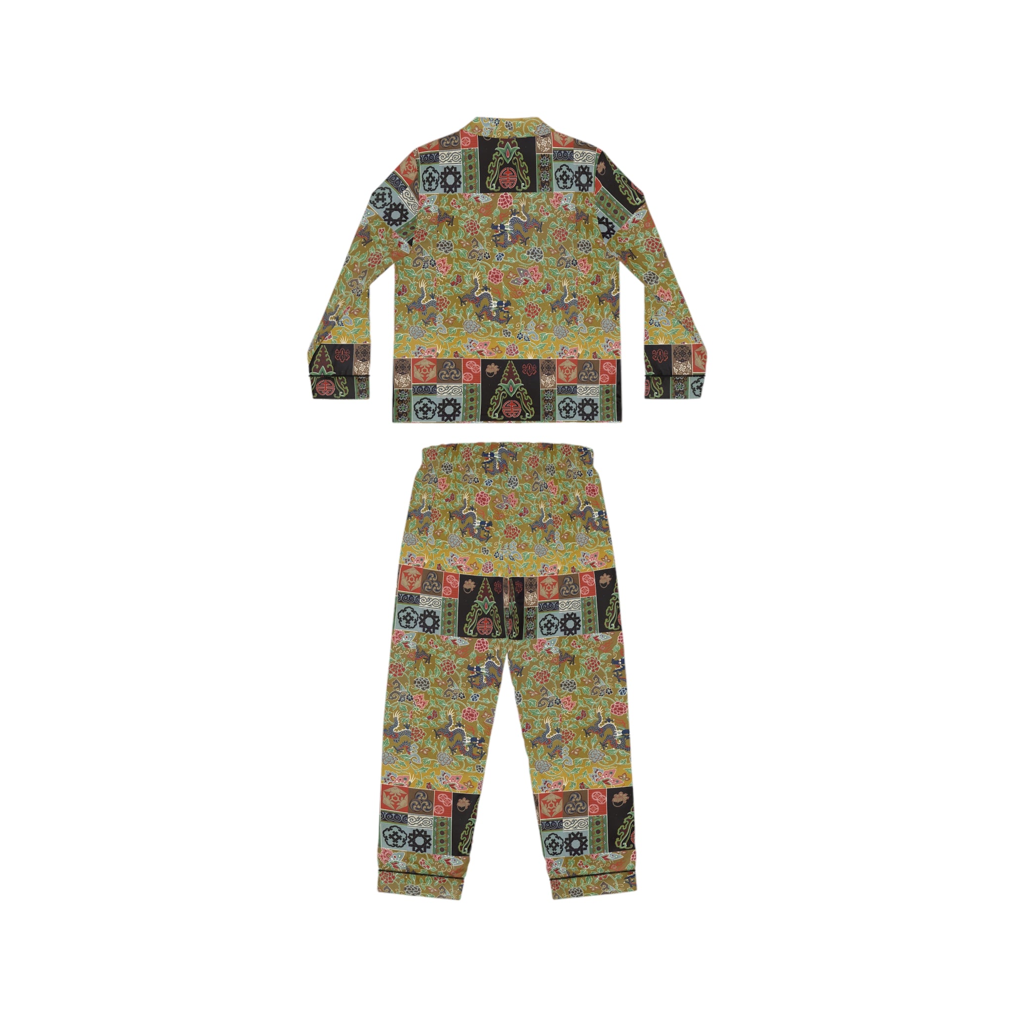 Crafted with a blend of 95% polyester and 5% spandex, these vintage art-designed pajamas offer a luxuriously soft feel. The soft satin fabric contributes to the creation of distinctive pajama sets. Each set is complete with a notch lapel (collar style) and a drawstring waist, ensuring a comfortable and snug fit.