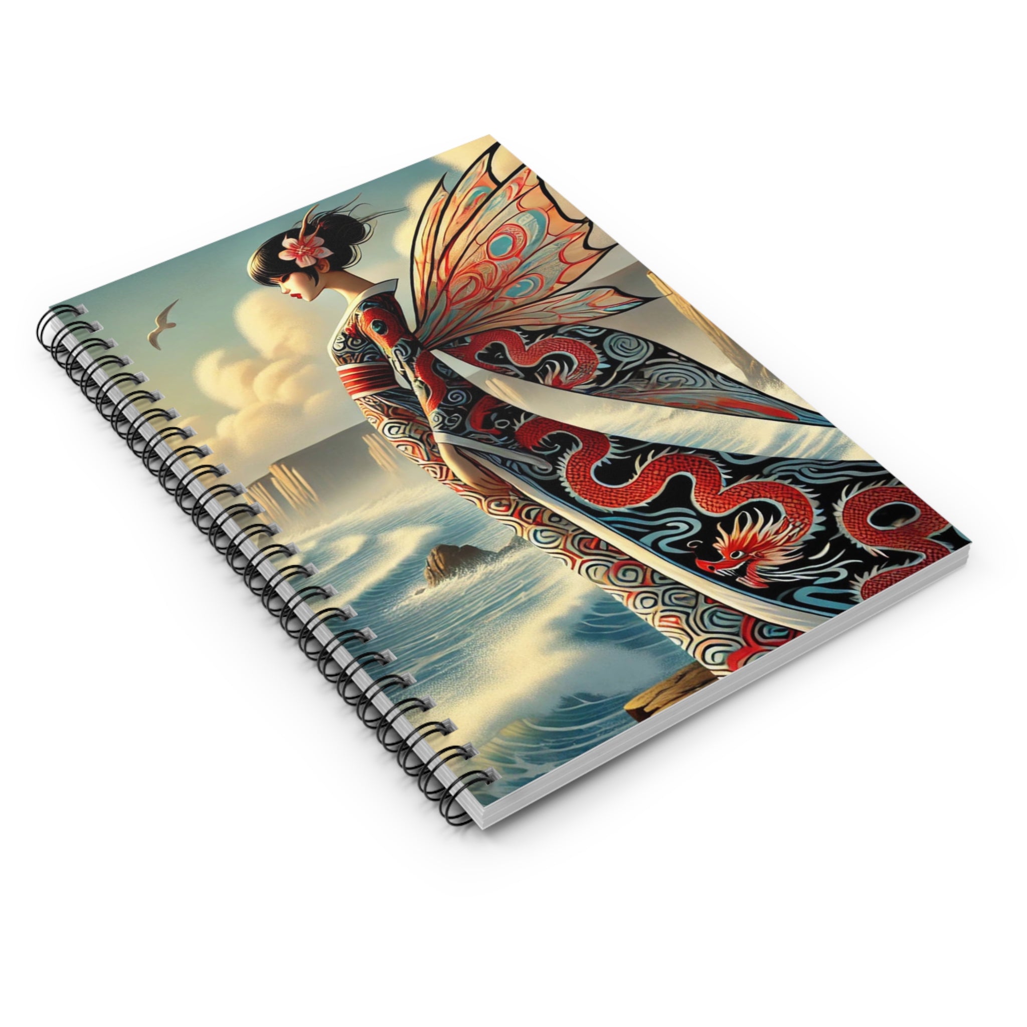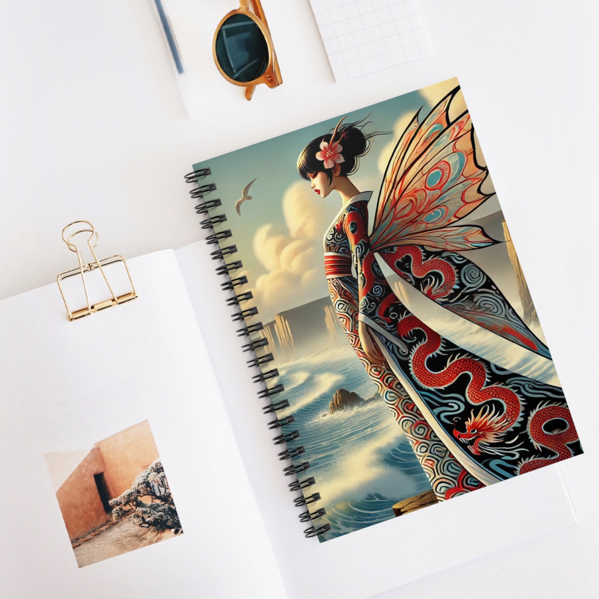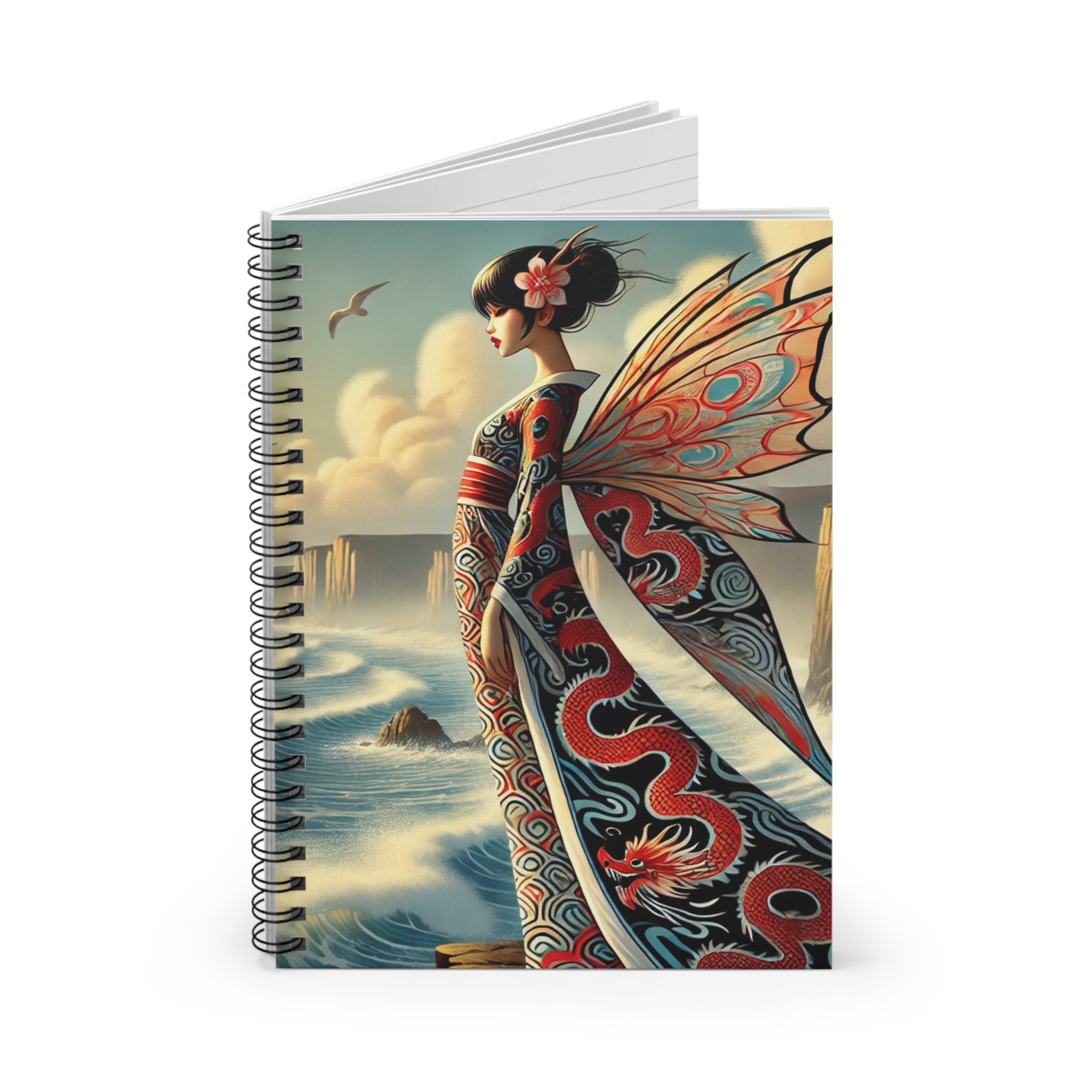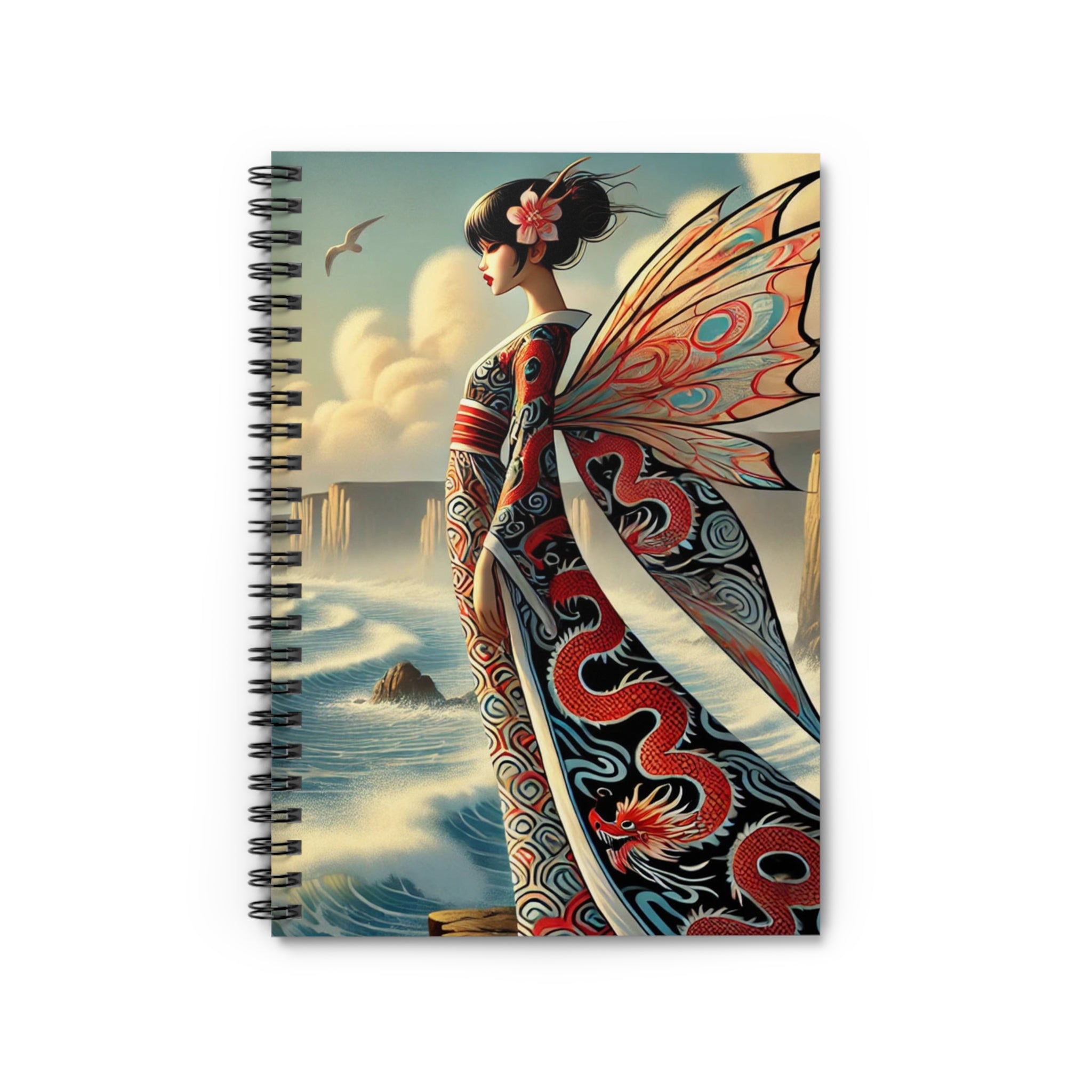 Perched on windswept cliffs, this ruled spiral notebook feels like a quiet coastal reverie. The cover art shows a serene fairy in a flowing kimono, its red dragon embroidery contrasting with the soft sea-and-sky palette of her translucent wings. Seabirds drift through warm golden light as waves pulse below — an image that invites slow thought, brave reflection, and lyrical journaling. The 6" x 8" size slips into bags easily and the metal spiral lays flat when you write, so each page becomes a small seascape for sketches, lists, or long-form notes. Keep it by your window, take it to the shoreline, or tuck it into your day when you need a moment of composed strength and sea-salt calm.