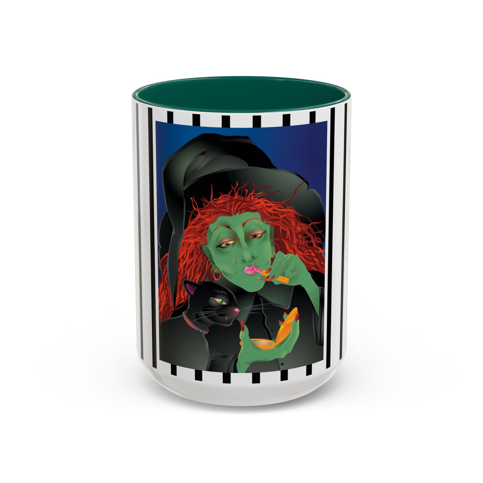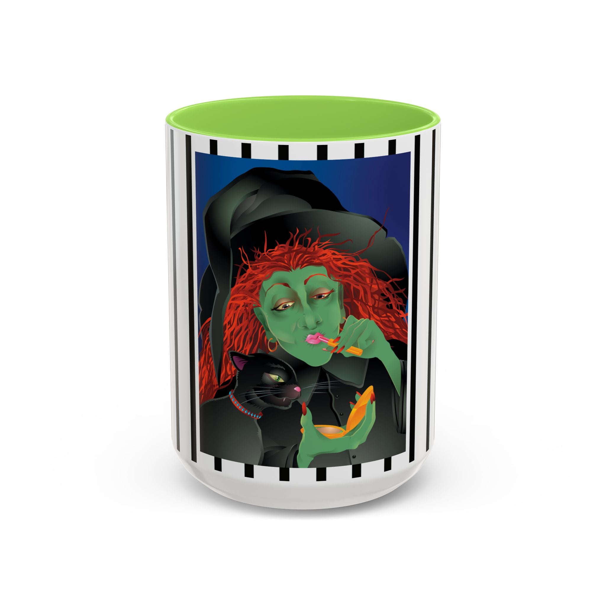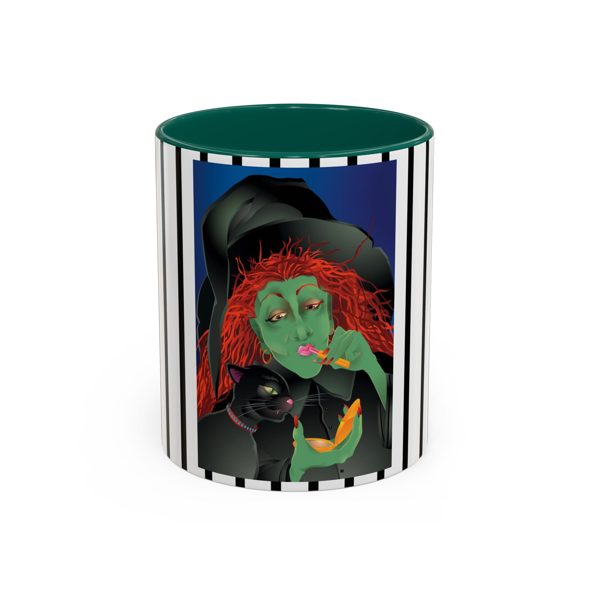 Artwork created, designed and digitally remastered by Sarasvati Designs. This captivating Halloween artwork features a striking green witch with brilliant red hair, adorned with gold hoop earrings. She's caught in a moment of vanity as she applies pink lipstick while gazing into a compact mirror held delicately in her hand. Her ensemble includes a classic black hat and matching outfit, exuding both mystery and charm. Beside her, a curious black cat sits attentively, peering into the mirror as if enchanted by the witch's reflection. The scene blends playful elegance with a touch of Halloween magic, creating a delightful and whimsical image.