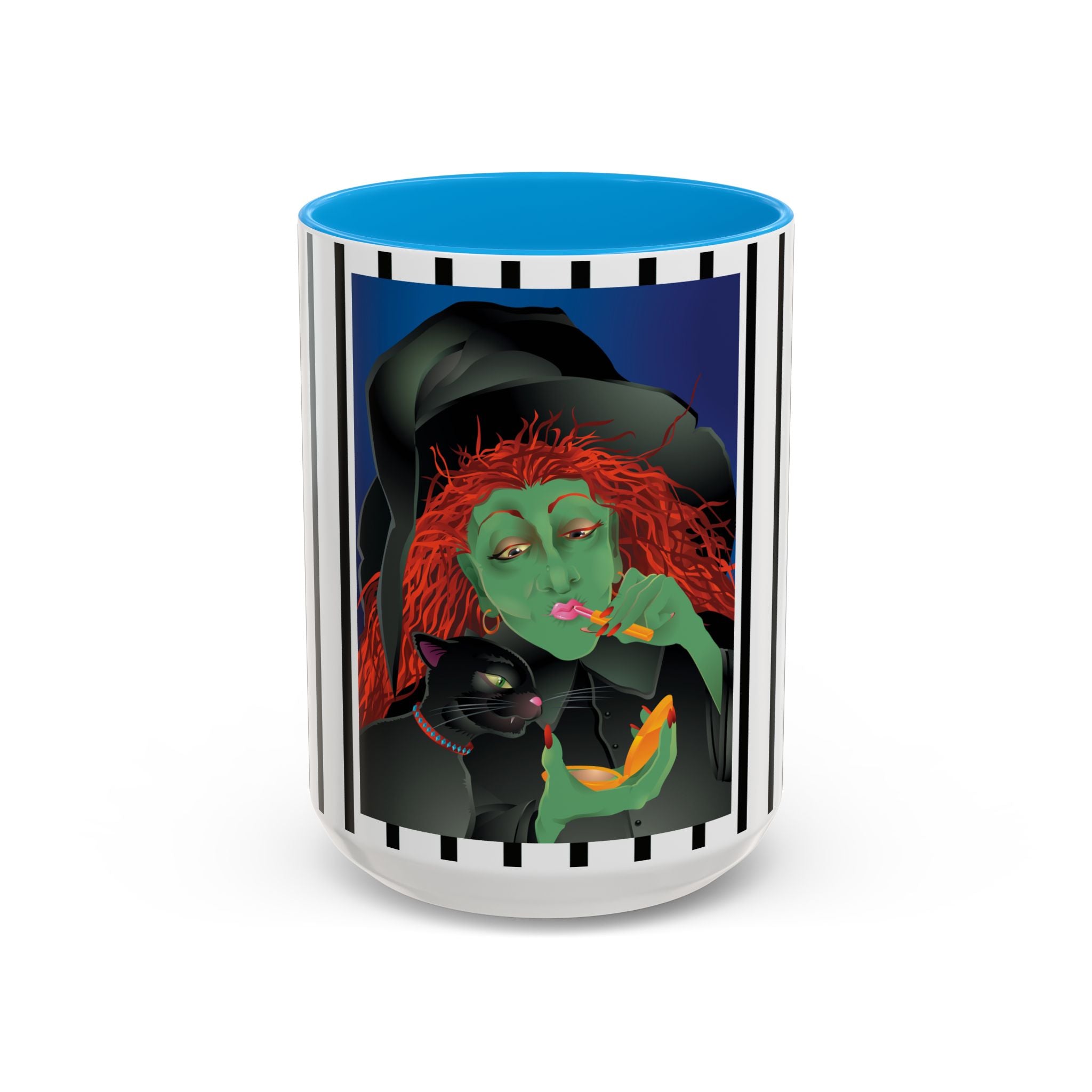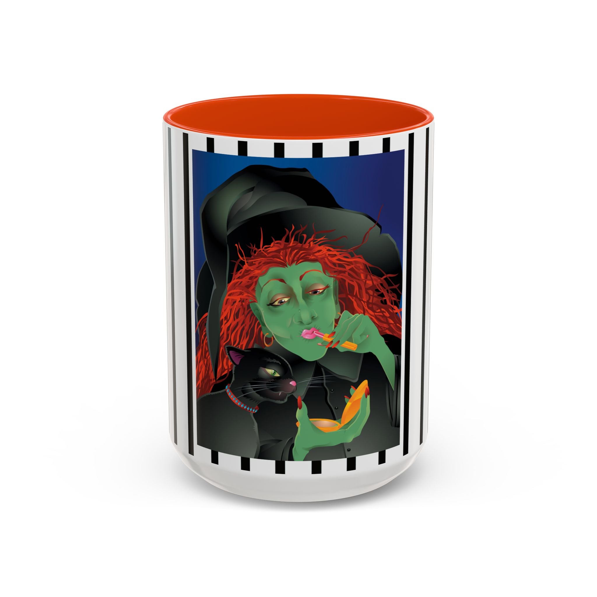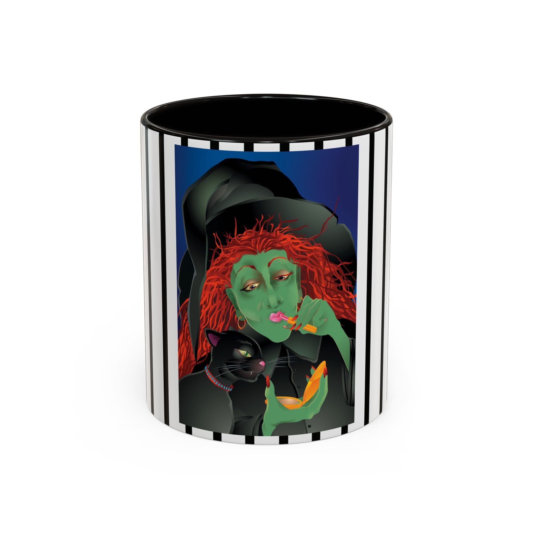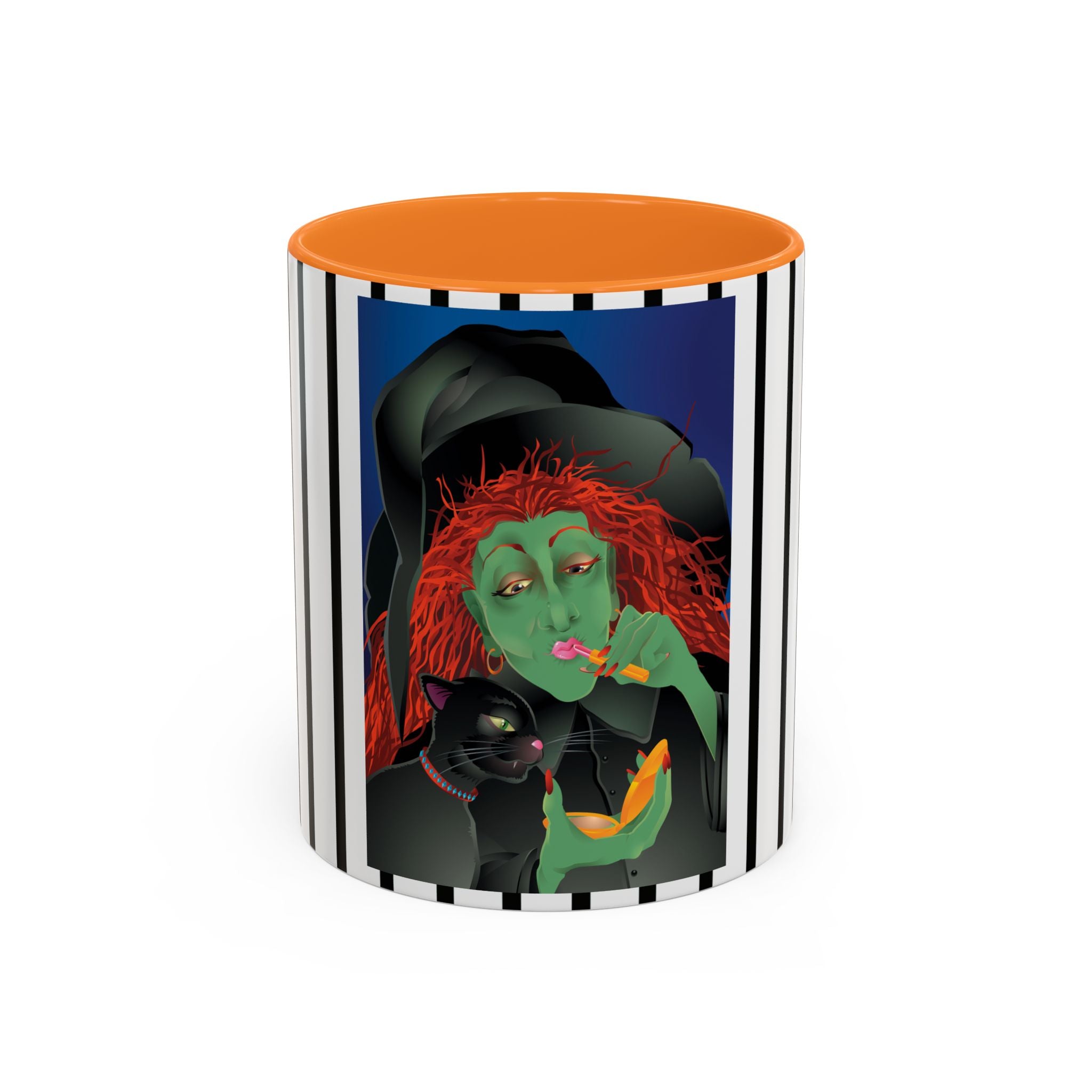Artwork created, designed and digitally remastered by Sarasvati Designs. This captivating Halloween artwork features a striking green witch with brilliant red hair, adorned with gold hoop earrings. She's caught in a moment of vanity as she applies pink lipstick while gazing into a compact mirror held delicately in her hand. Her ensemble includes a classic black hat and matching outfit, exuding both mystery and charm. Beside her, a curious black cat sits attentively, peering into the mirror as if enchanted by the witch's reflection. The scene blends playful elegance with a touch of Halloween magic, creating a delightful and whimsical image.