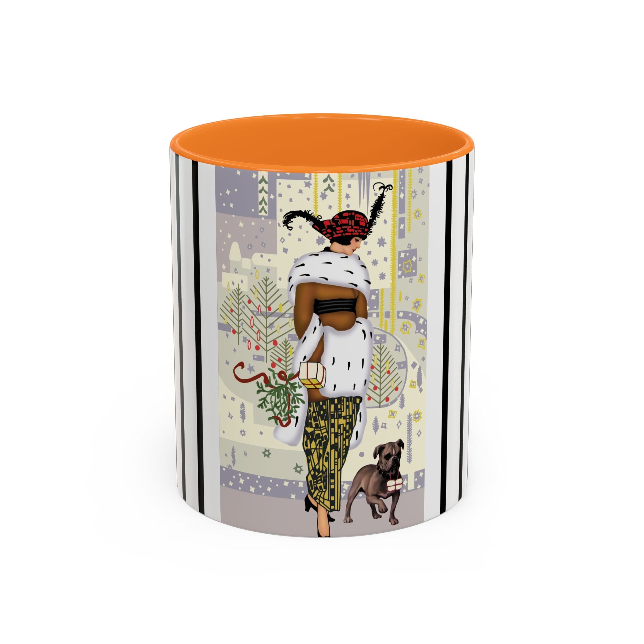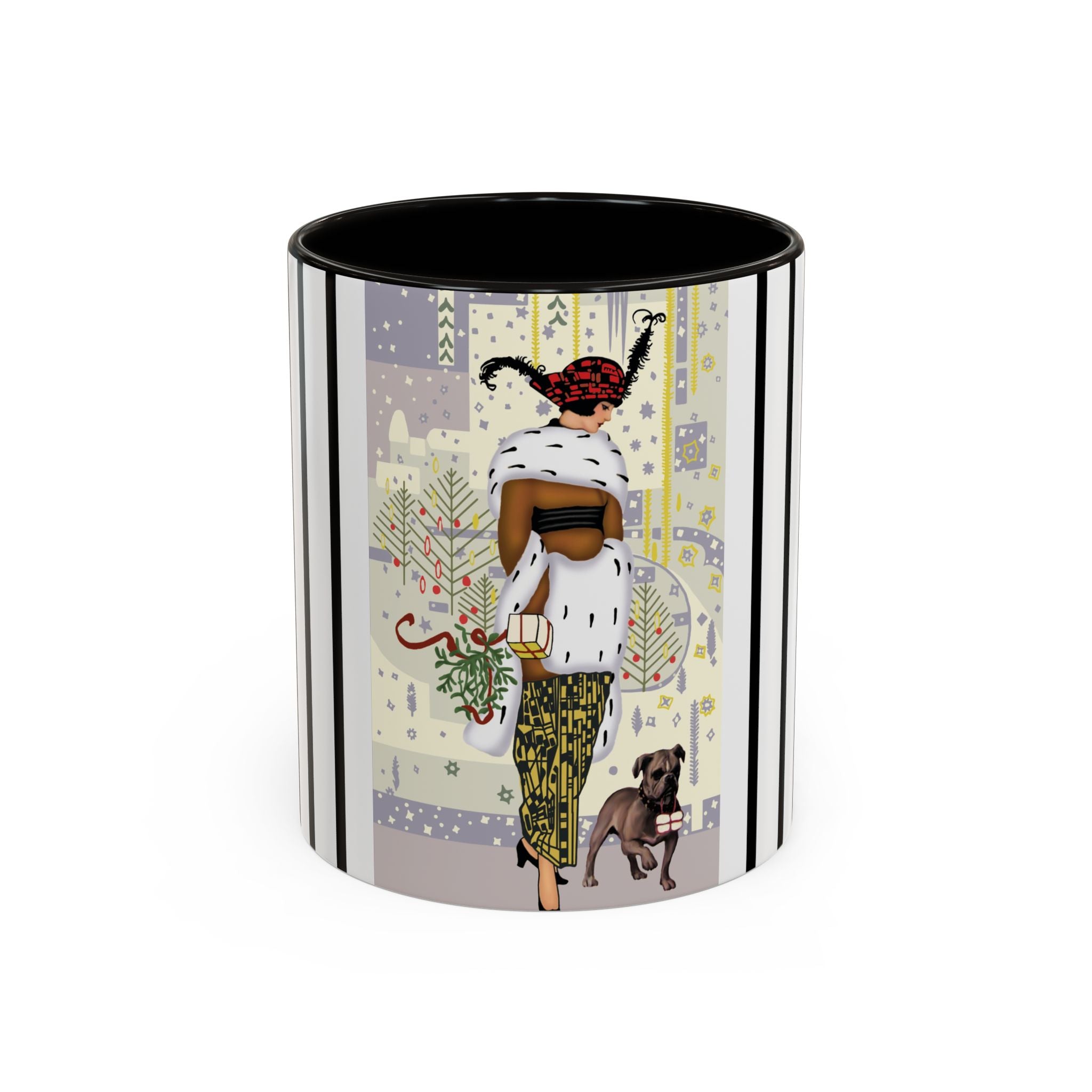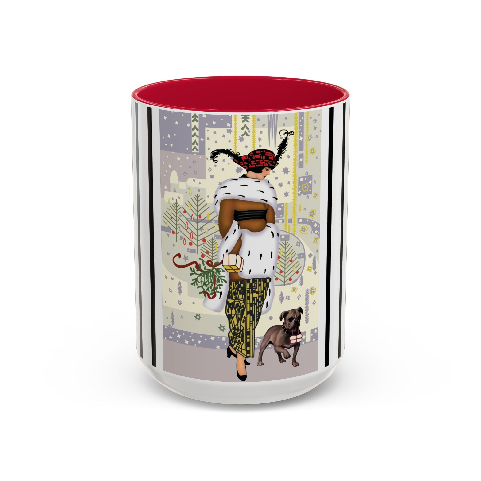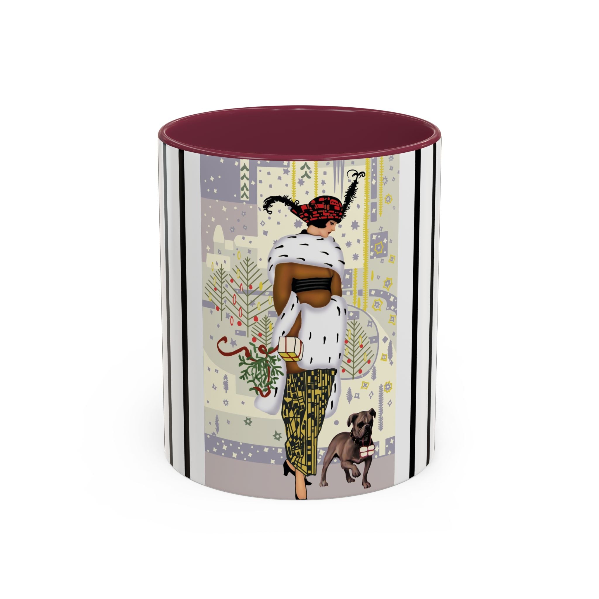 The artwork brings festive glamour to life. A chic woman draped in a white fur stole and a golden patterned skirt strolls gracefully, her red headscarf adorned with black plumes. In one hand, she carries mistletoe and a neatly wrapped present, embodying timeless holiday elegance. At her side, a loyal bulldog trots proudly, with tiny gifts tied to its collar, adding warmth and playful charm.