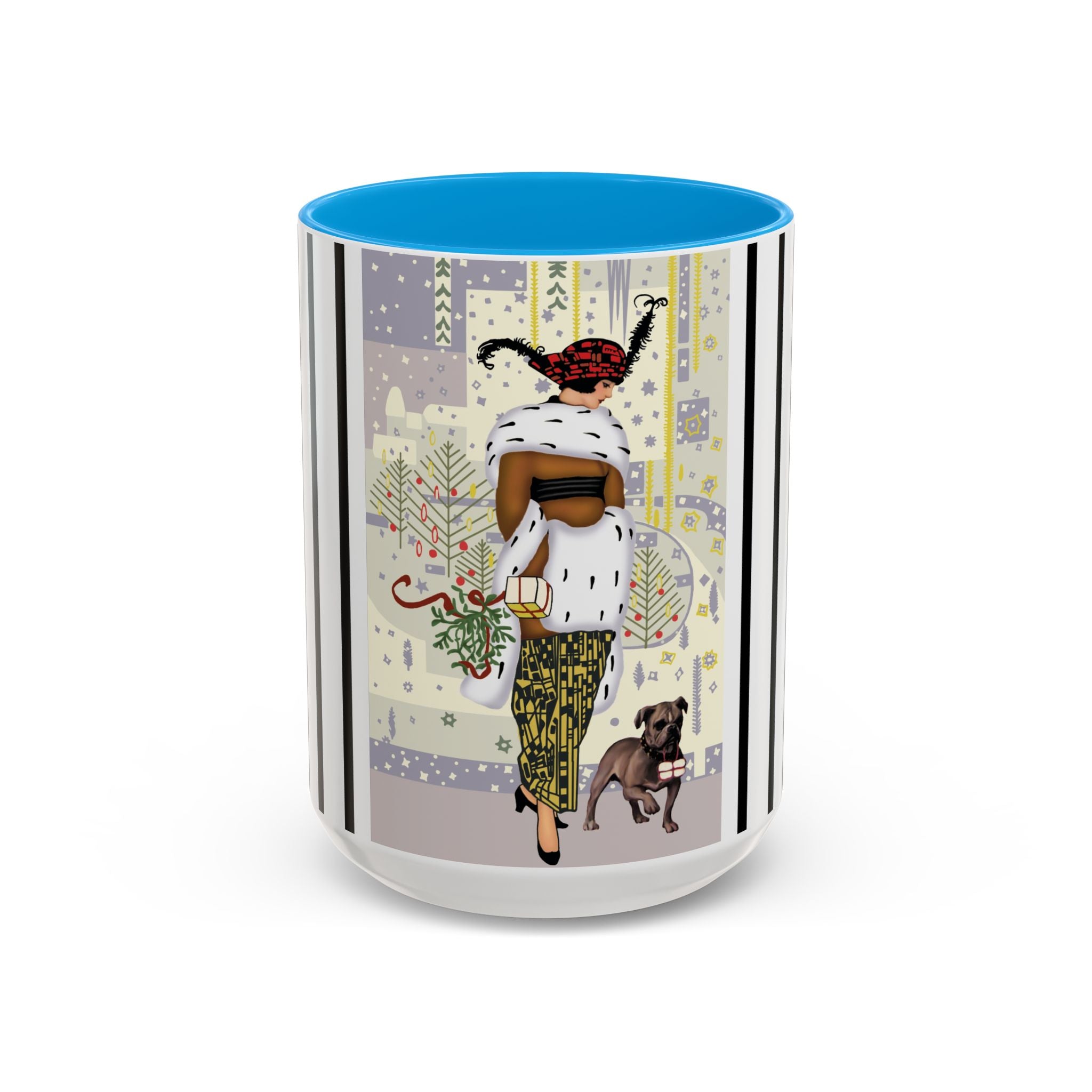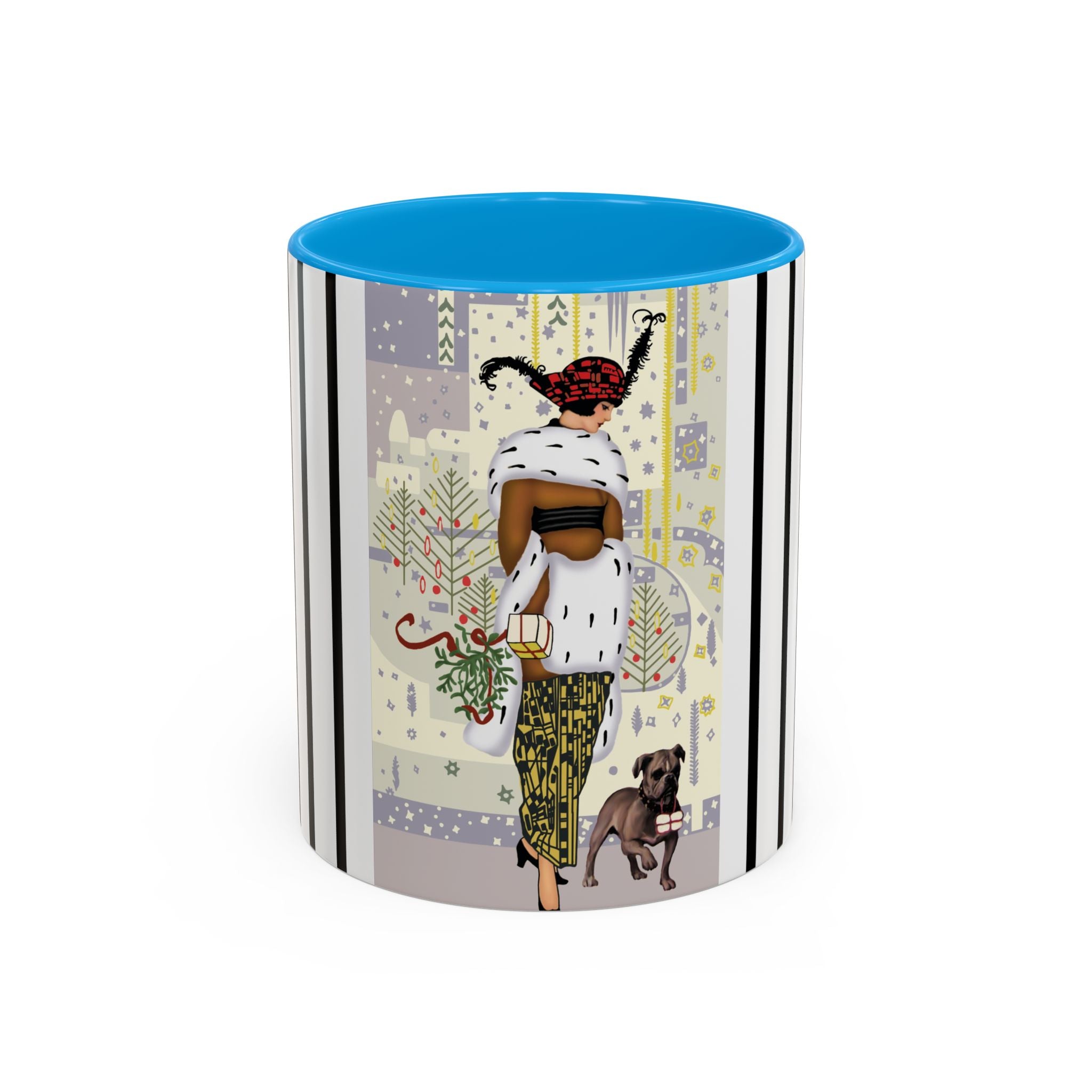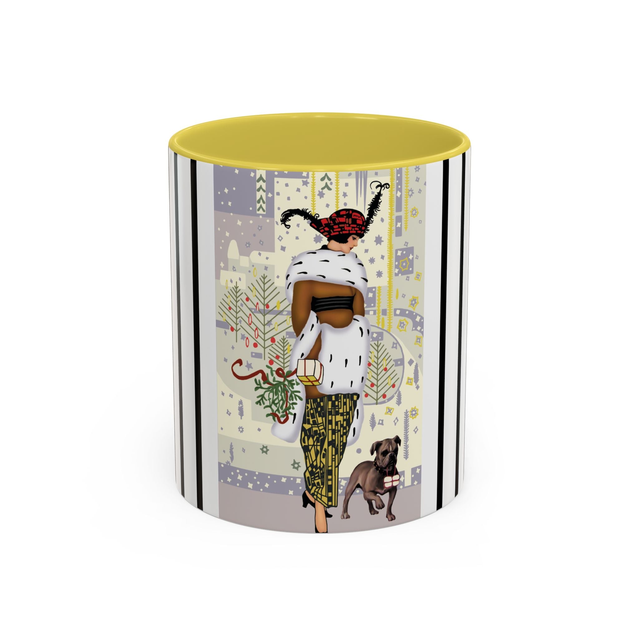 The artwork brings festive glamour to life. A chic woman draped in a white fur stole and a golden patterned skirt strolls gracefully, her red headscarf adorned with black plumes. In one hand, she carries mistletoe and a neatly wrapped present, embodying timeless holiday elegance. At her side, a loyal bulldog trots proudly, with tiny gifts tied to its collar, adding warmth and playful charm.
