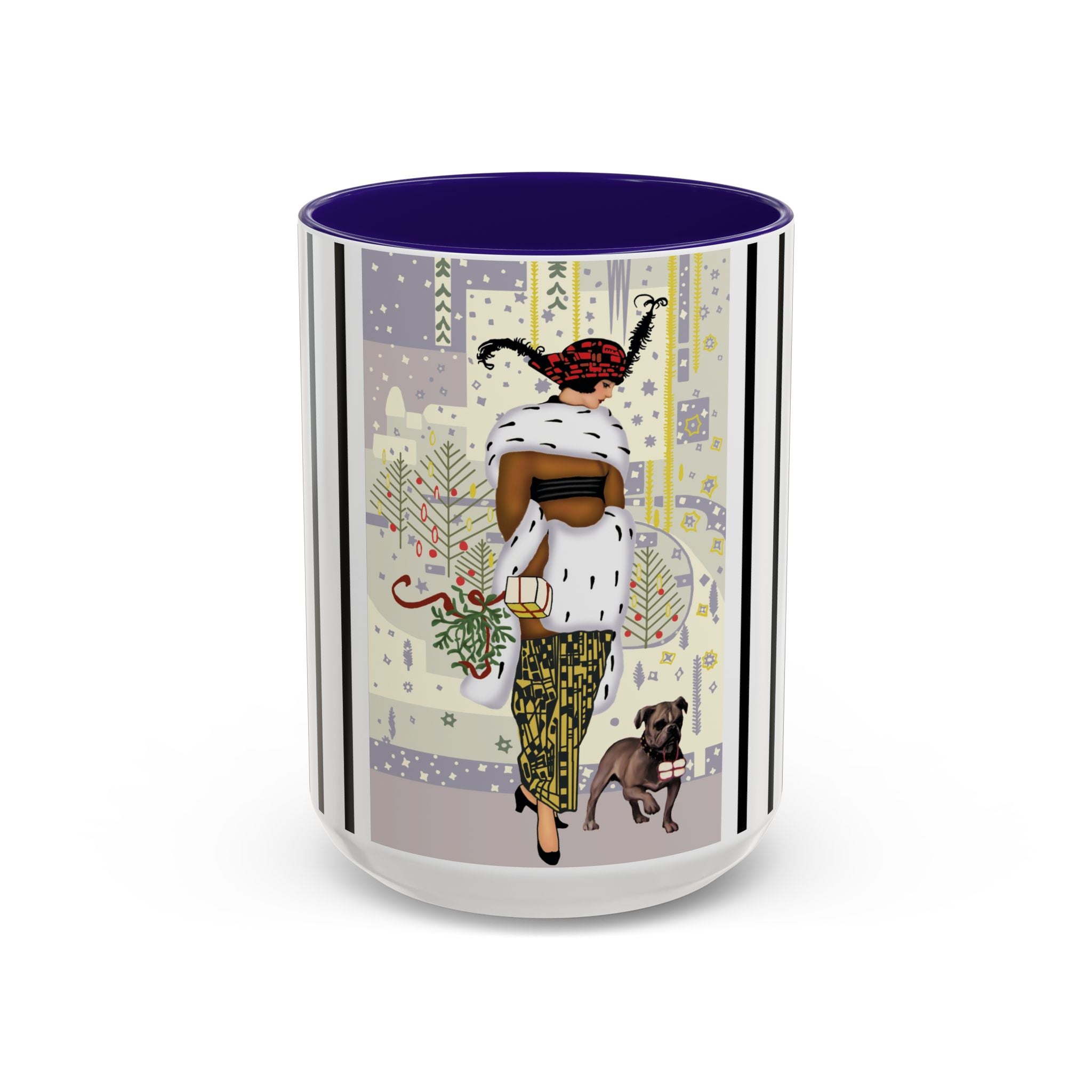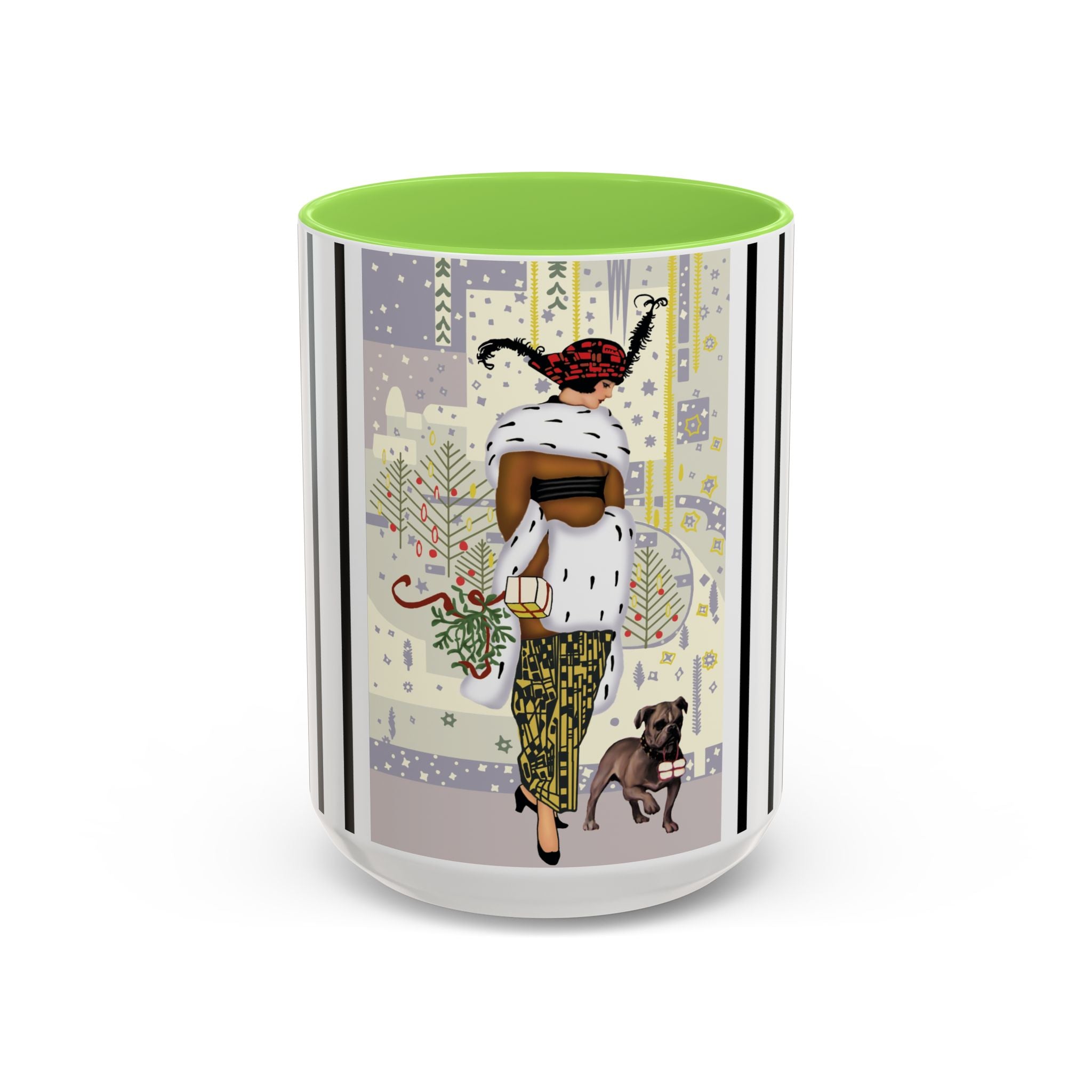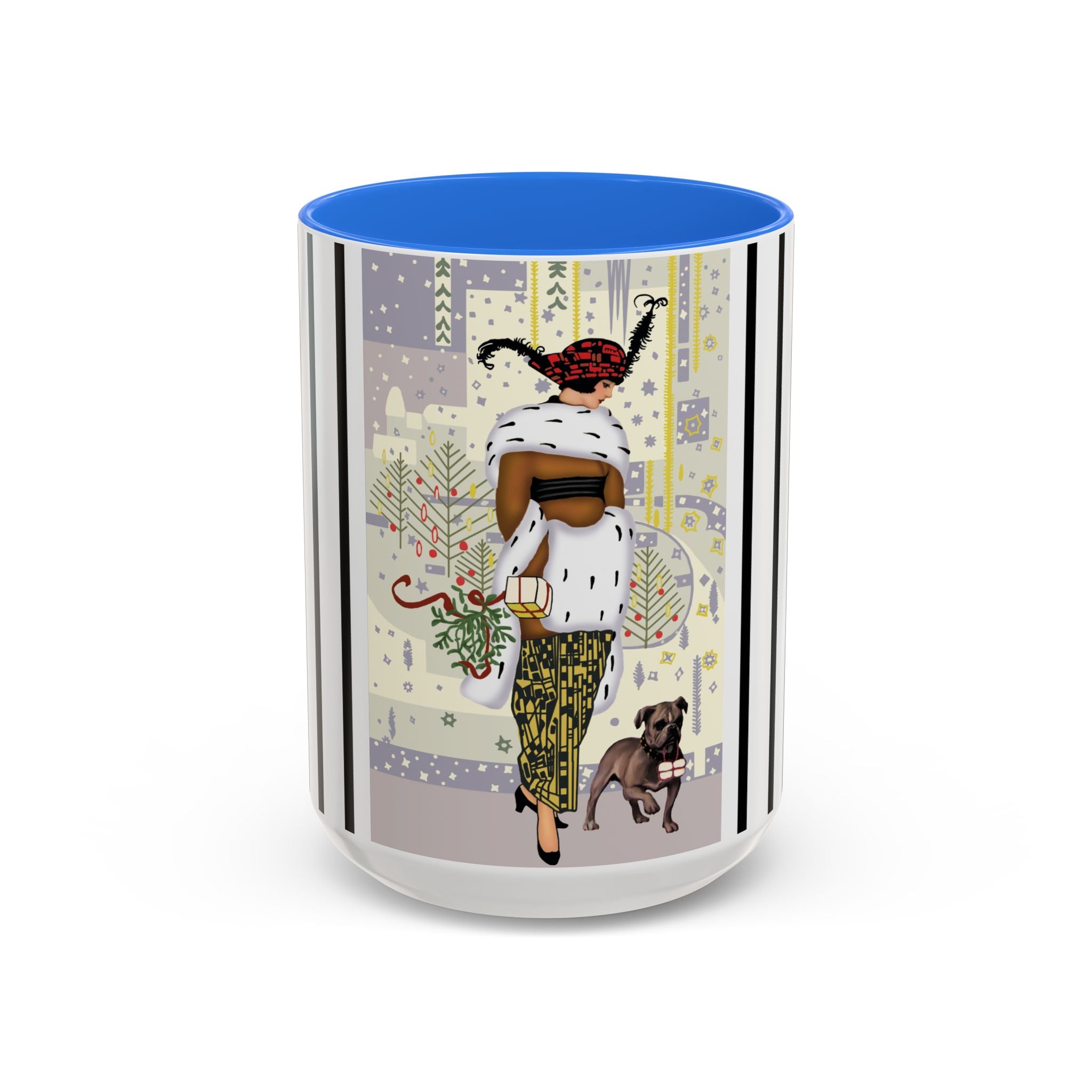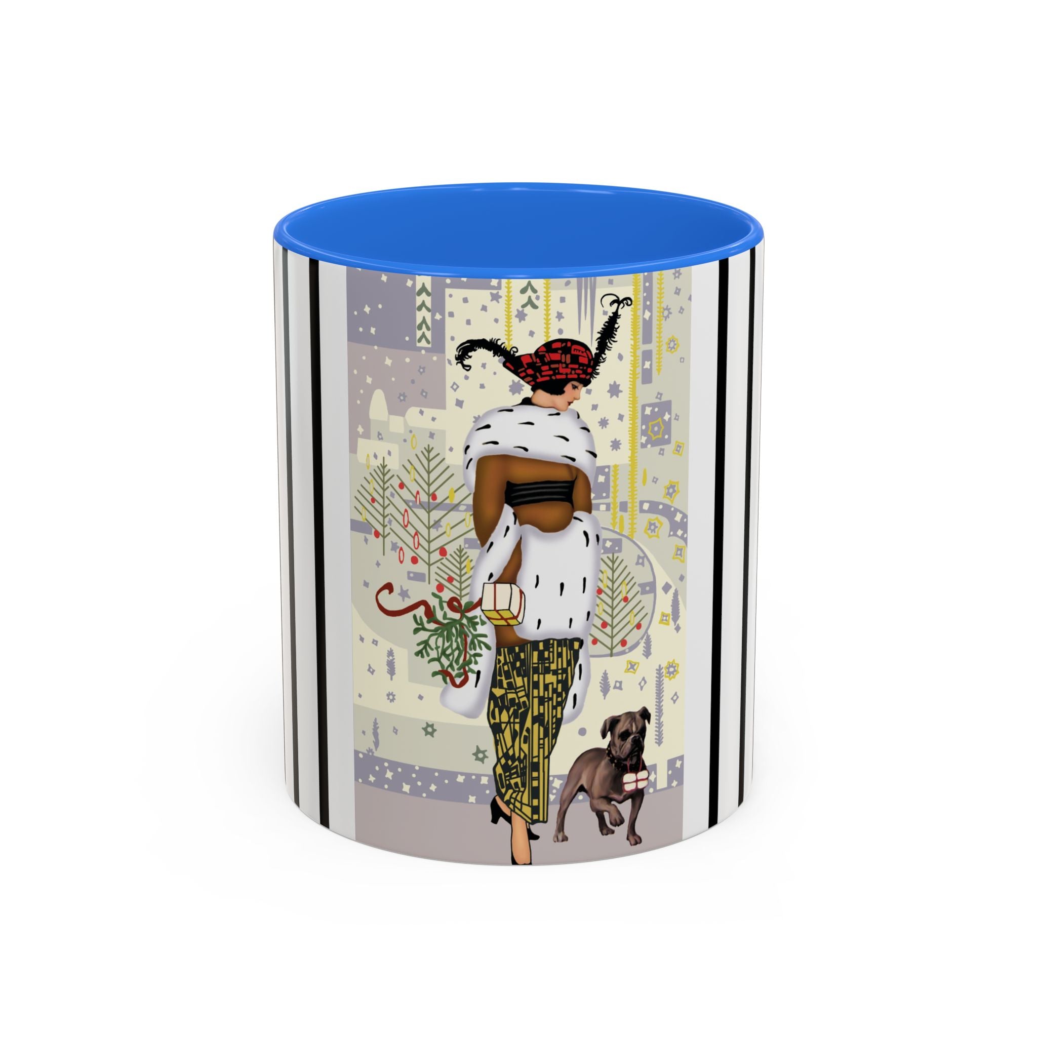 The artwork brings festive glamour to life. A chic woman draped in a white fur stole and a golden patterned skirt strolls gracefully, her red headscarf adorned with black plumes. In one hand, she carries mistletoe and a neatly wrapped present, embodying timeless holiday elegance. At her side, a loyal bulldog trots proudly, with tiny gifts tied to its collar, adding warmth and playful charm.