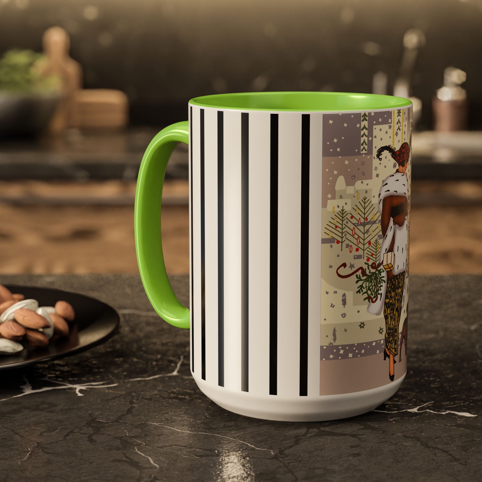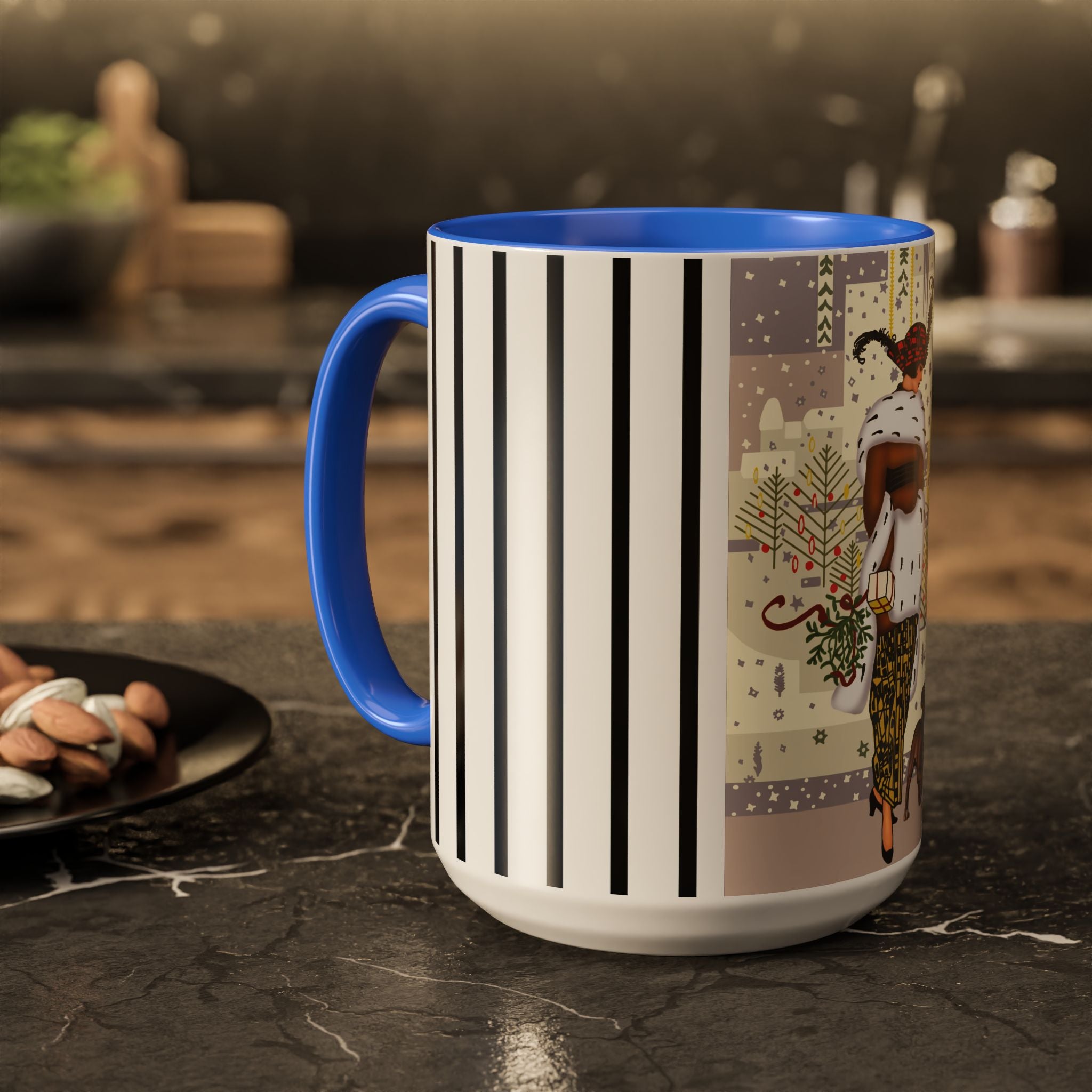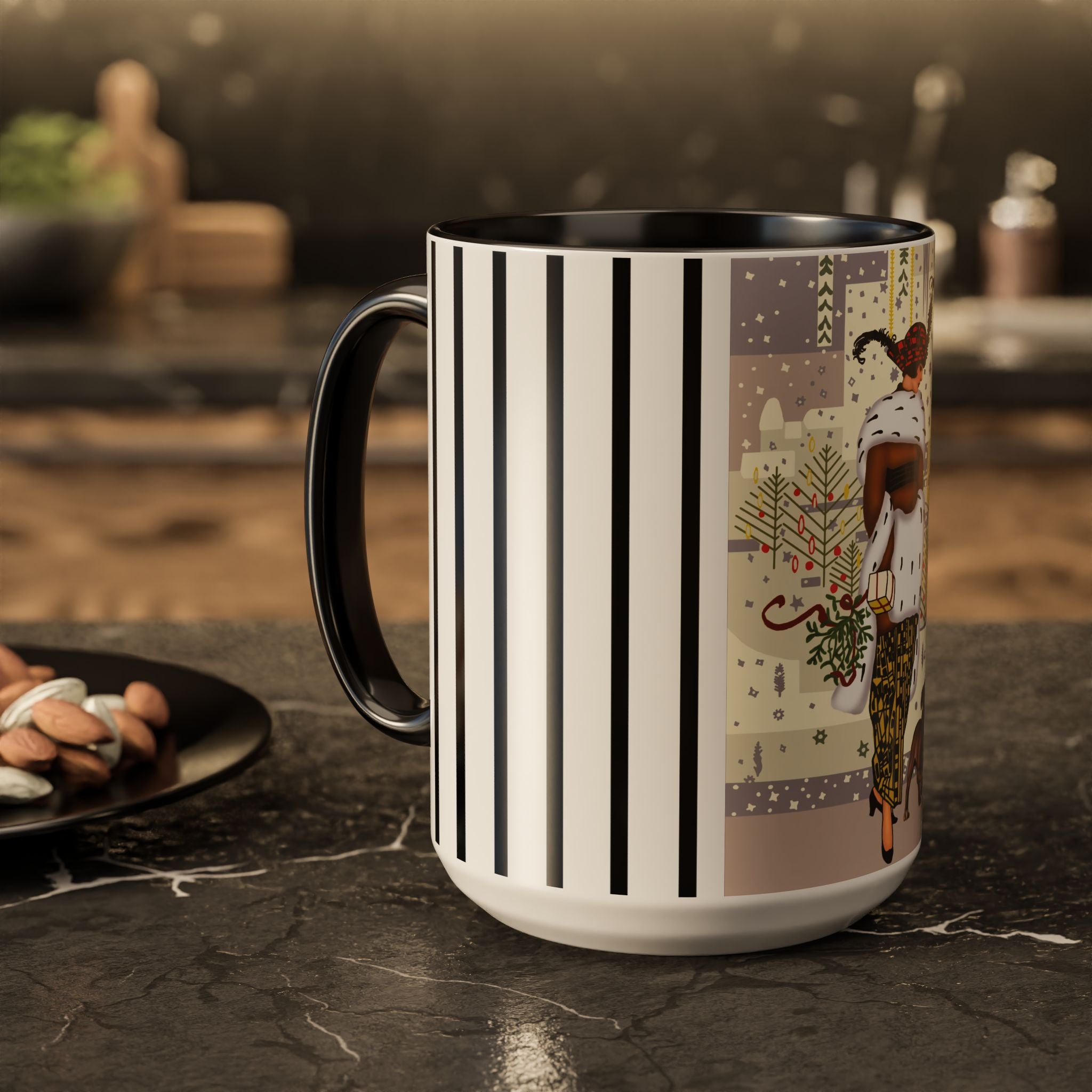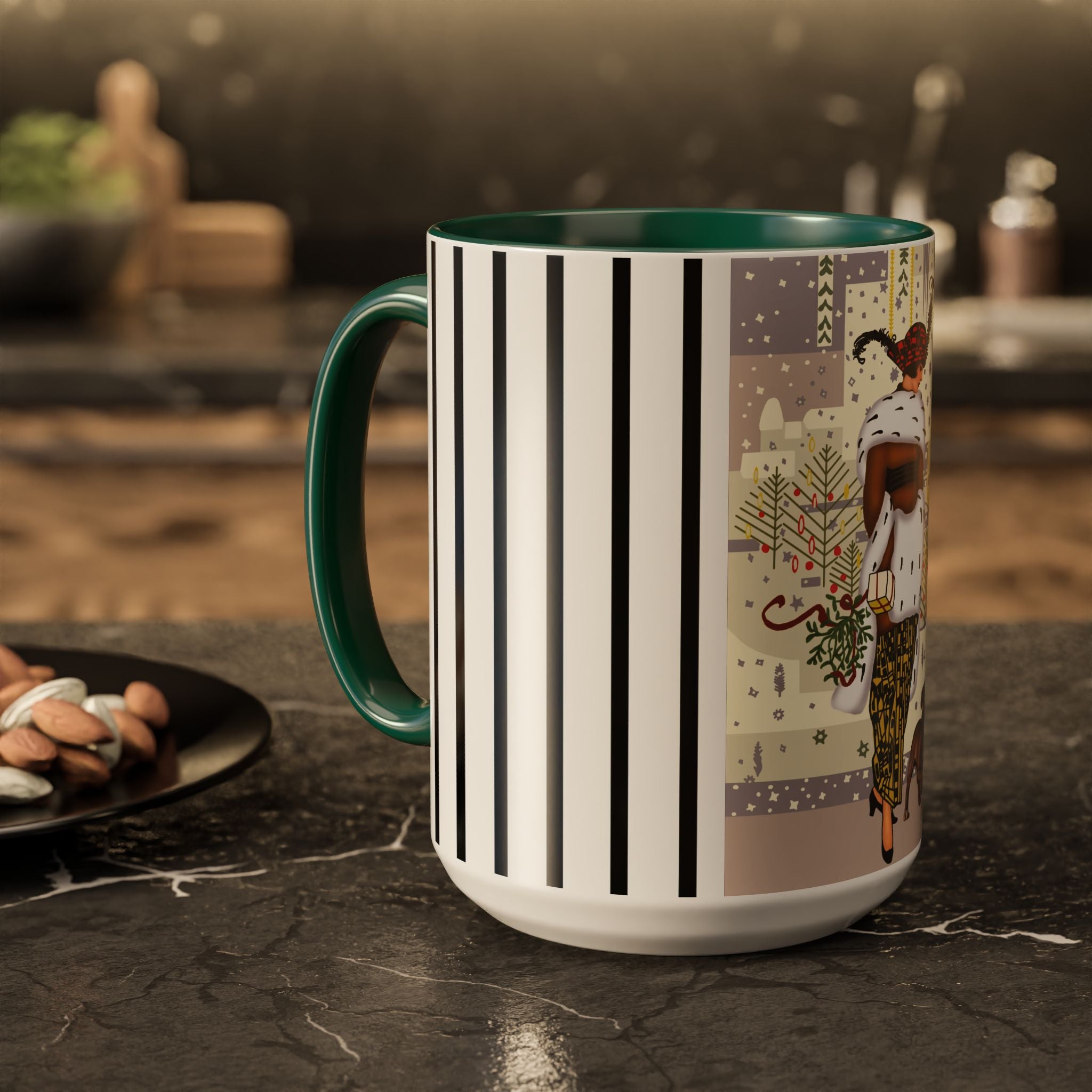 Behind them, a geometric winter backdrop of stylized trees, stars, and soft seasonal tones completes the design — a perfect balance of glamour, whimsy, and Christmas cheer, captured on a mug meant to brighten both everyday use and special holiday gatherings.