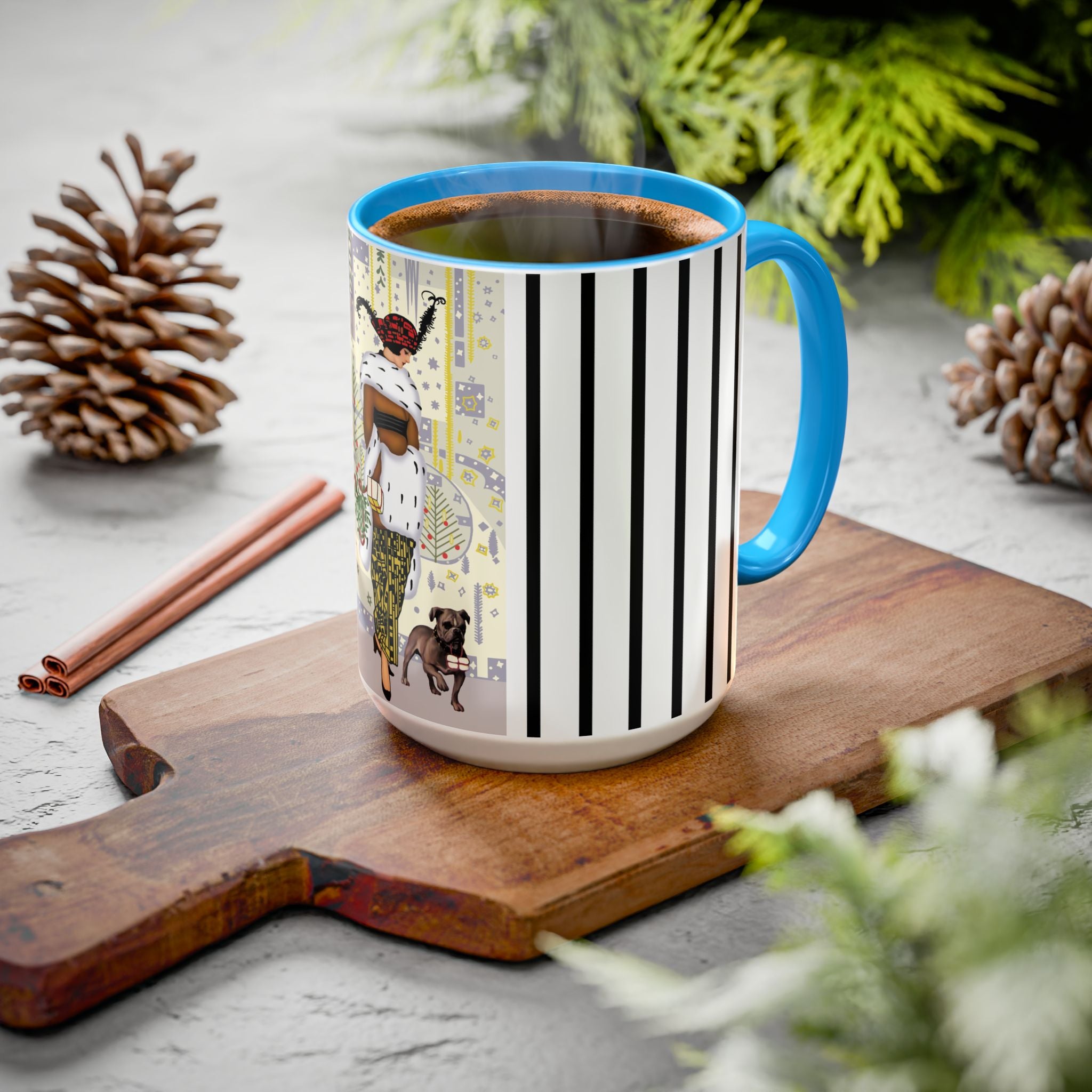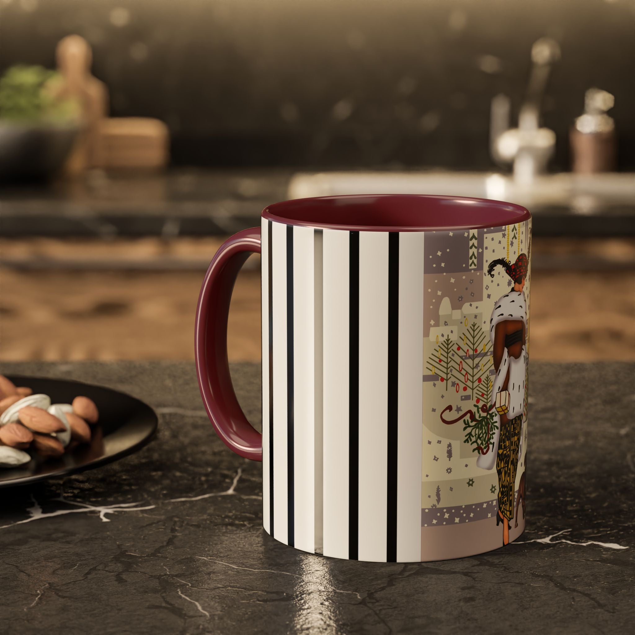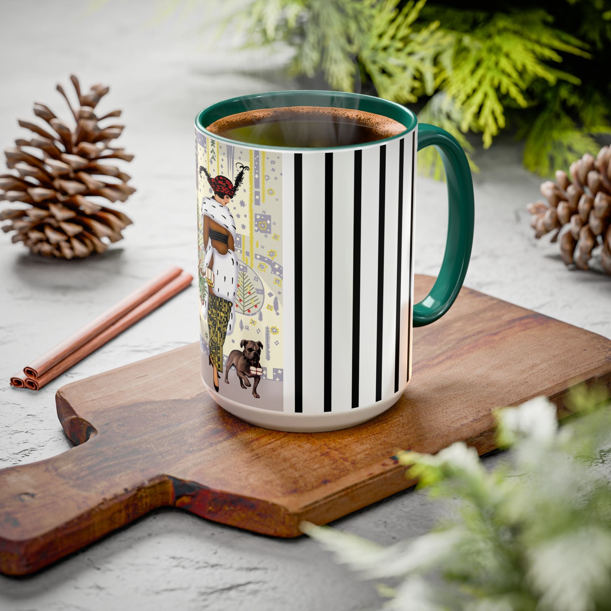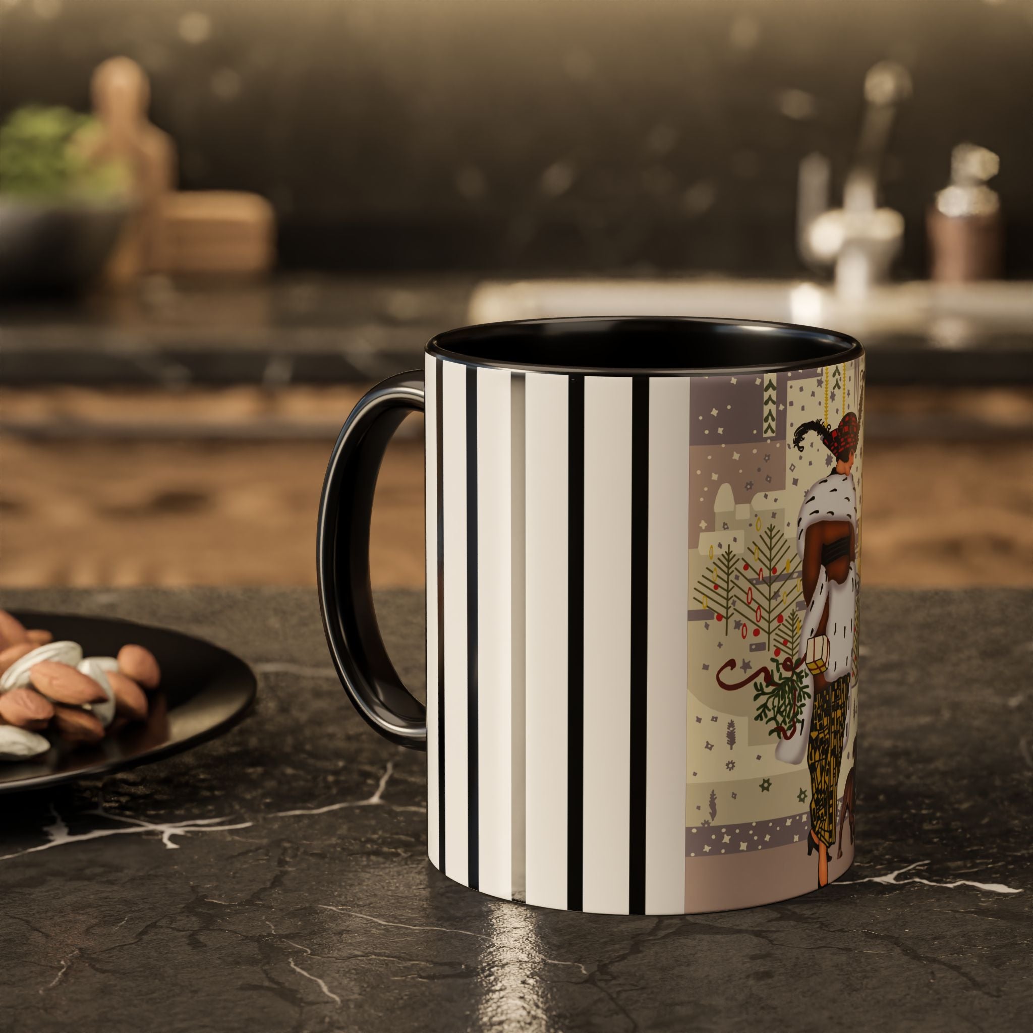 Behind them, a geometric winter backdrop of stylized trees, stars, and soft seasonal tones completes the design — a perfect balance of glamour, whimsy, and Christmas cheer, captured on a mug meant to brighten both everyday use and special holiday gatherings.