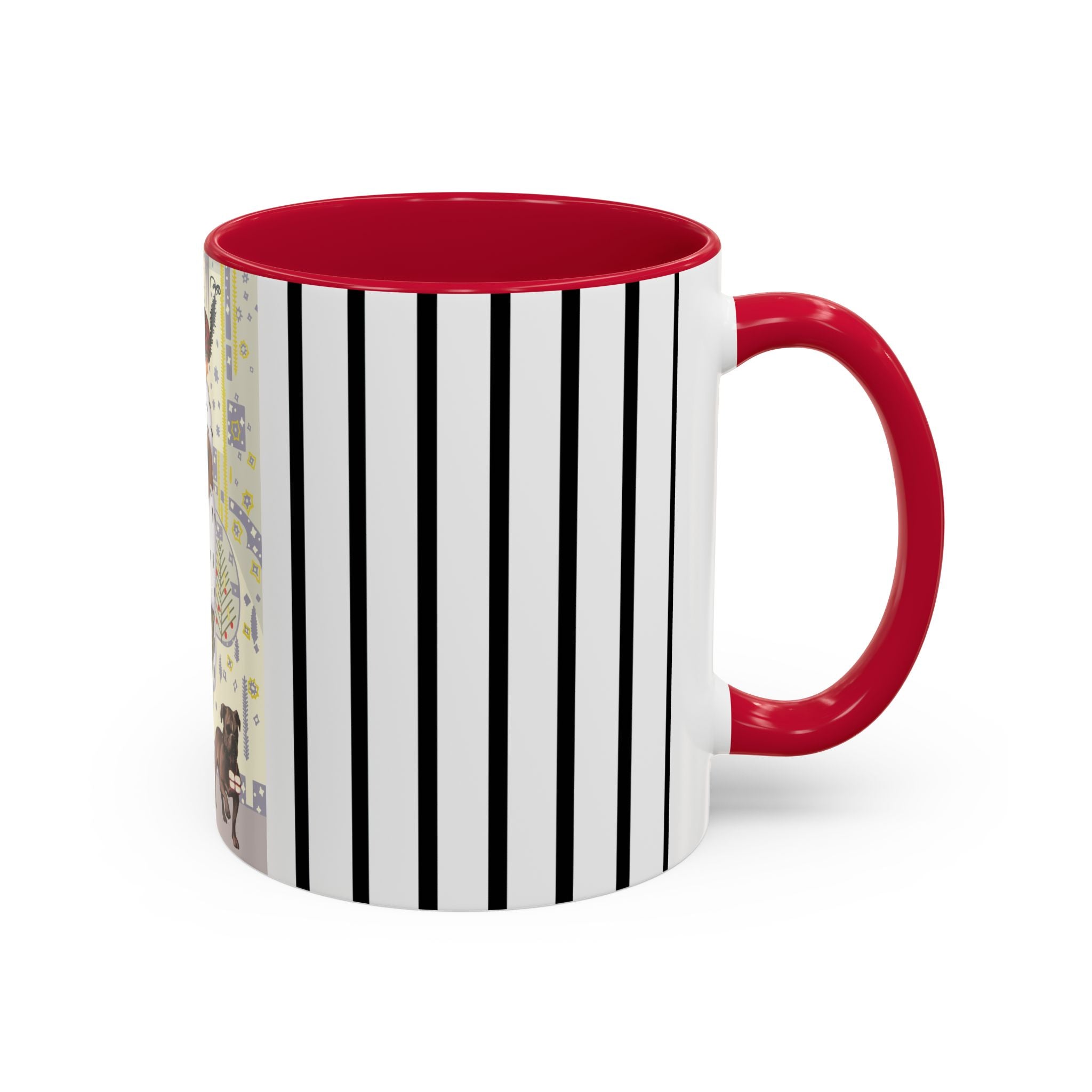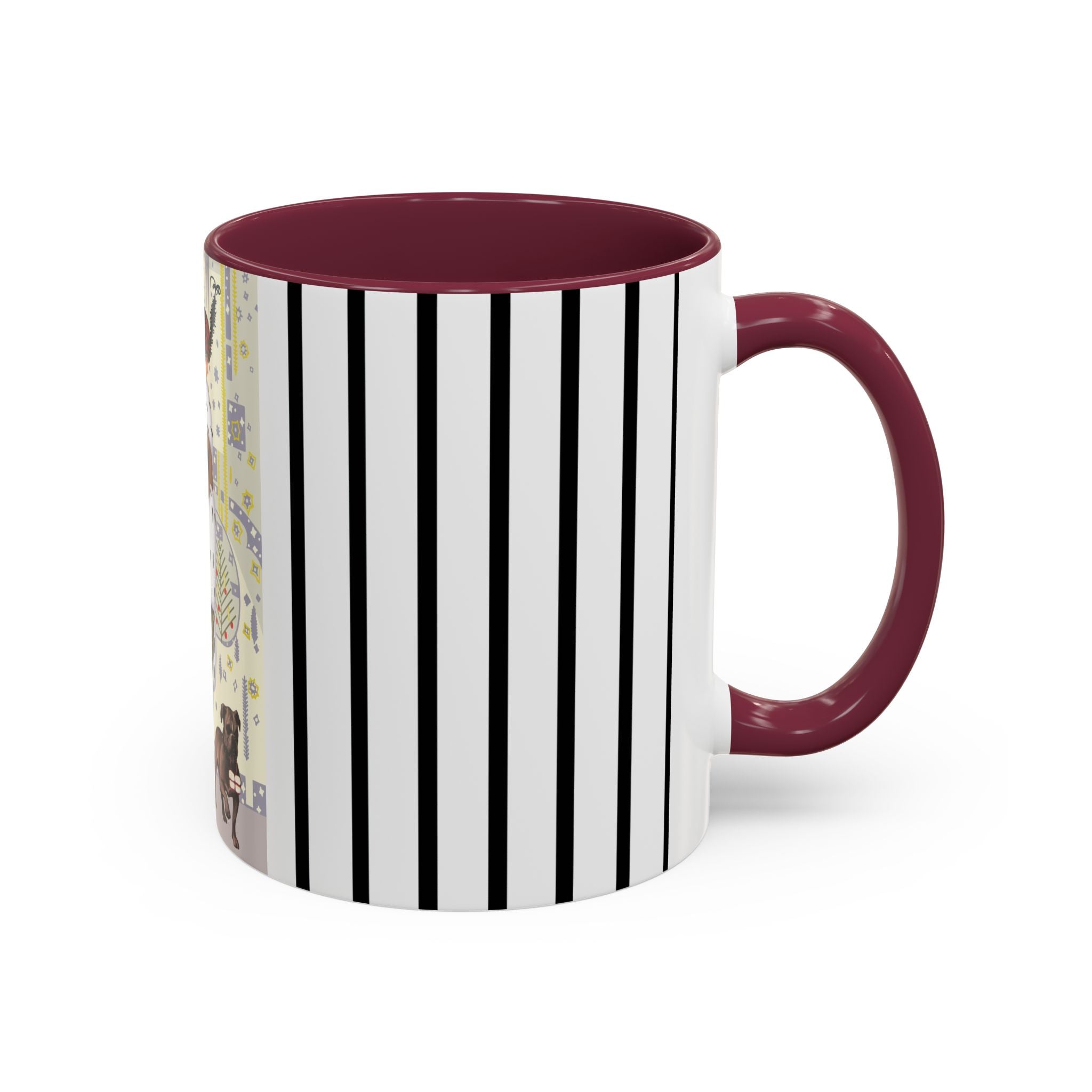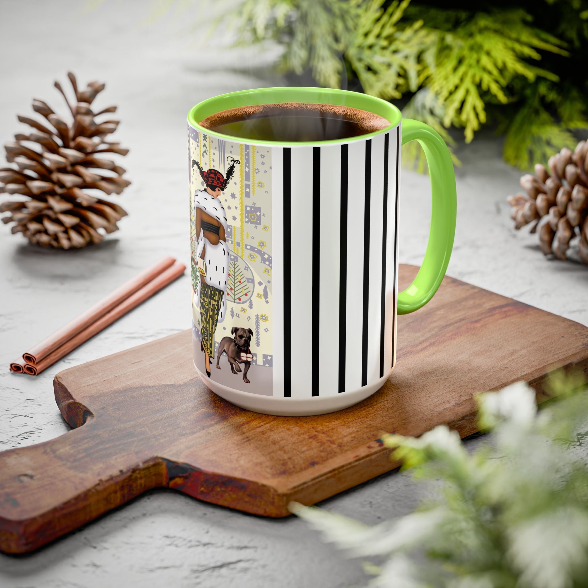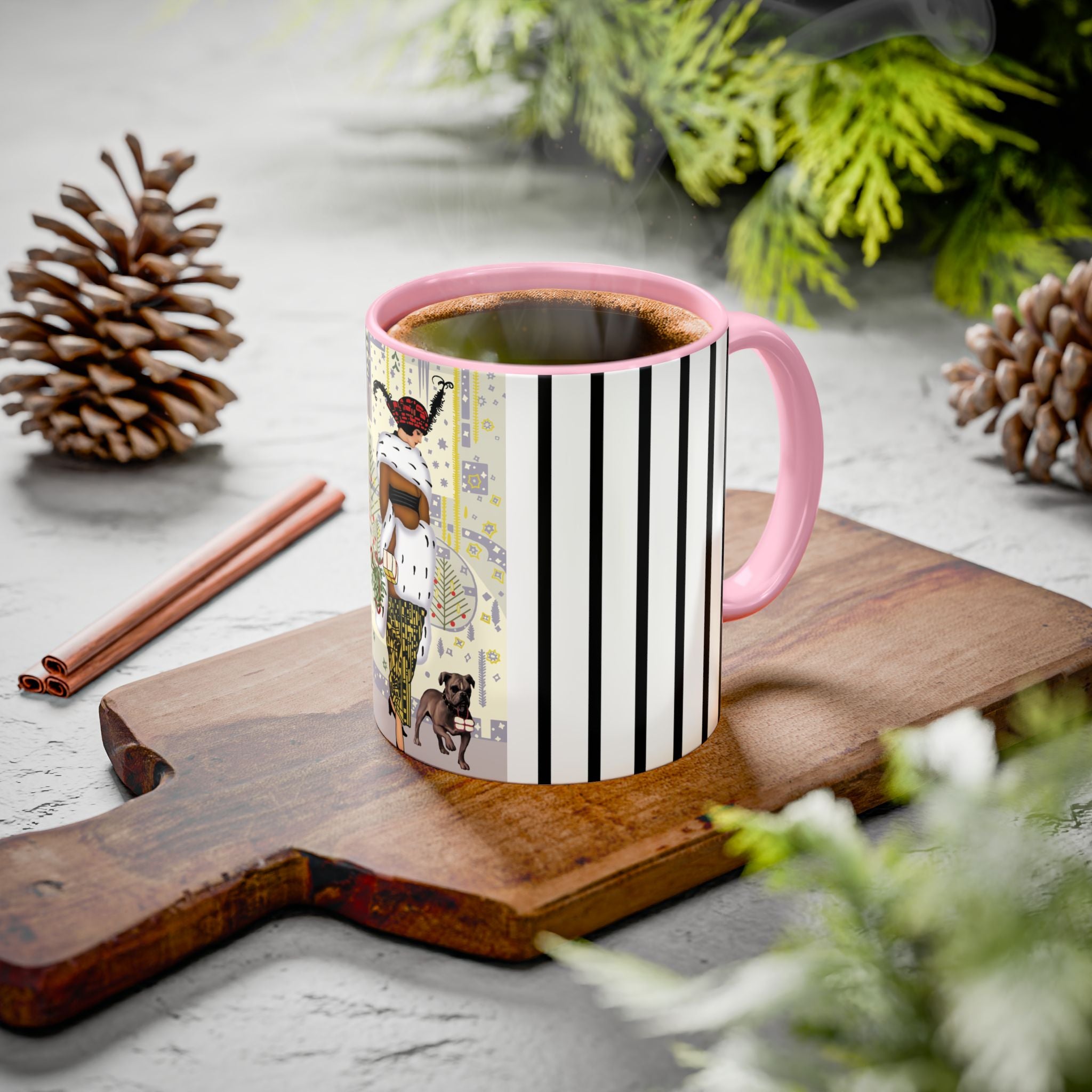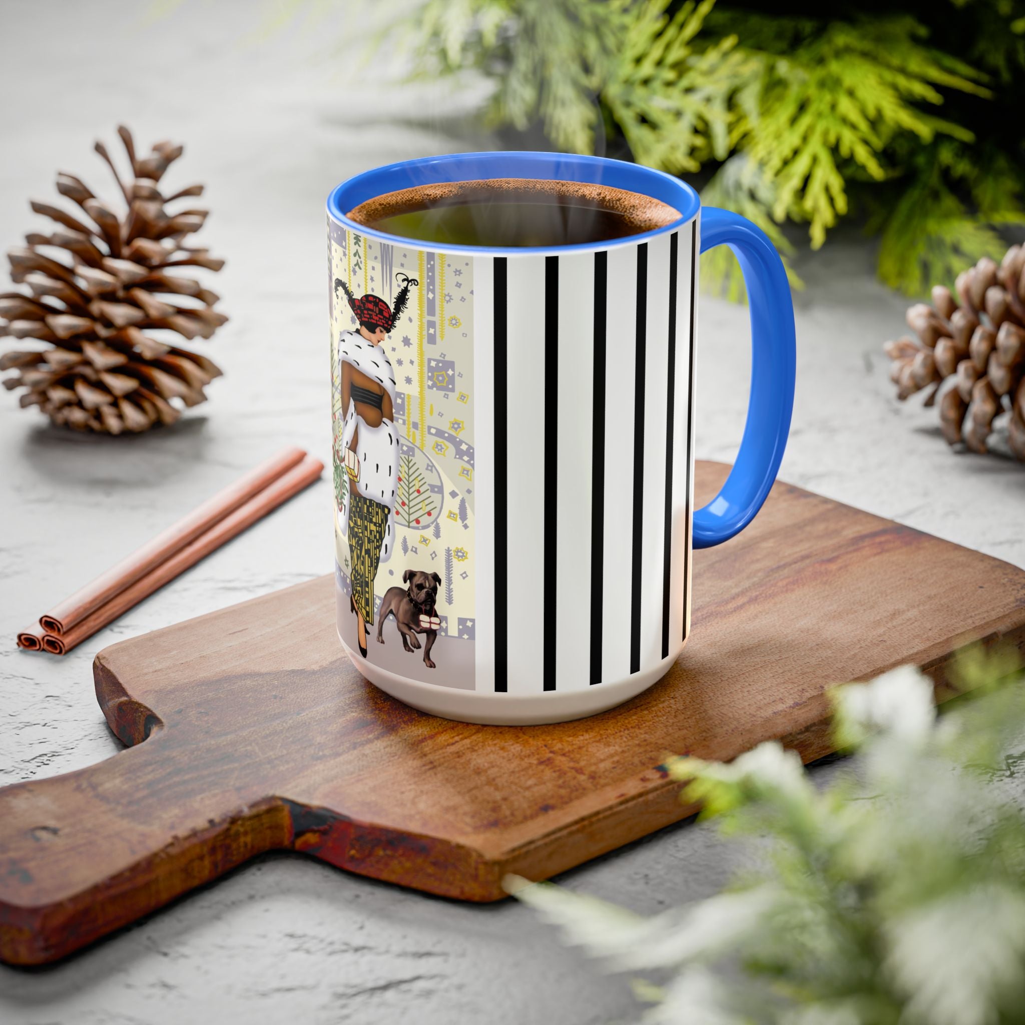 Behind them, a geometric winter backdrop of stylized trees, stars, and soft seasonal tones completes the design — a perfect balance of glamour, whimsy, and Christmas cheer, captured on a mug meant to brighten both everyday use and special holiday gatherings.