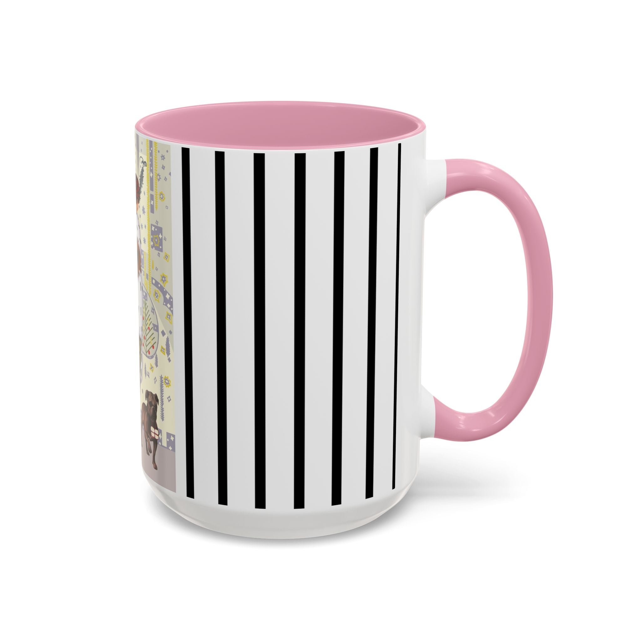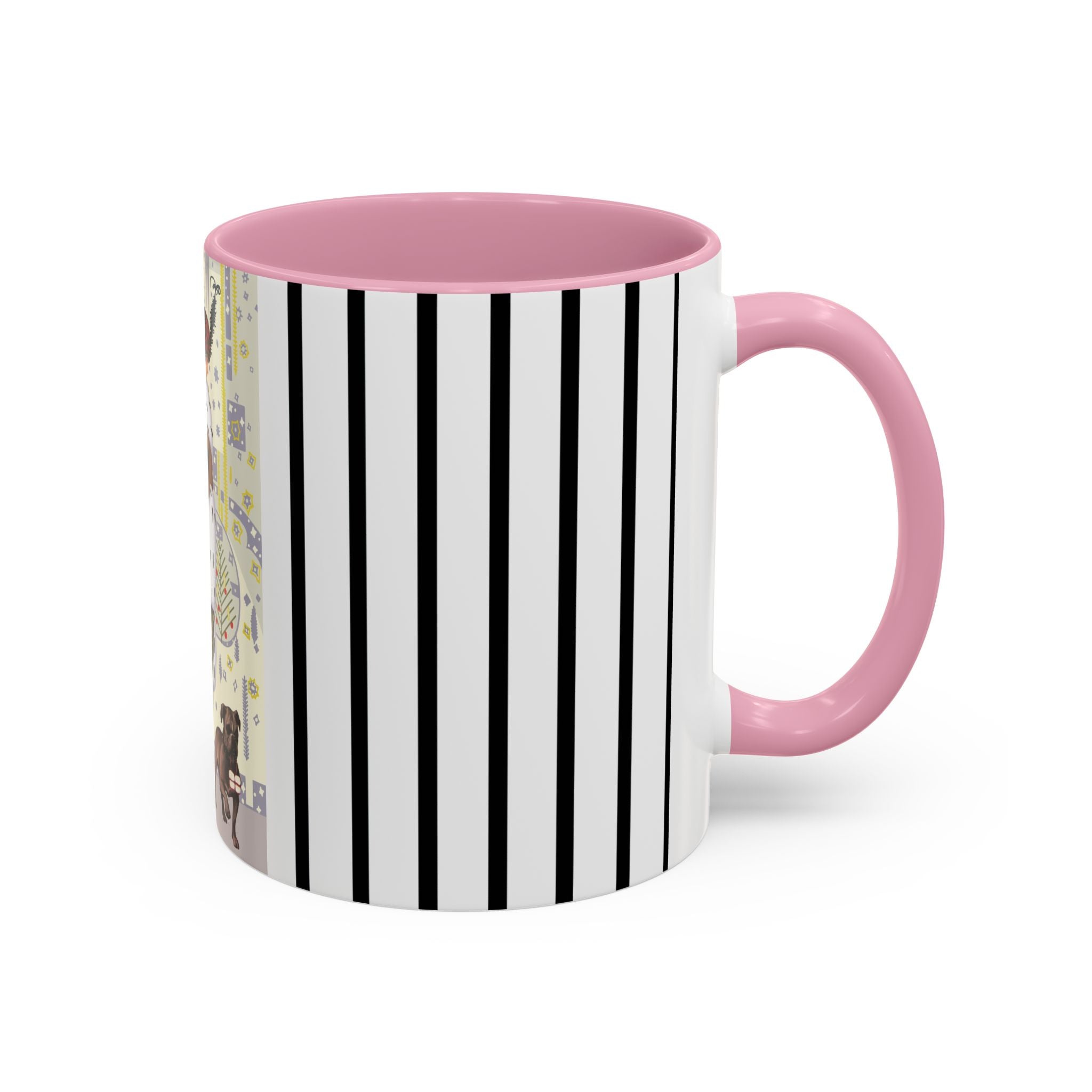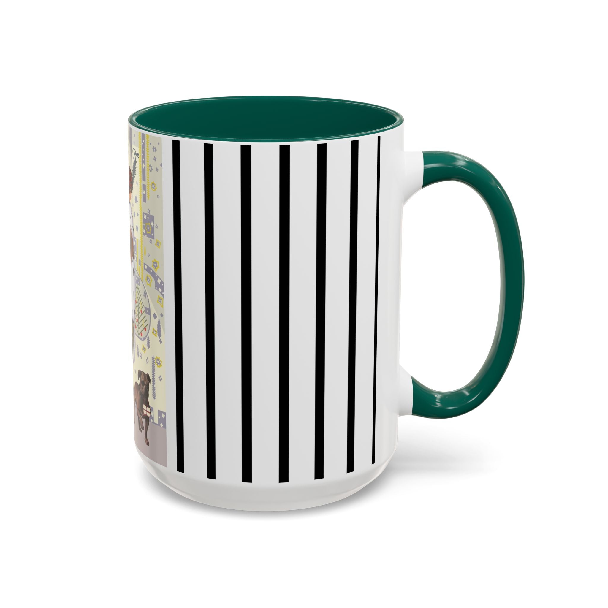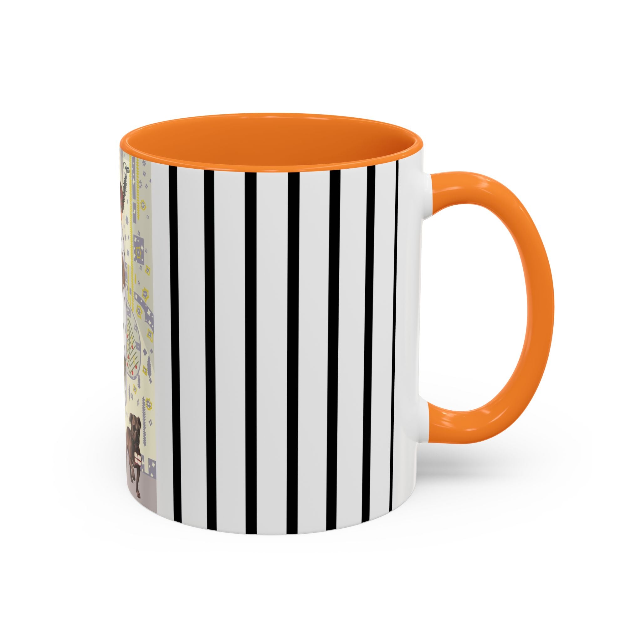Behind them, a geometric winter backdrop of stylized trees, stars, and soft seasonal tones completes the design — a perfect balance of glamour, whimsy, and Christmas cheer, captured on a mug meant to brighten both everyday use and special holiday gatherings.