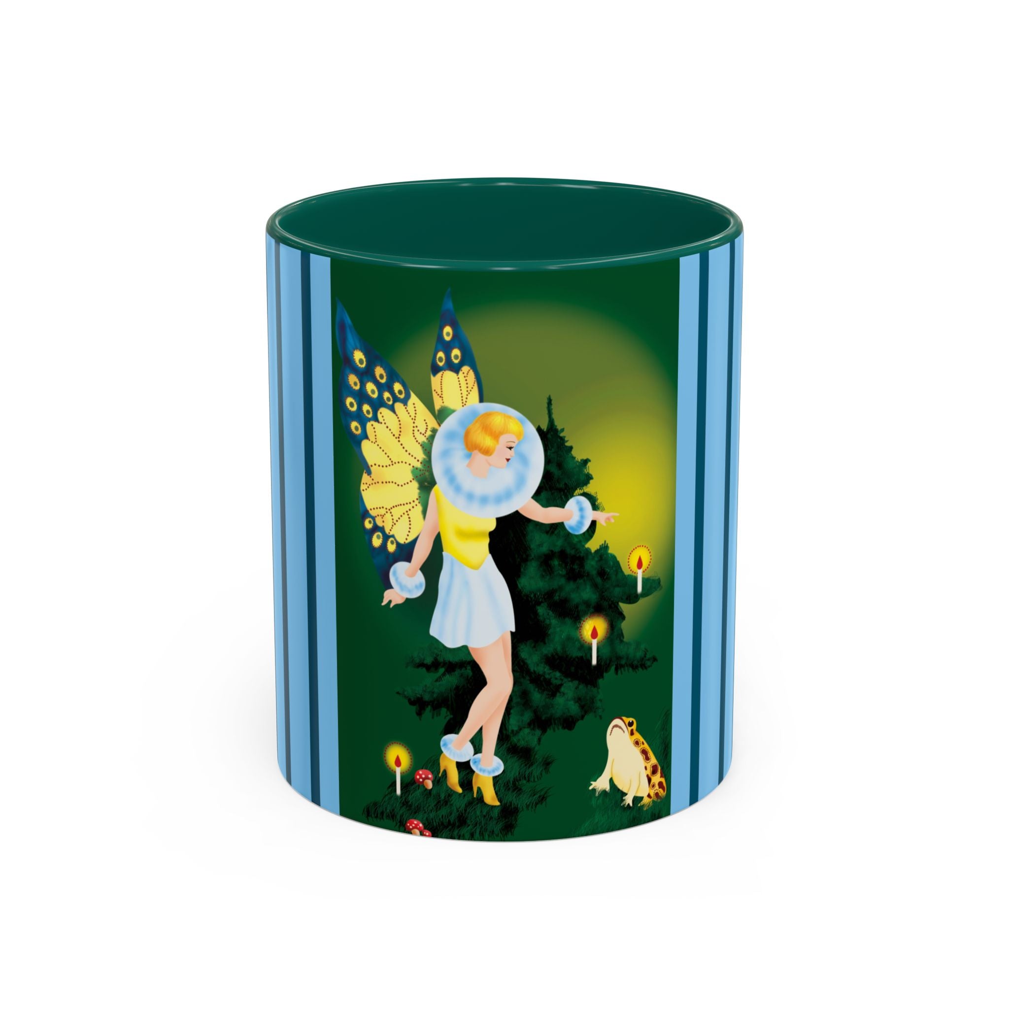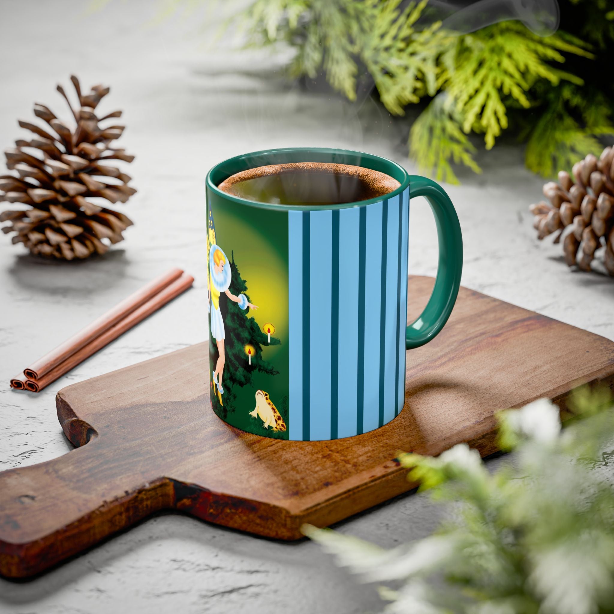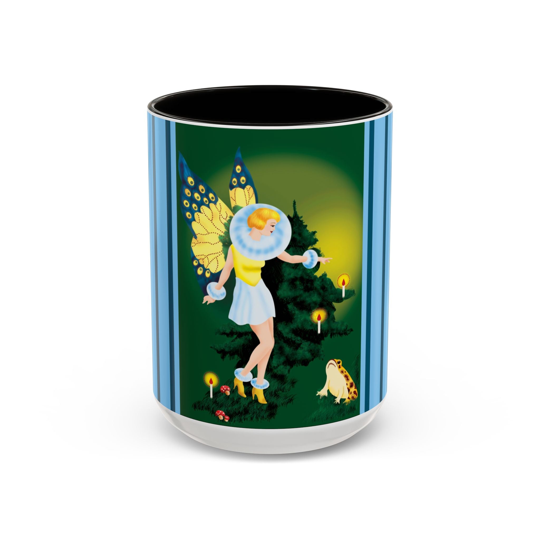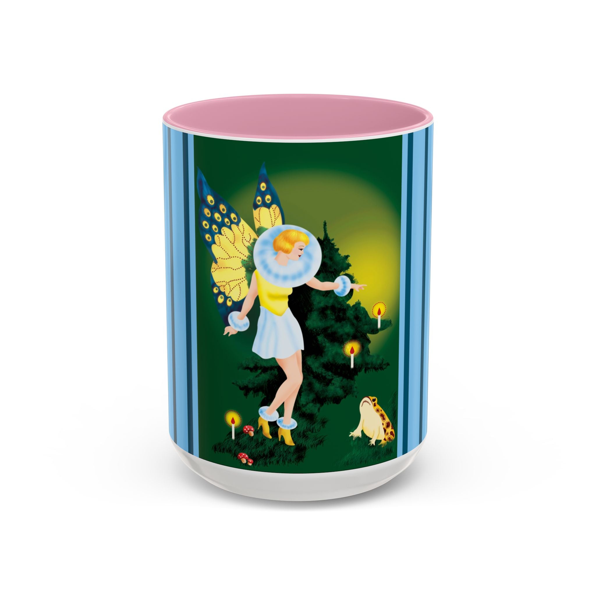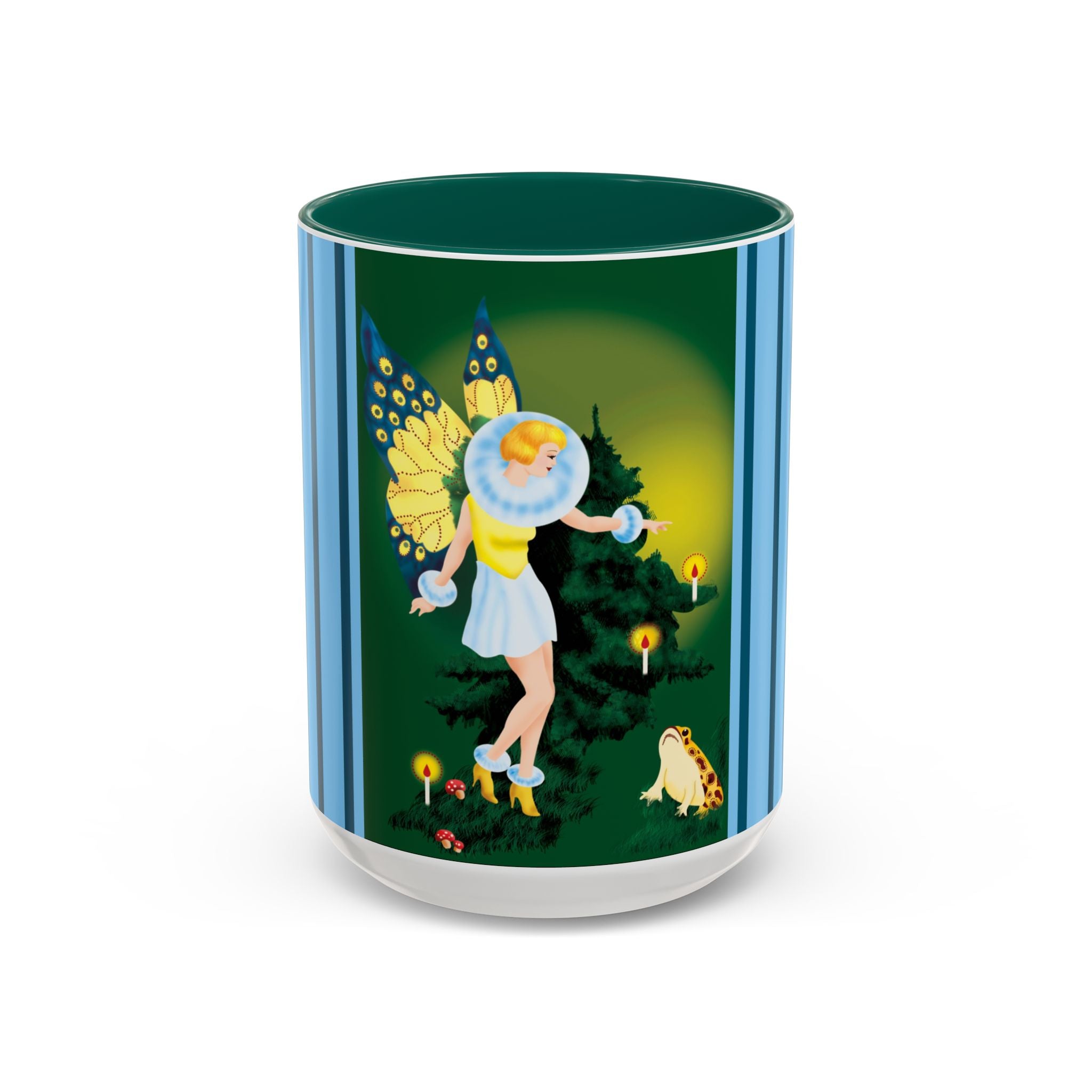 The artwork brings the mug to life with a whimsical woodland scene: a golden-haired fairy with butterfly wings reaches toward a curious toad beneath the glow of flickering candles. Red-capped mushrooms and a deep green forest backdrop complete the magical setting, blending elegance and wonder in every sip.