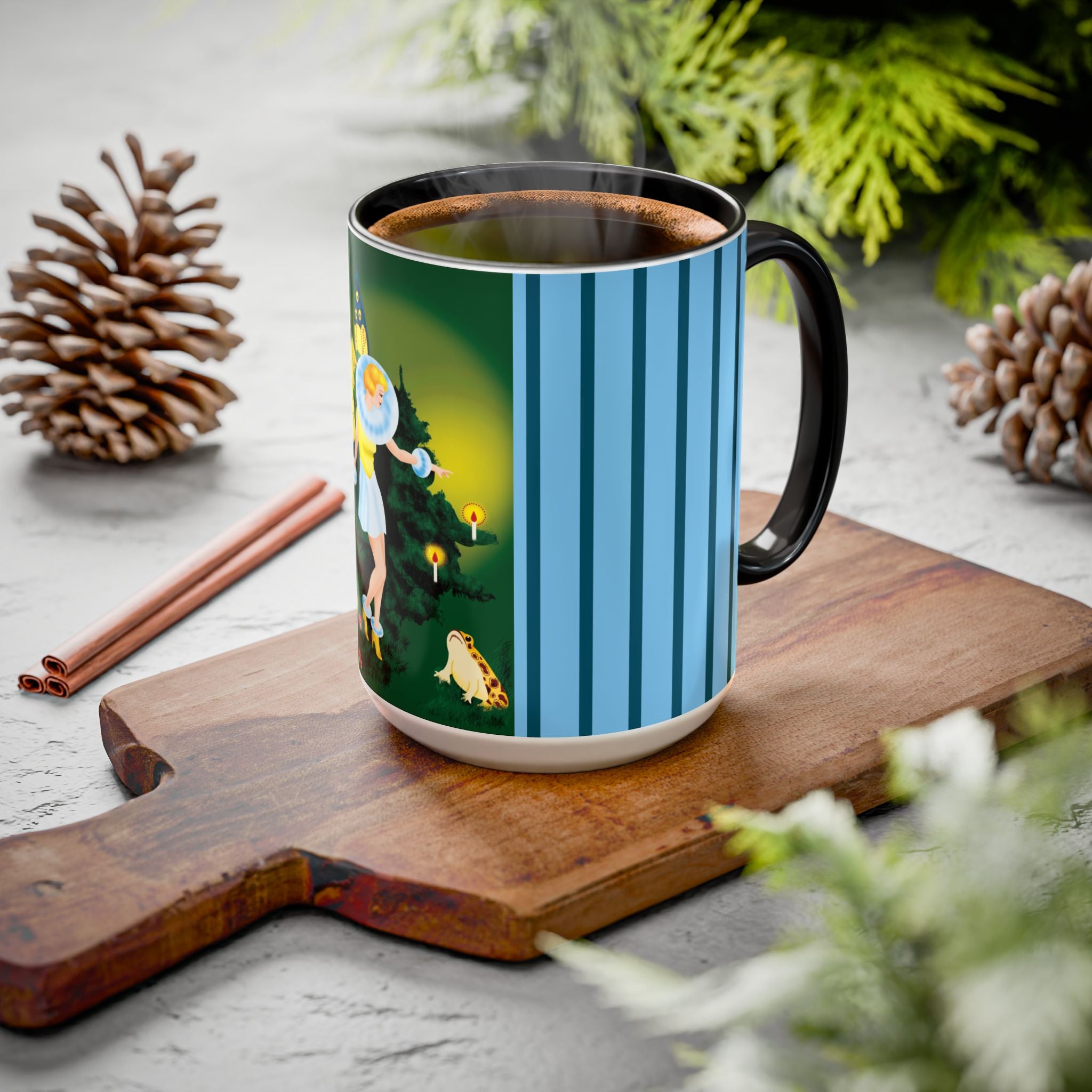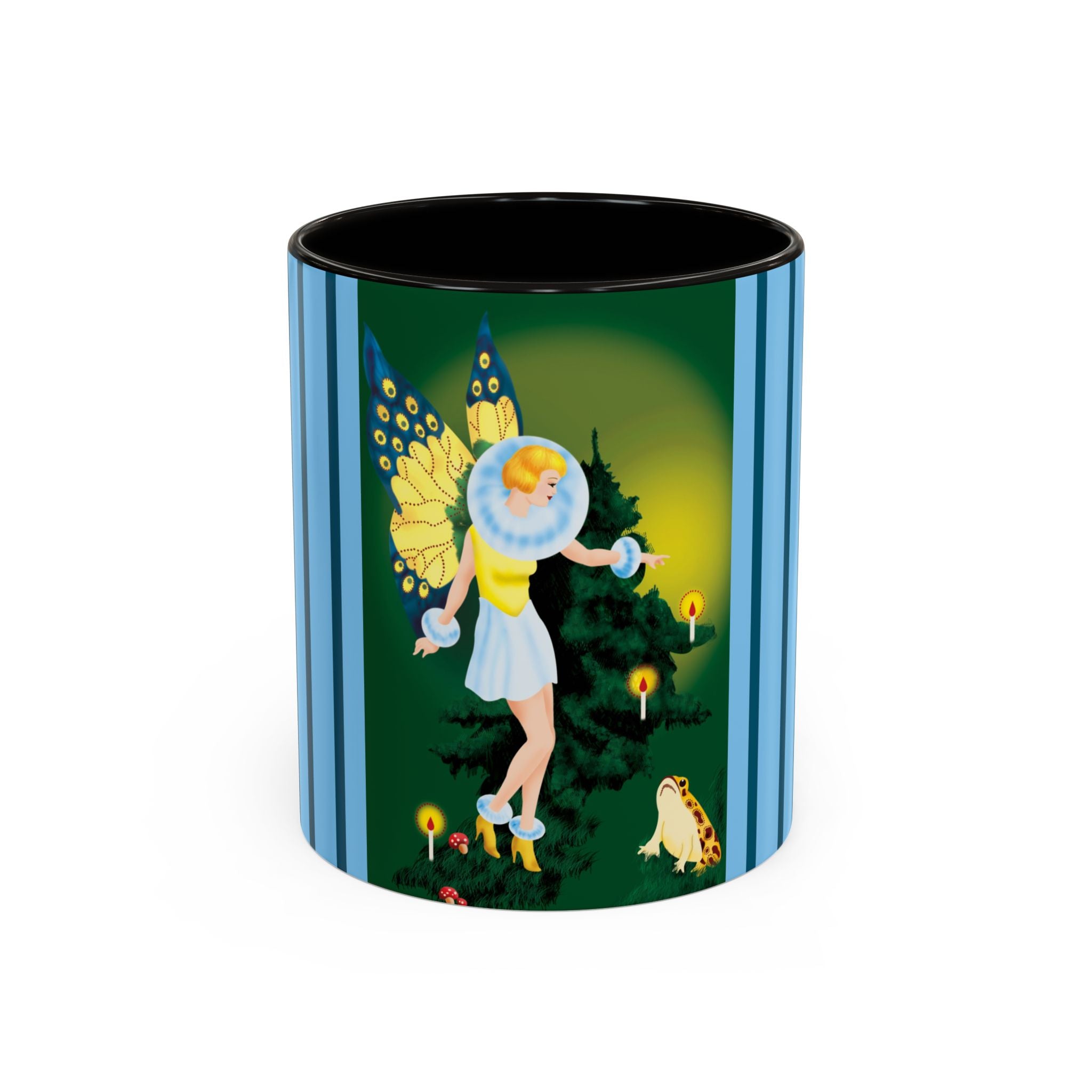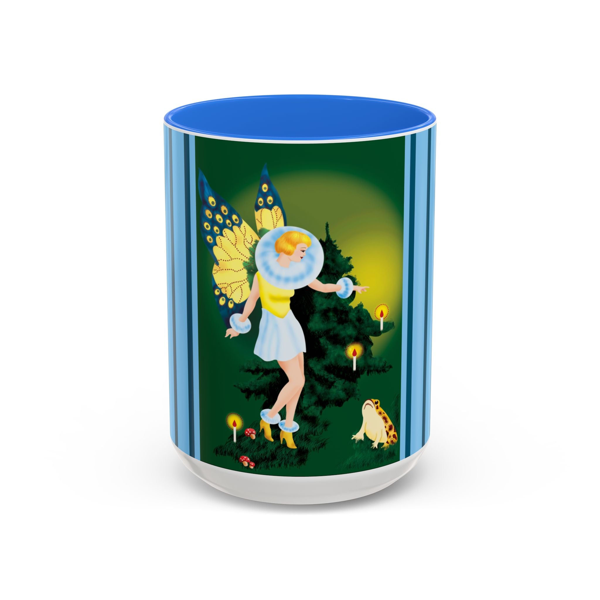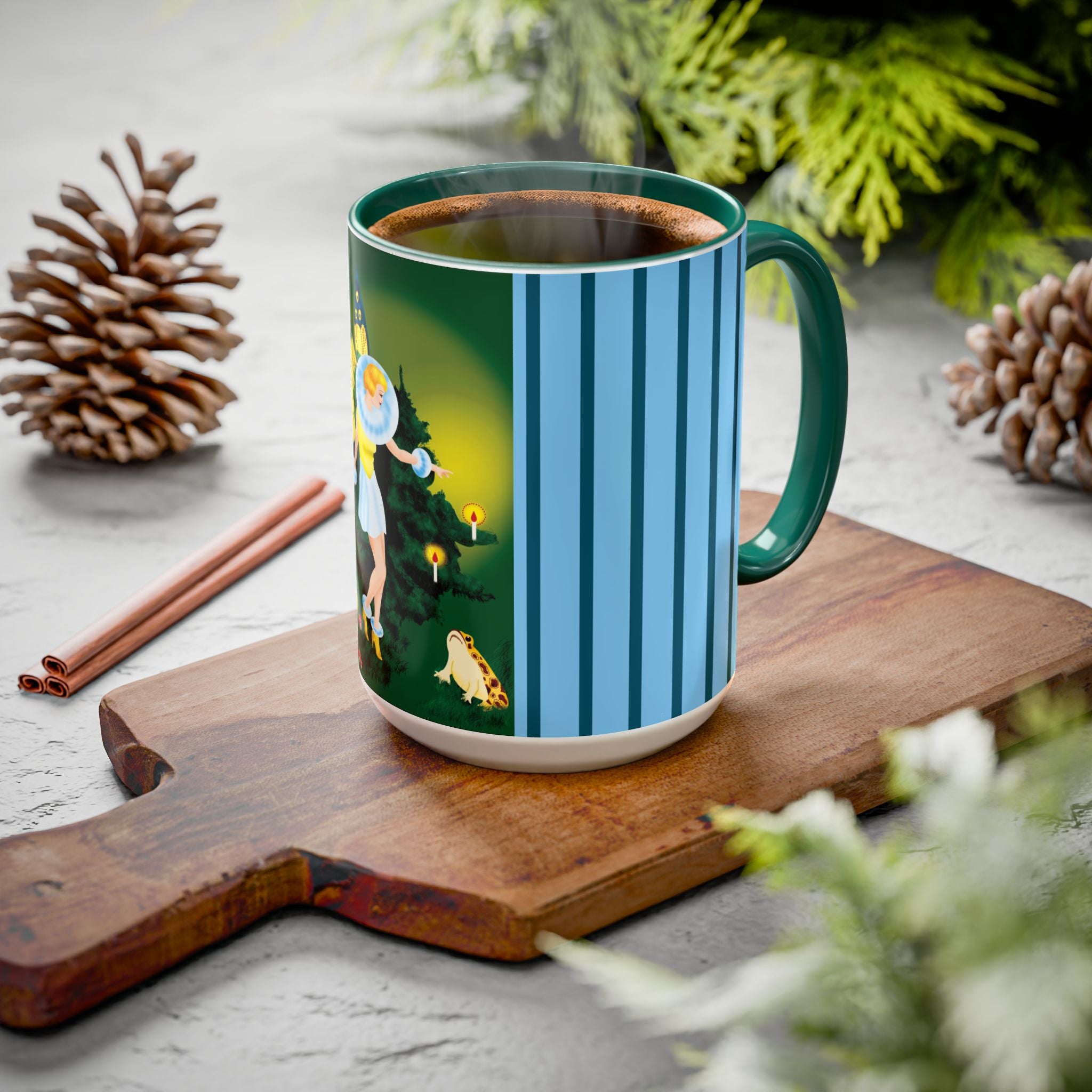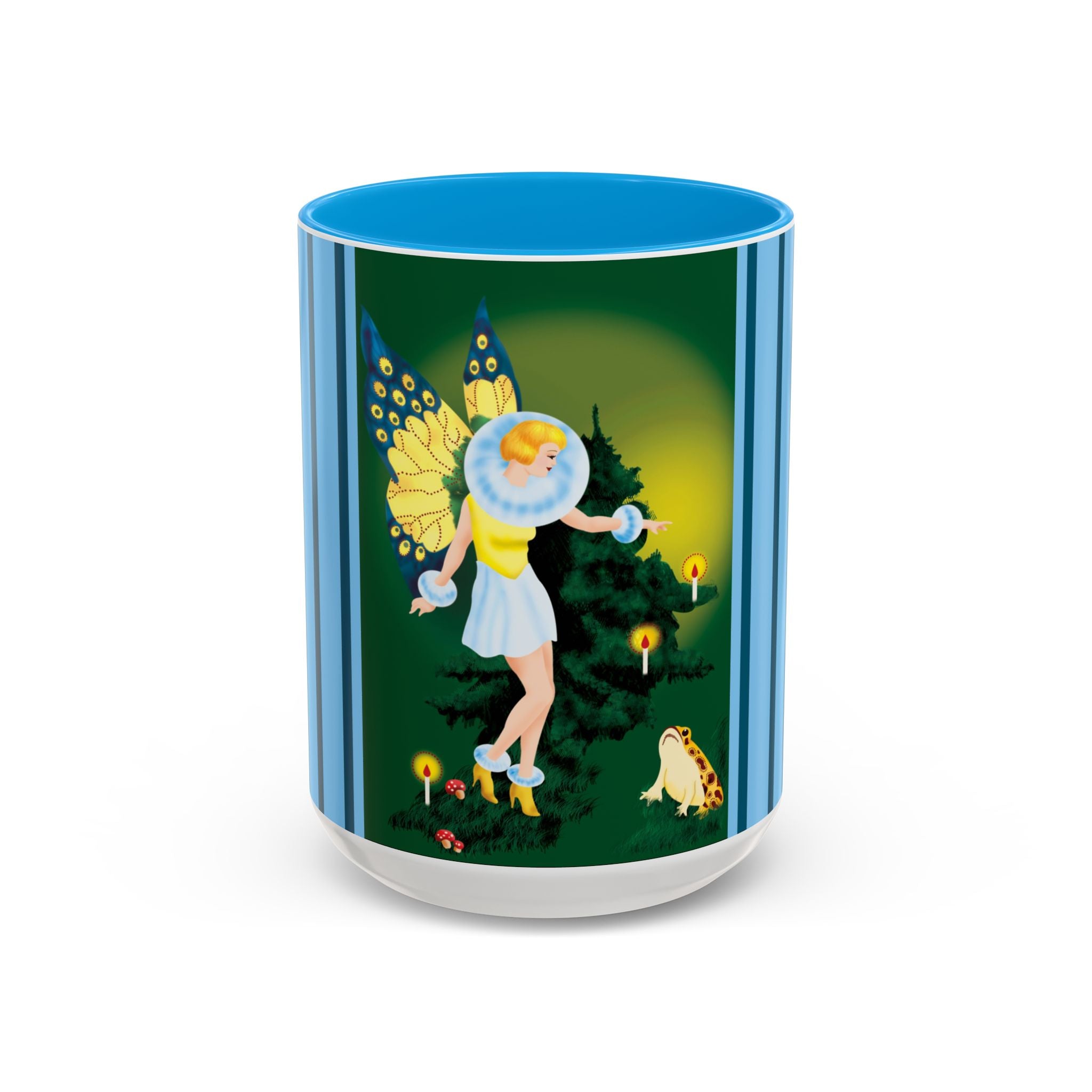 The artwork brings the mug to life with a whimsical woodland scene: a golden-haired fairy with butterfly wings reaches toward a curious toad beneath the glow of flickering candles. Red-capped mushrooms and a deep green forest backdrop complete the magical setting, blending elegance and wonder in every sip.