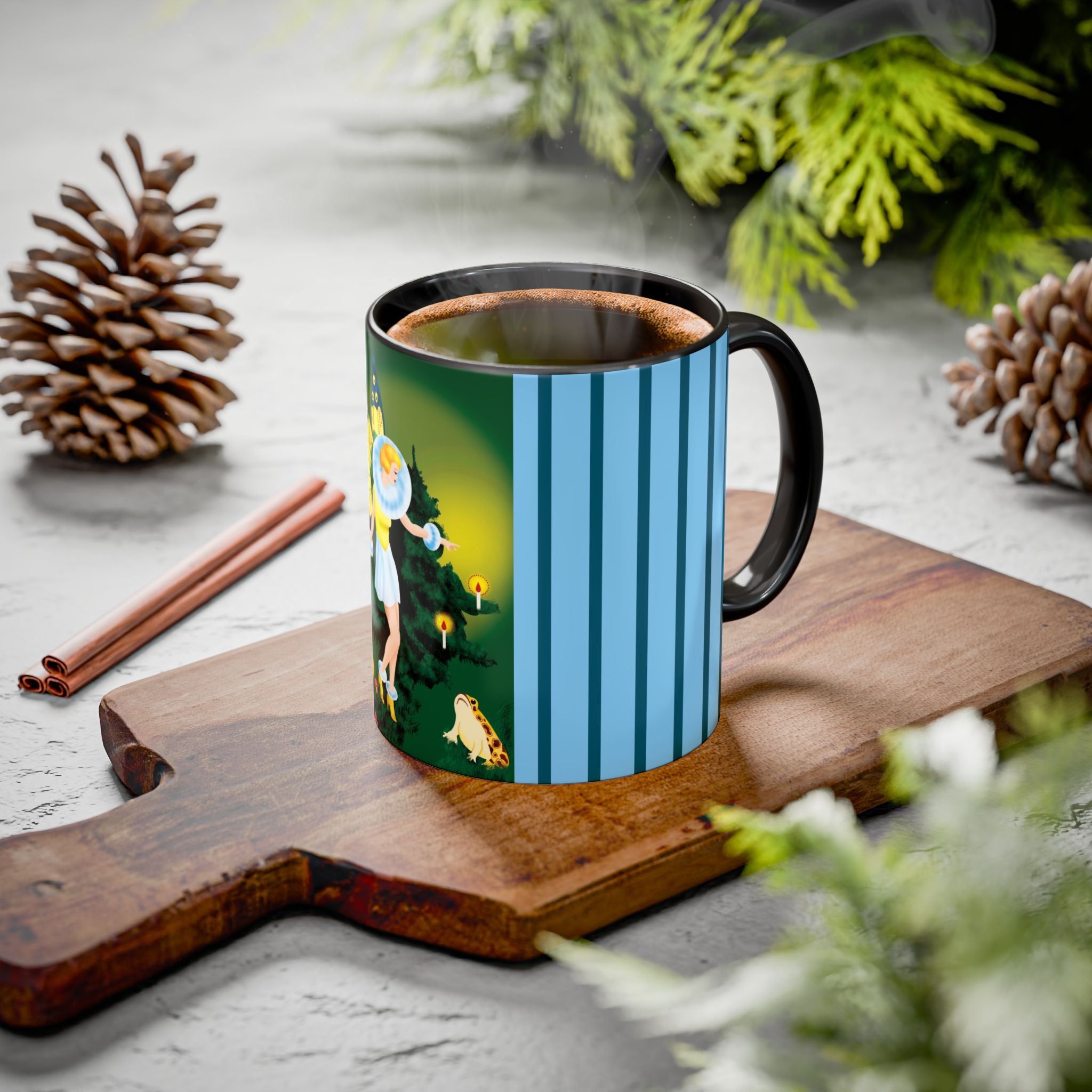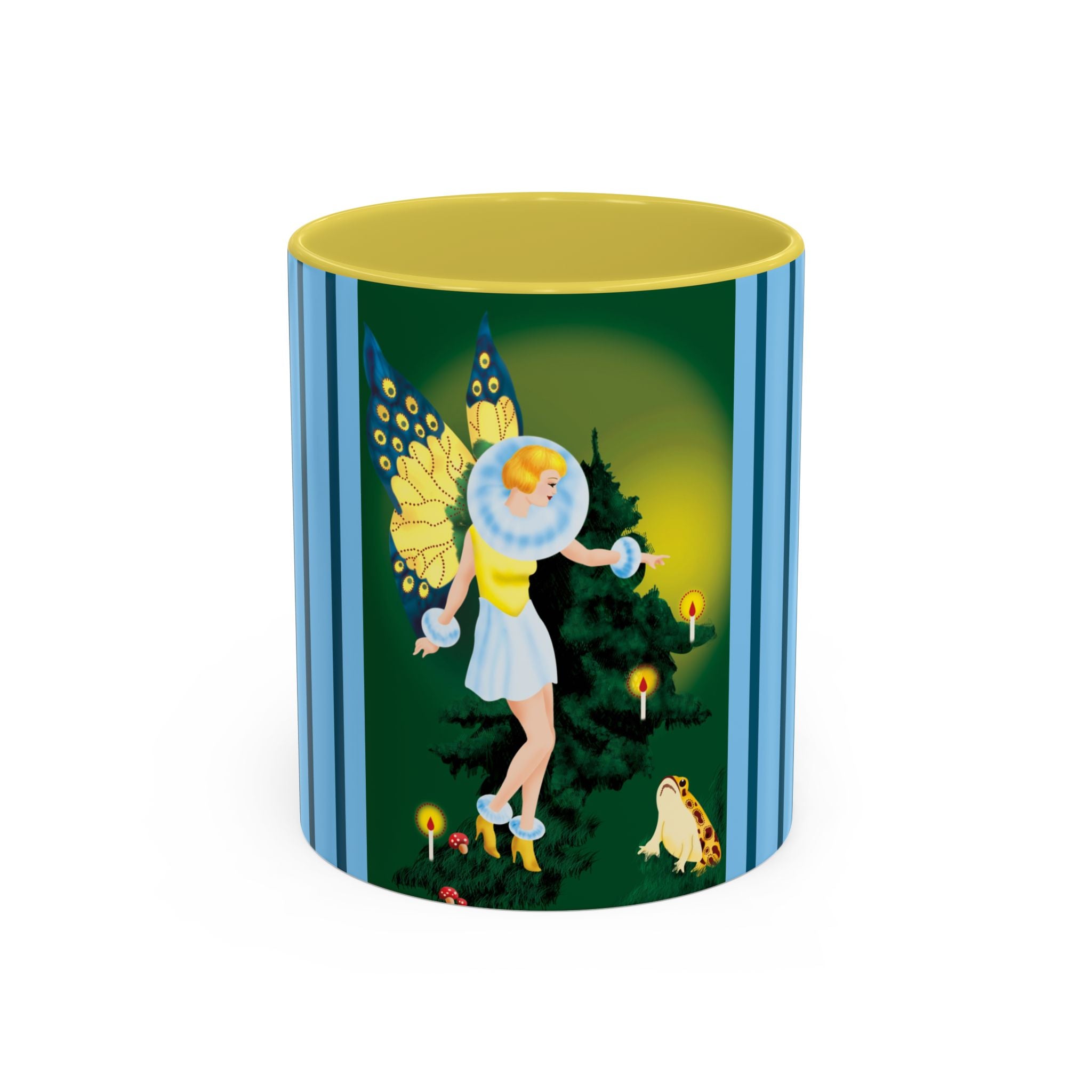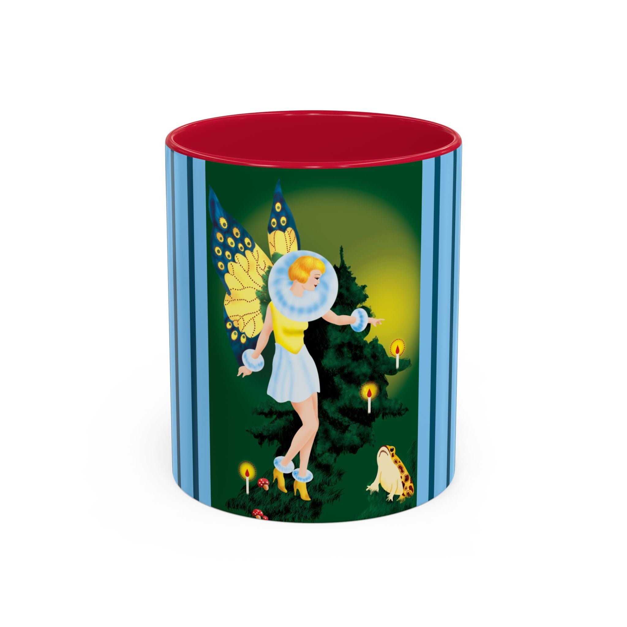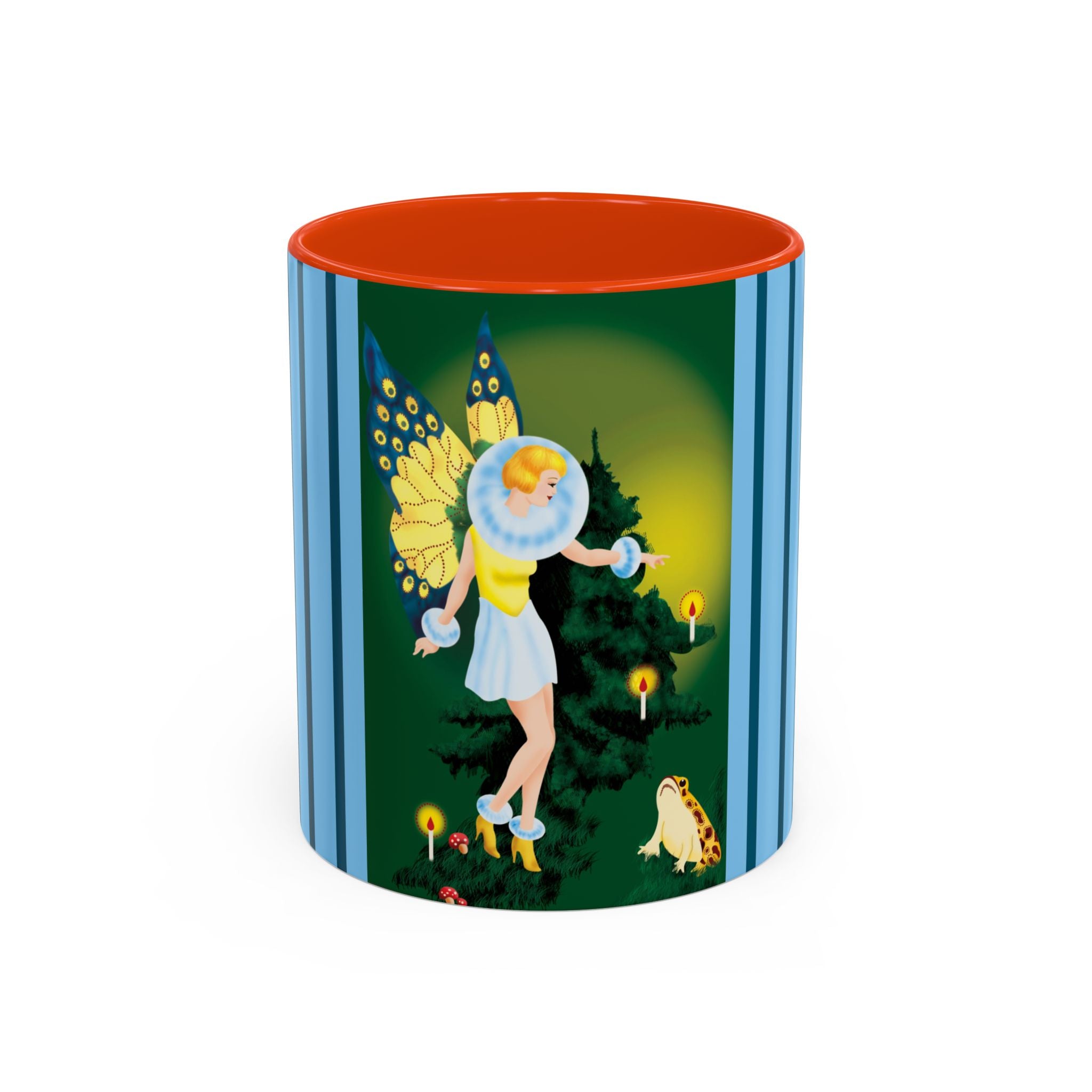 The artwork brings the mug to life with a whimsical woodland scene: a golden-haired fairy with butterfly wings reaches toward a curious toad beneath the glow of flickering candles. Red-capped mushrooms and a deep green forest backdrop complete the magical setting, blending elegance and wonder in every sip.