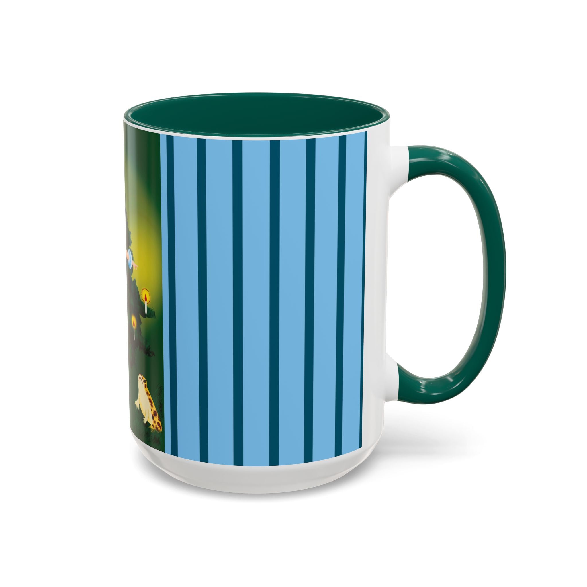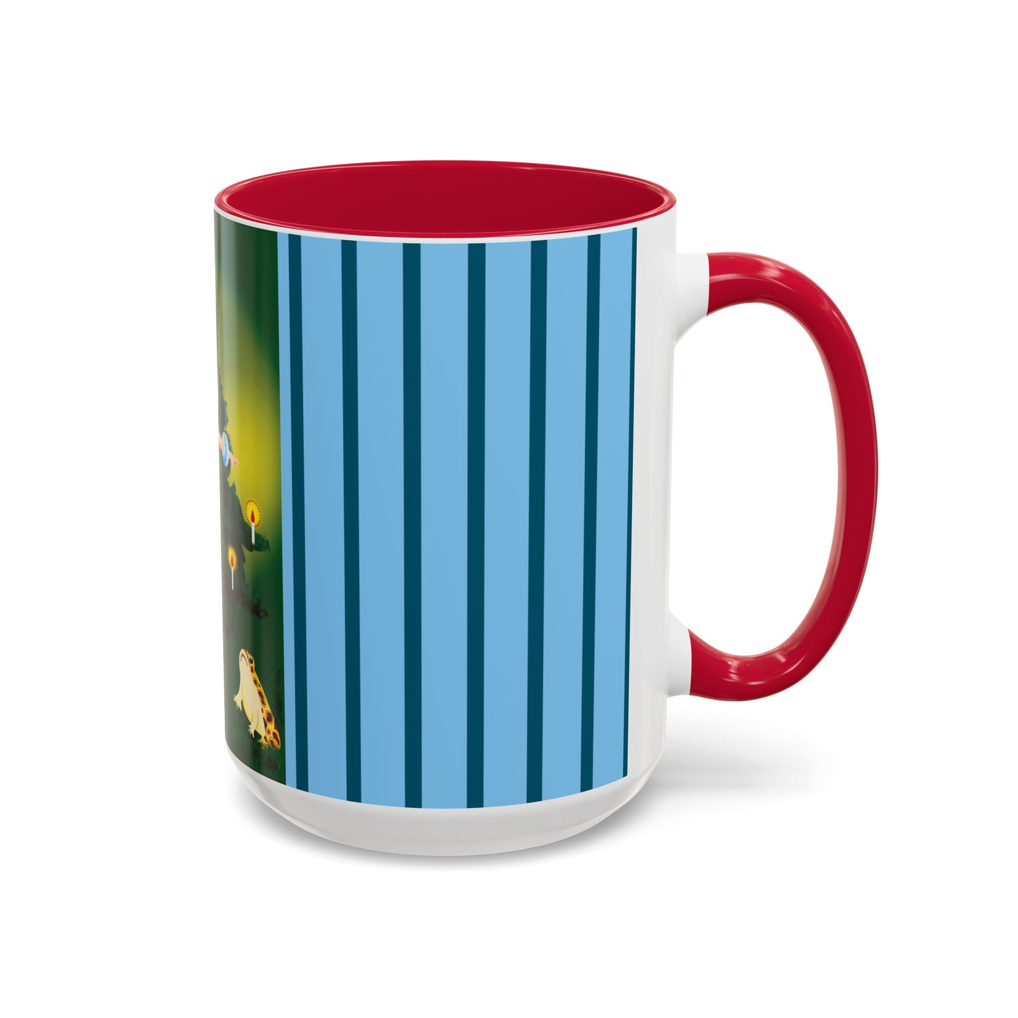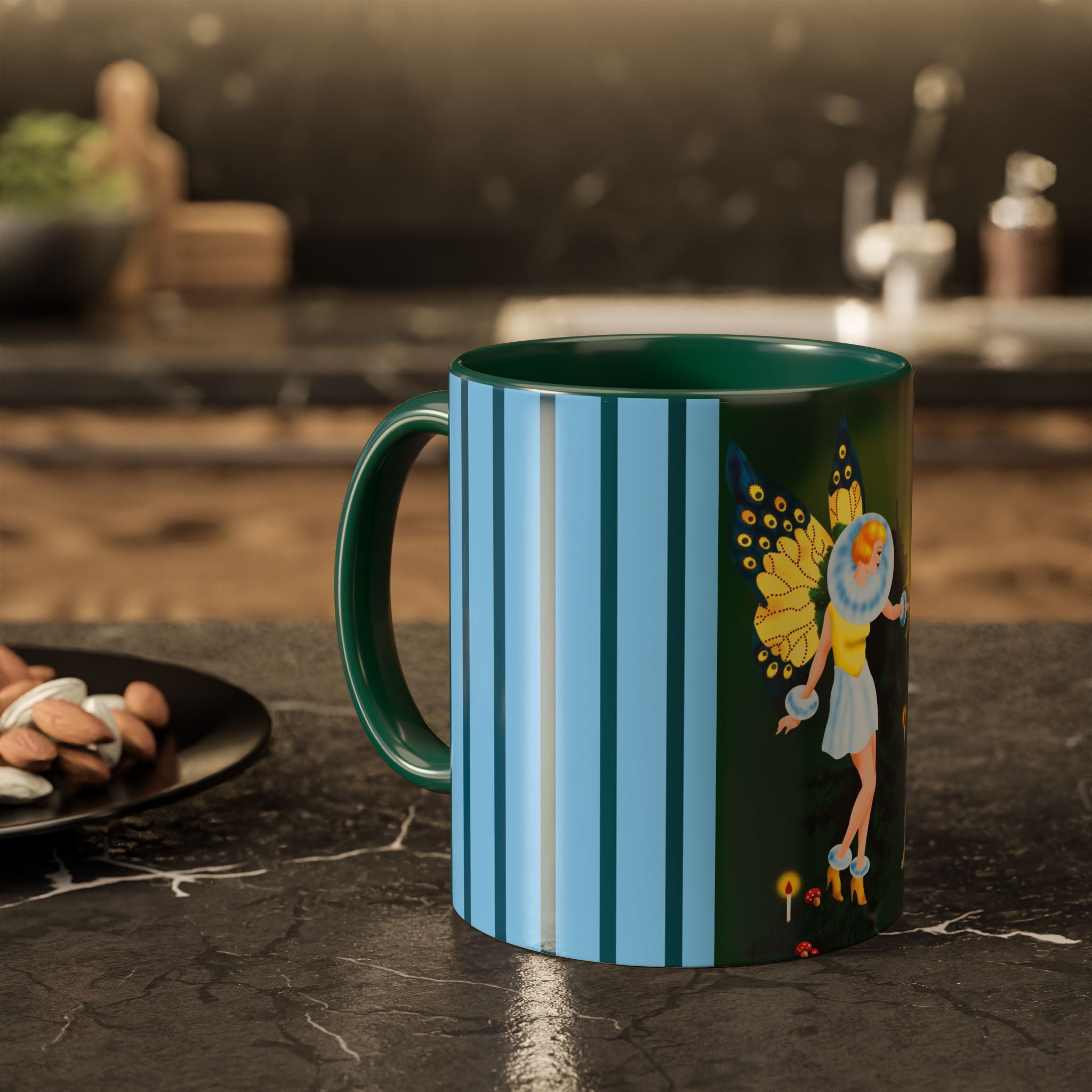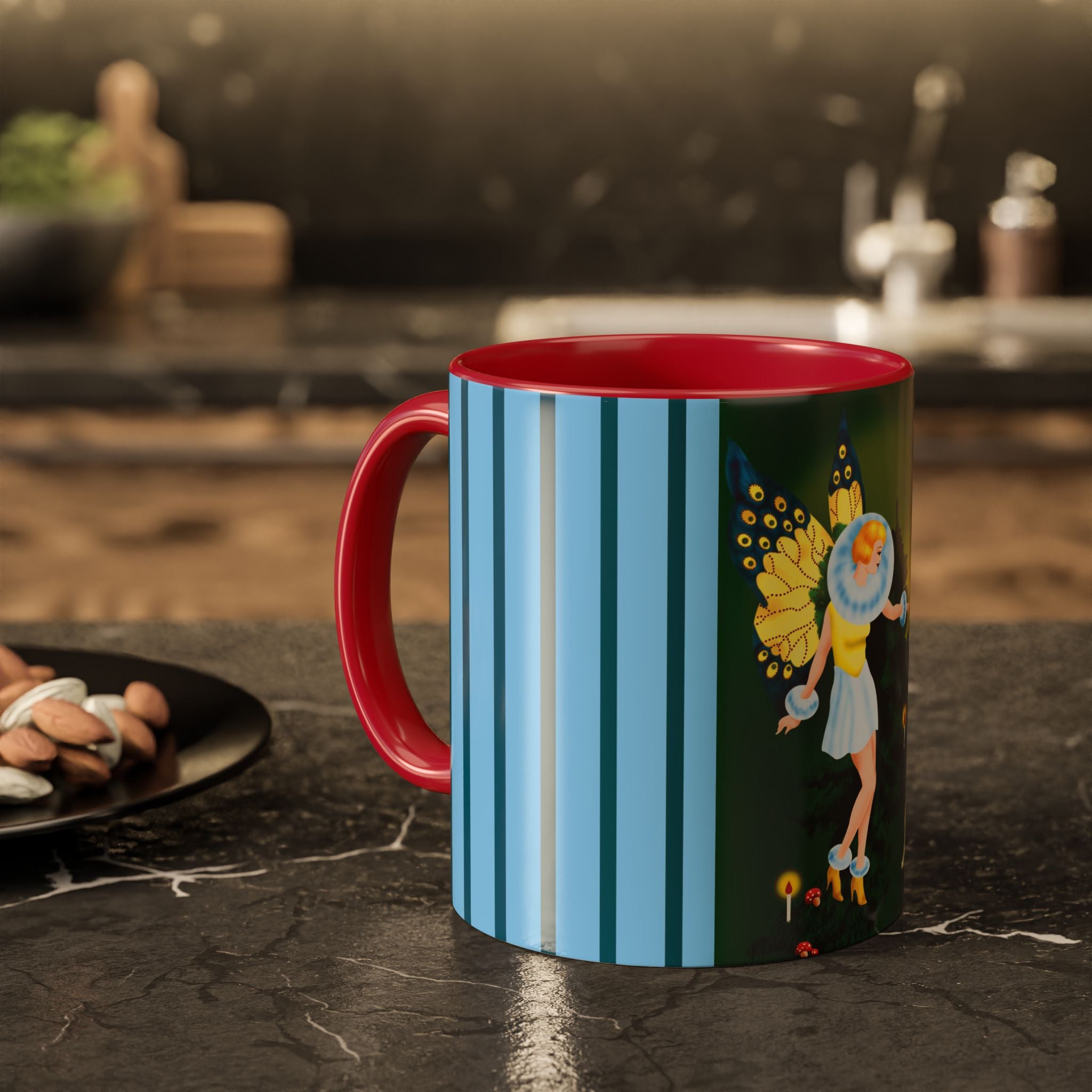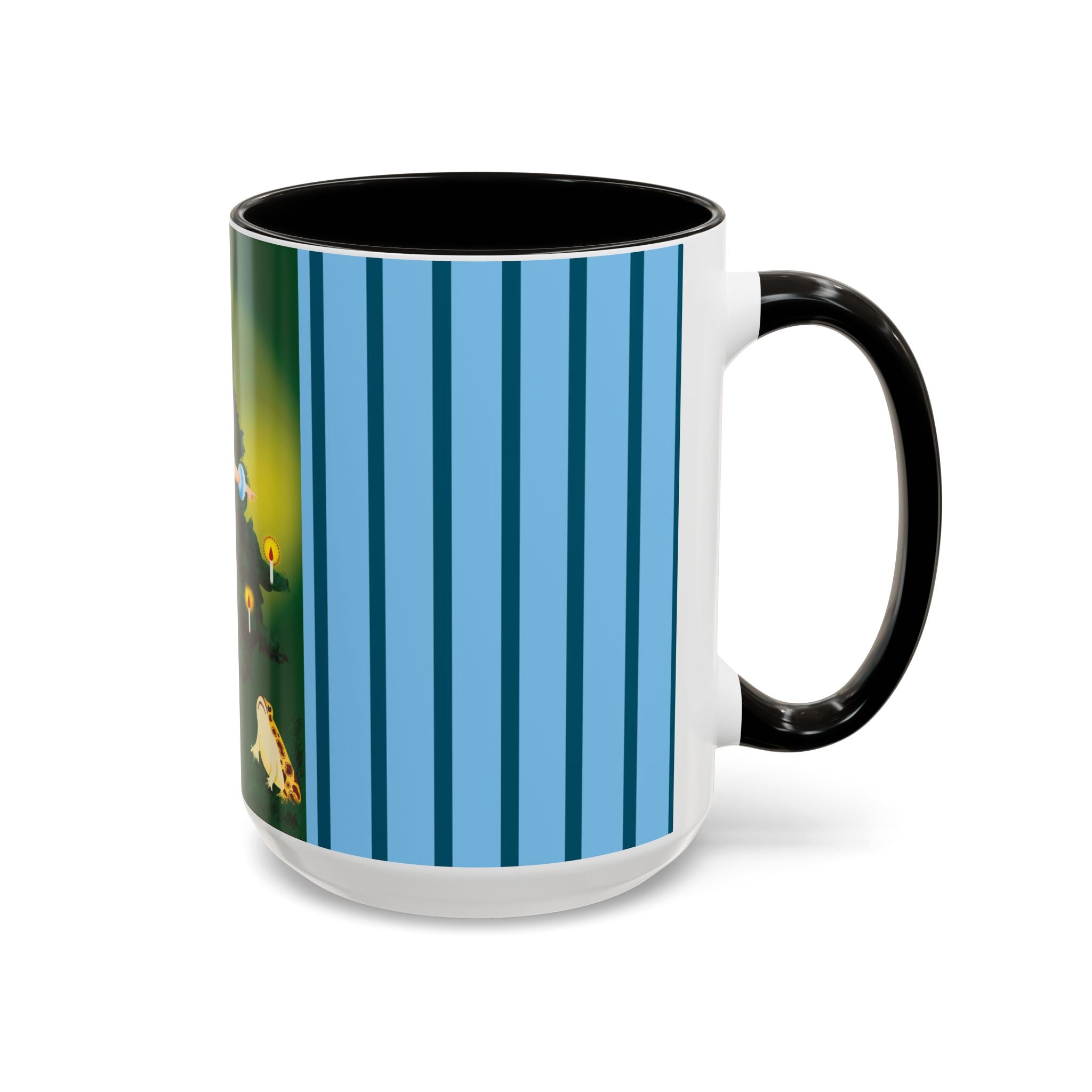 The artwork brings the mug to life with a whimsical woodland scene: a golden-haired fairy with butterfly wings reaches toward a curious toad beneath the glow of flickering candles. Red-capped mushrooms and a deep green forest backdrop complete the magical setting, blending elegance and wonder in every sip.