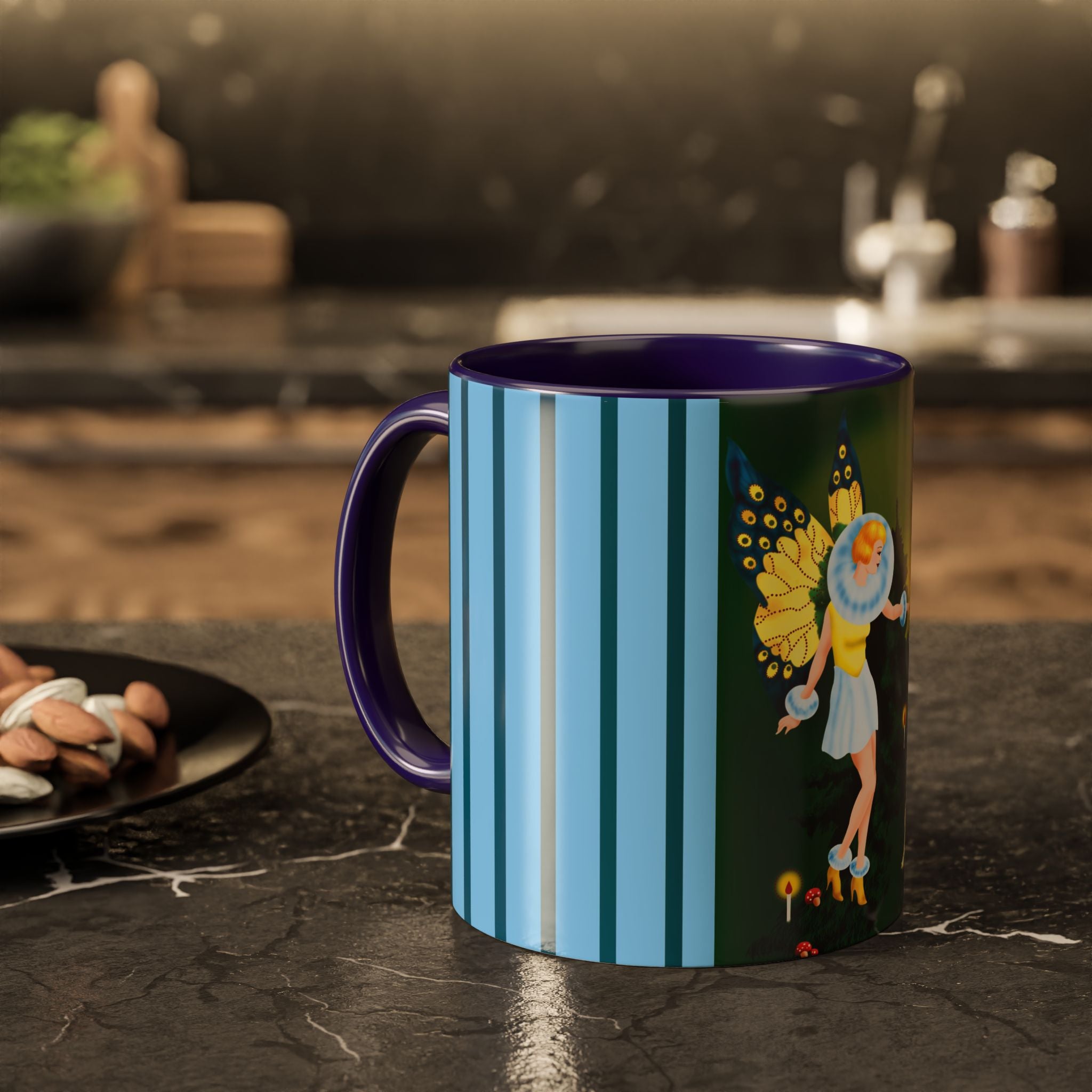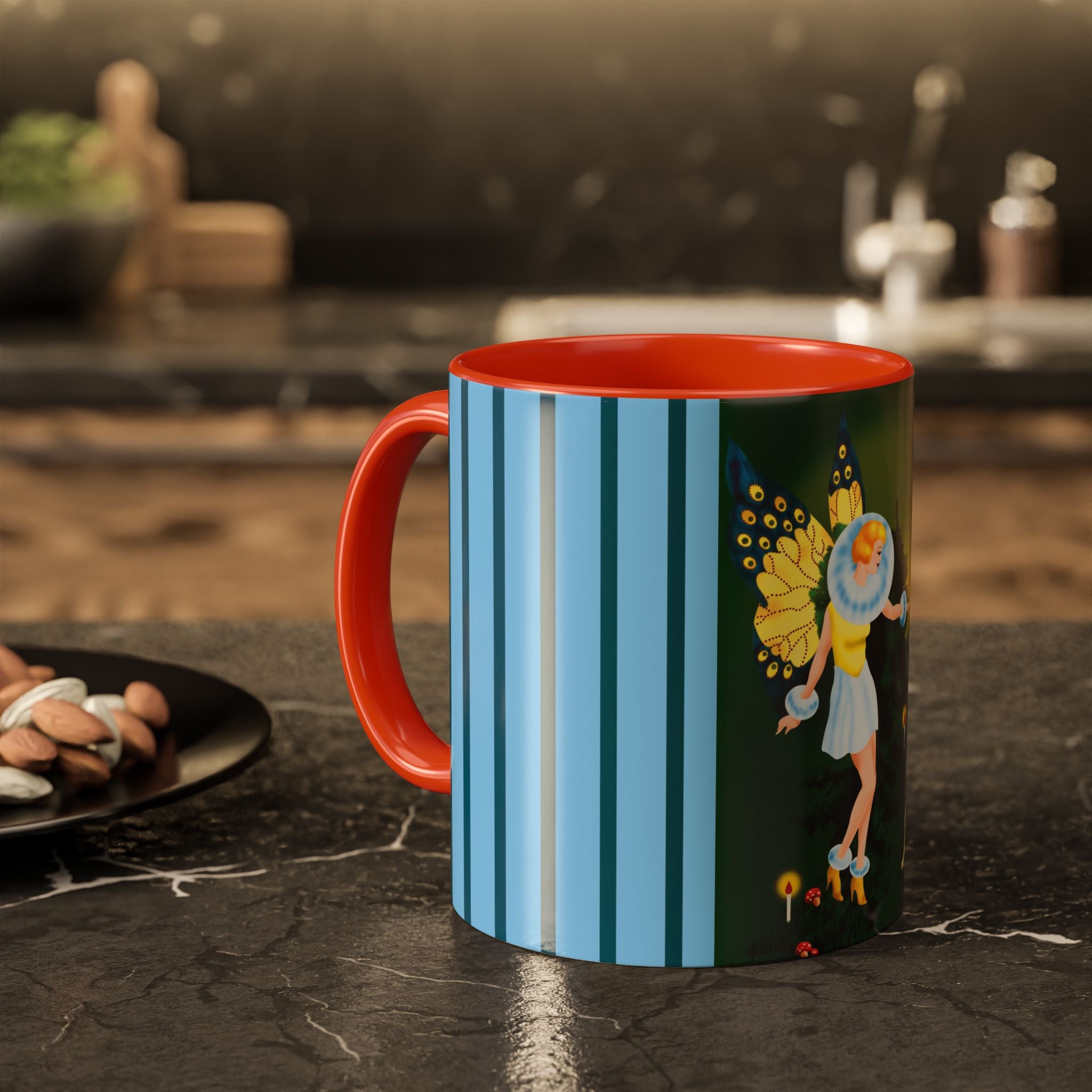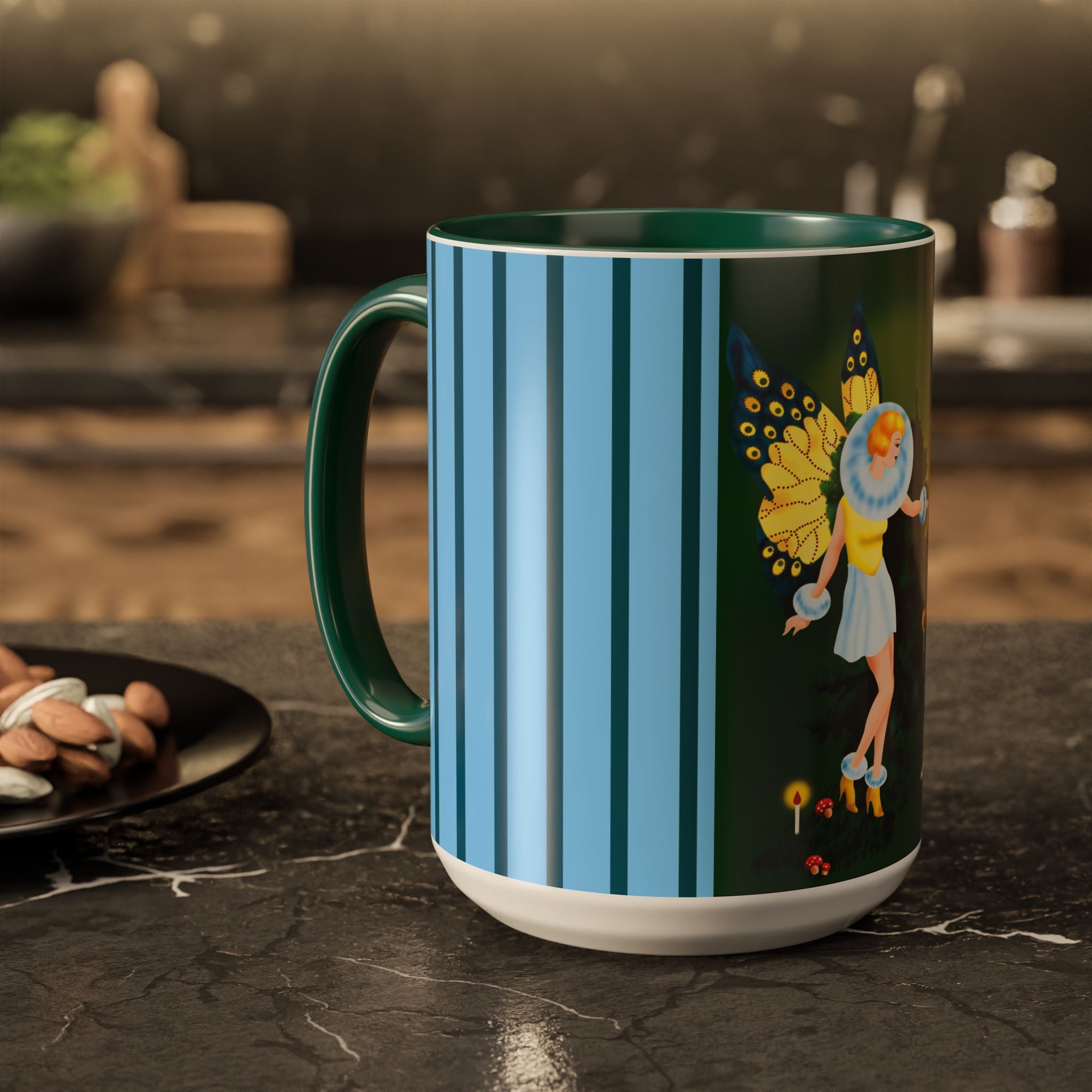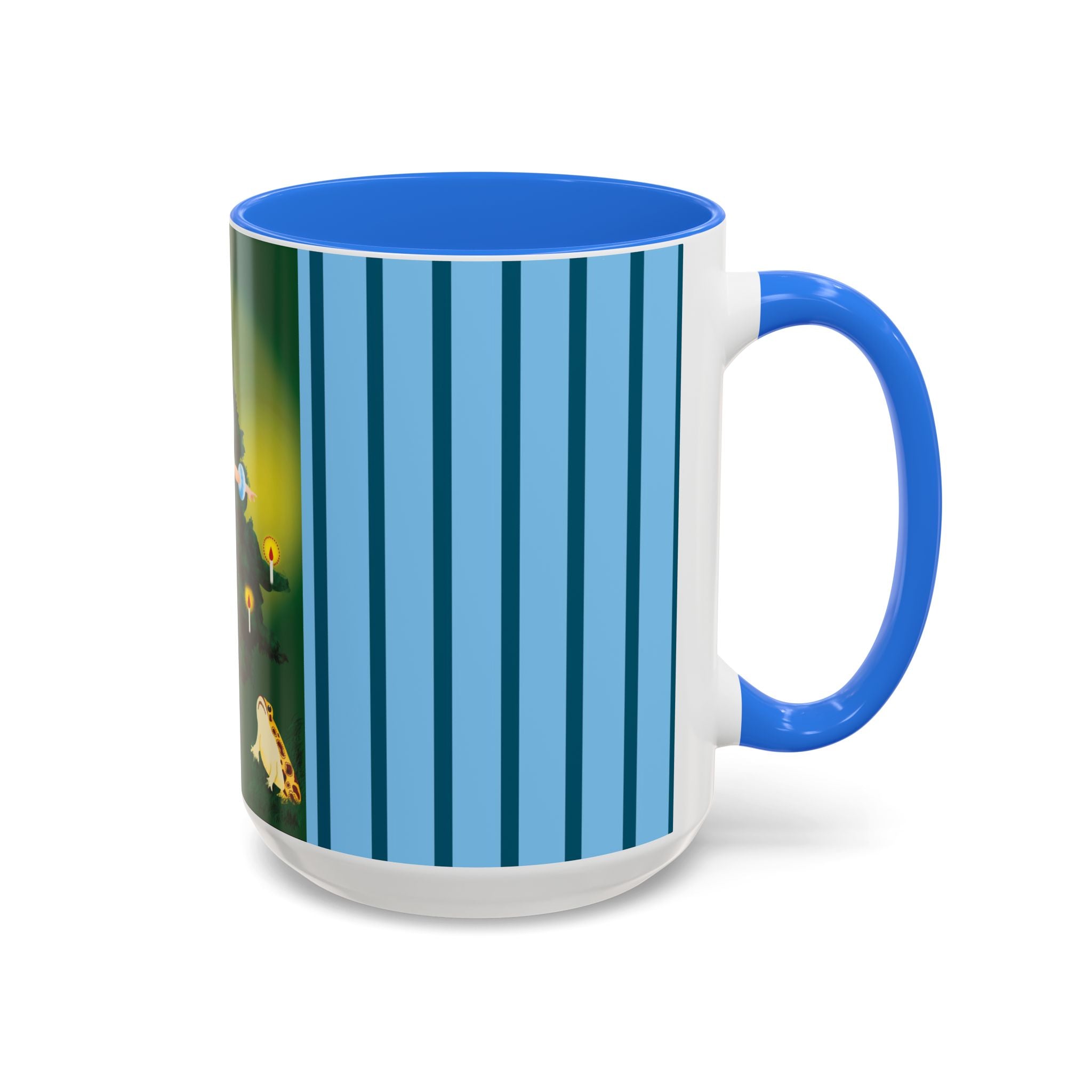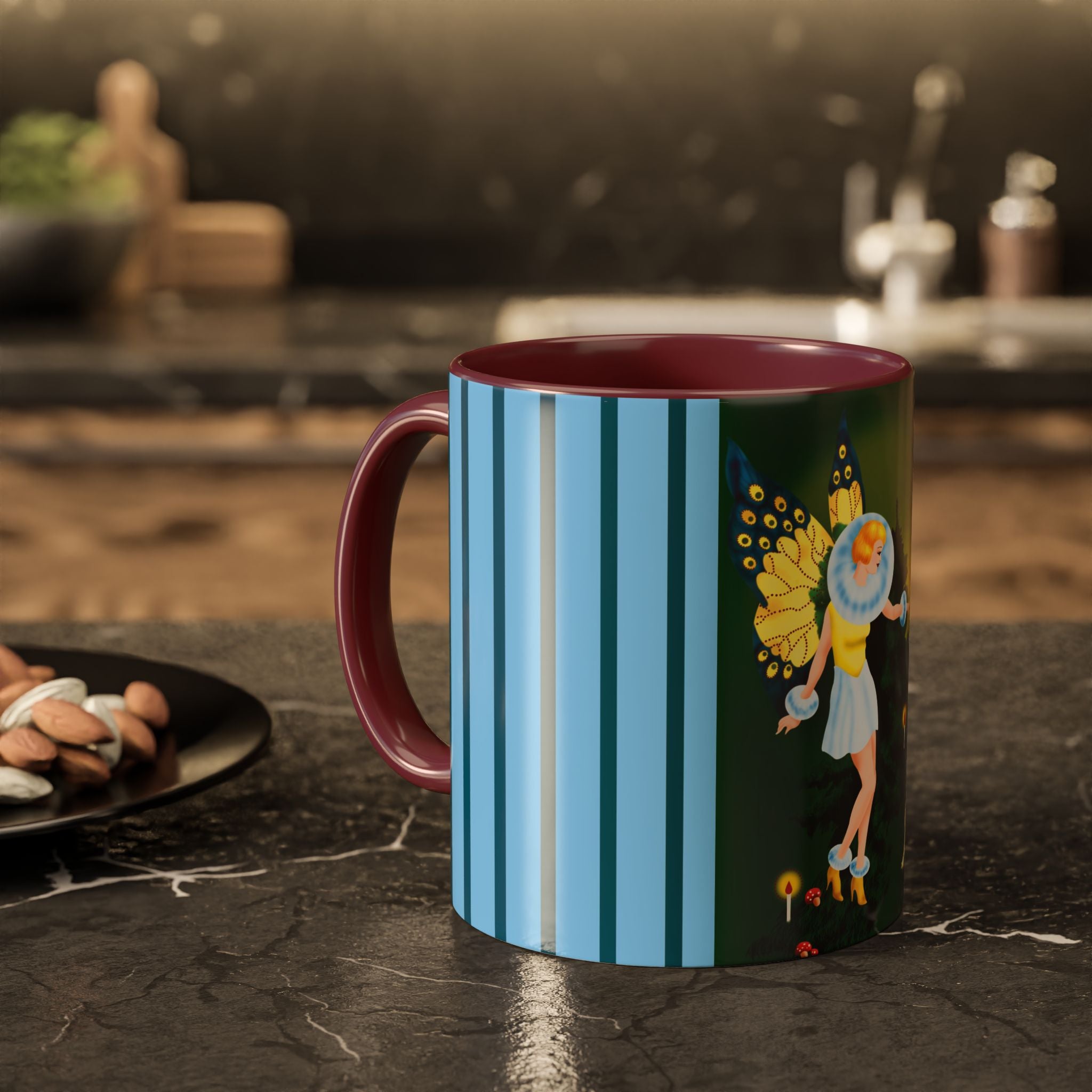 The artwork brings the mug to life with a whimsical woodland scene: a golden-haired fairy with butterfly wings reaches toward a curious toad beneath the glow of flickering candles. Red-capped mushrooms and a deep green forest backdrop complete the magical setting, blending elegance and wonder in every sip.