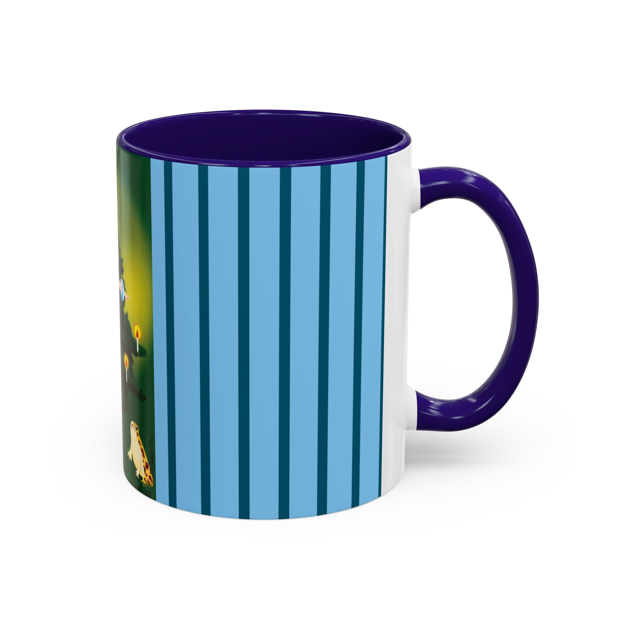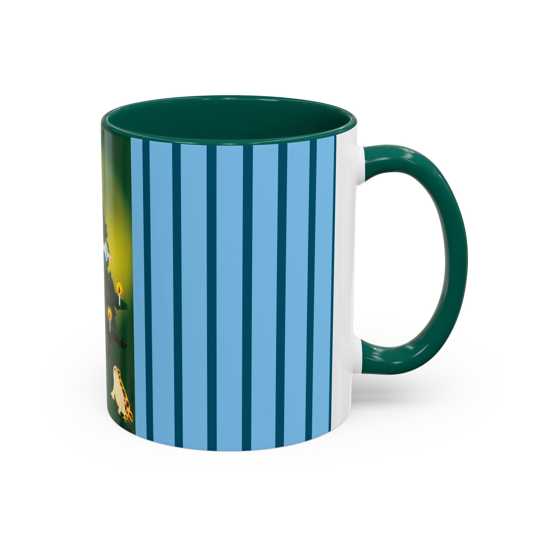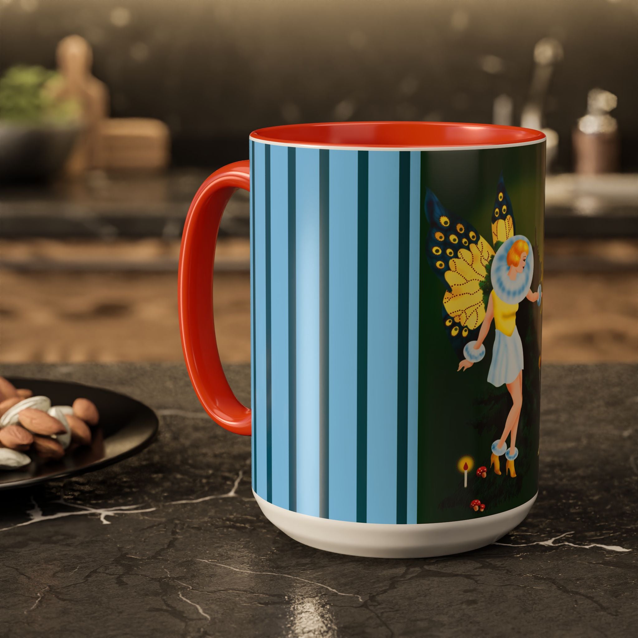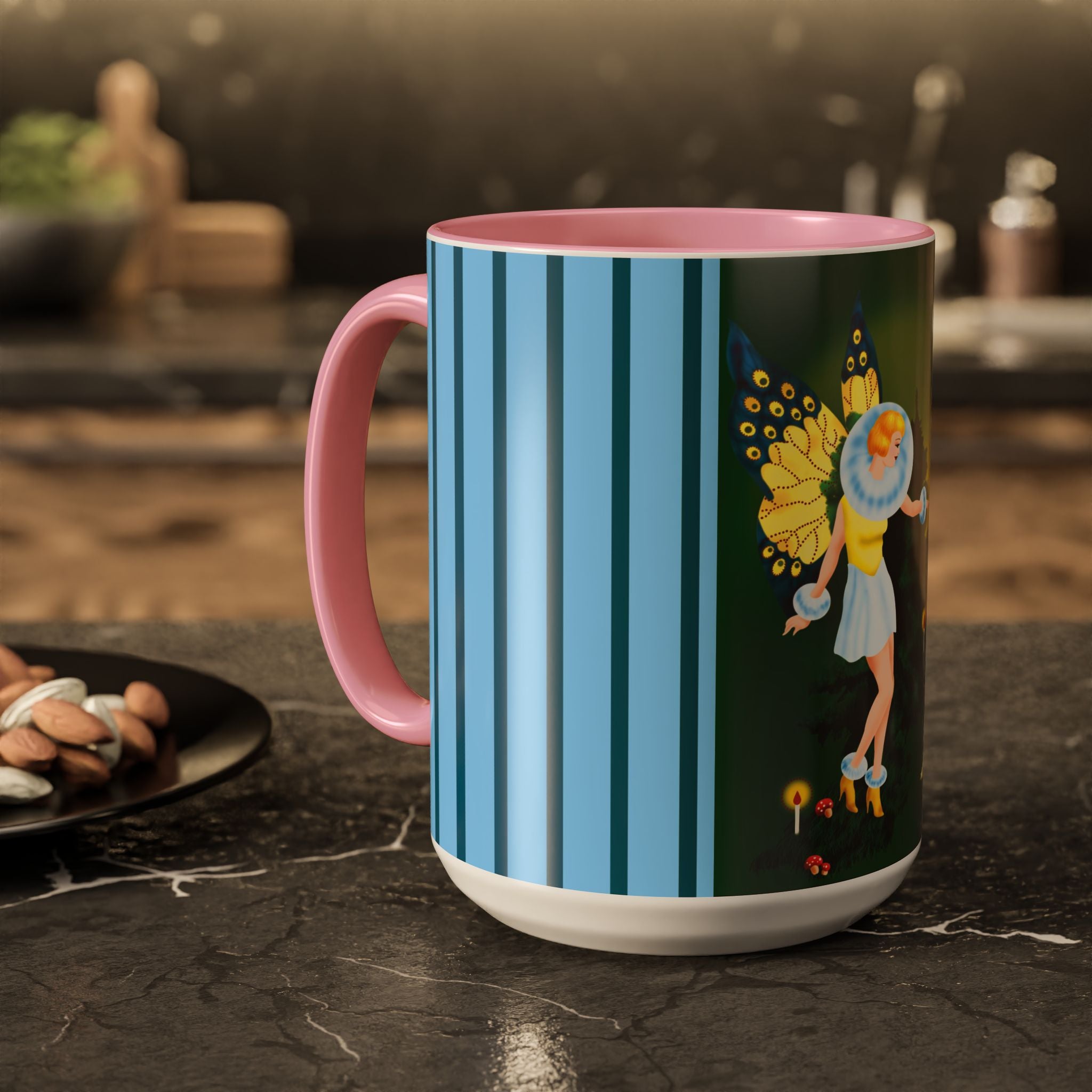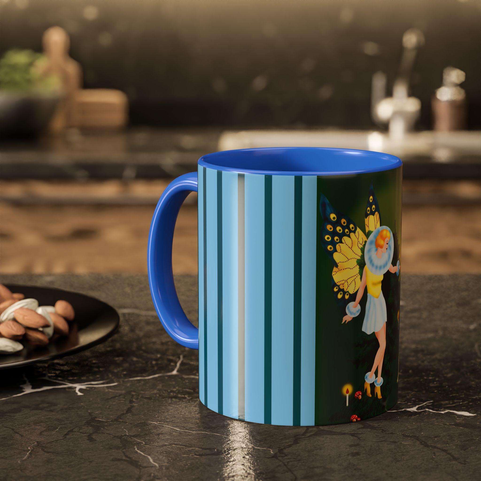 The artwork brings the mug to life with a whimsical woodland scene: a golden-haired fairy with butterfly wings reaches toward a curious toad beneath the glow of flickering candles. Red-capped mushrooms and a deep green forest backdrop complete the magical setting, blending elegance and wonder in every sip.